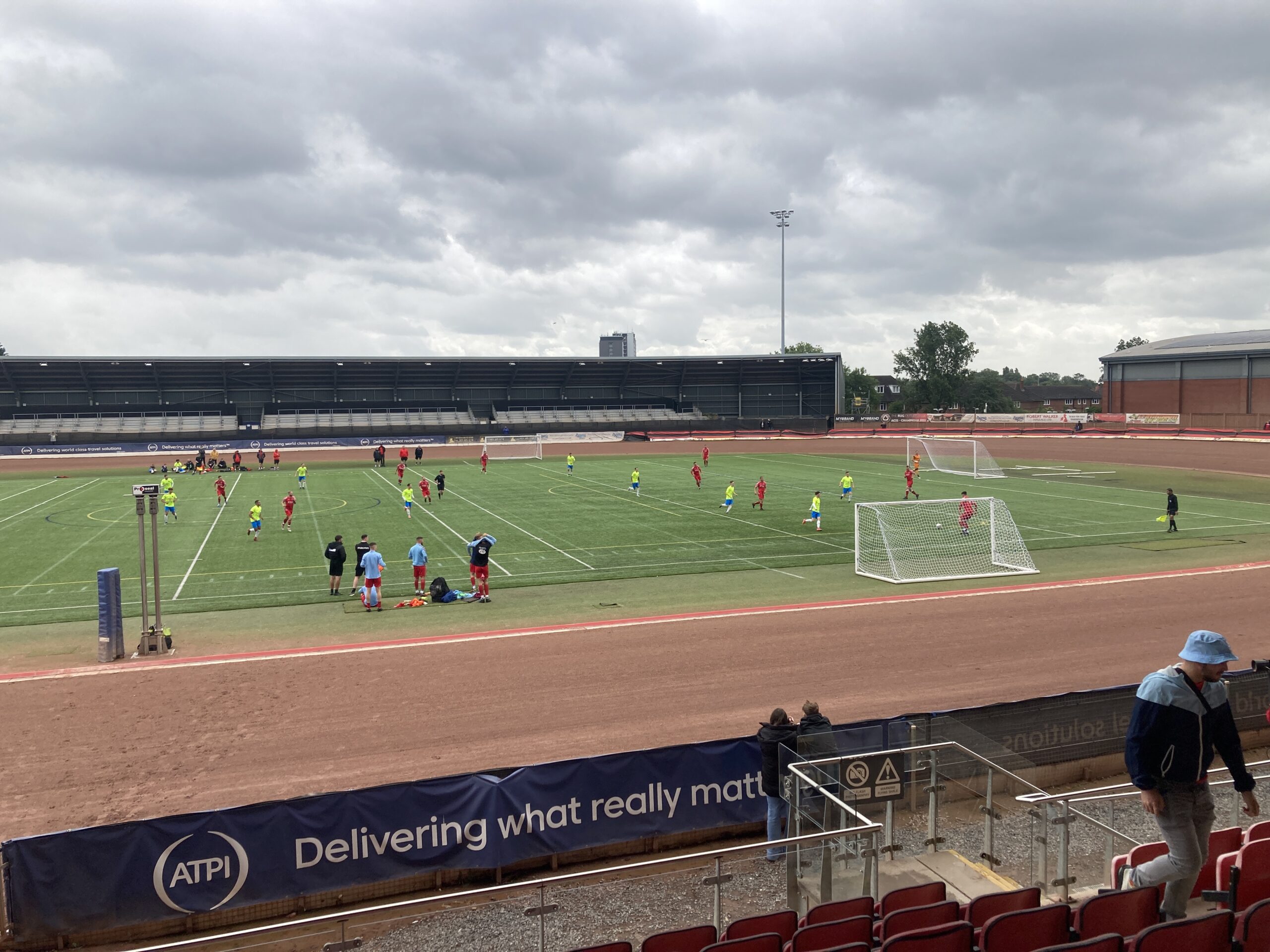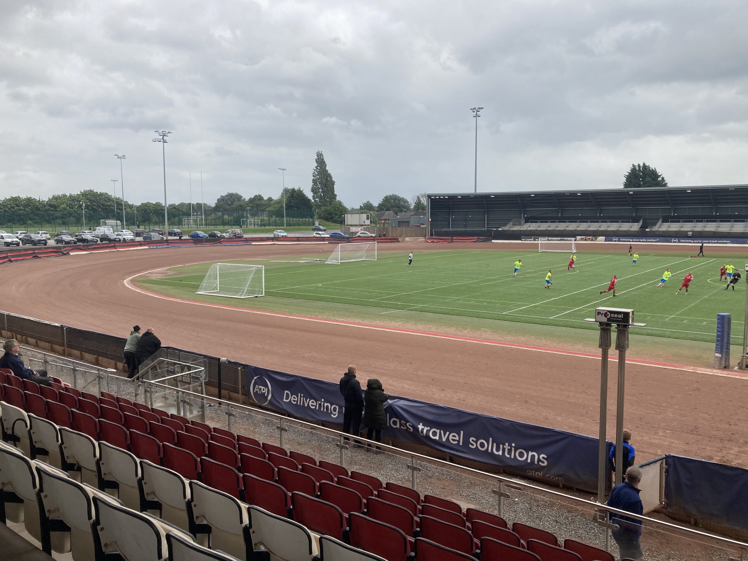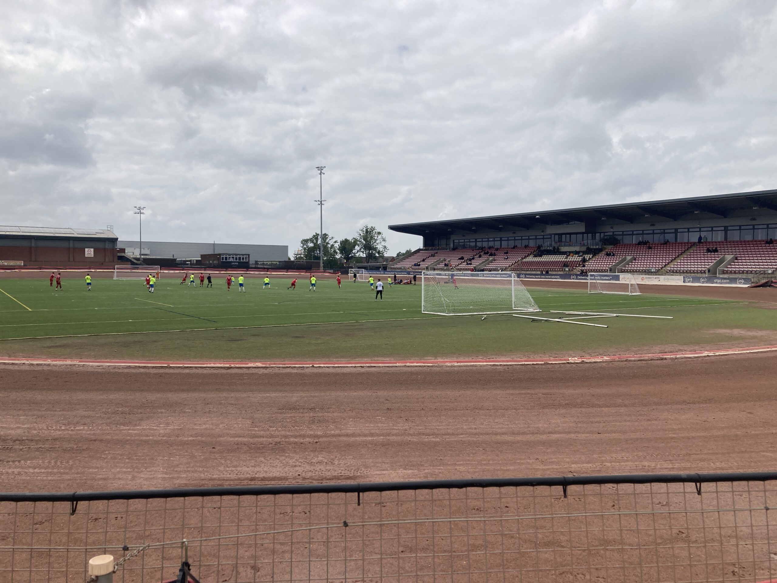 Belle Vue Speedway, the setting for today’s pre-season friendly between Abbey Hey FC and Padiham FC. It is the home of the Belle Vue Aces speedway club where matches usually take place on Monday. No football team plays here which makes today a significant visit!
