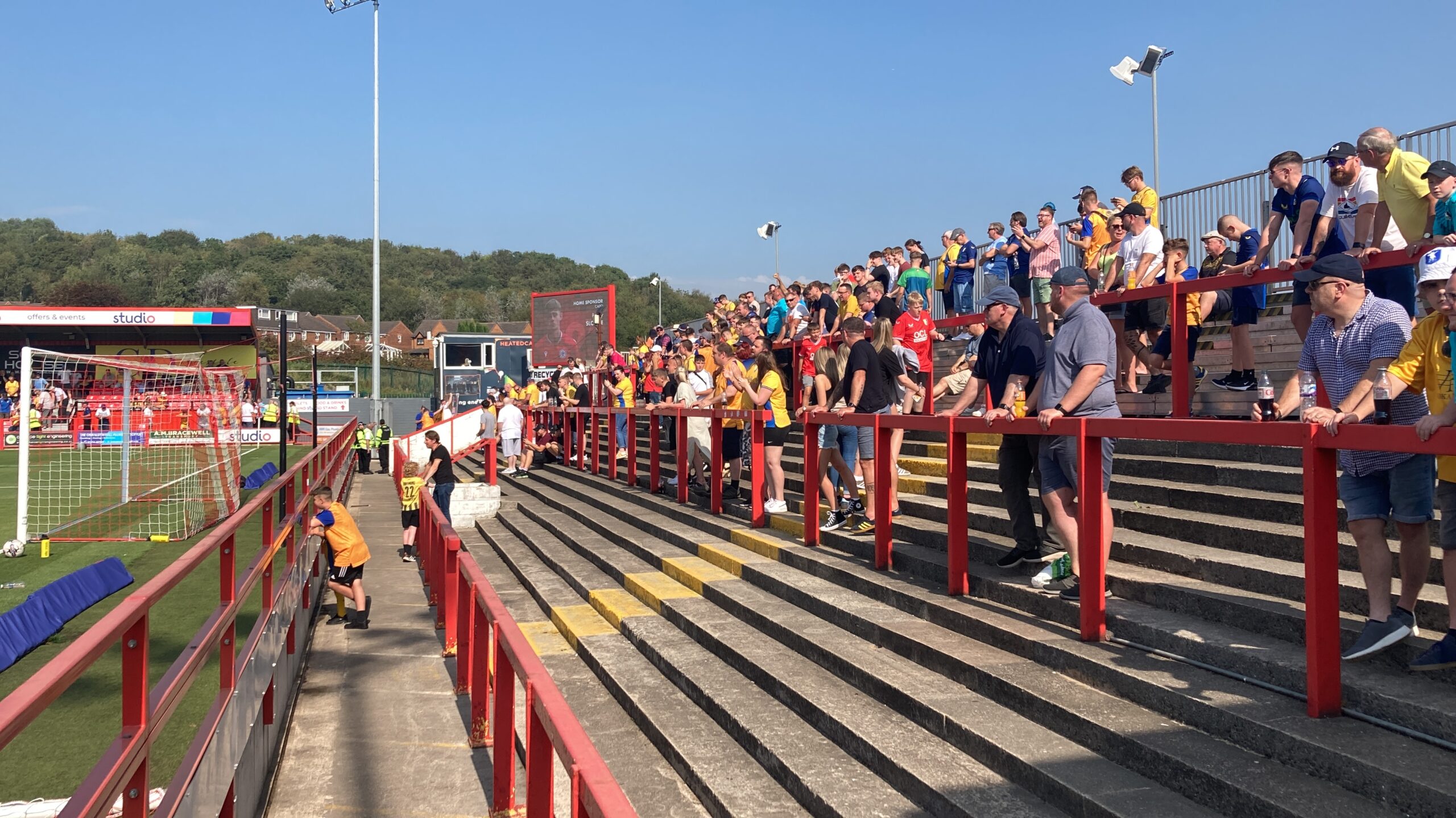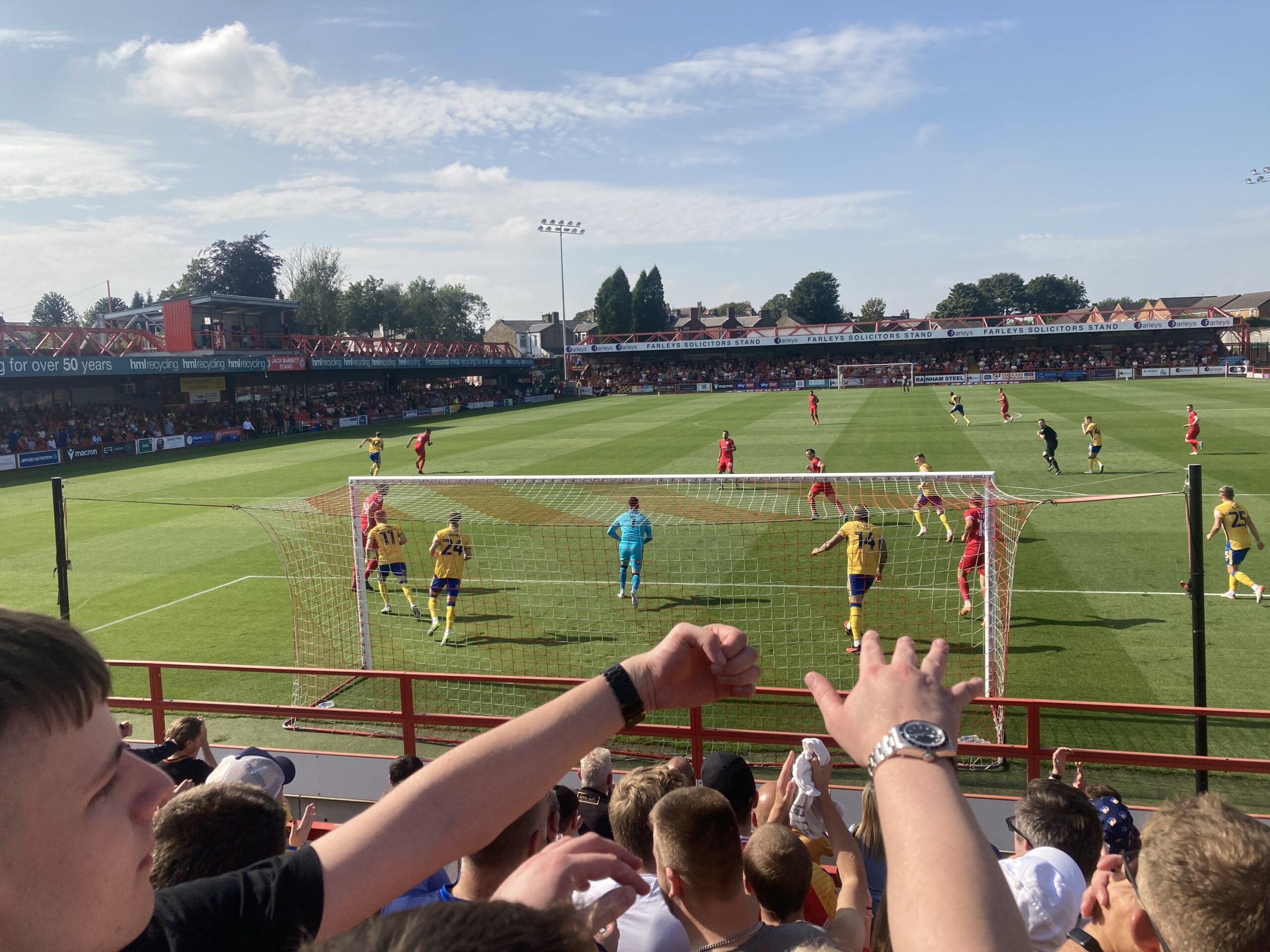 “ALLEZ ALLEZ ALLEZ!” Mansfield fans in fine voice already! Out come the teams to this tropical heat! It’s Accrington Stanley away for the Yellow & Blue Army! COME ON YOU YELLOWS! Out come the teams to this tropical heat! It’s Accrington Stanley away for the Yellow & Blue Army! COME ON YOU YELLOWS!