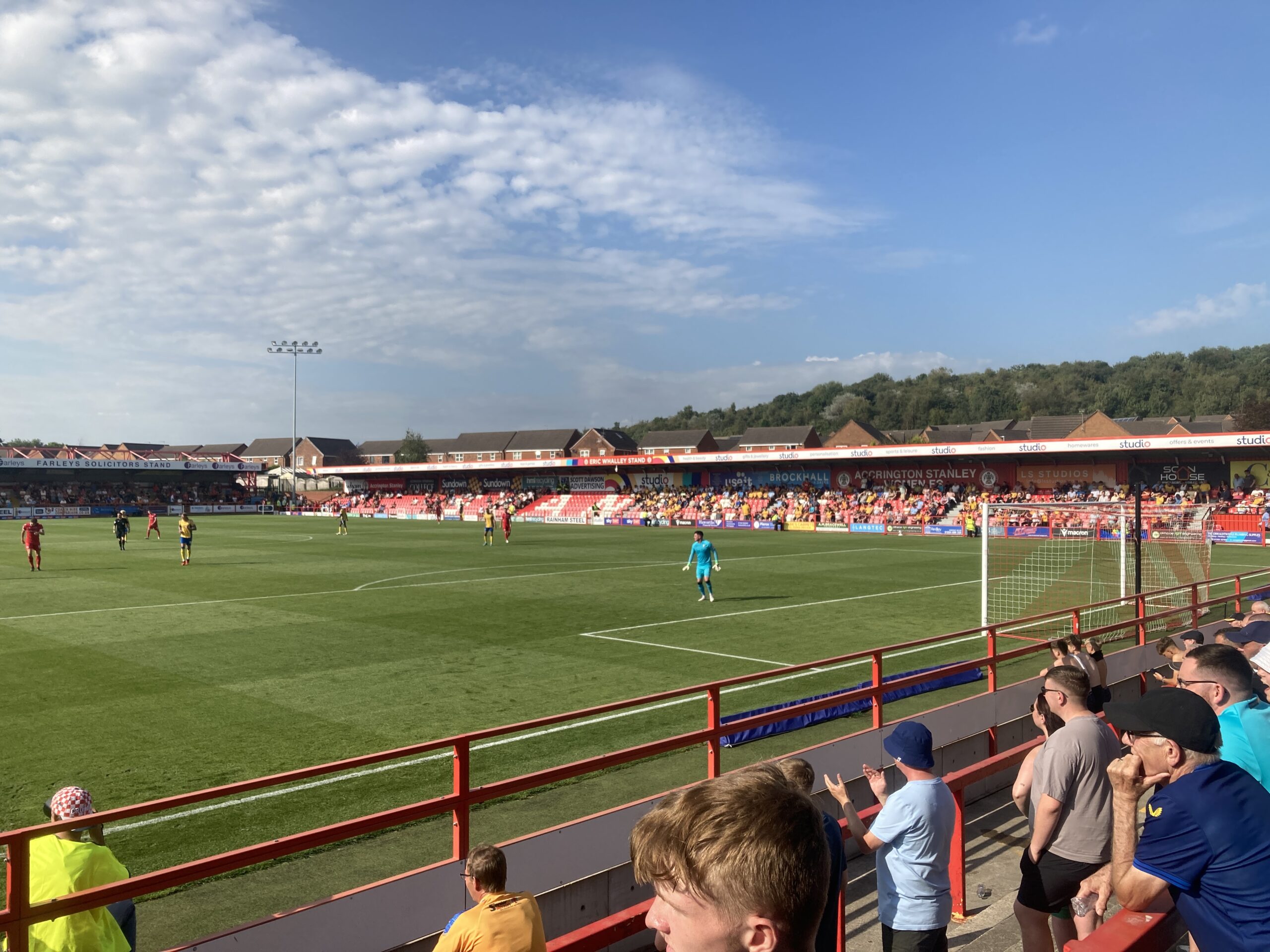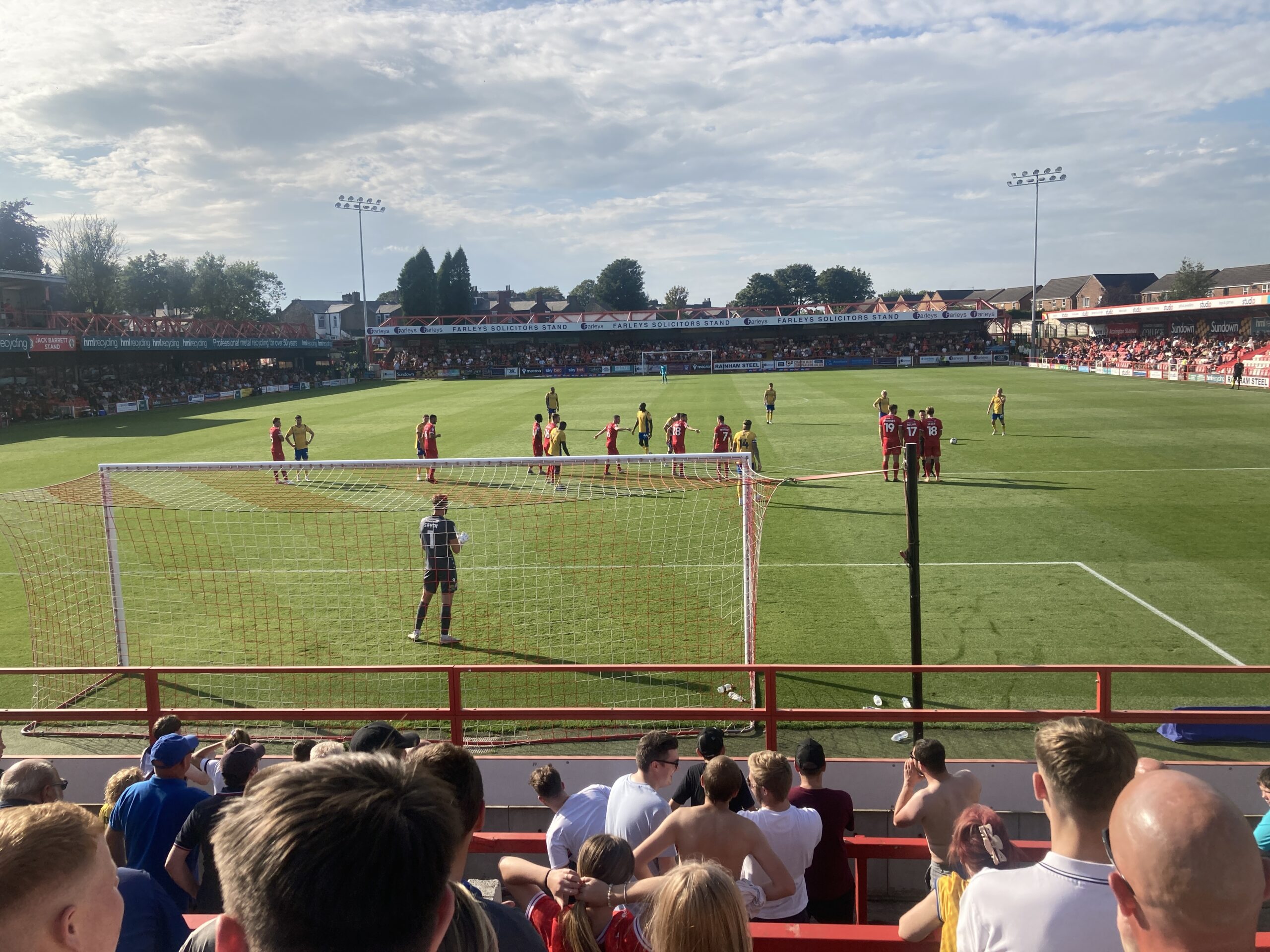 Kick Off! Allez Allez Allez still echoing around this open terrace so far! 20 minutes in and Mansfield have it down the right, it’s played in towards George Maris who heads it back across goal… No one there and Accrington clear.