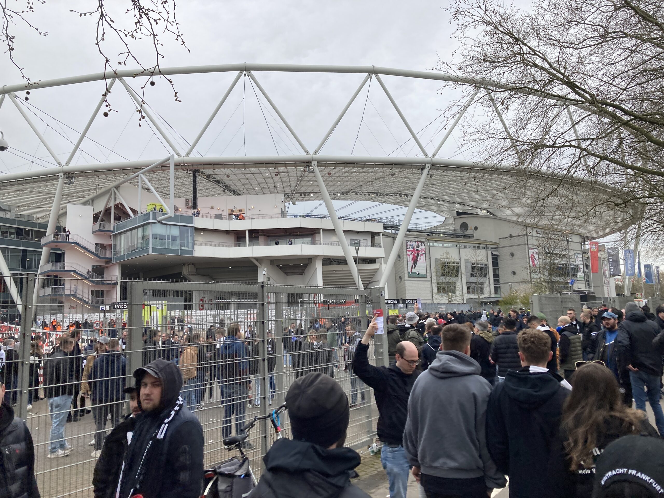 75 minutes now and Frankfurt play down the left, it’s played in low, Djibril Sow controls and shoots… That’s a brilliant finish!!! He curls it into the bottom corner! Frankfurt have one back! A few fans around us enjoyed that one and so did Teflon Dan! 2-1! Game on!