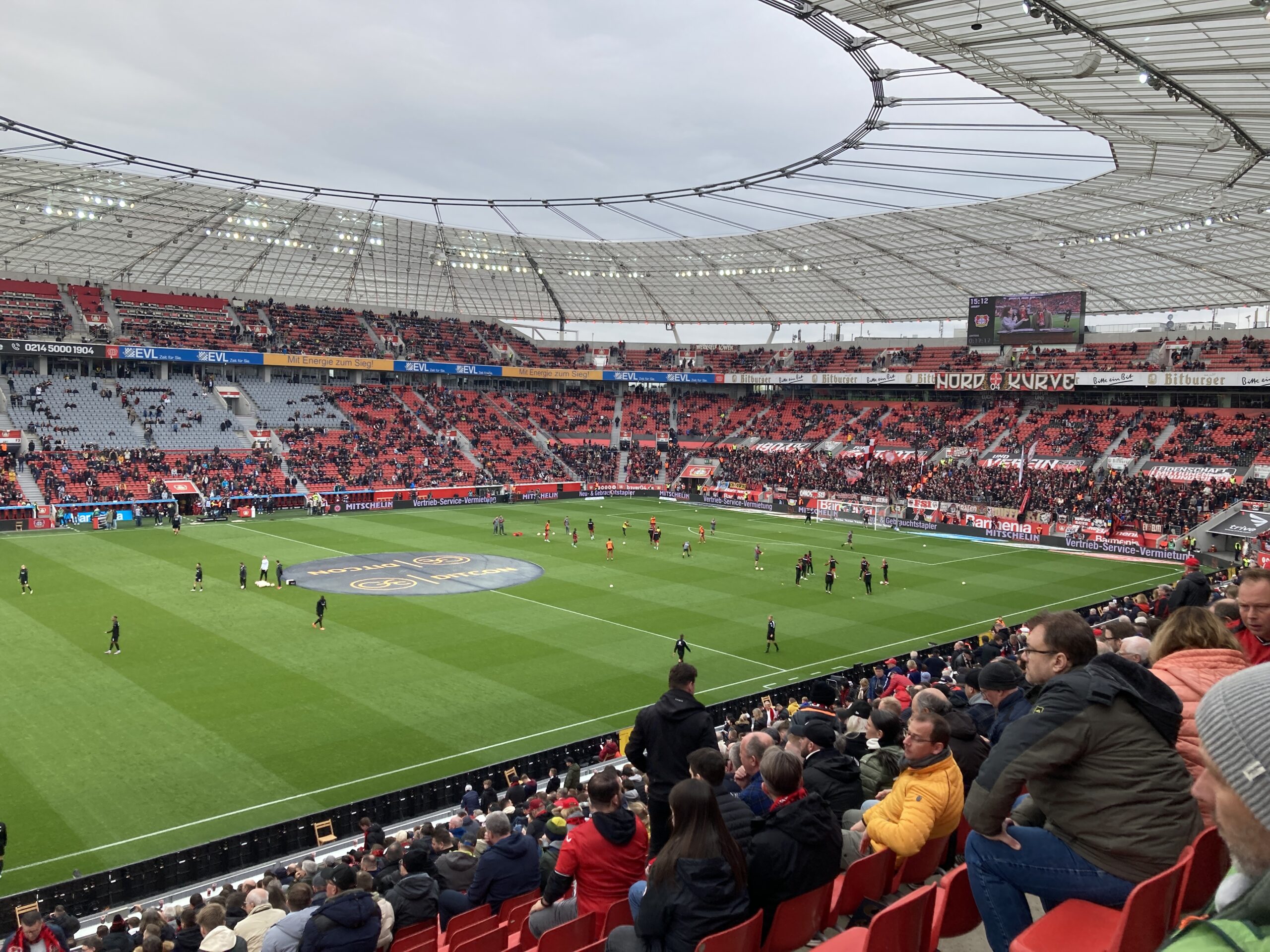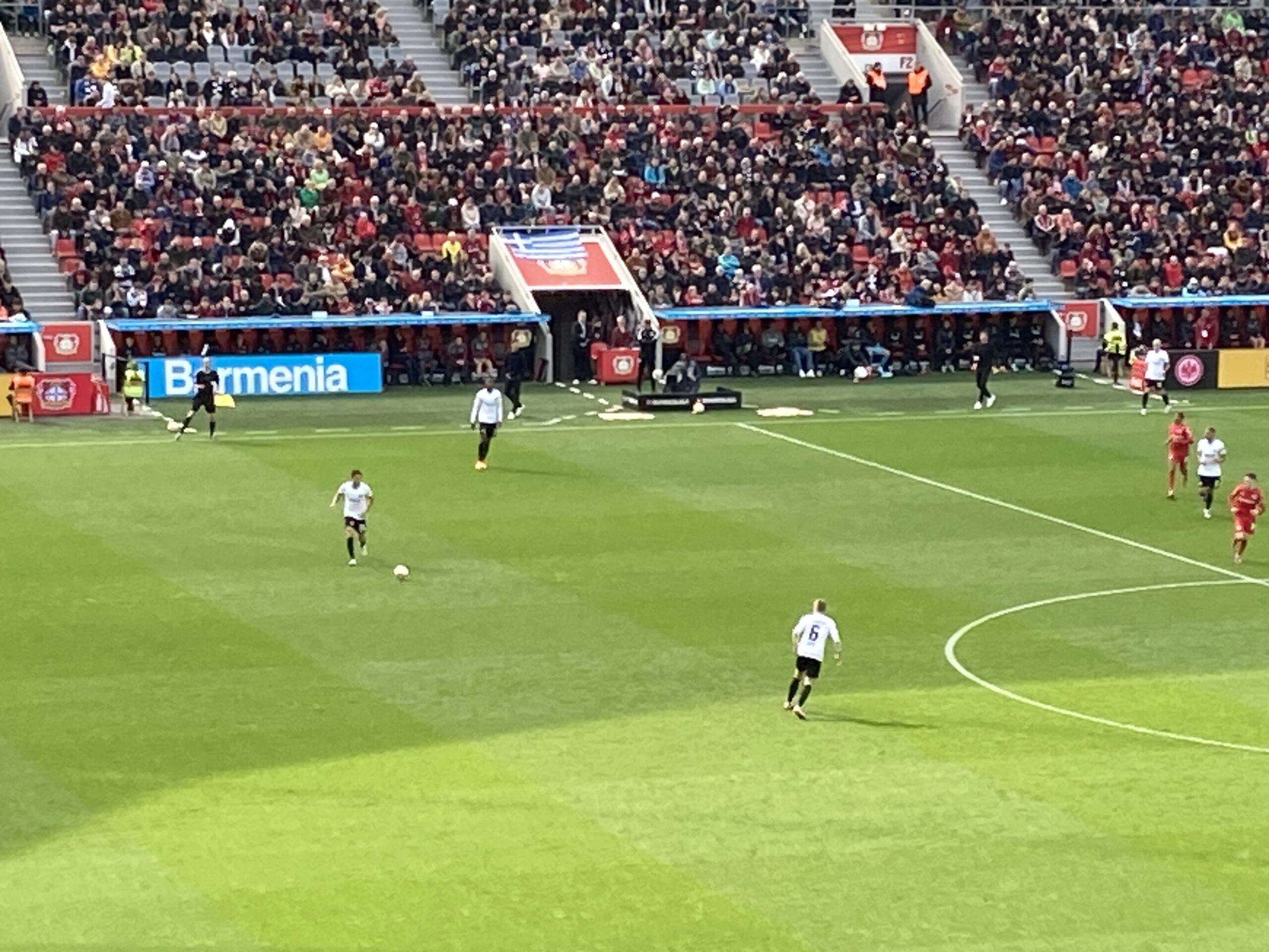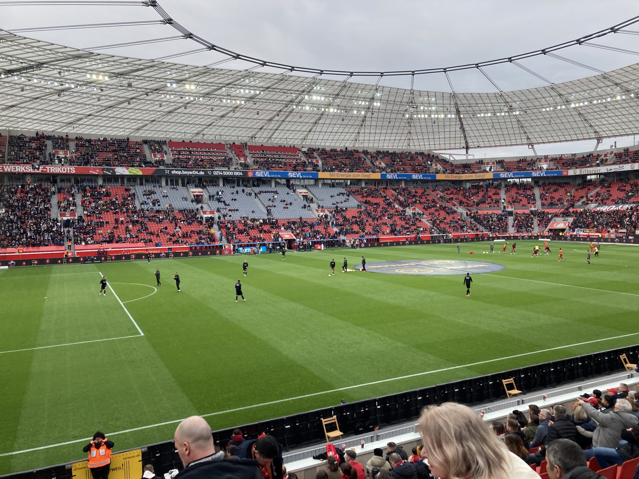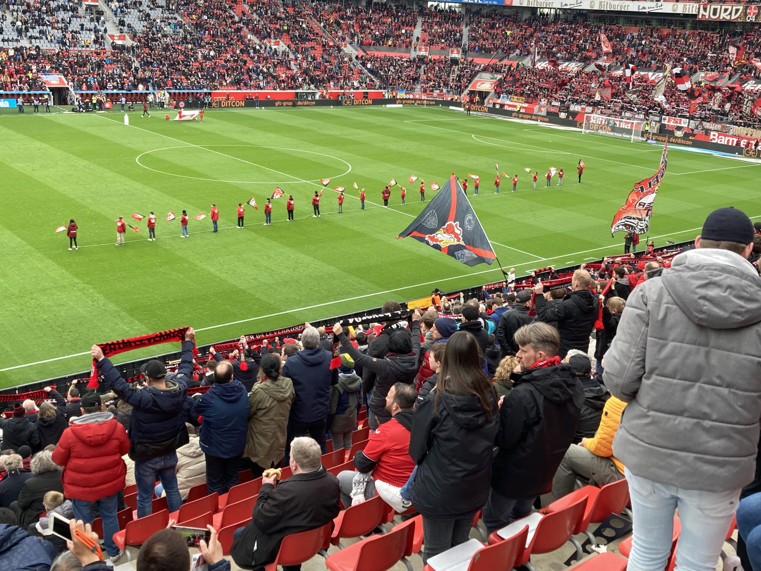 The Leverkusen anthem echoes around the ground as the players come out to the field! This is beautiful! The players are ready! International groundhopping is off and running for me today! Let’s have it!