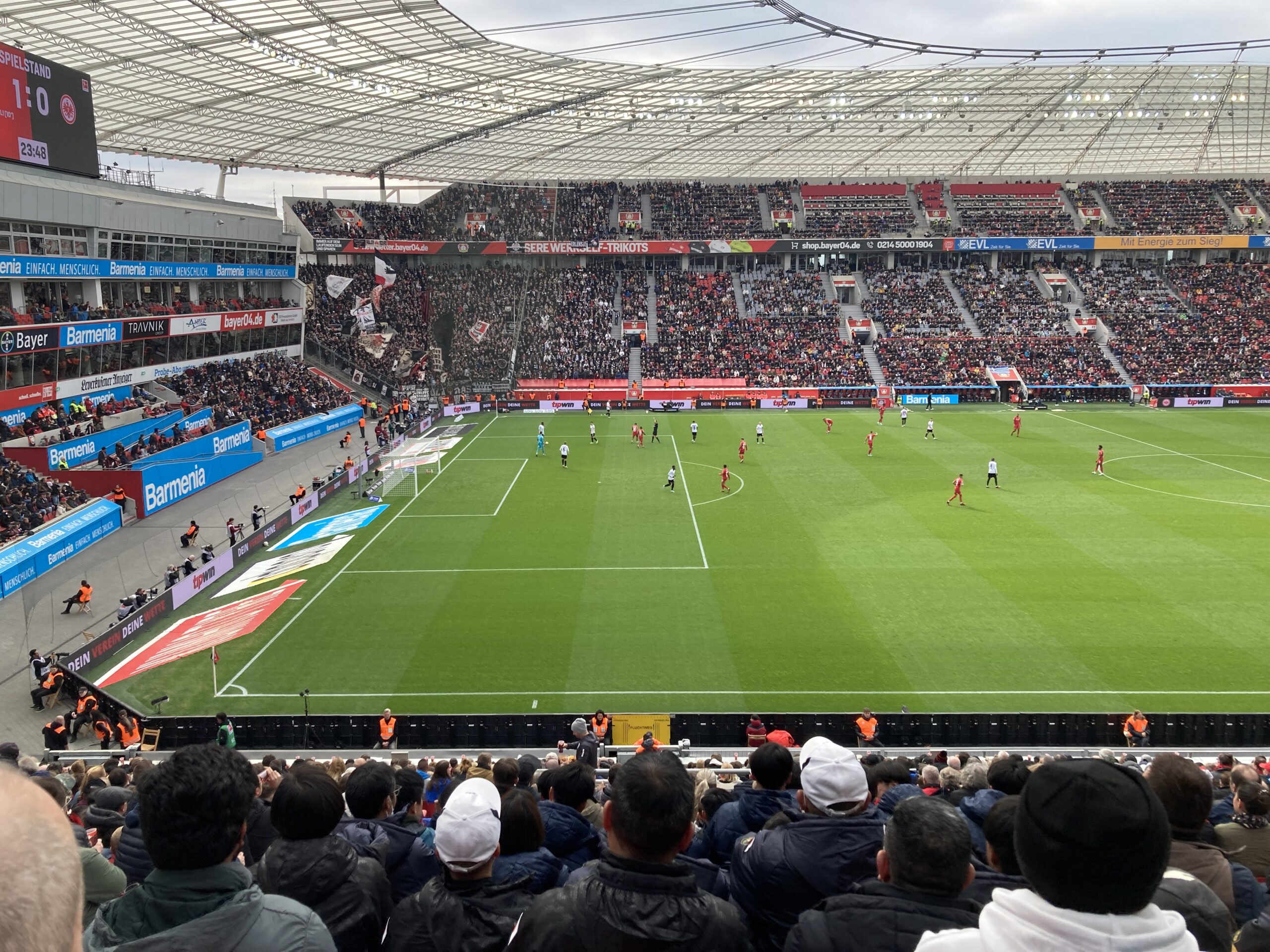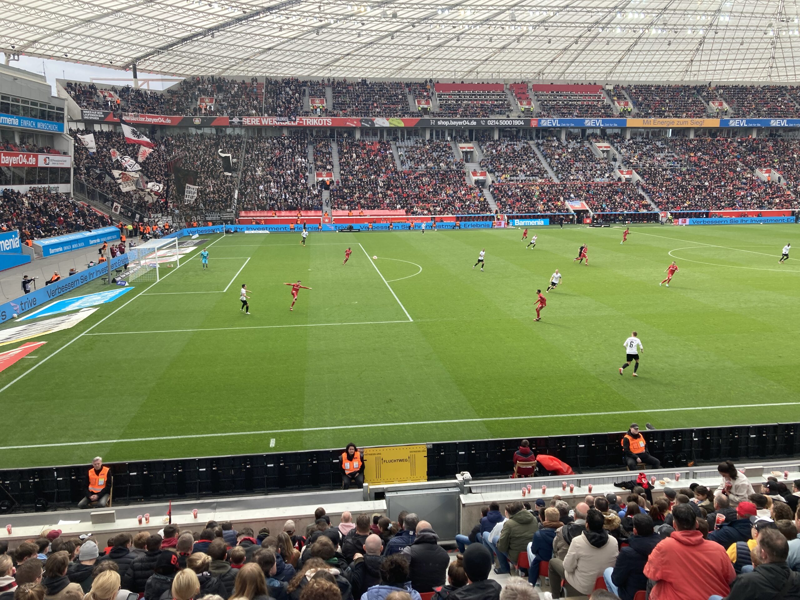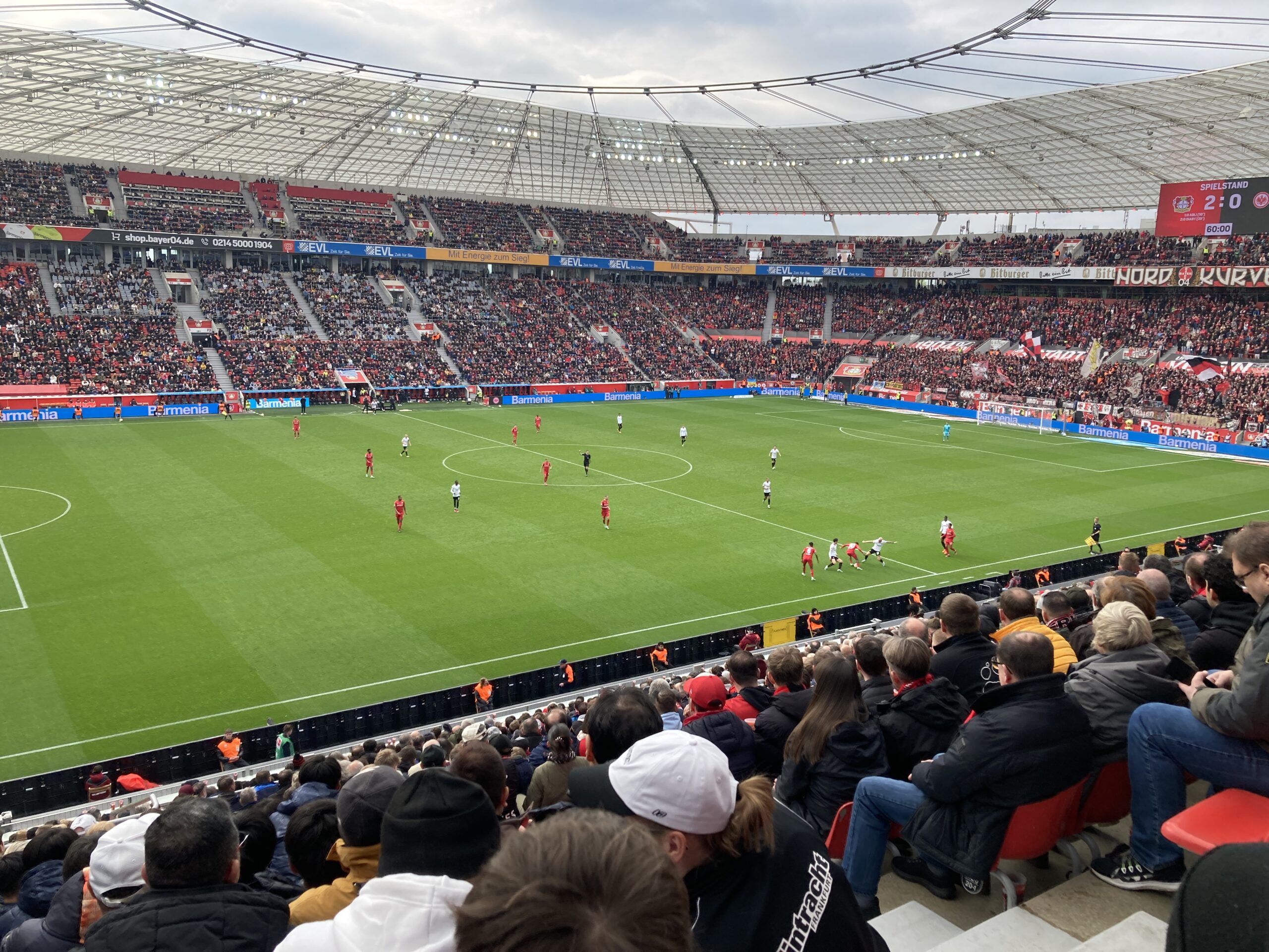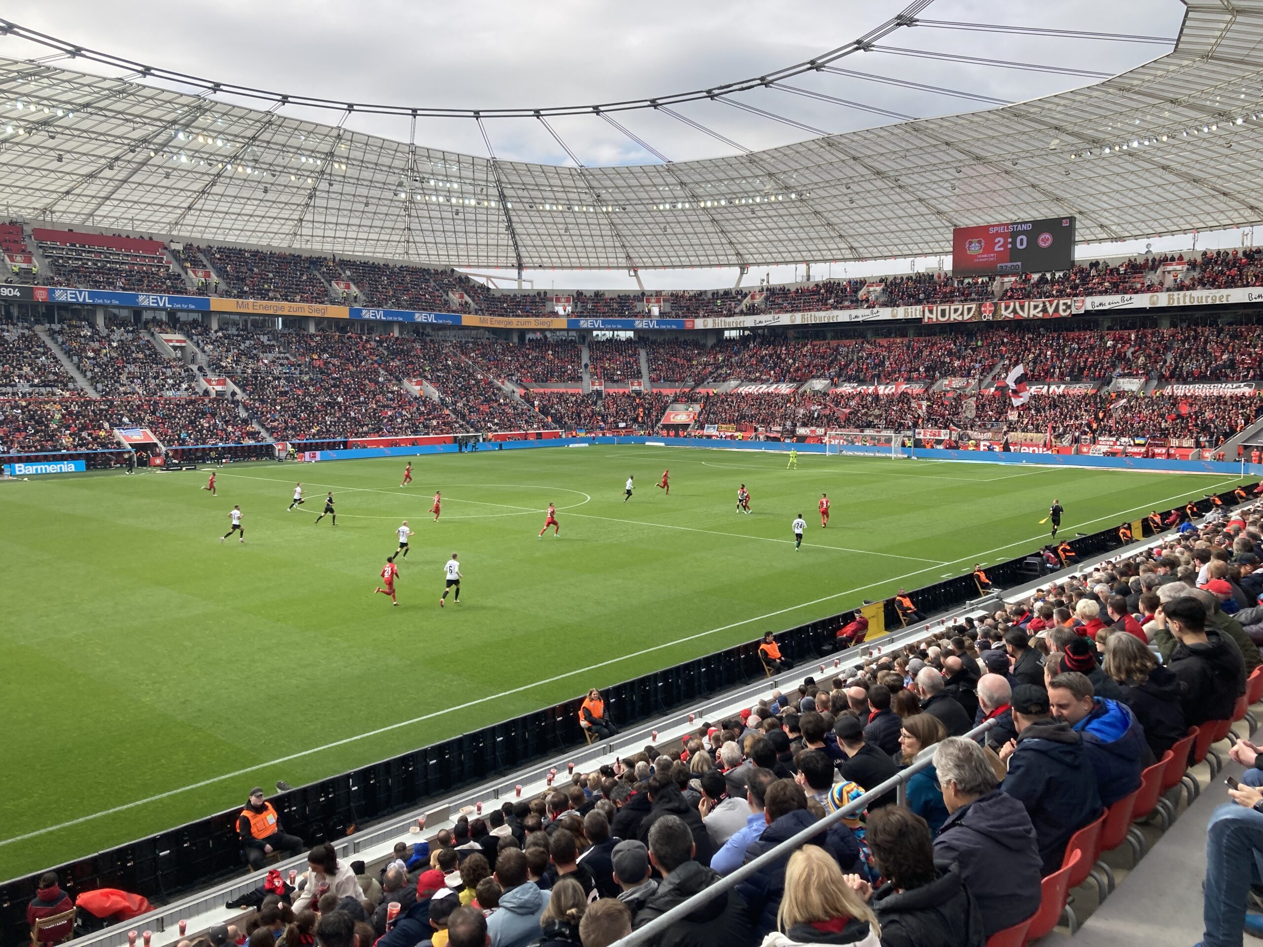 The Leverkusen anthem echoes around the ground as the players come out to the field! This is beautiful! The players are ready! International groundhopping is off and running for me today! Let’s have it!