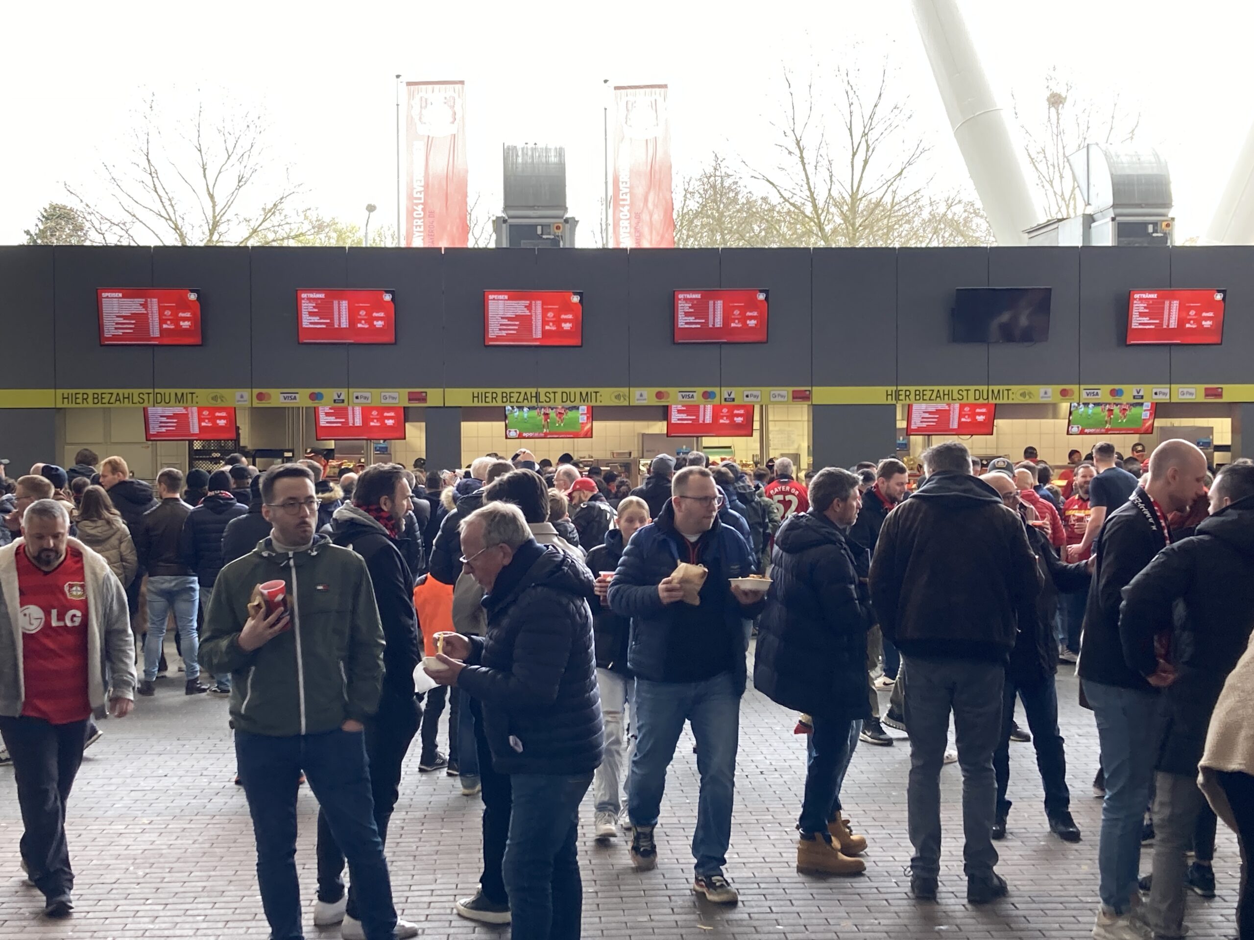 The train is finally here and we are en route to Leverkusen! 1 hour and a few Fieges later and we are here in Leverkusen! A short walk later and there it is! The BayArena! Beautiful! €40 for this one! Das is gut! A reminder that drinking is allowed on the terraces in Germany! I’ll need a new liver after this weekend…