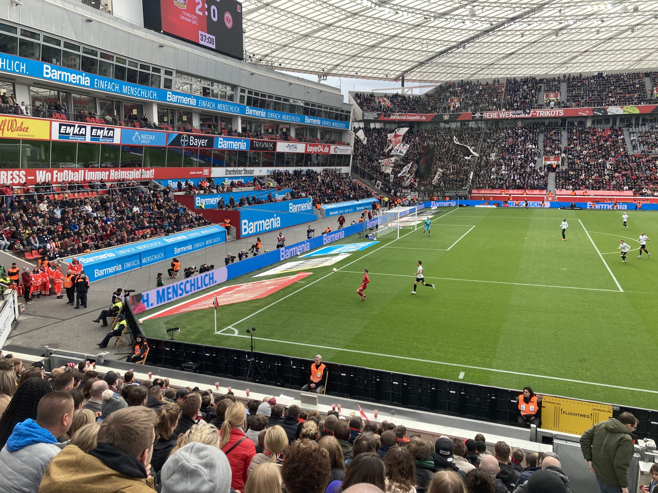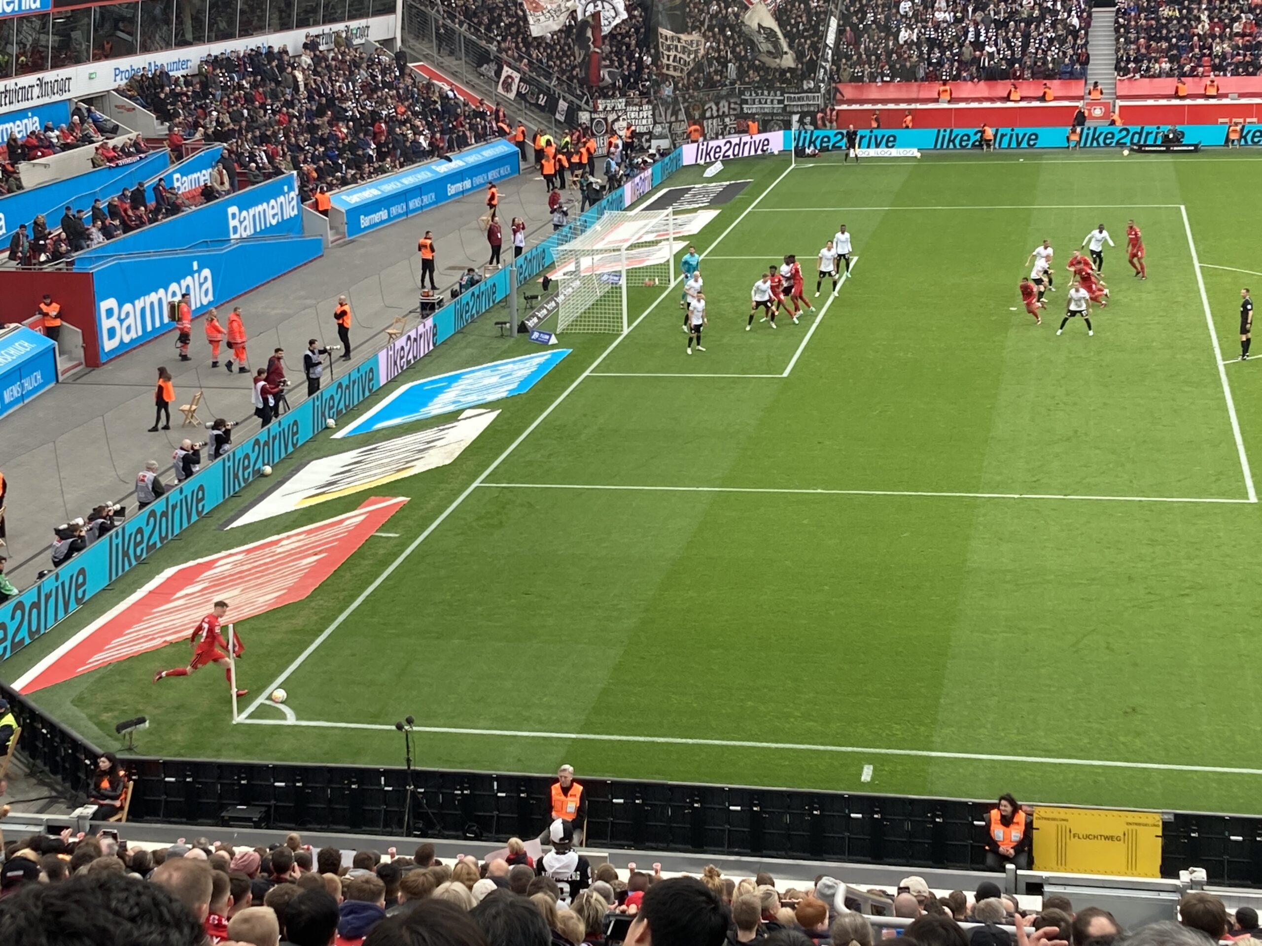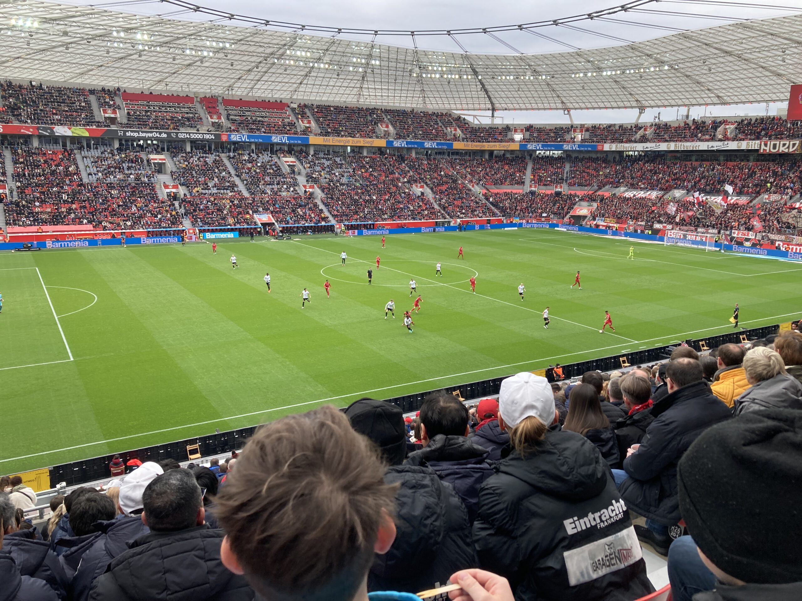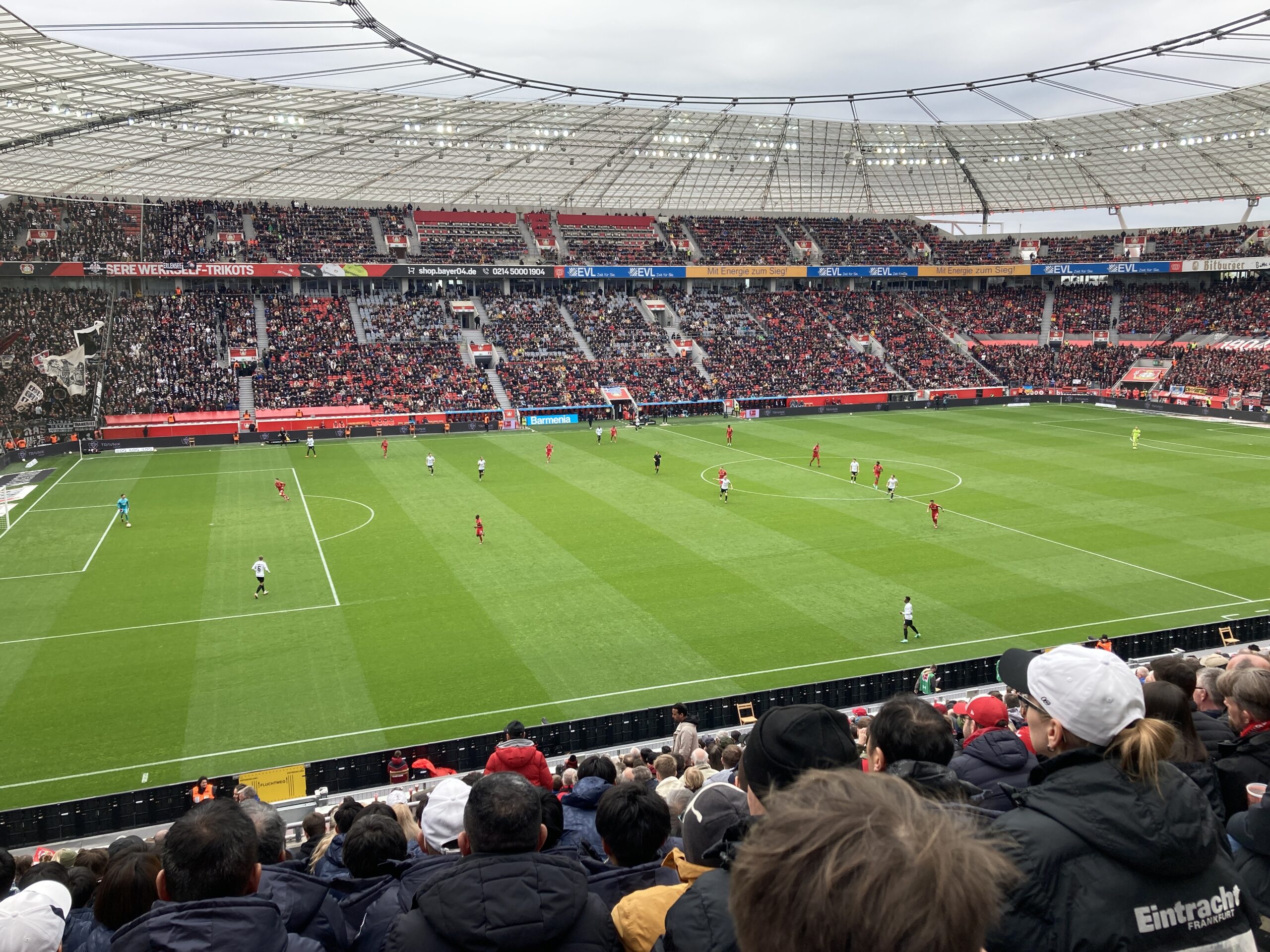 Kick Off! The atmosphere created by the Eintracht Frankfurt fans so far is biblical! The Leverkusen ultras are in good spirits now as well, I don’t want to give away any hint of ratings so far… but this is amazing! An early injury to a Leverkusen player and the jeers are getting pretty deafening around the ground!