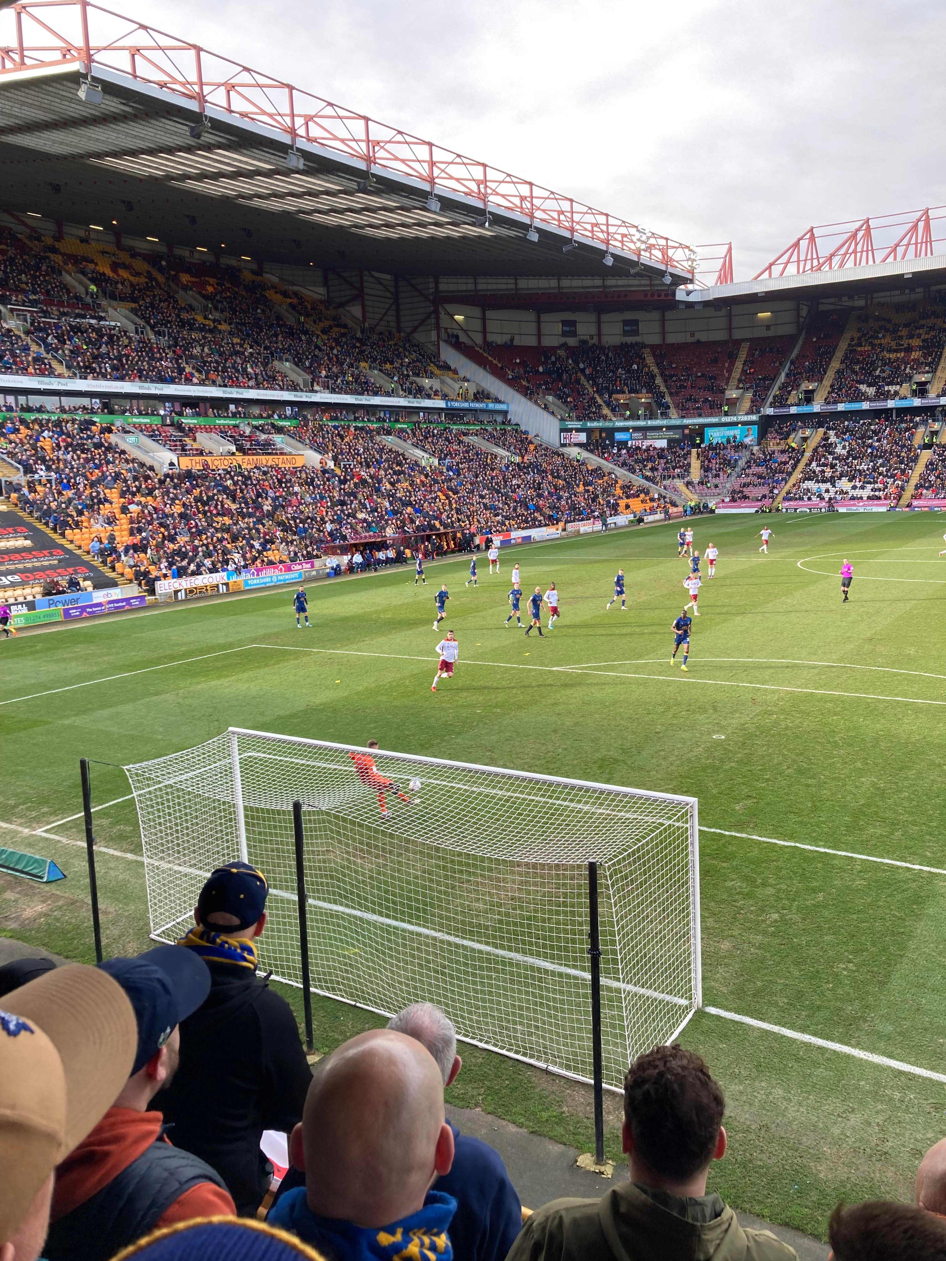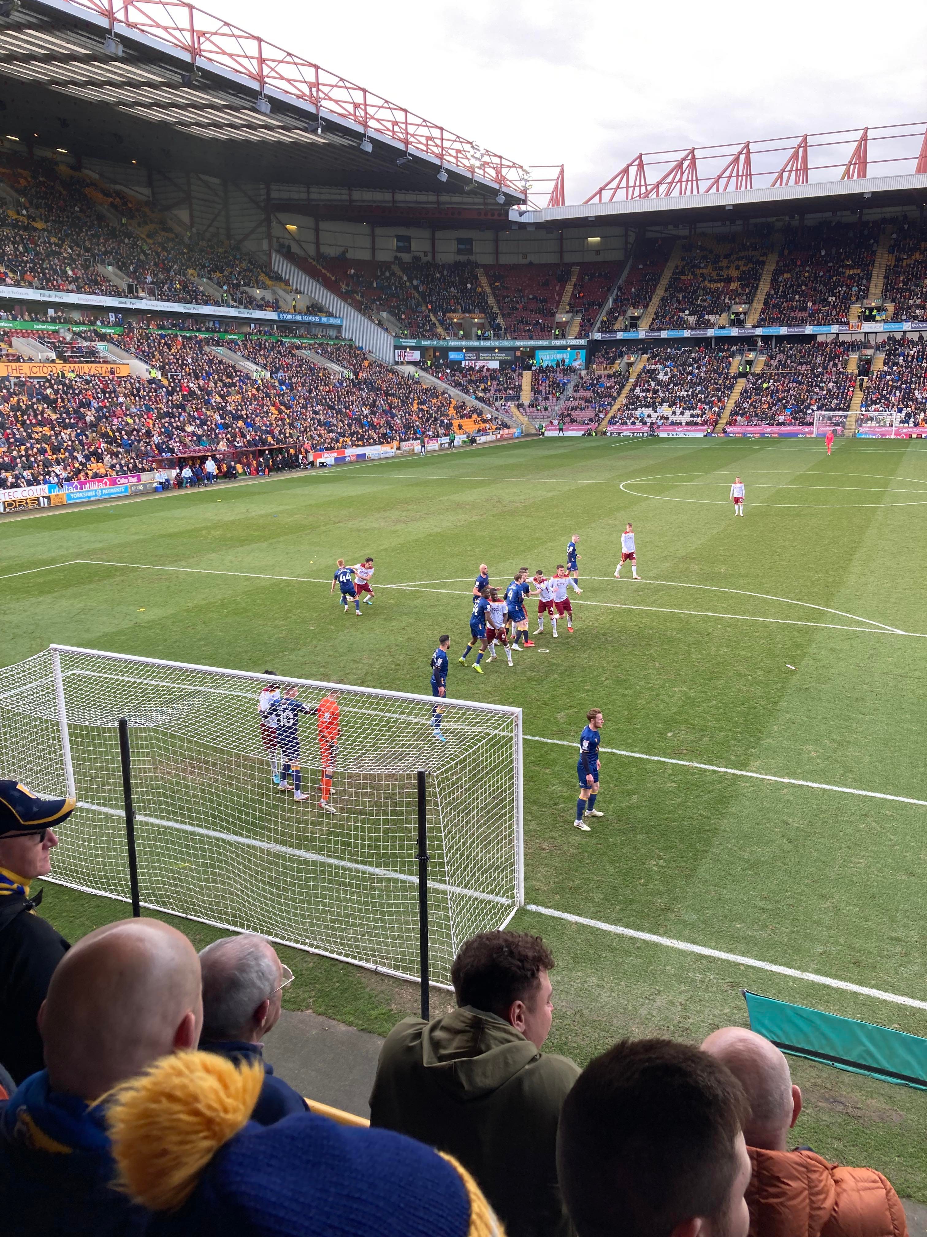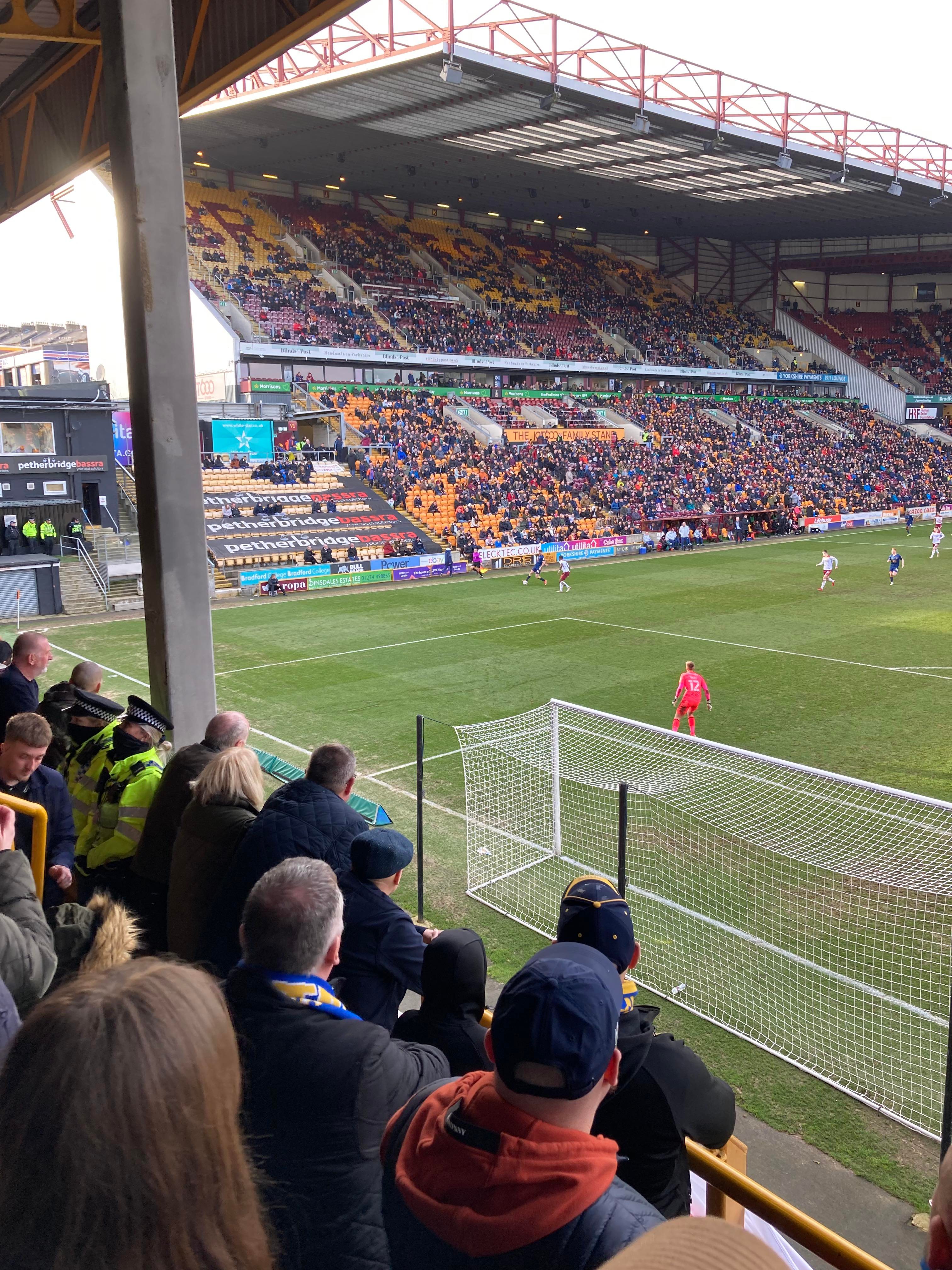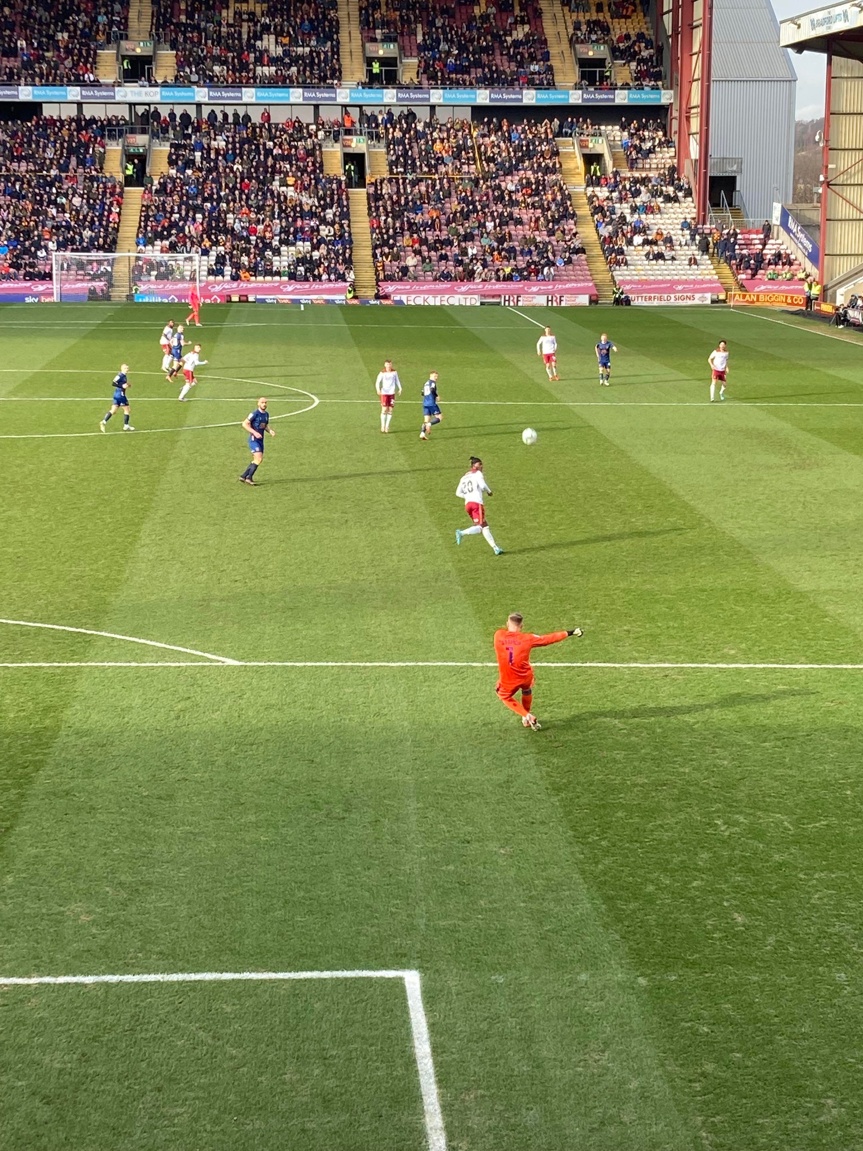 “We’re on our way! We’re on our way! To the League One we’re on our way!” Mansfield fans in fine voice so far! “I see the Q block boys arising! I see the trouble on the way! Don’t go out tonight! If you’re Blue & White! Because Mansfield Q block boys are on their way!” A new chant! Love it! Mansfield starting the better of the 2 teams so far. 15 minutes in and Bradford have a free kick in the Mansfield half, it’s played into the box, Paudie O’Connor with the header… Just wide!