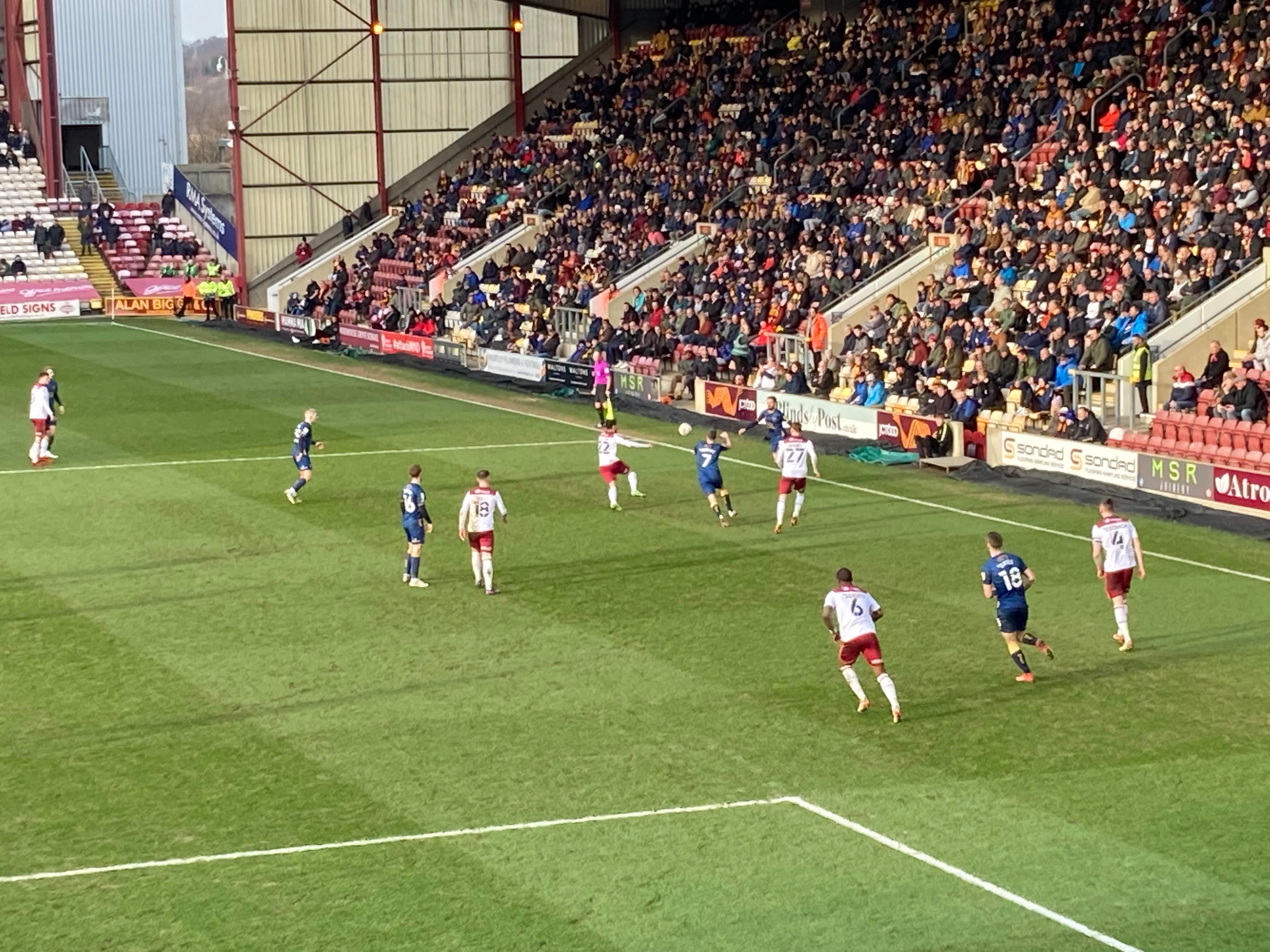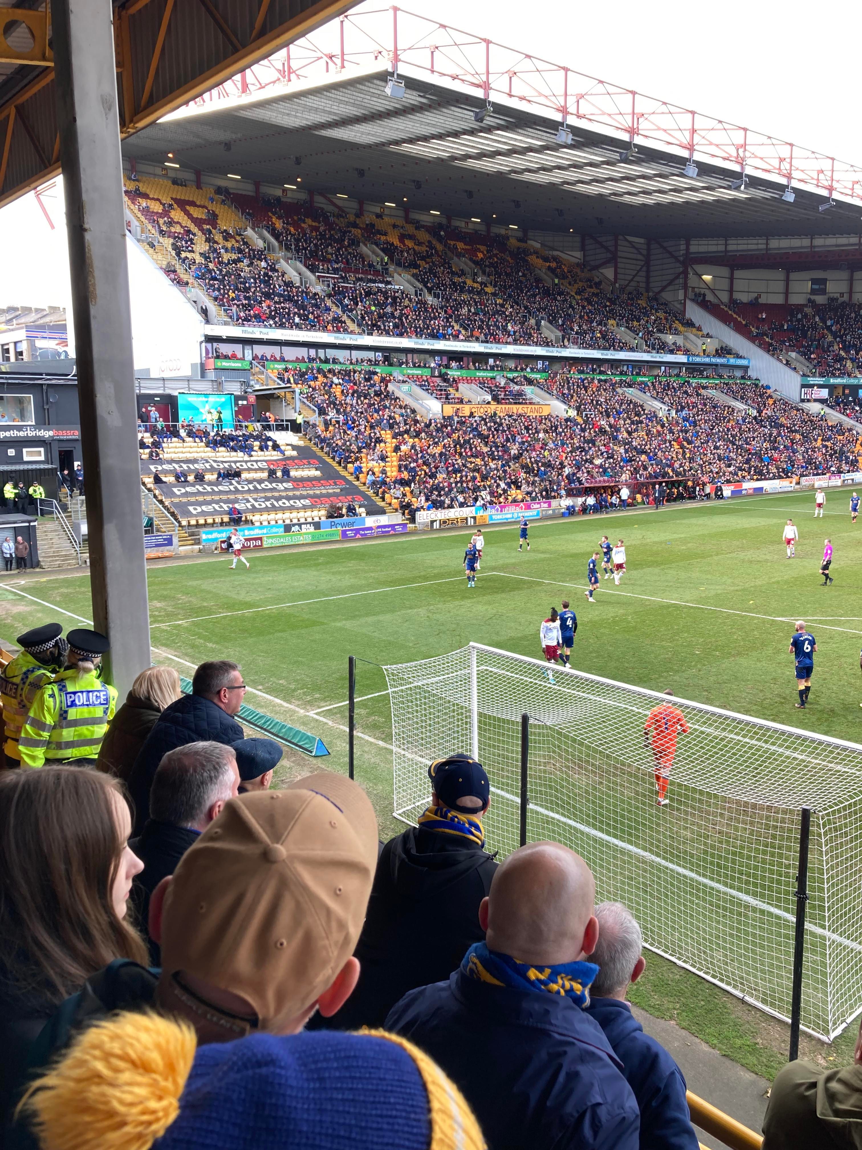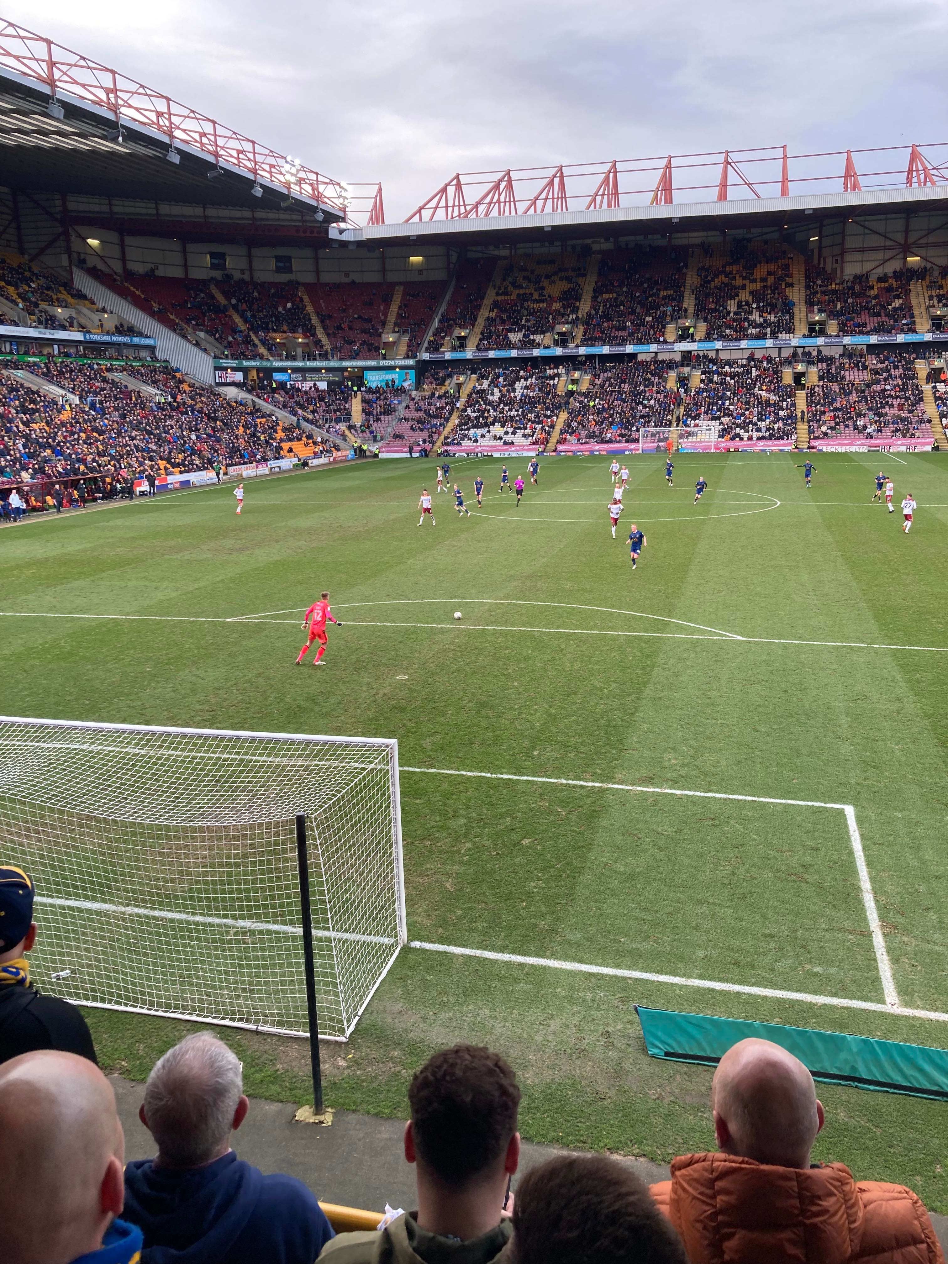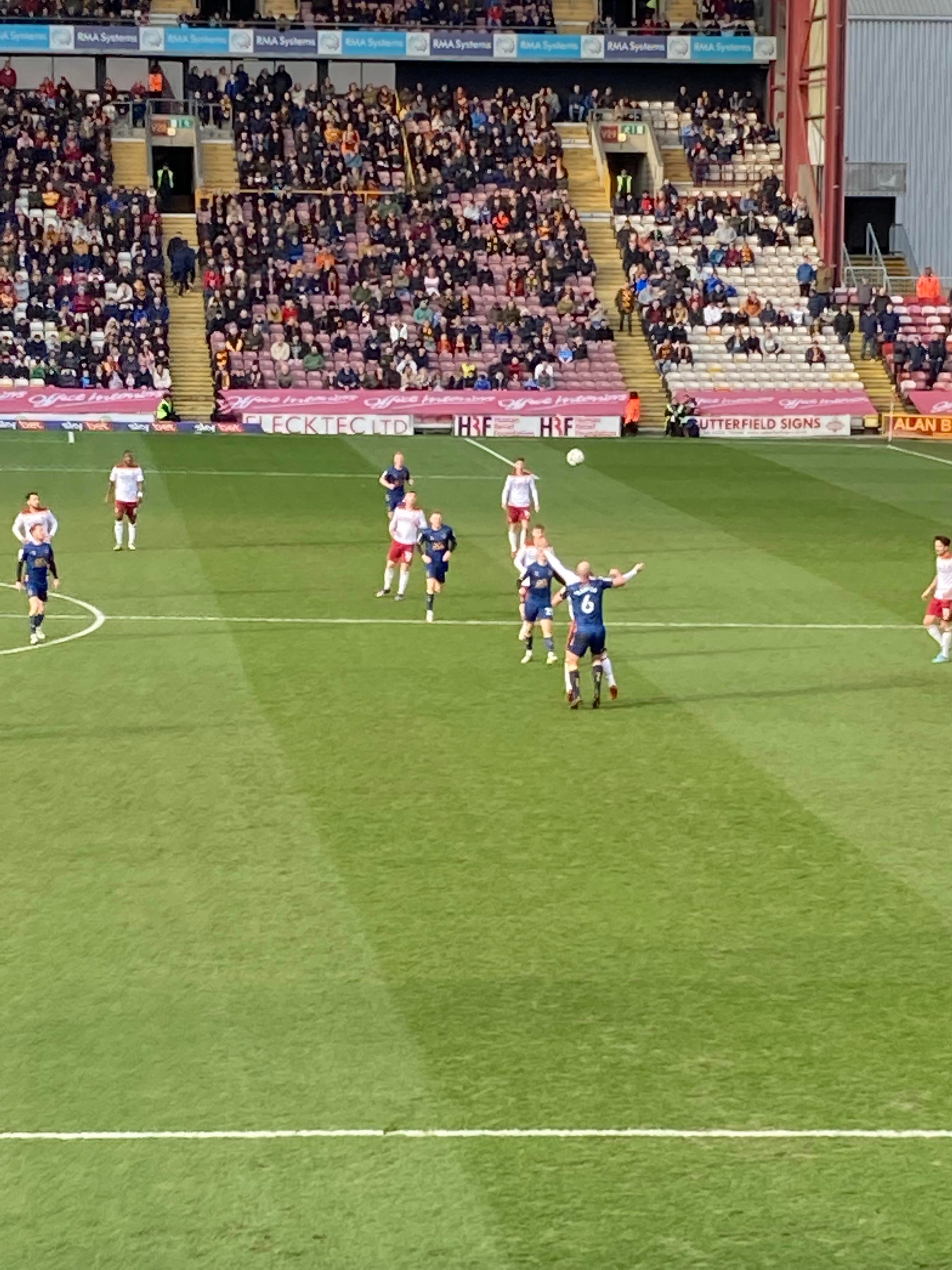 “We’re on our way! We’re on our way! To the League One we’re on our way!” Mansfield fans in fine voice so far! “I see the Q block boys arising! I see the trouble on the way! Don’t go out tonight! If you’re Blue & White! Because Mansfield Q block boys are on their way!” A new chant! Love it! Mansfield starting the better of the 2 teams so far. 15 minutes in and Bradford have a free kick in the Mansfield half, it’s played into the box, Paudie O’Connor with the header… Just wide!