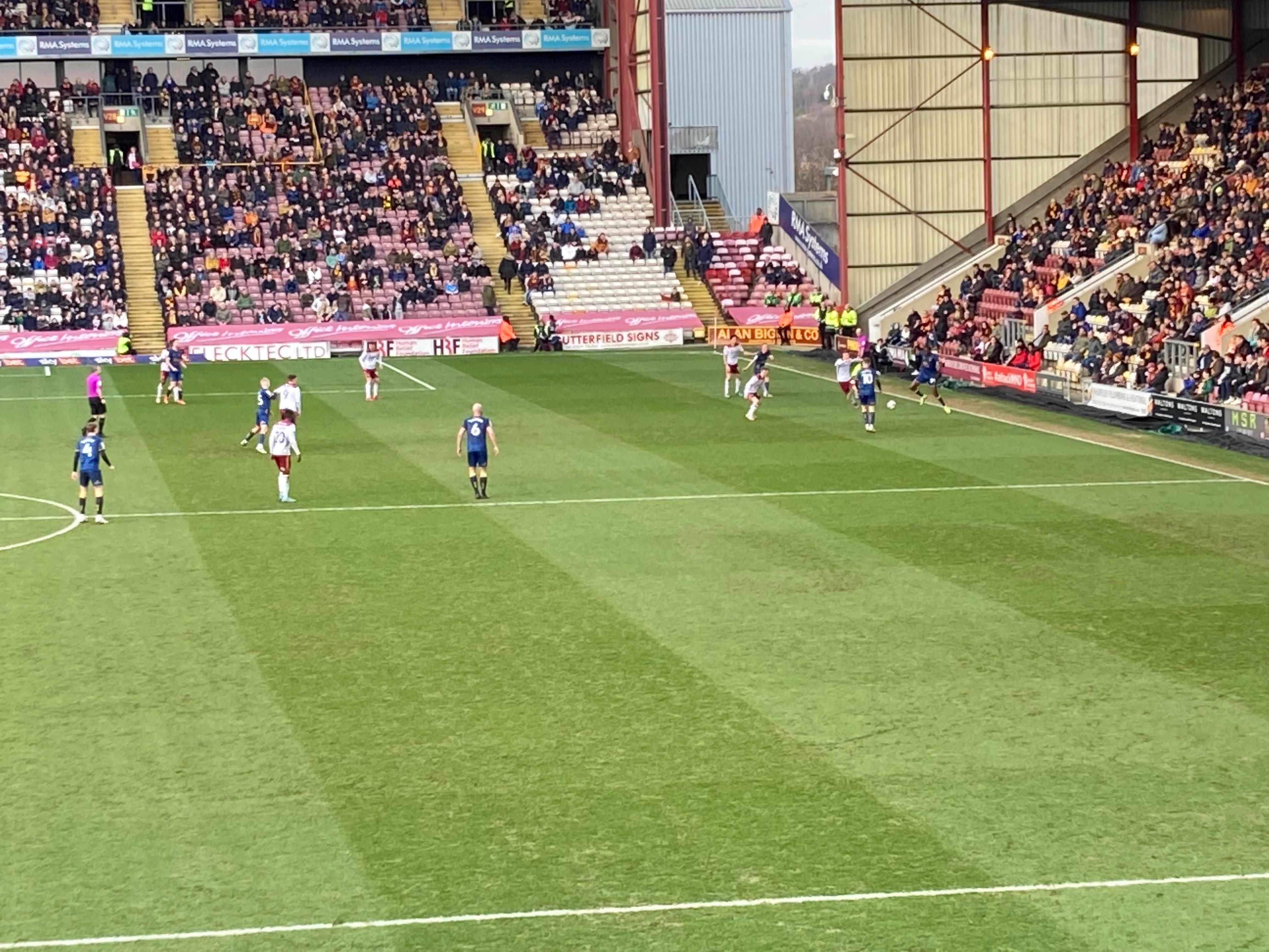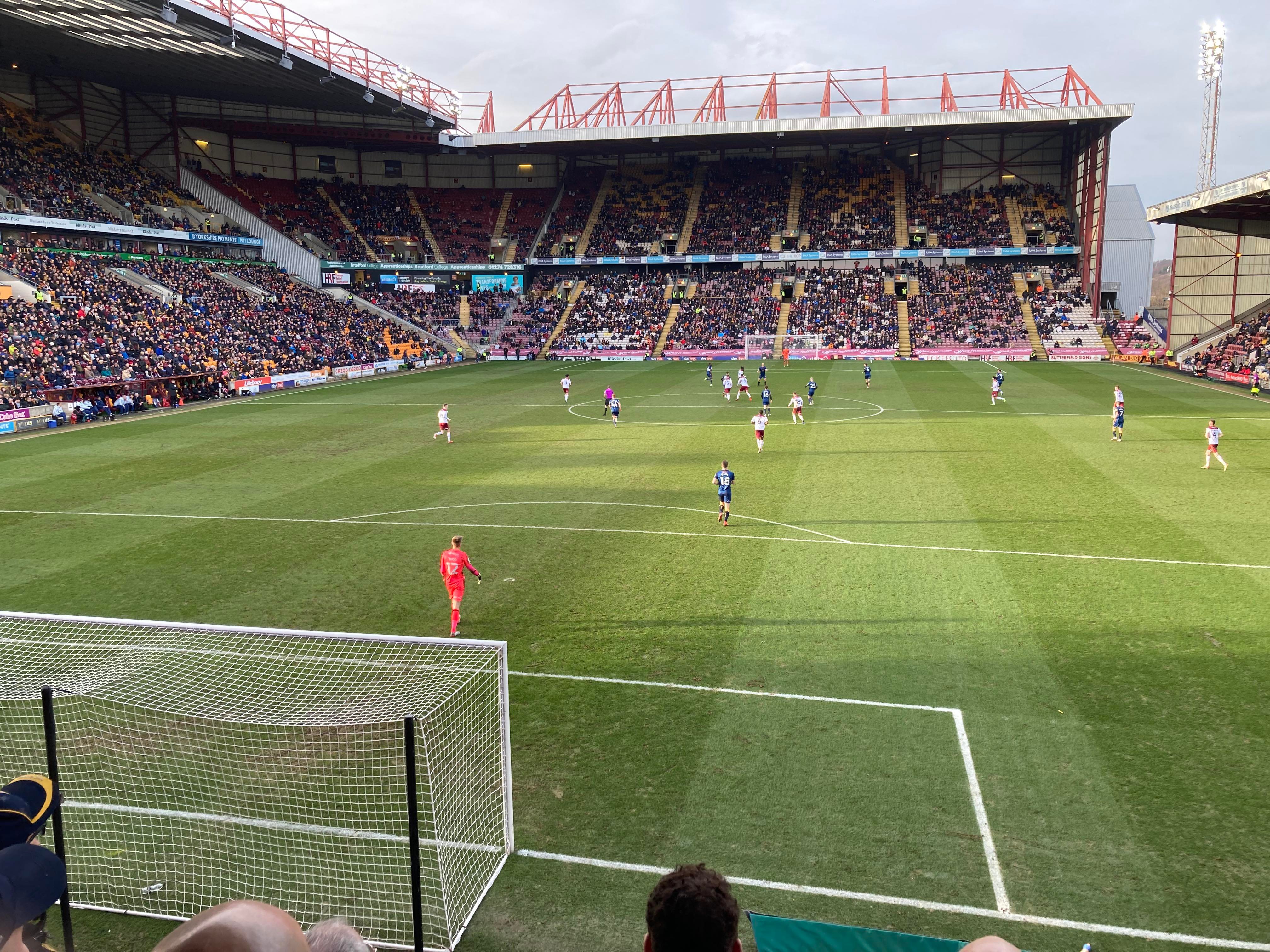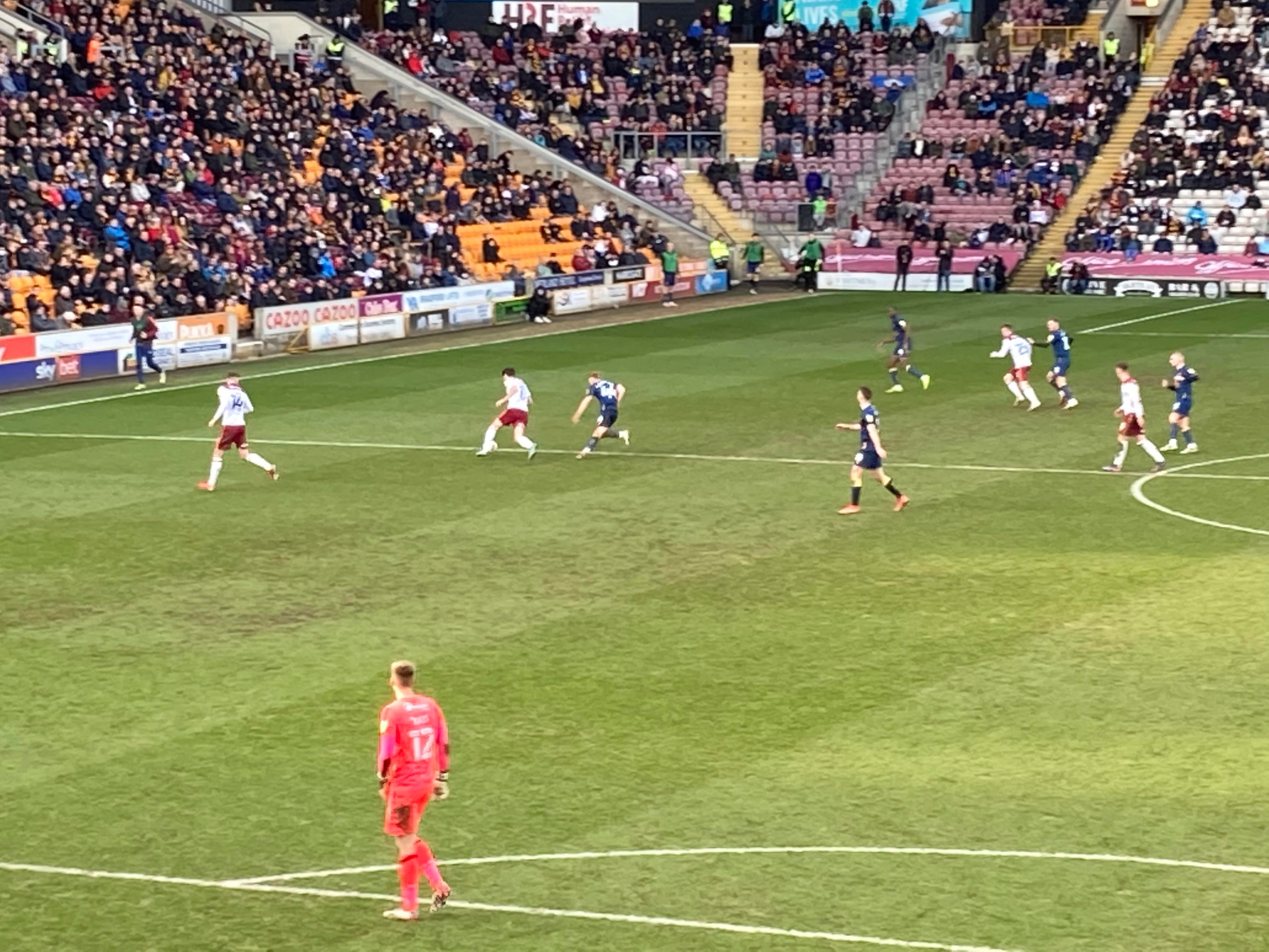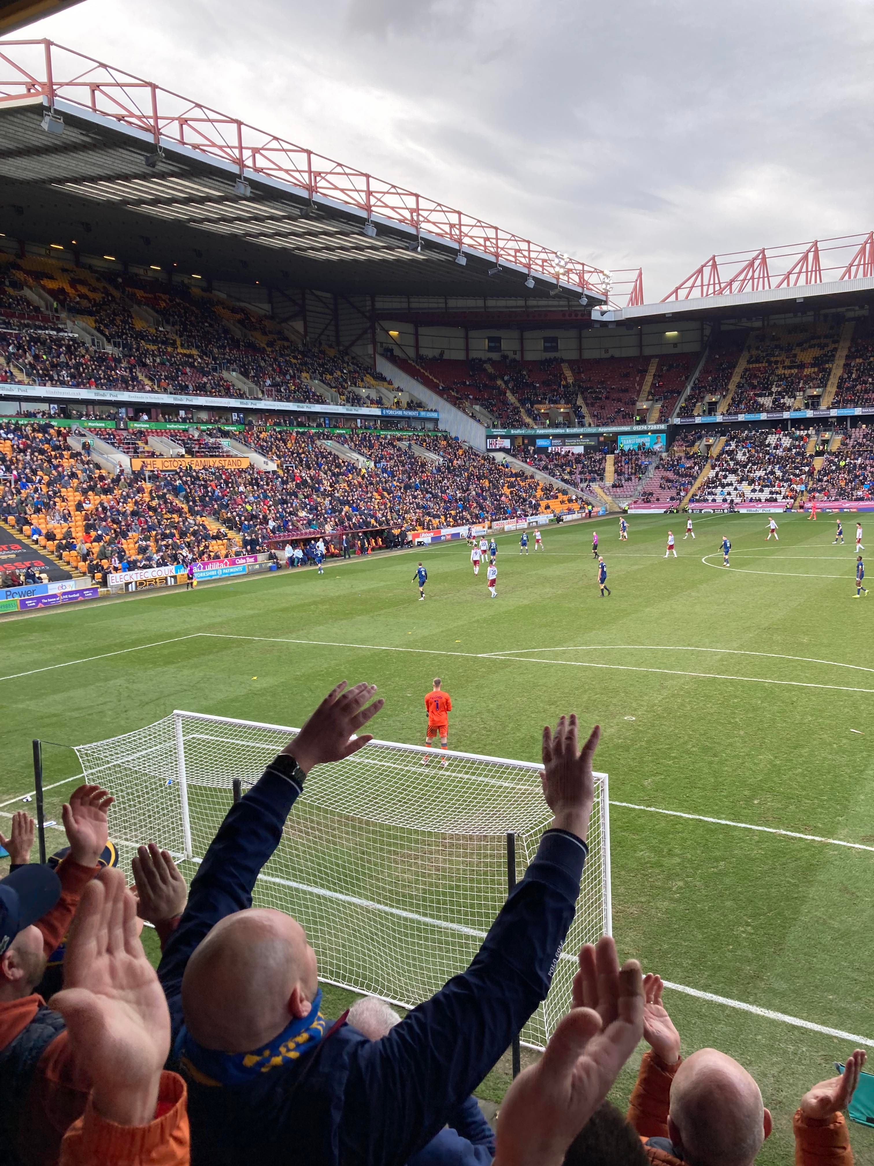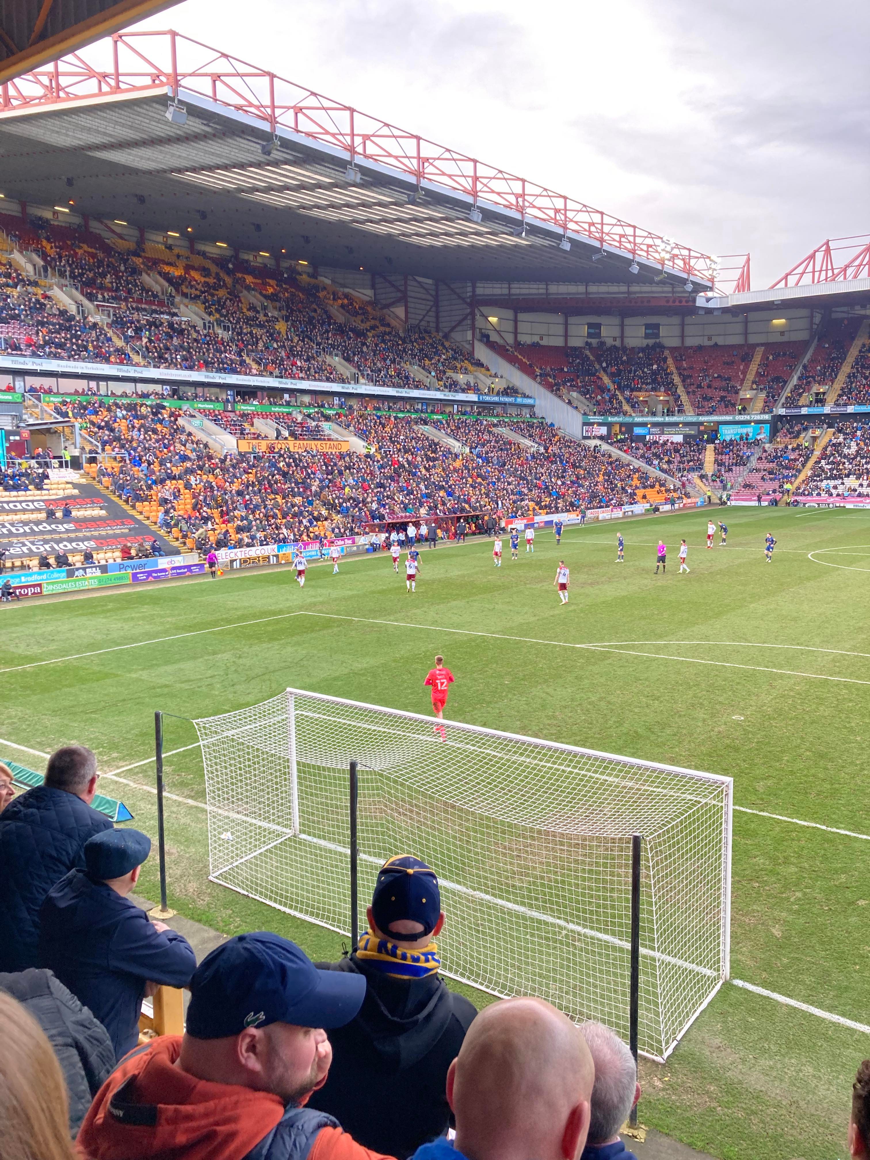 “We’re on our way! We’re on our way! To the League One we’re on our way!” Mansfield fans in fine voice so far! “I see the Q block boys arising! I see the trouble on the way! Don’t go out tonight! If you’re Blue & White! Because Mansfield Q block boys are on their way!” A new chant! Love it! Mansfield starting the better of the 2 teams so far. 15 minutes in and Bradford have a free kick in the Mansfield half, it’s played into the box, Paudie O’Connor with the header… Just wide!