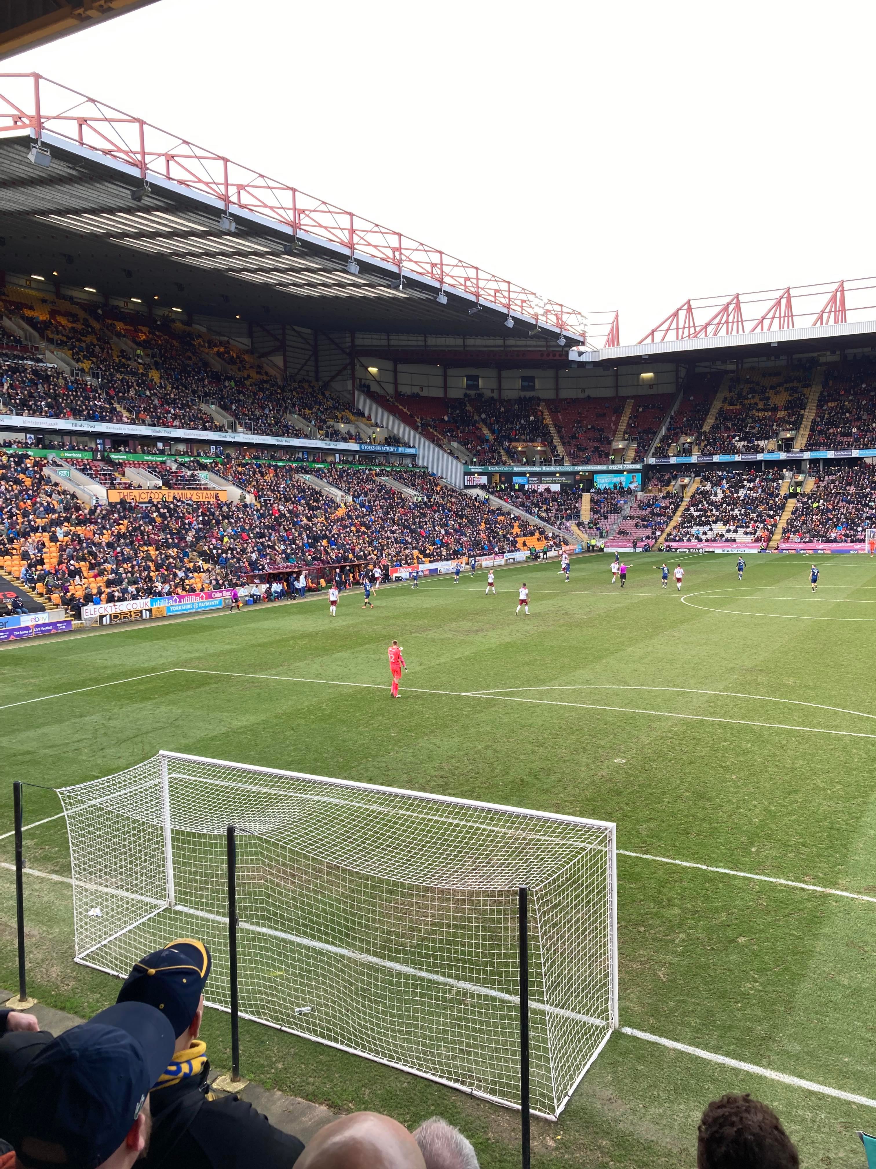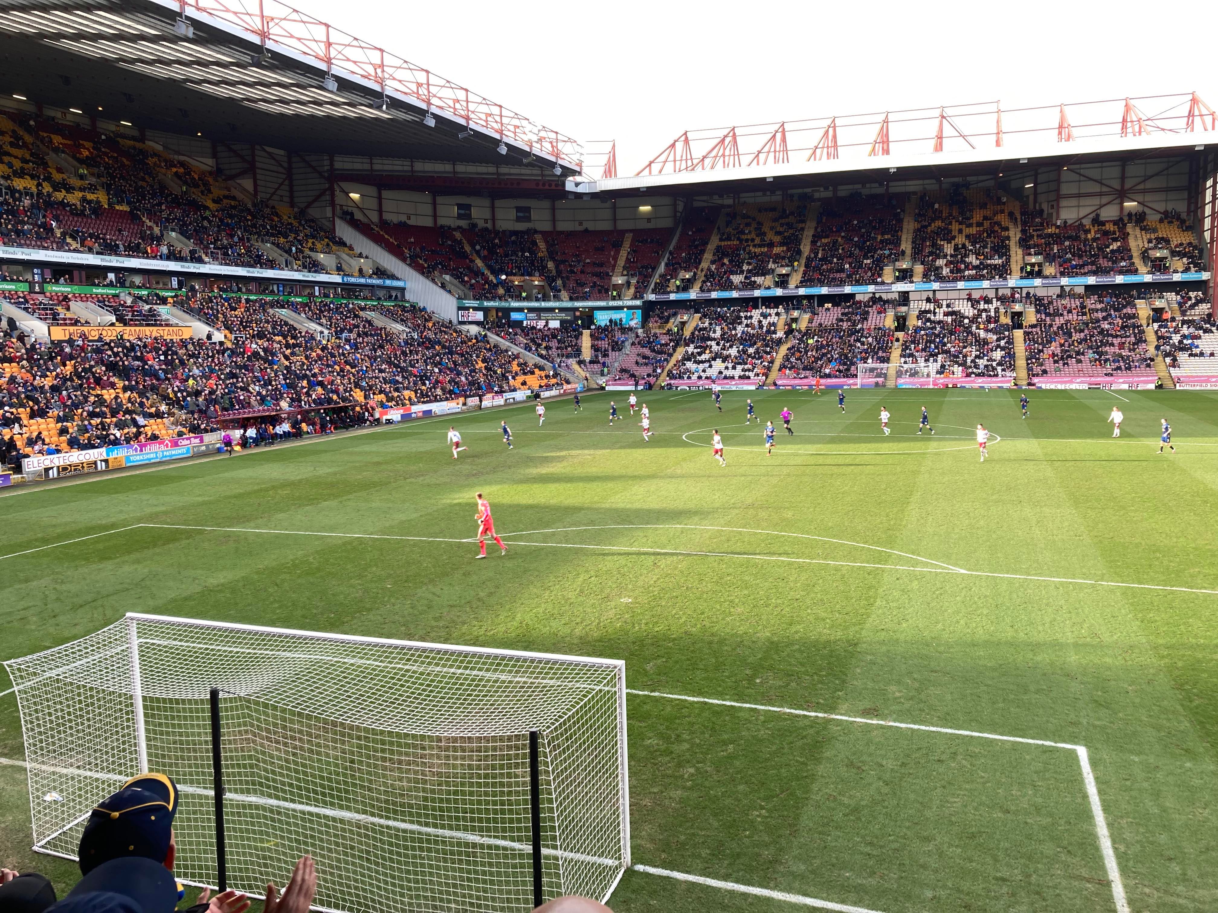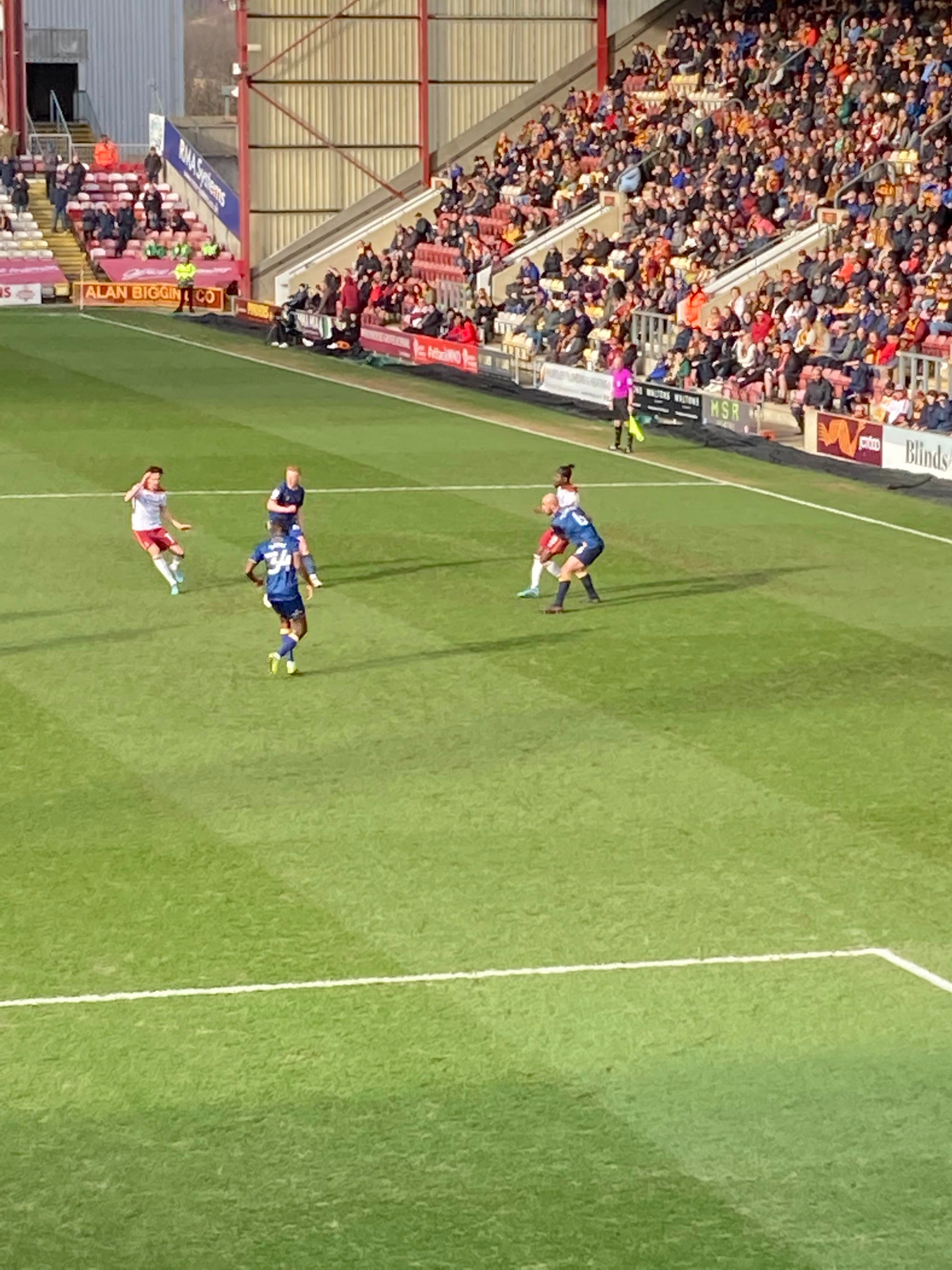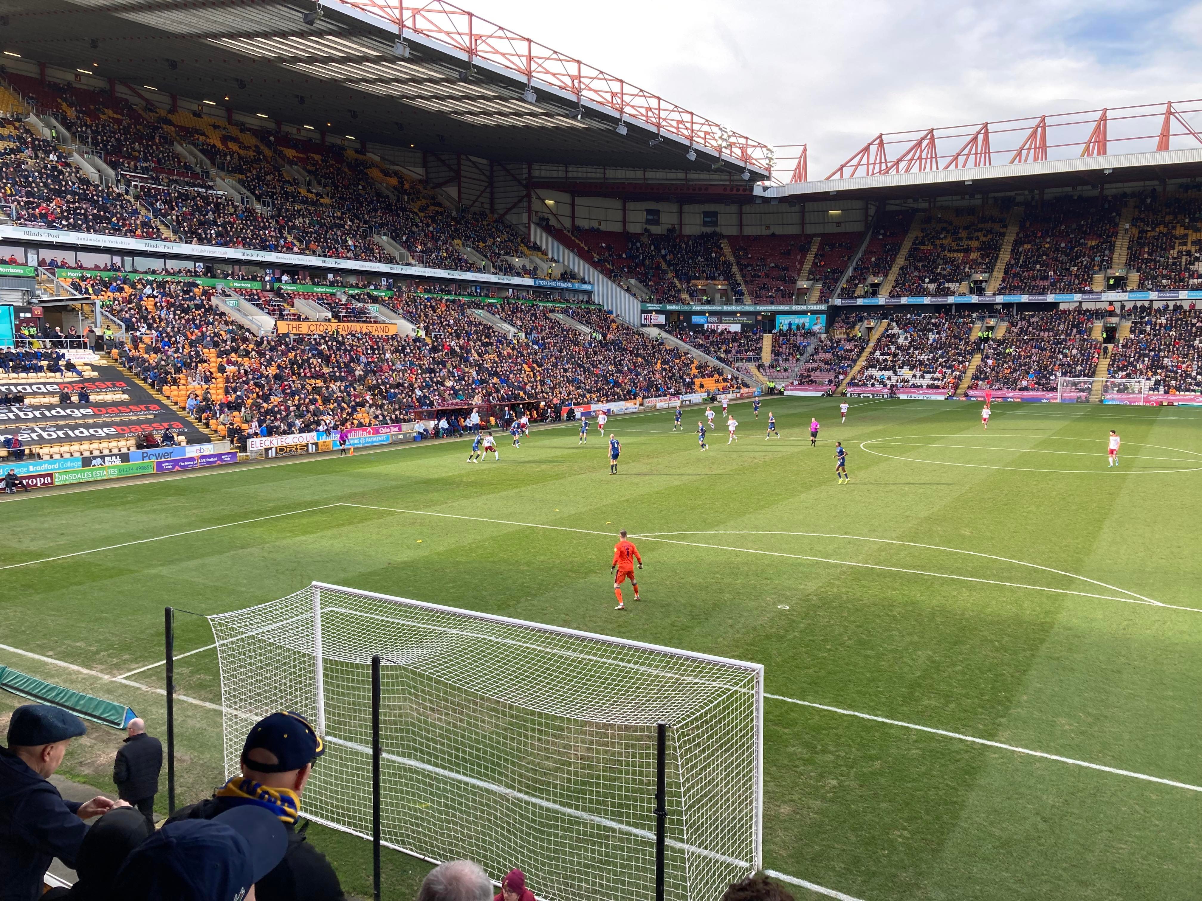 “We’re on our way! We’re on our way! To the League One we’re on our way!” Mansfield fans in fine voice so far! “I see the Q block boys arising! I see the trouble on the way! Don’t go out tonight! If you’re Blue & White! Because Mansfield Q block boys are on their way!” A new chant! Love it! Mansfield starting the better of the 2 teams so far. 15 minutes in and Bradford have a free kick in the Mansfield half, it’s played into the box, Paudie O’Connor with the header… Just wide!