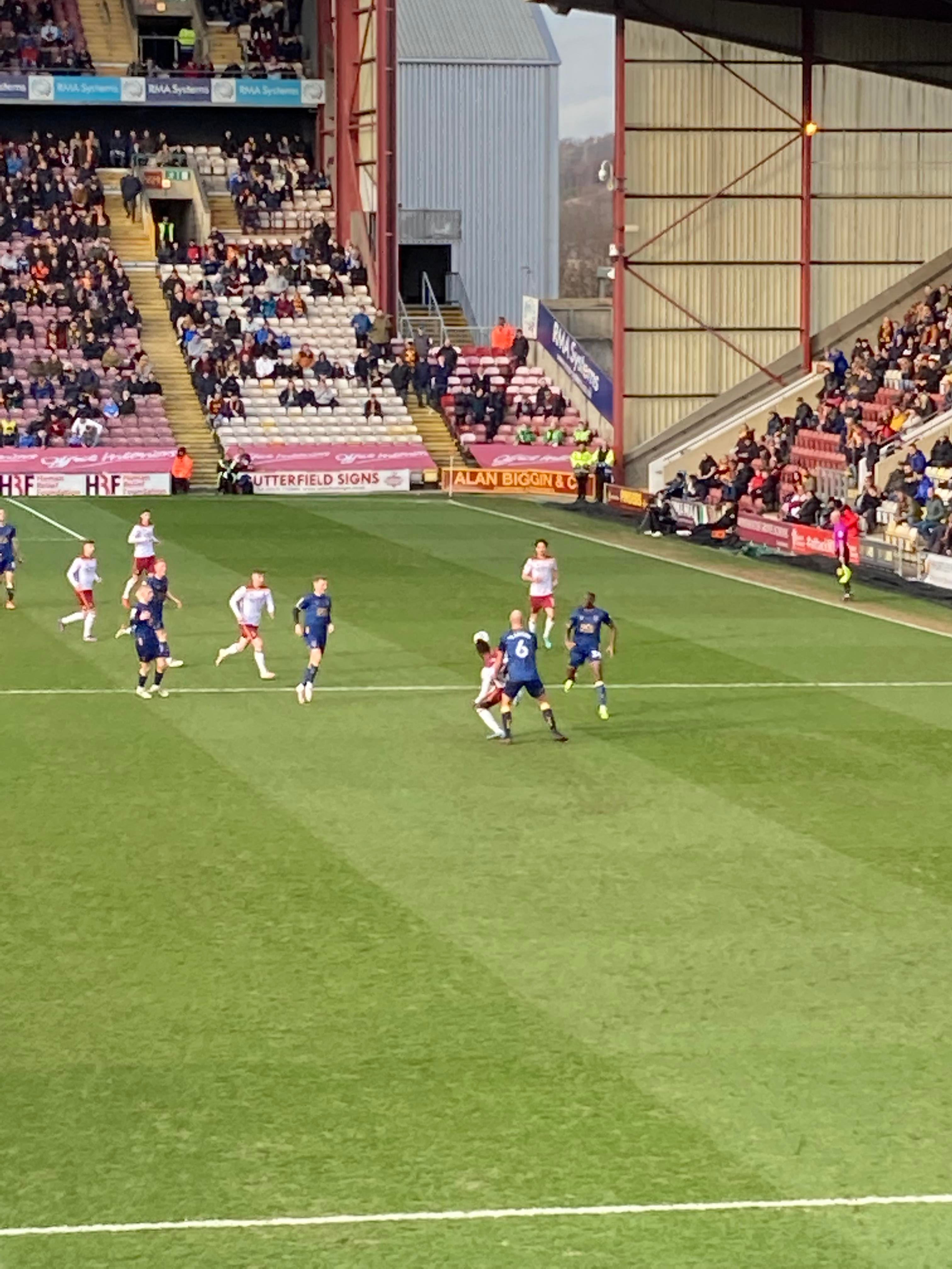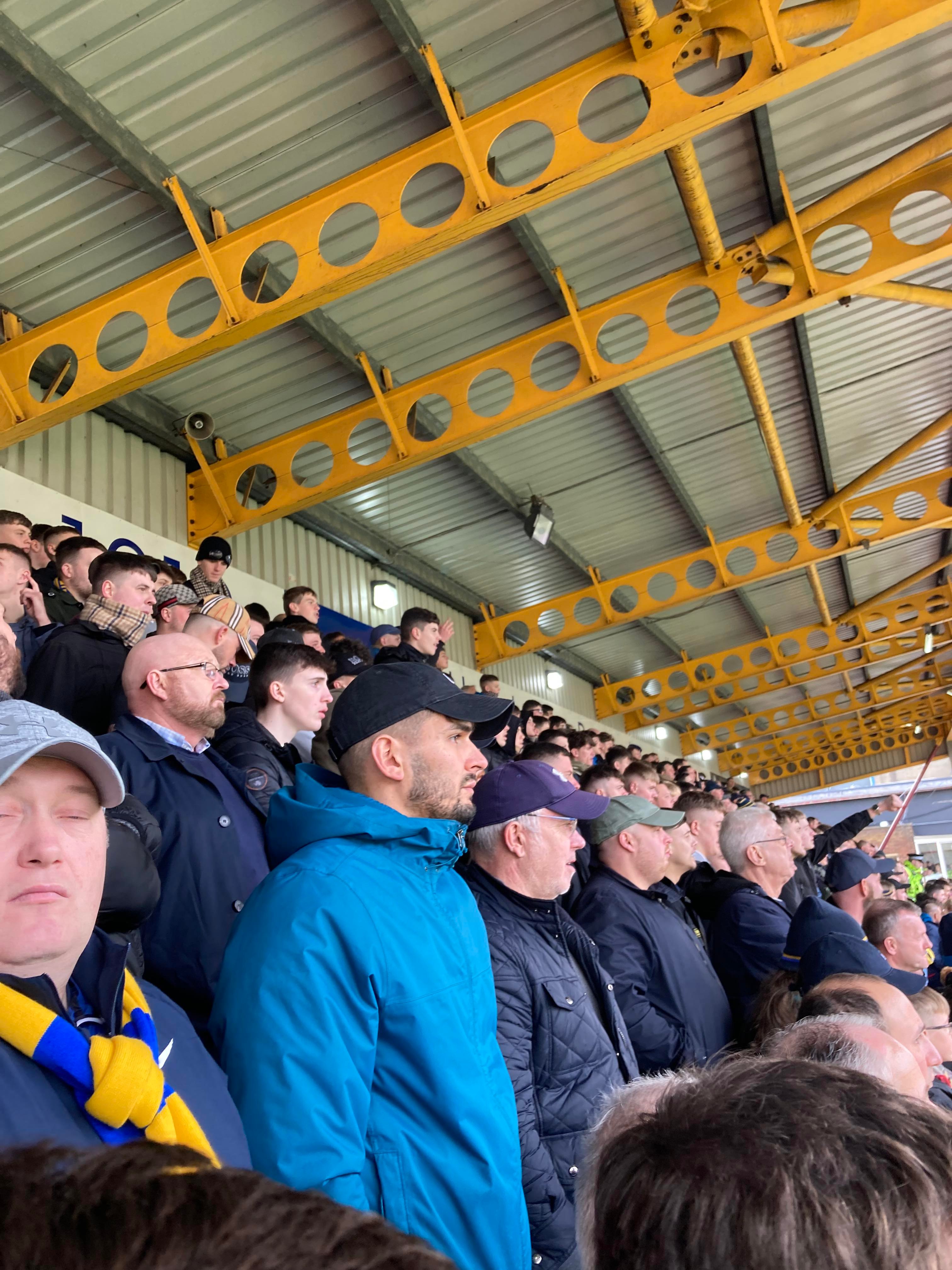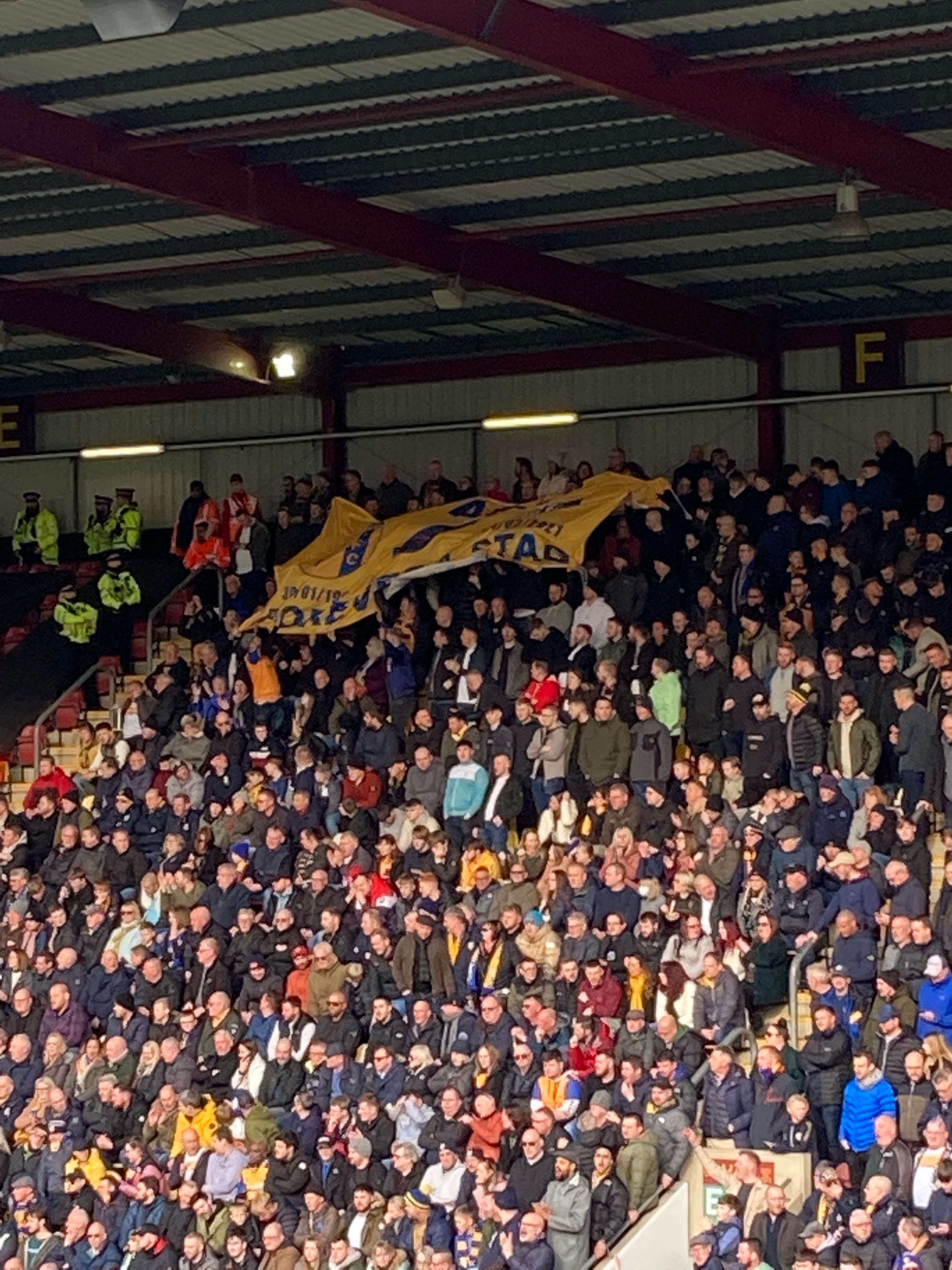 At half time the score remains 1-0 to the Mansfield!! “We’re on our way! We’re on our way! To the League One we’re on our way!!” A round of applause at half time from both sets of supporters as we stand with Ukraine!!