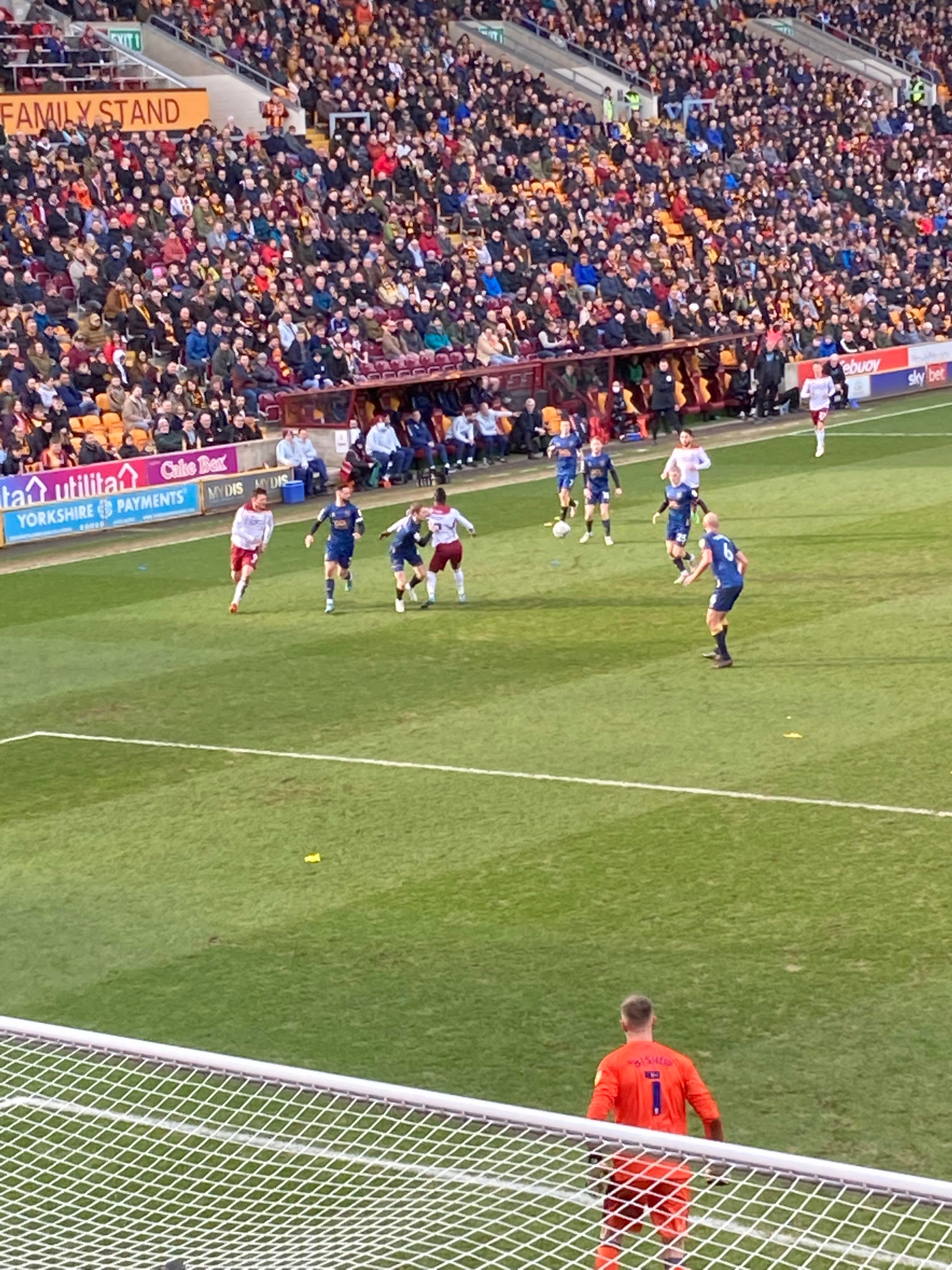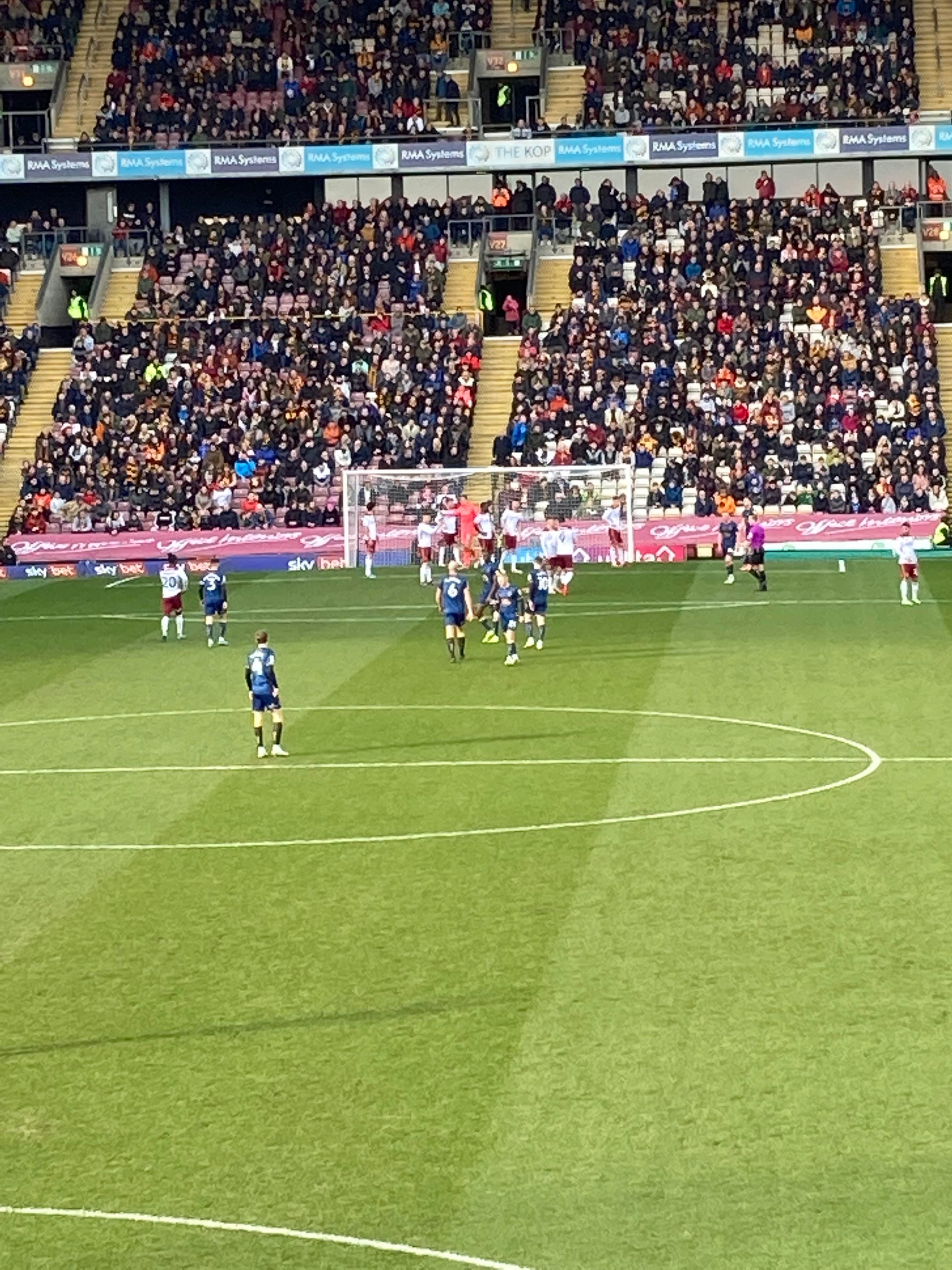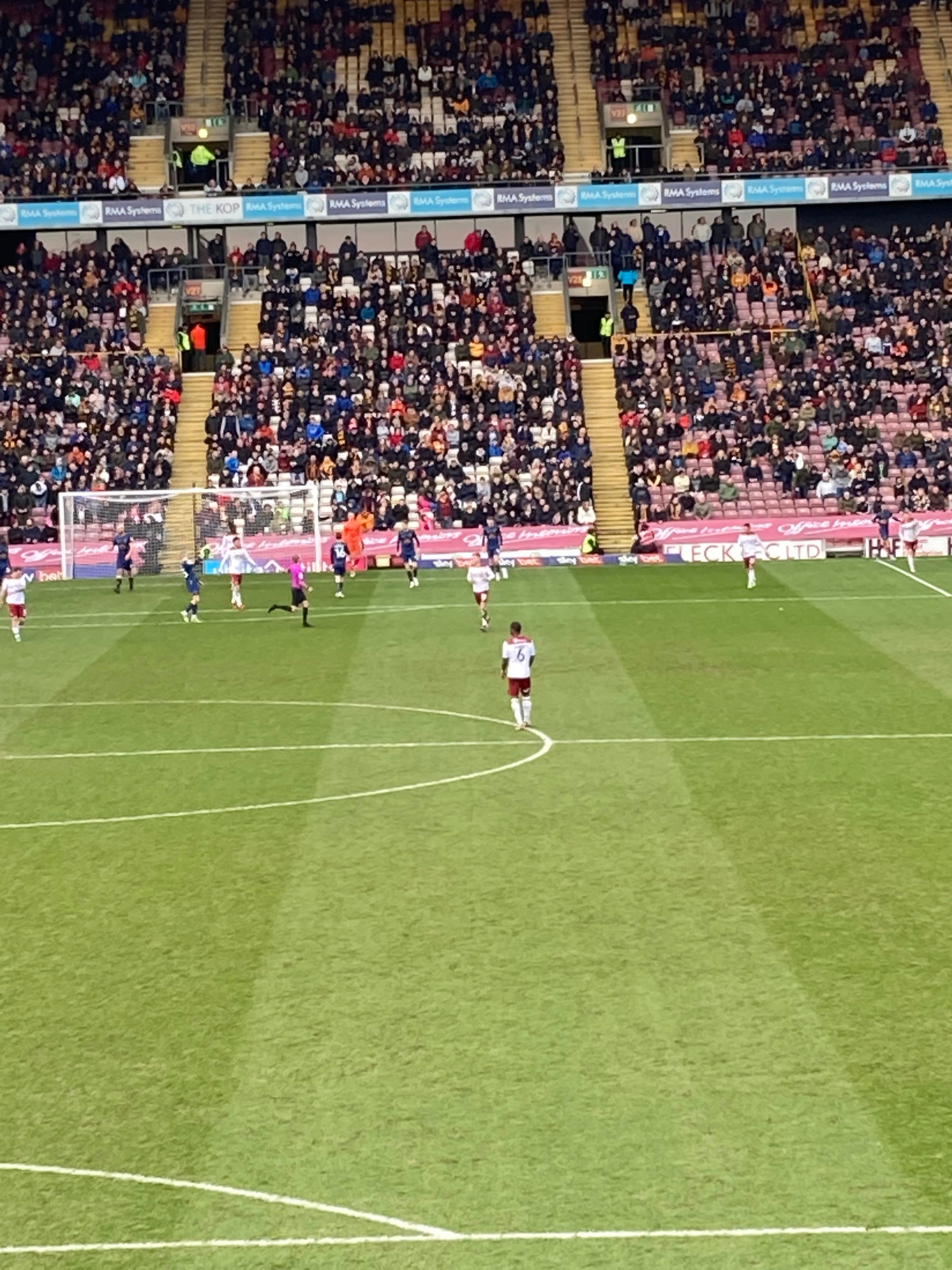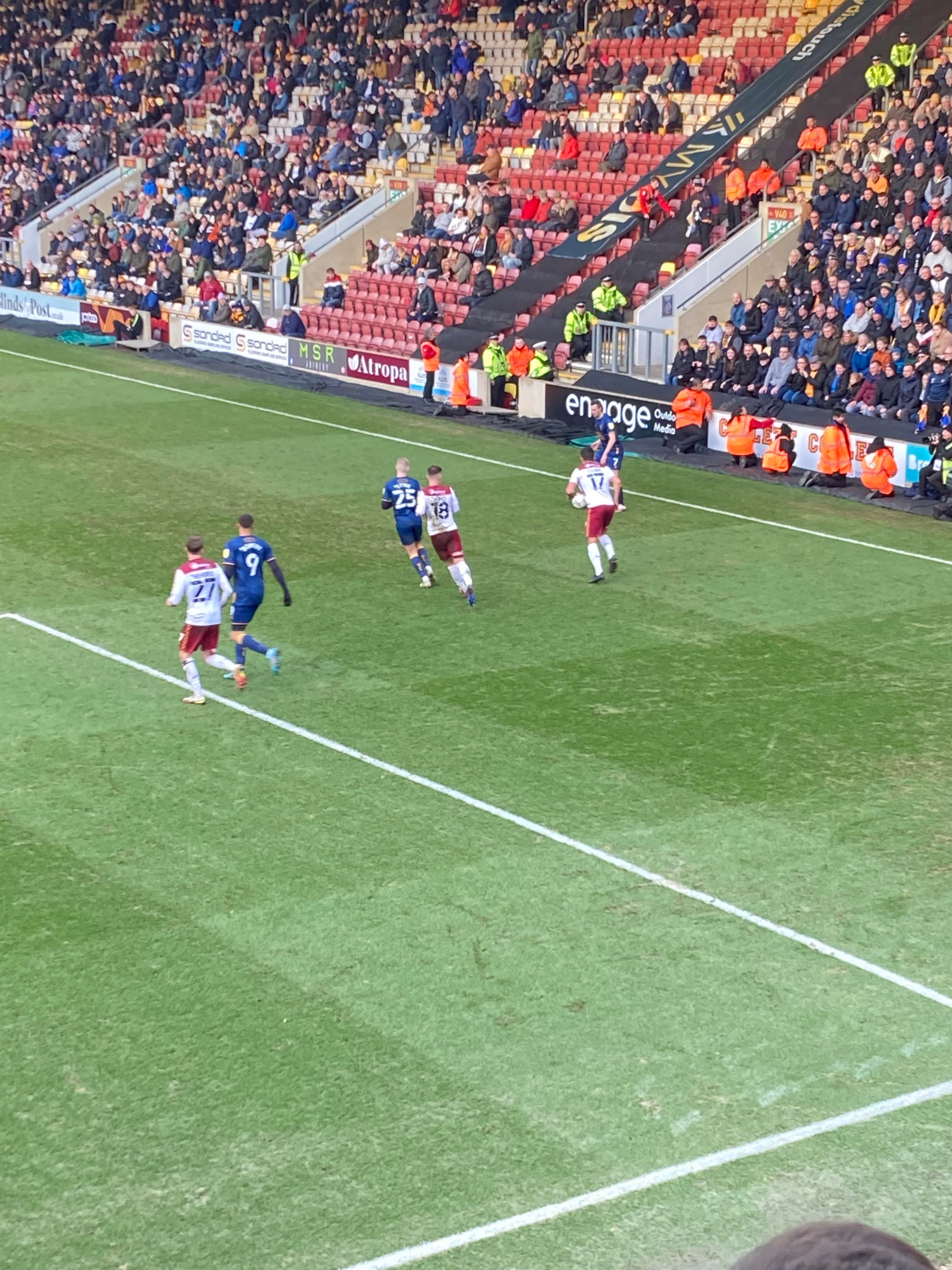 “Yellow & Blue army!” 2 minutes later and Bradford come forward, Theo Robinson is played in, he’s offside! He goes around the keeper and… He’s put it wide anyway! Right in front of us in the away end… Boy did the Mansfield fans love that! “Mark Hughes Bantam Army!” A bit of noise from the Bradford fans now! Abd Mansfield’s response: “Nigel Clough’s Barmy Army!”