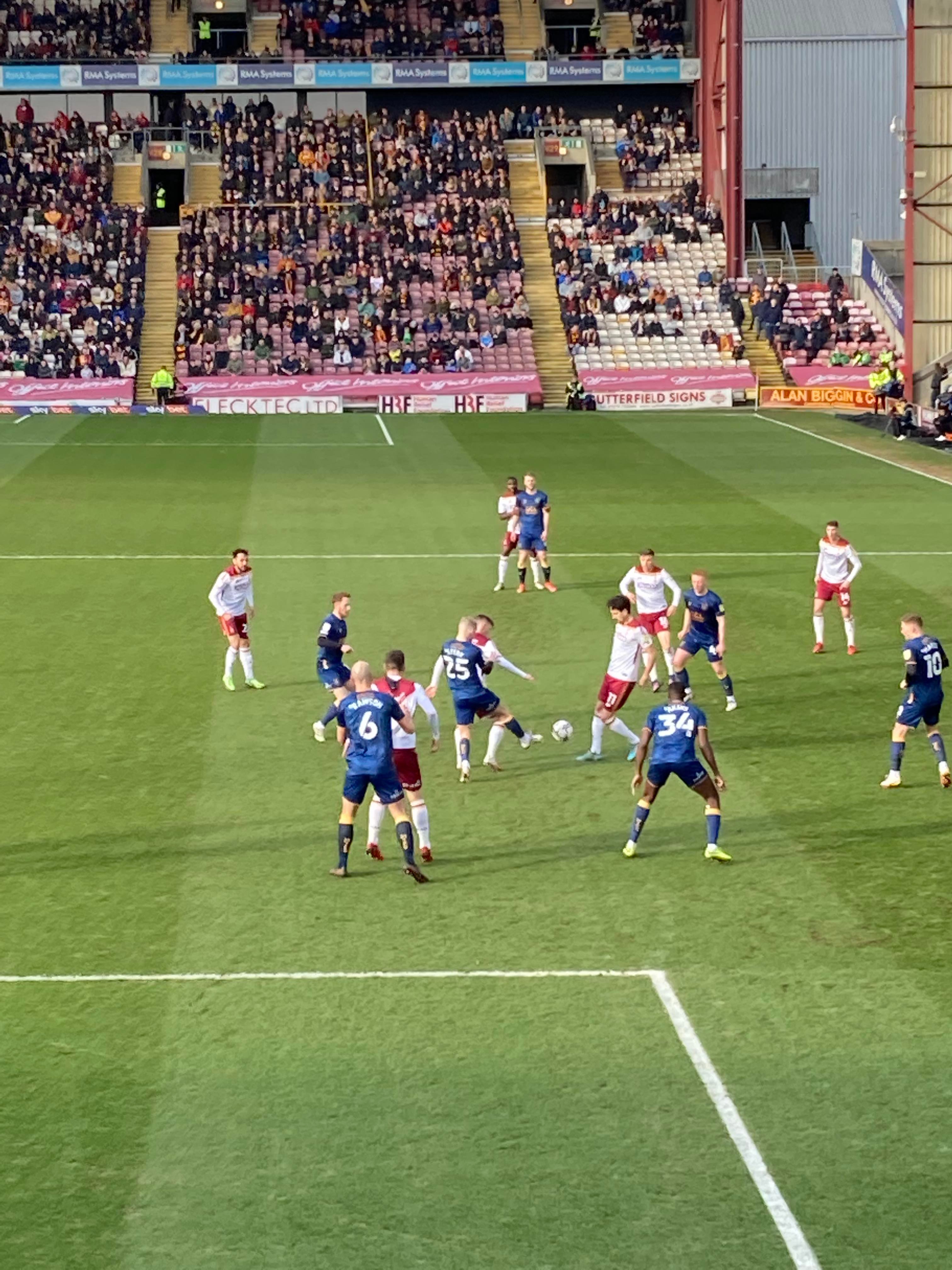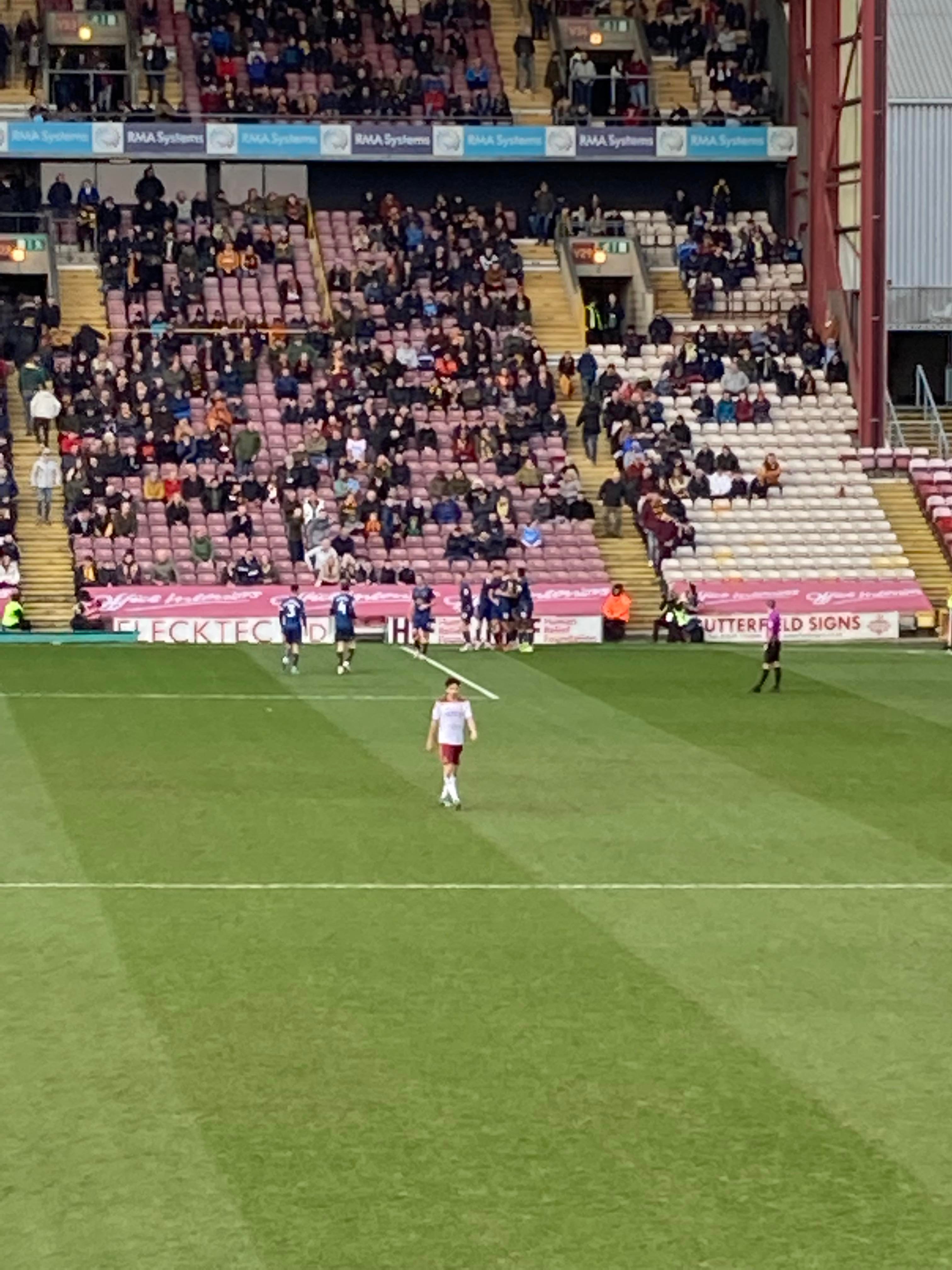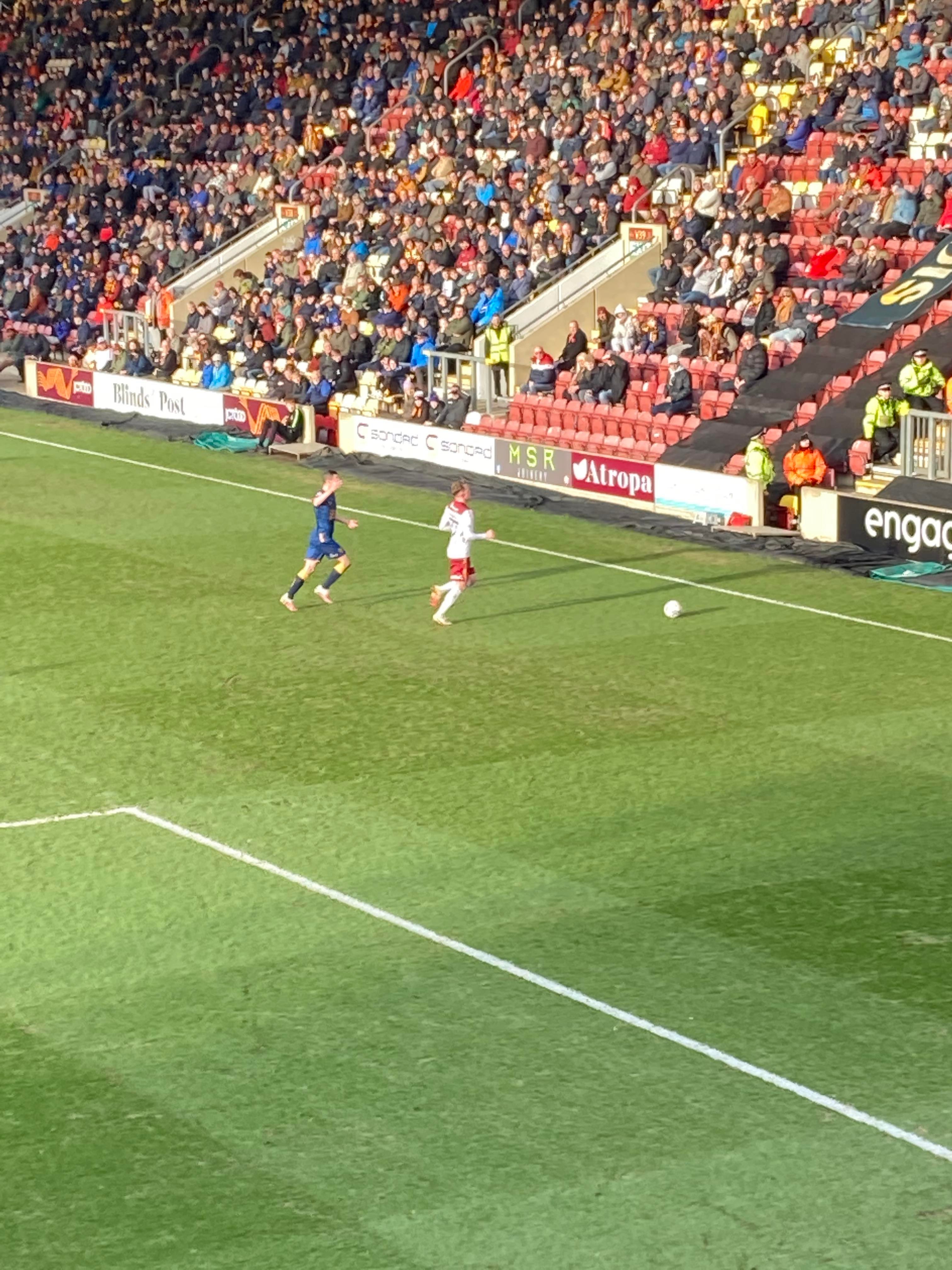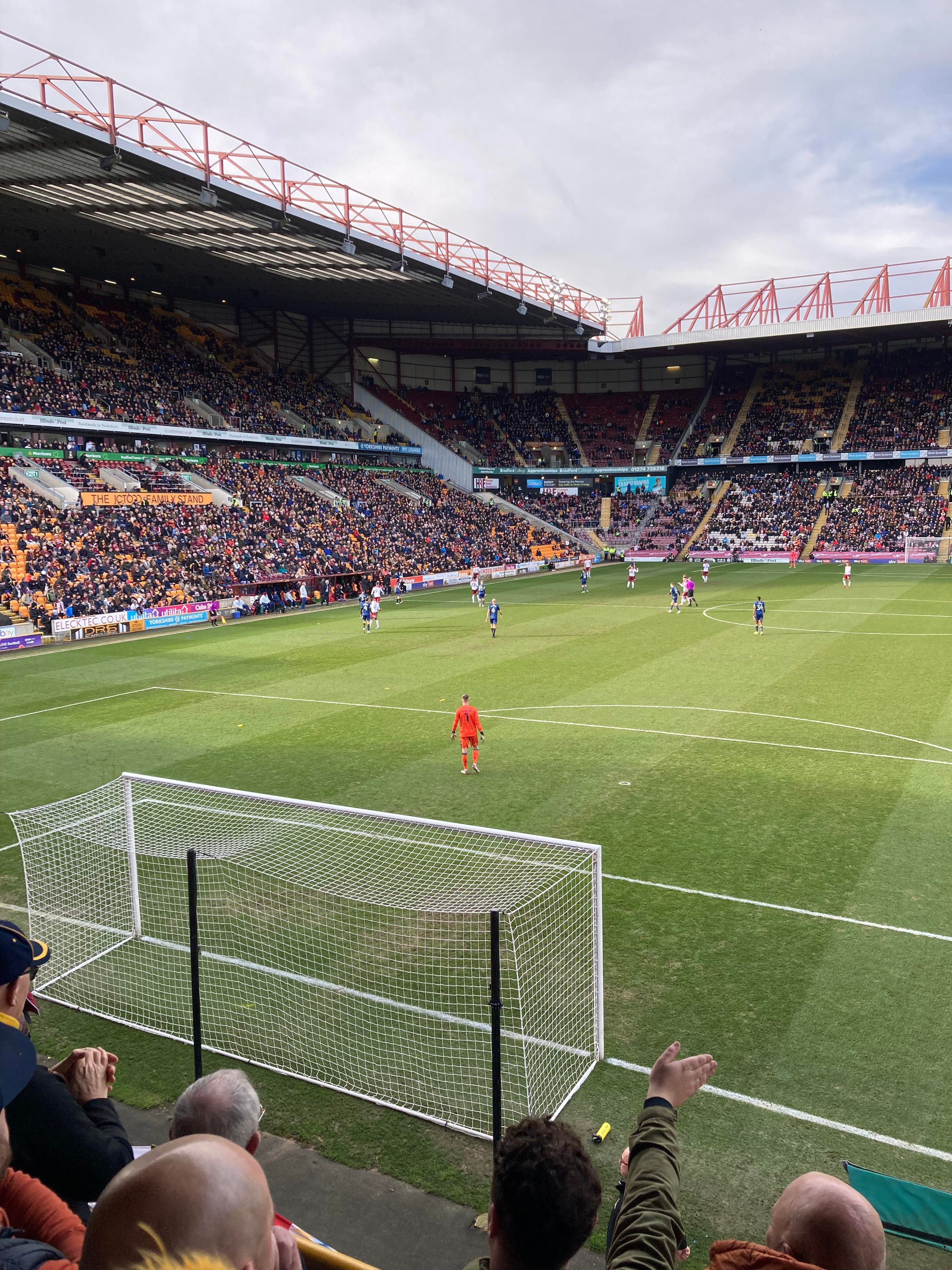 “Yellow & Blue army!” 2 minutes later and Bradford come forward, Theo Robinson is played in, he’s offside! He goes around the keeper and… He’s put it wide anyway! Right in front of us in the away end… Boy did the Mansfield fans love that! “Mark Hughes Bantam Army!” A bit of noise from the Bradford fans now! Abd Mansfield’s response: “Nigel Clough’s Barmy Army!”