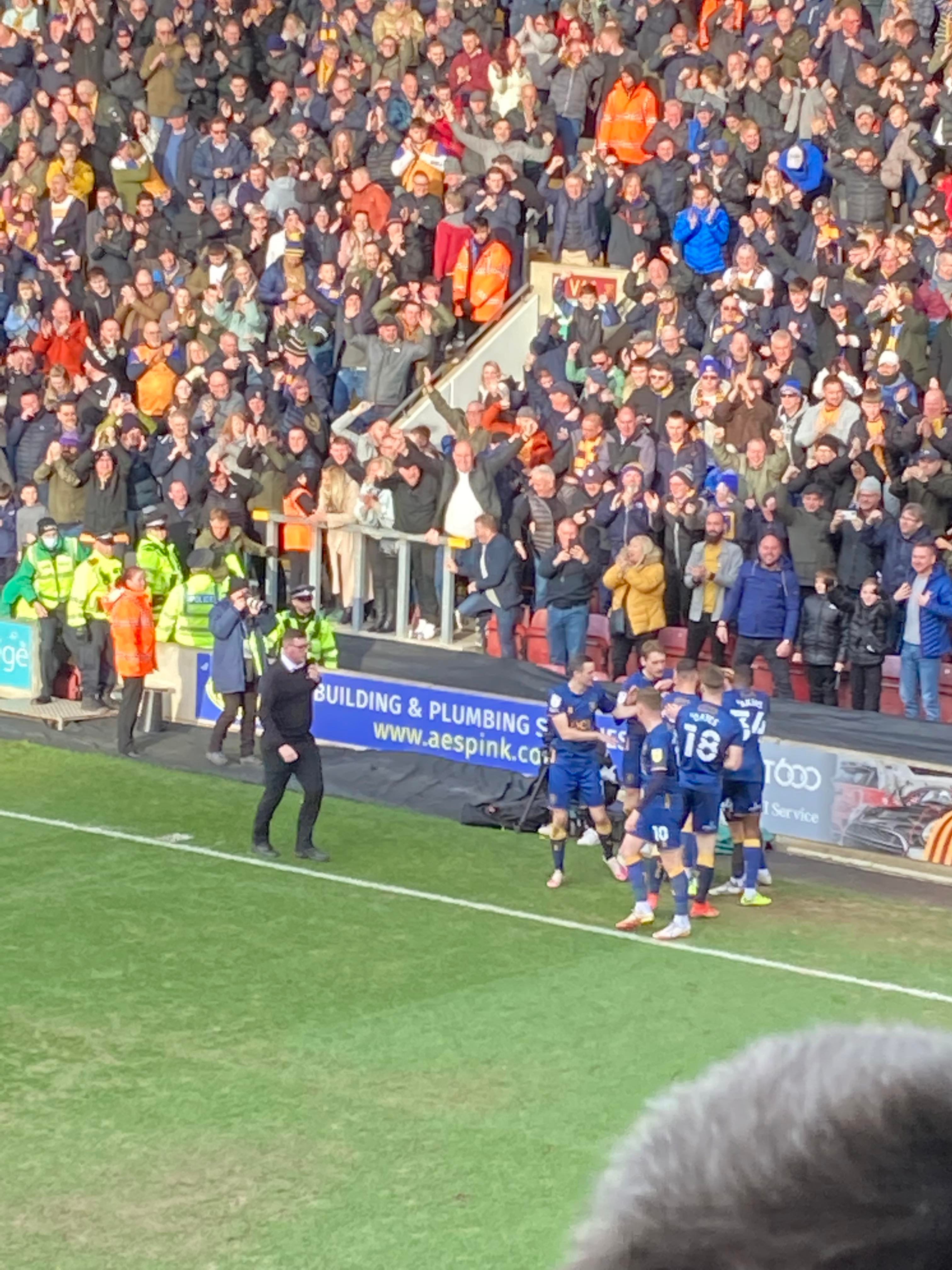 Second half, 48 minutes on the clock and Mansfield come forward, it’s played out to the left, played into the middle, it falls to Mansfield and the shot comes in… Blocked! It falls to Matty Longstaff who shoots… Deflected… IT’S IN!!!!! Mansfield double their lead!!! Carnage in the away end again!!! 0-2!! “EIEIEIO!”