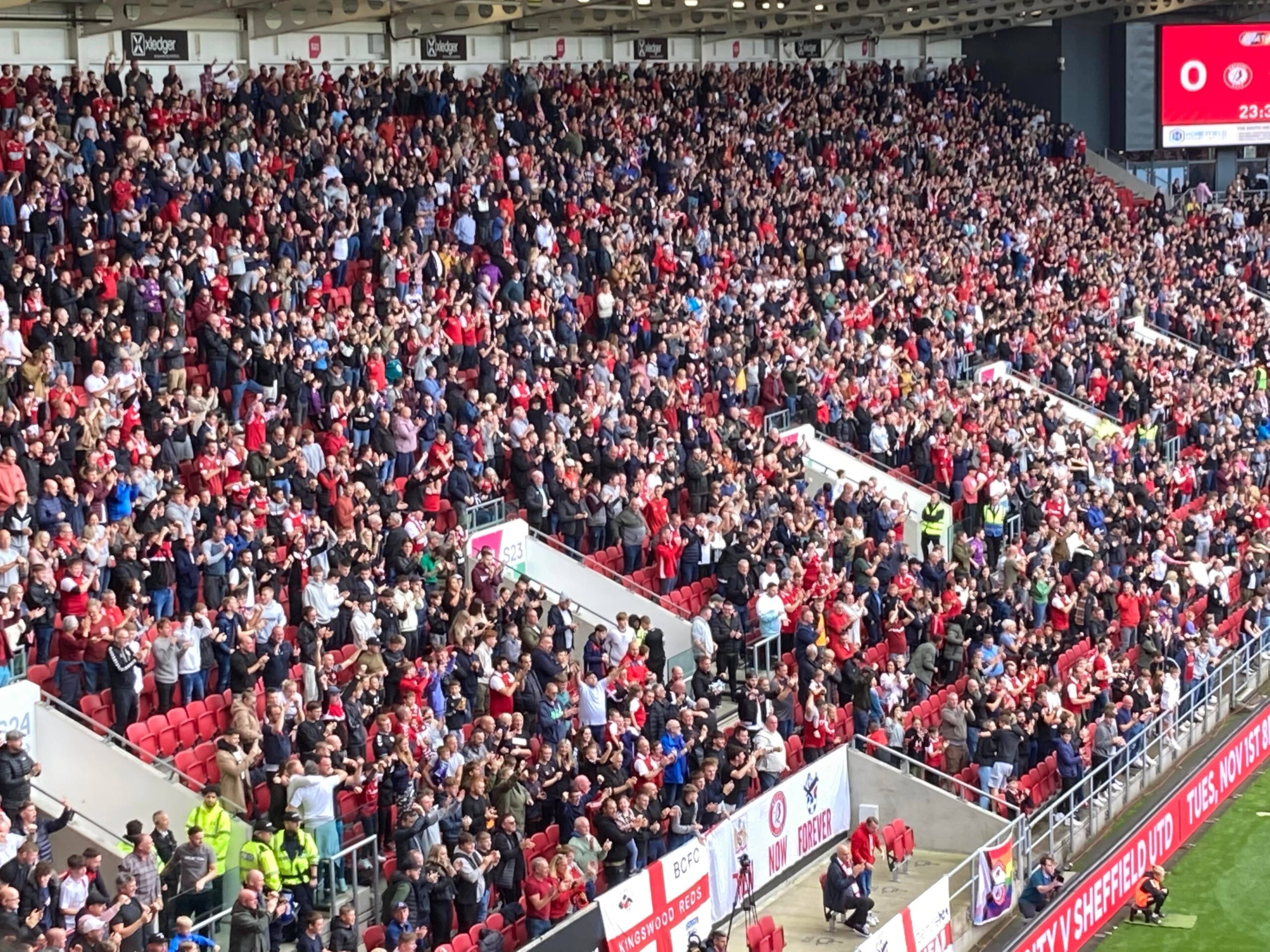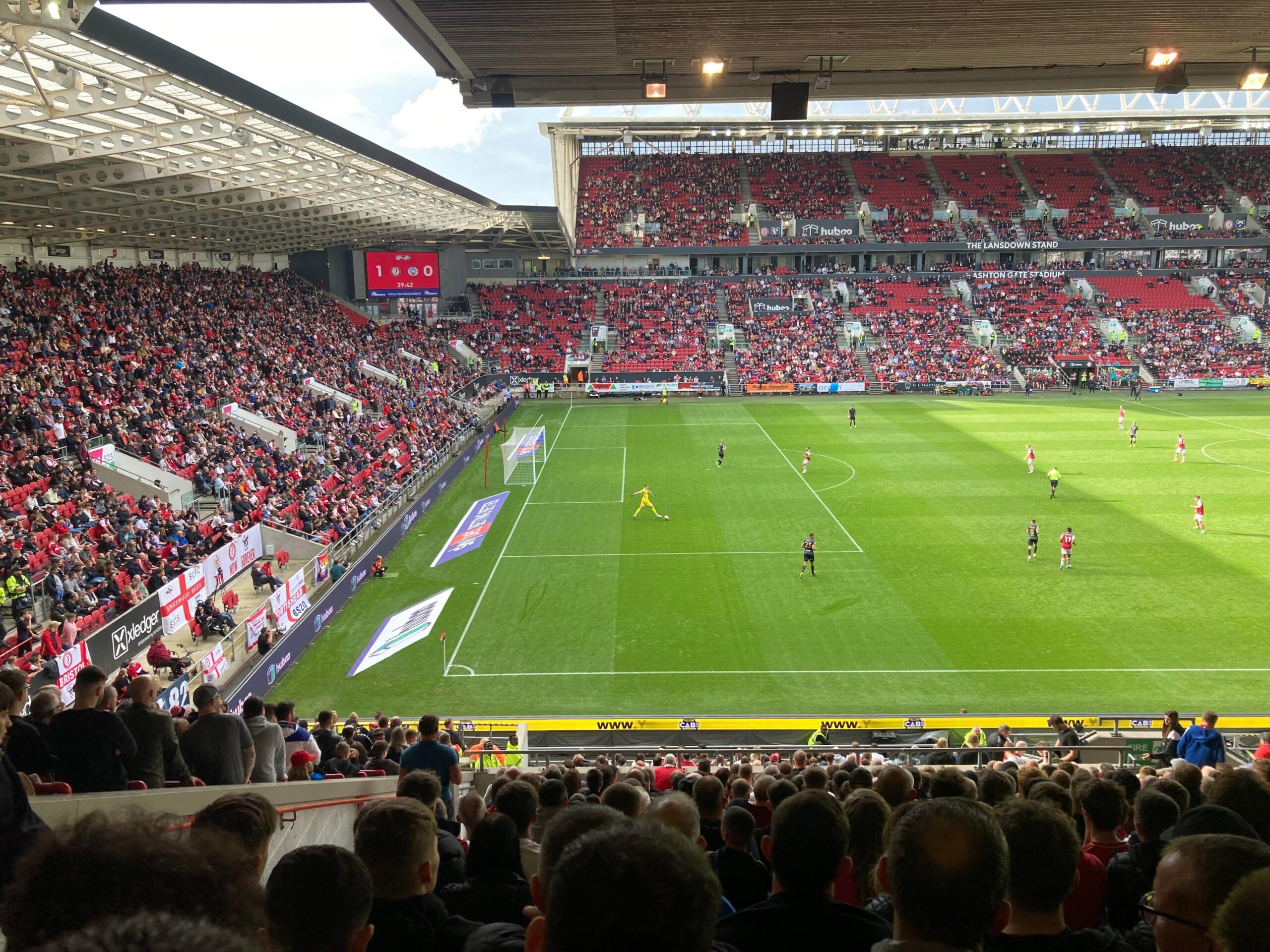 Out come the players and a mark of respect as they present a shirt to a fan in the disabled section. Well done there to the Bristol City team! The ground is filling up slowly and the atmosphere is starting to build! “I can’t read and I can’t write but I can drive a tractor! I’m a Bristol City fan and I’m a f***ing w****r!” Sung by both fans in good spirits respectively! Love that! “Engerland Engerland Engerland!” An England vs Wales game here today as well! Come on England!
