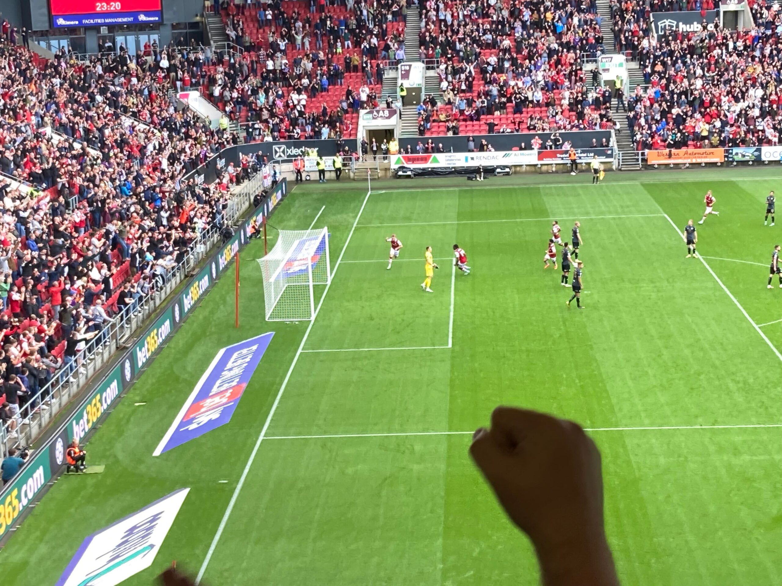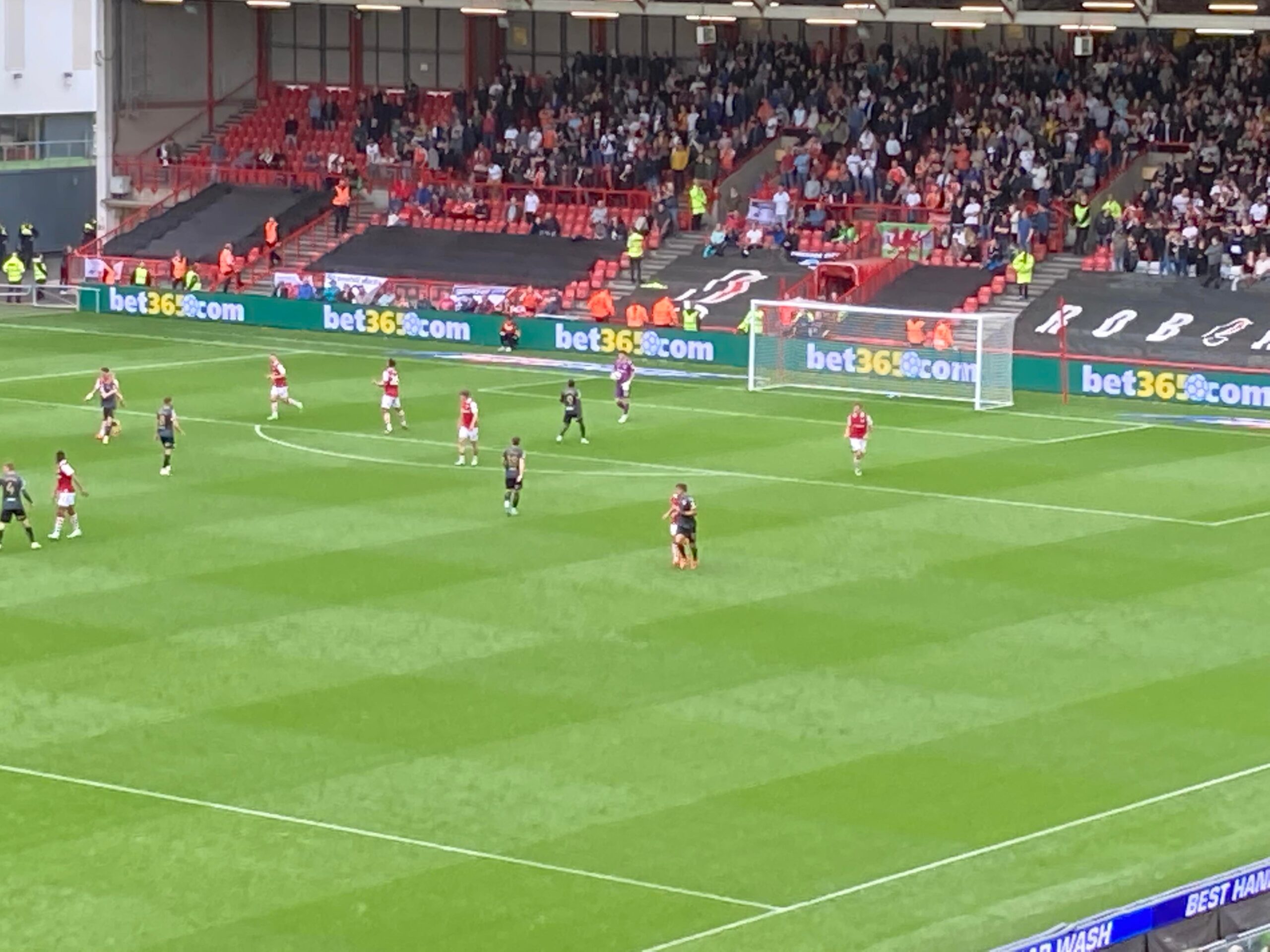 Second half, “Always believe in! Thatchers Gold! AHH!” 55 minutes on the clock and Bristol come forward, it’s played out to the right to Nahki Wells who gets into the box, he plays it across to Semenyo who shoots first time… Straight at the keeper!