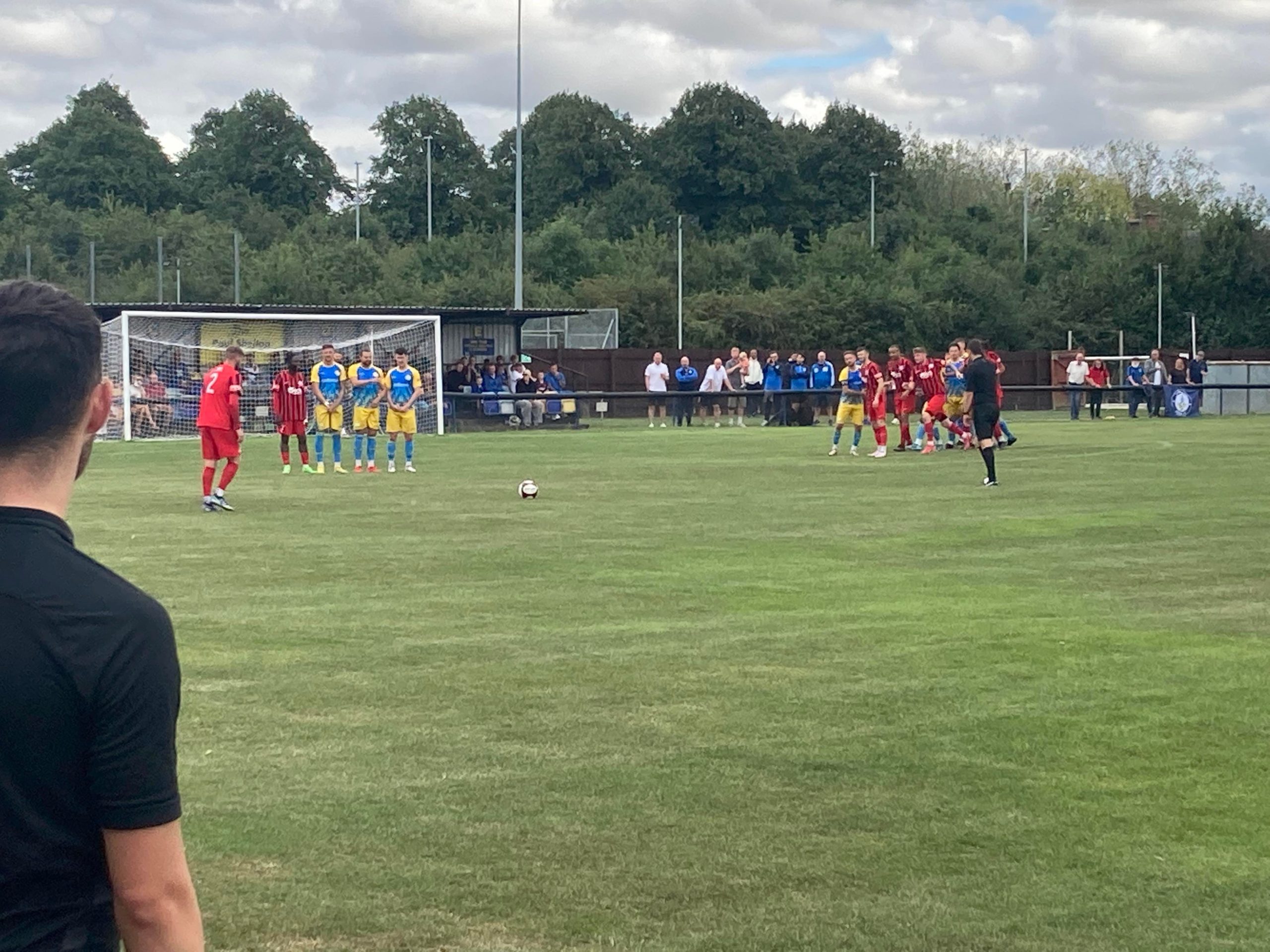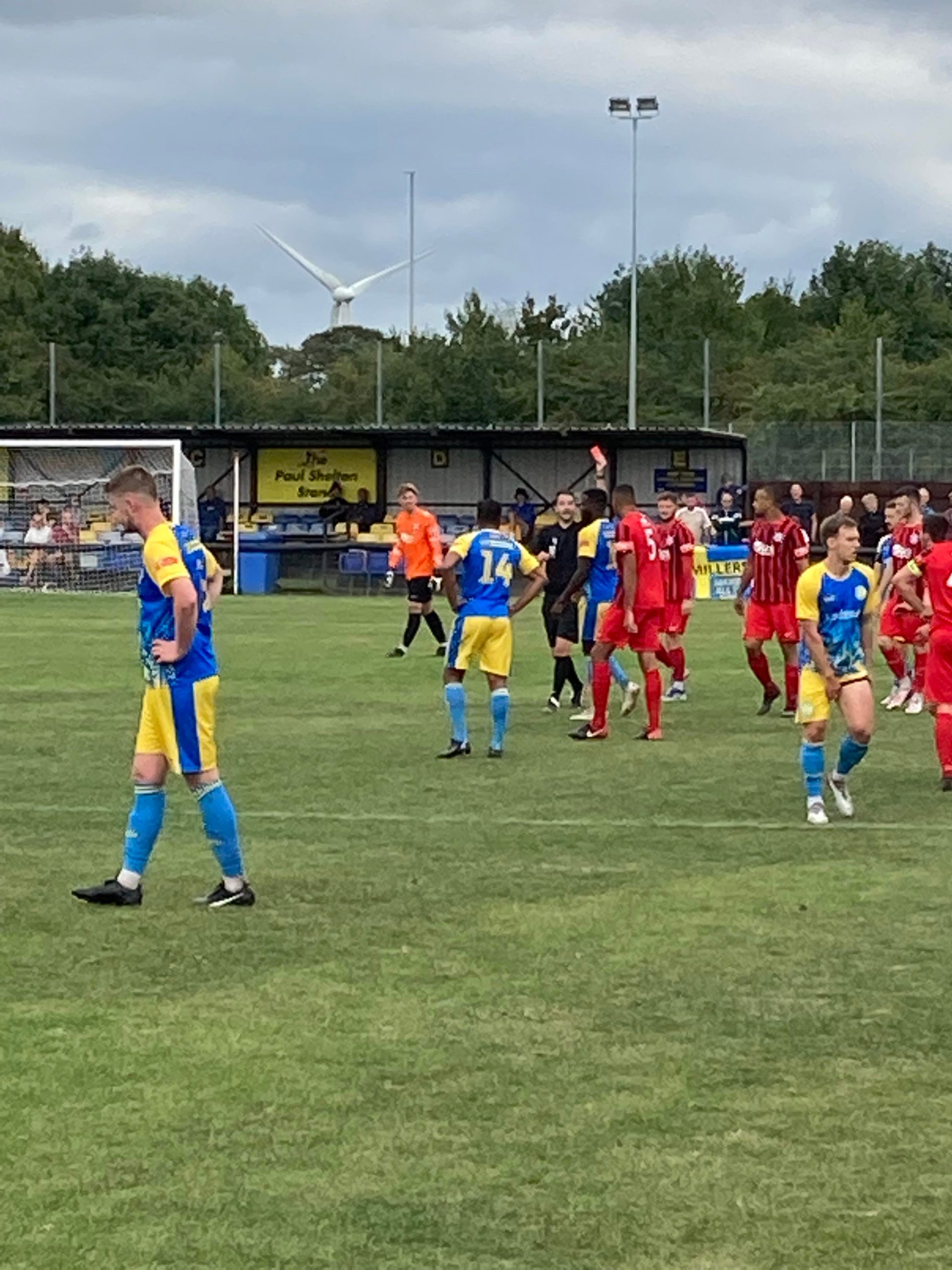 21 minutes gone and the ball is loose just outside the Carlton box… Alex Marshall dives in and the Carlton man goes down… Tempers are boiling over here… Handbags! The Referee manages to calm things down and pulls Marshall over… Yellow Card!