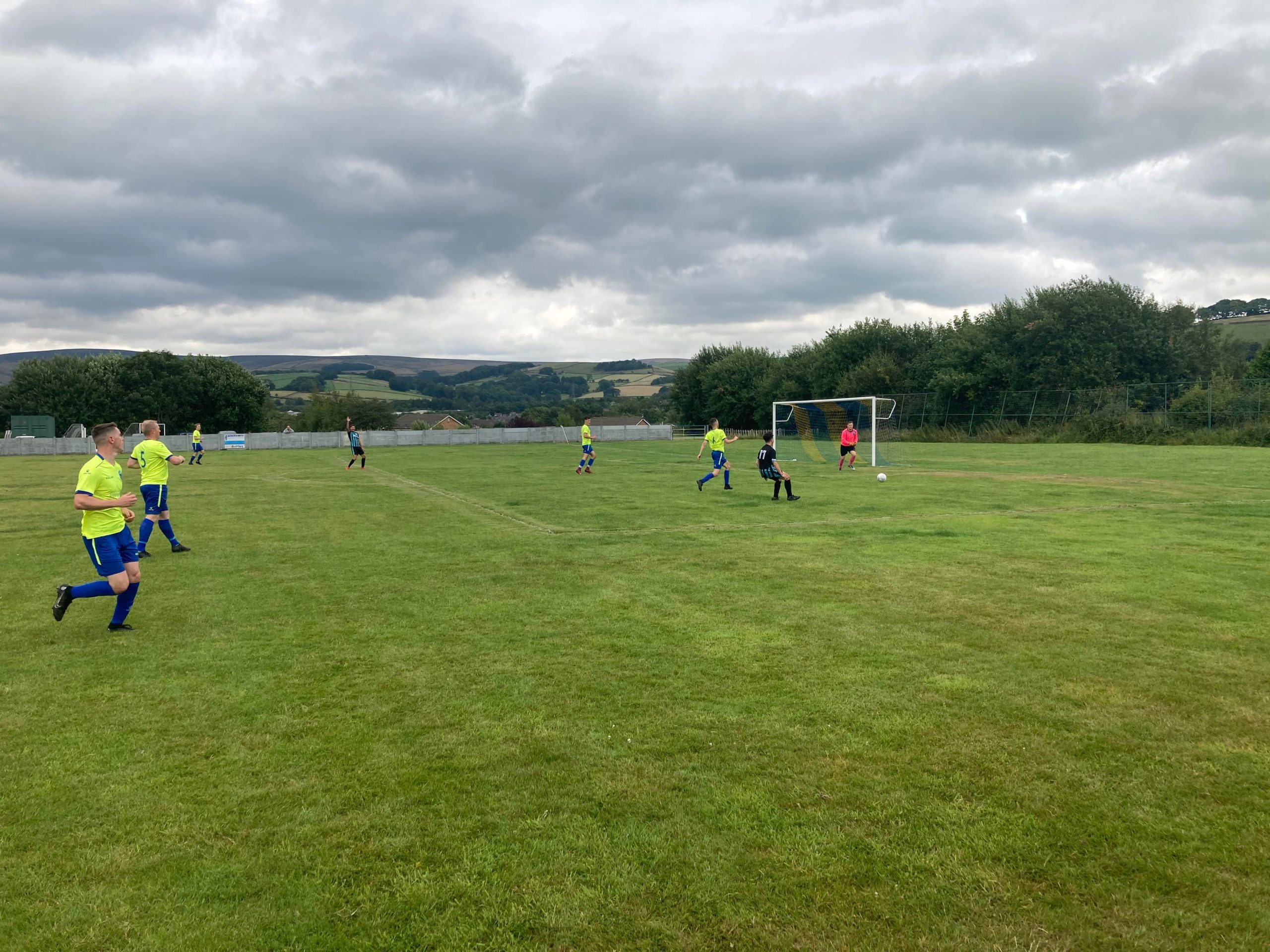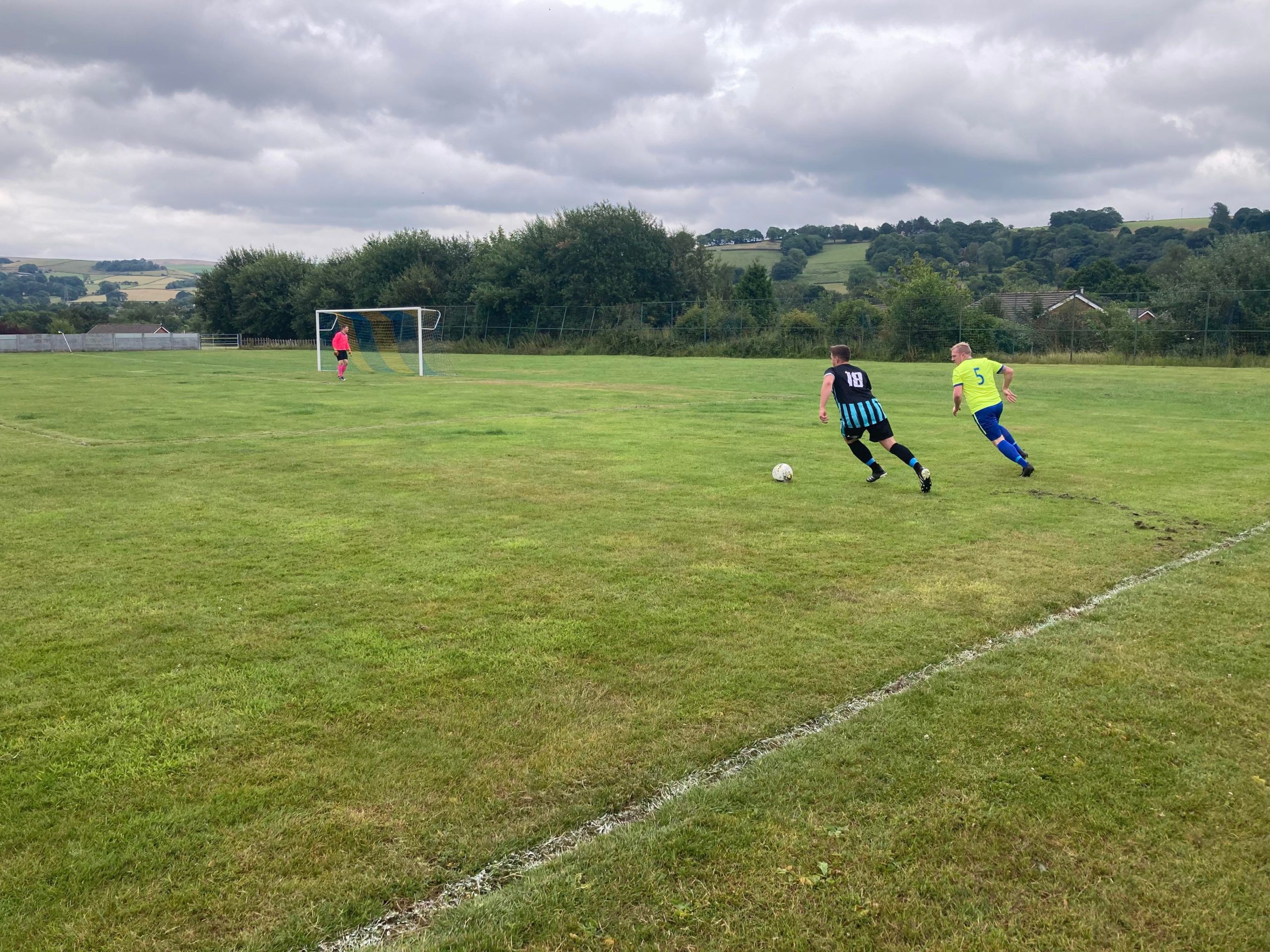 90th minute and Bakewell come forward again, the ball is played forward, the Bakewell man slides for the ball and gets there and he’s put number 8 through on goal here, is this the moment…? NO! He’s hit the top of the bar! That was the chance for Bakewell there… Play goes on… That’s it! Chapel Town have won!
