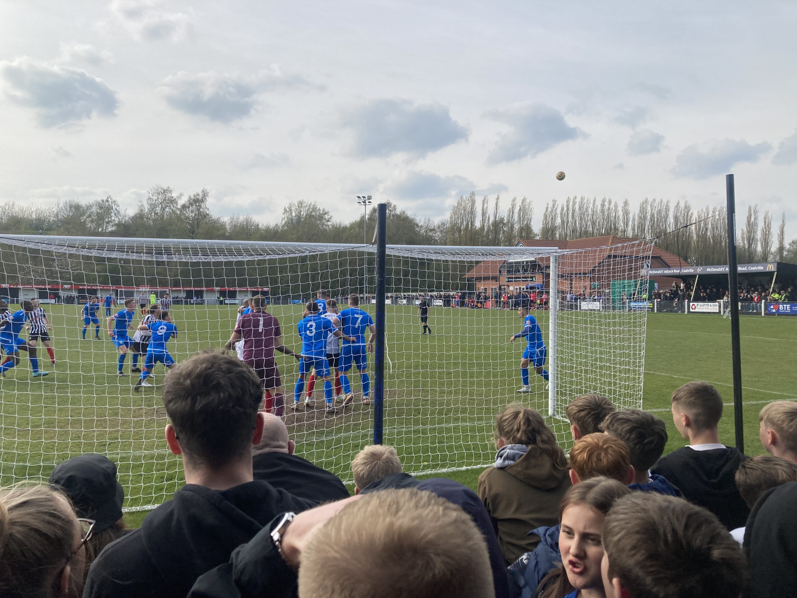 2 minutes later and Coalville are straight out of the blocks, it’s played into the box on the left, the shot comes in… It’s off the line! Coalville get it back, it’s pinball on the goalmouth… Stourbridge get it clear somehow for a corner, in it comes… The keeper punches it away and Stourbridge clear.
