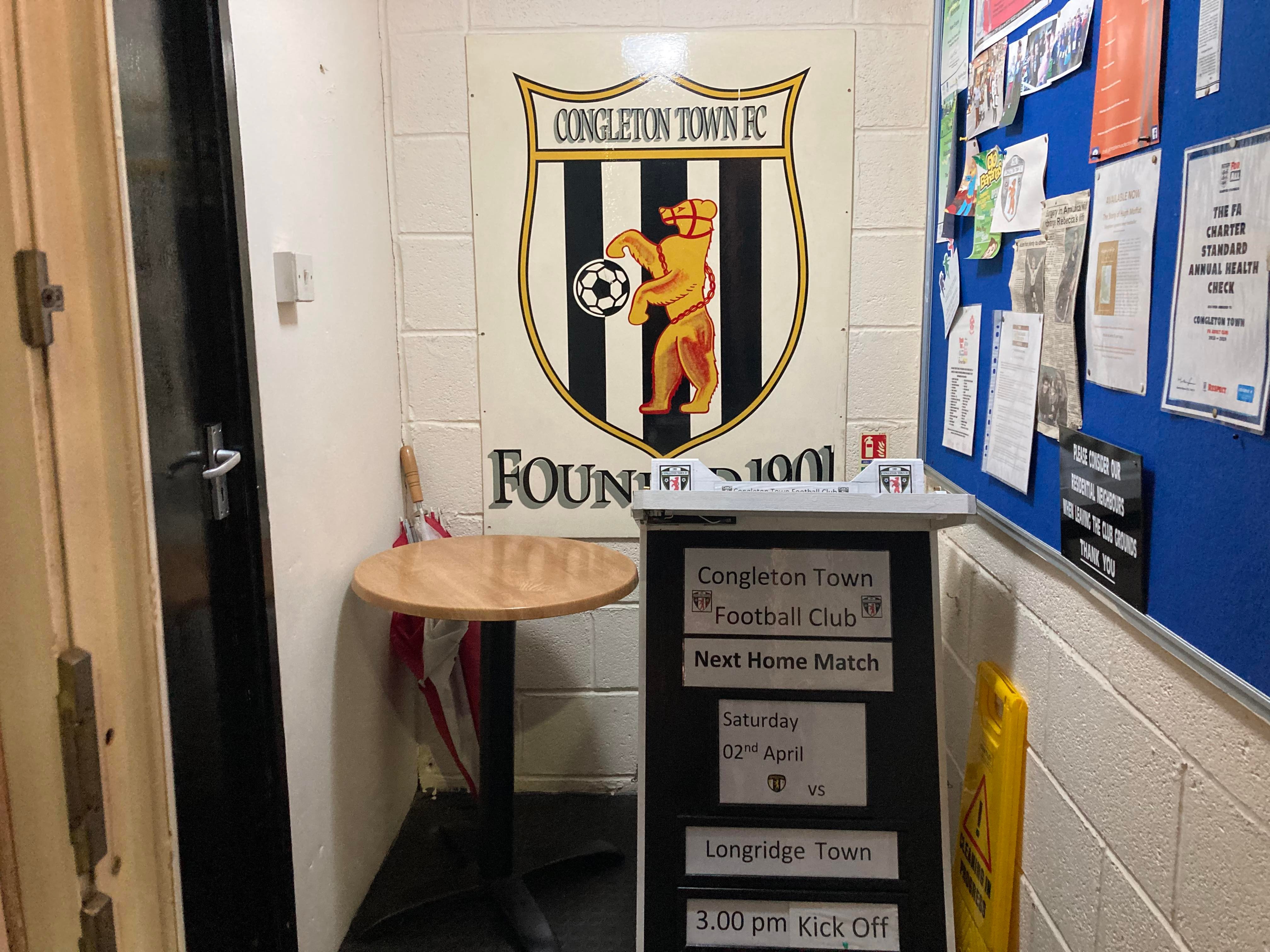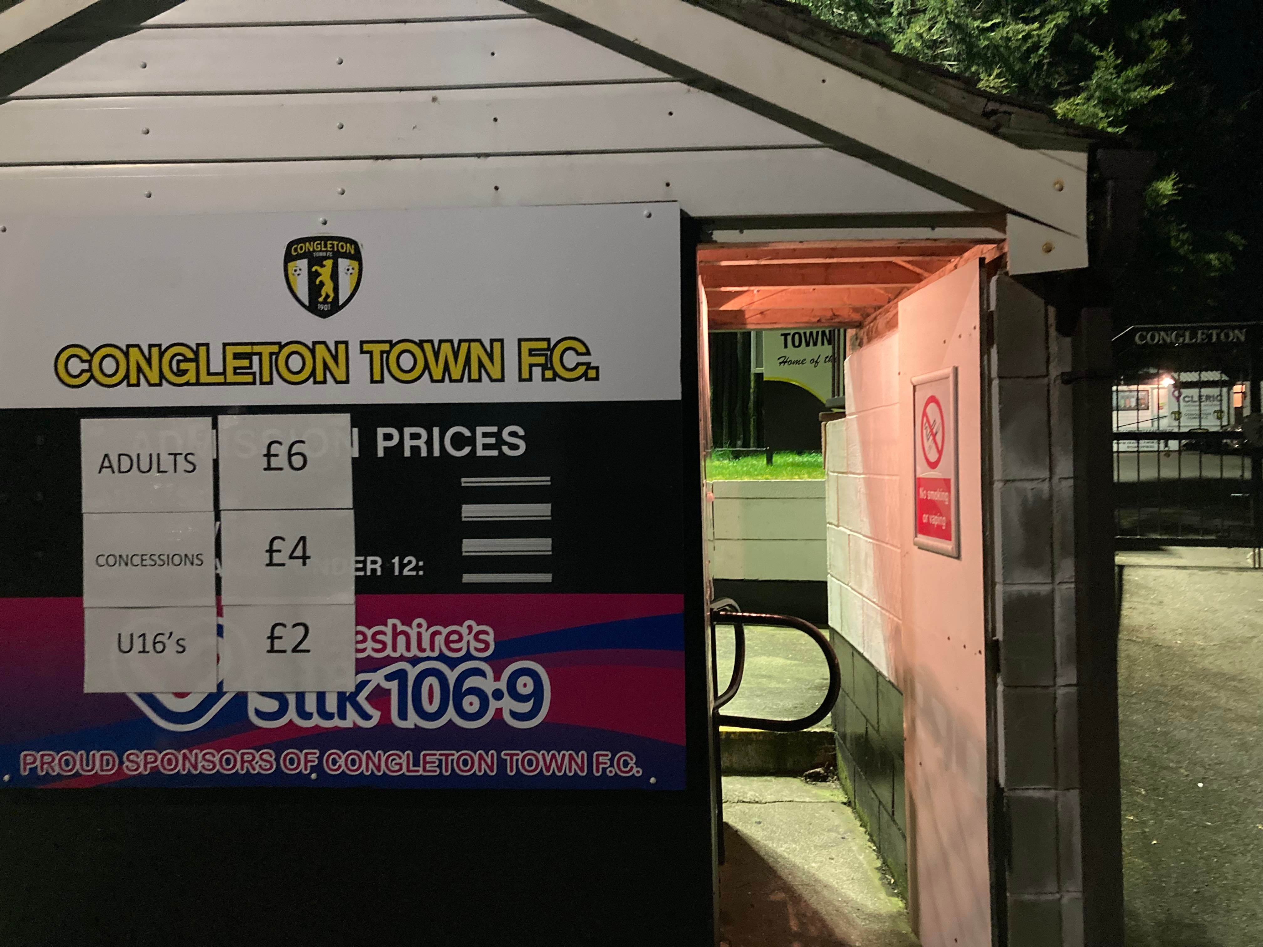 - The Ground: 9/10 – I was surprised how nice it really was! Stands at all angles with a nice bar! And I love all the signs at the ground!! A lot of effort has been made here by the people of Congleton!