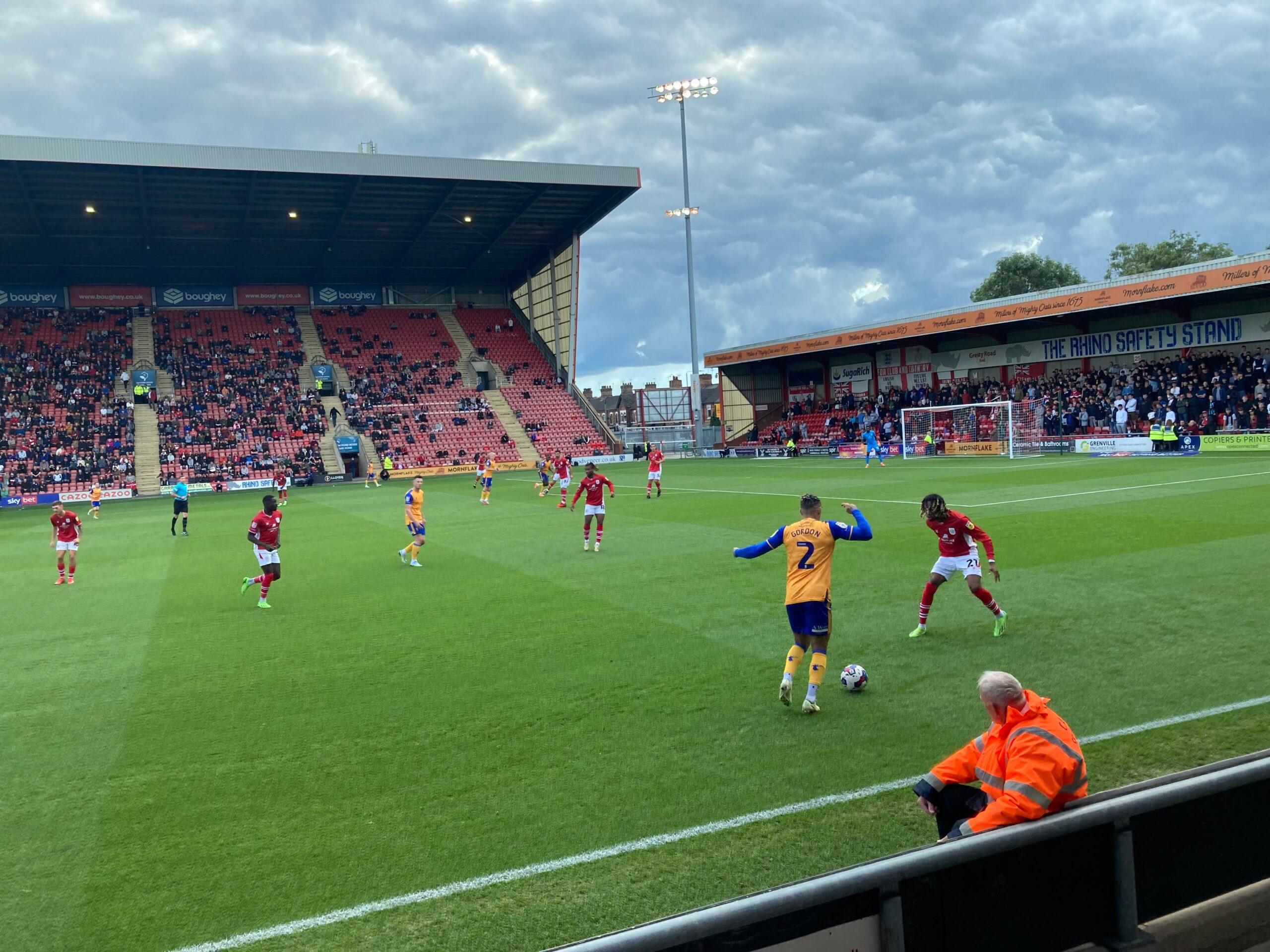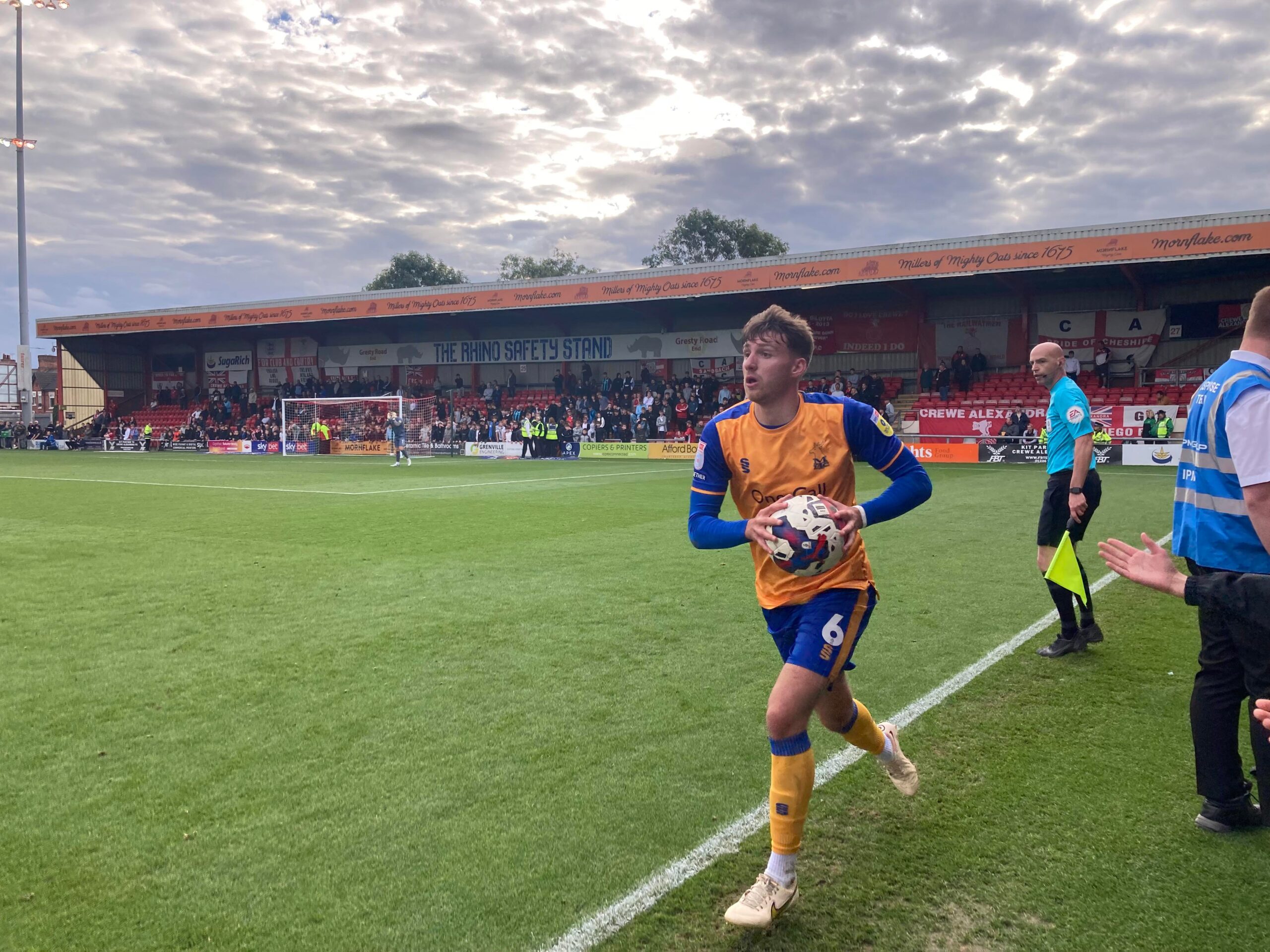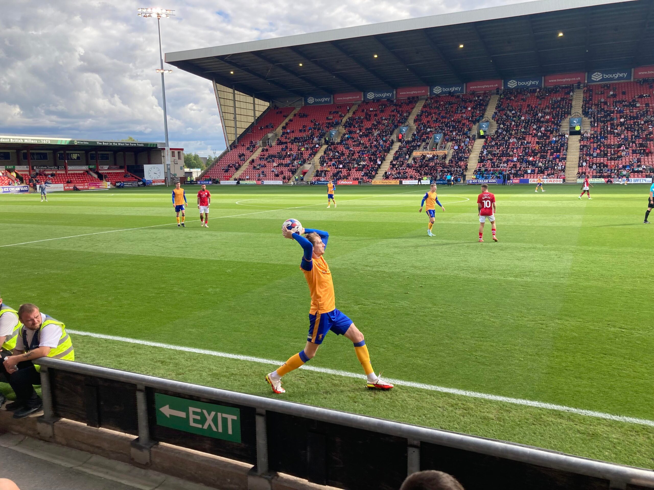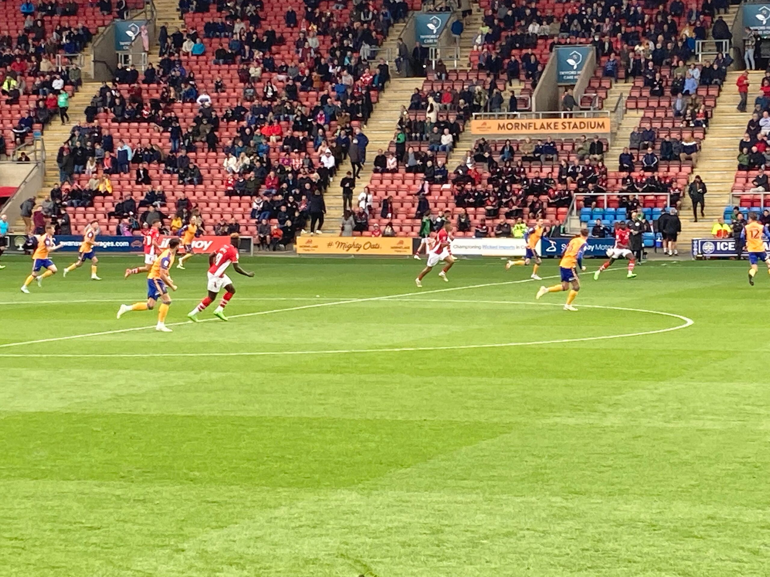 Kick Off! 6 minutes in and Mansfield play down the right with Kellan Gordon, he plays it into the box, it falls for Stephen Quinn who takes a touch and shoots… Deflected… Just wide! Corner, in it comes… It’s headed on and it goes out for a Mansfield throw in on the right hand side, it’s a long throw in… Mansfield concede a free kick.