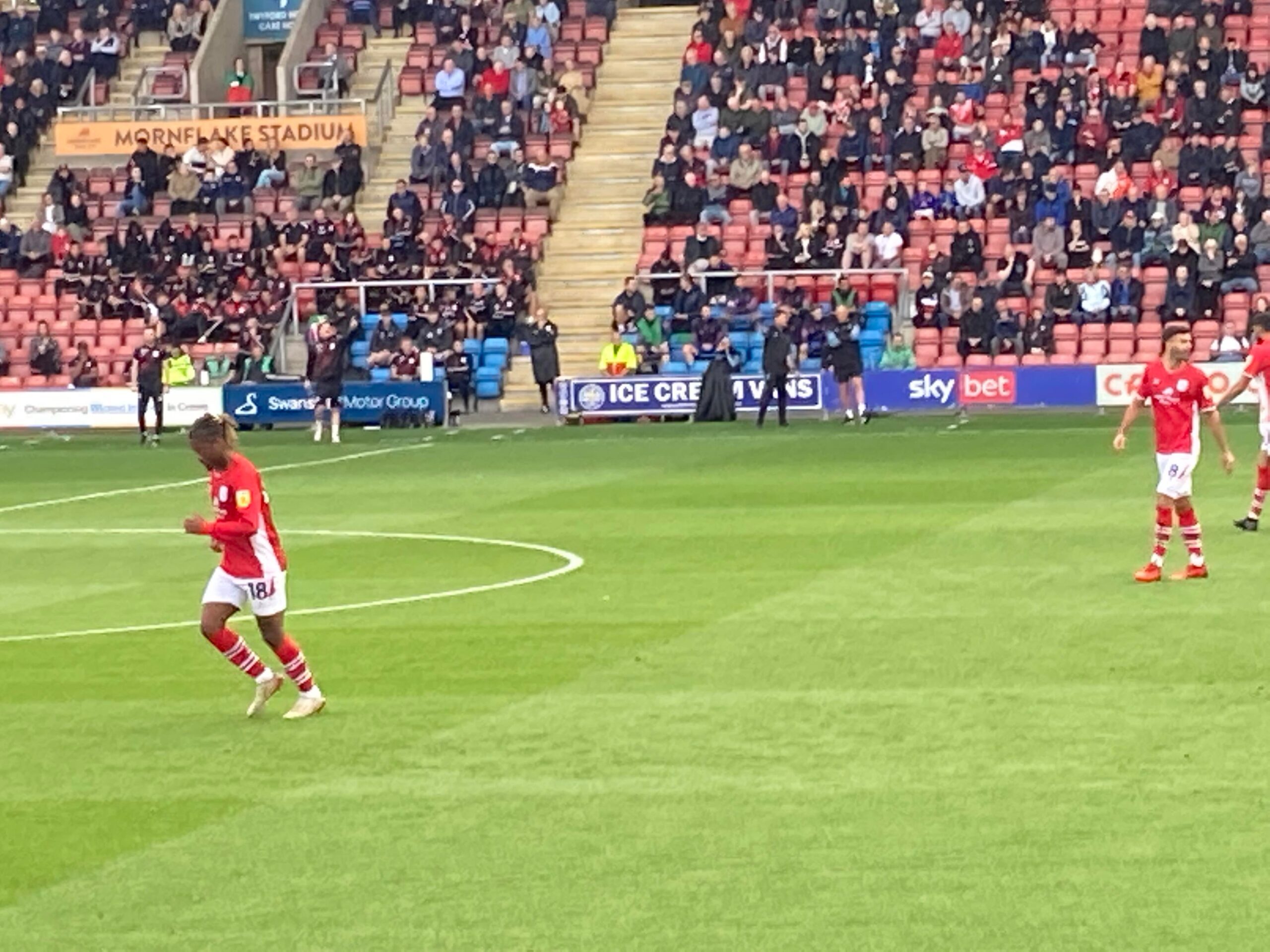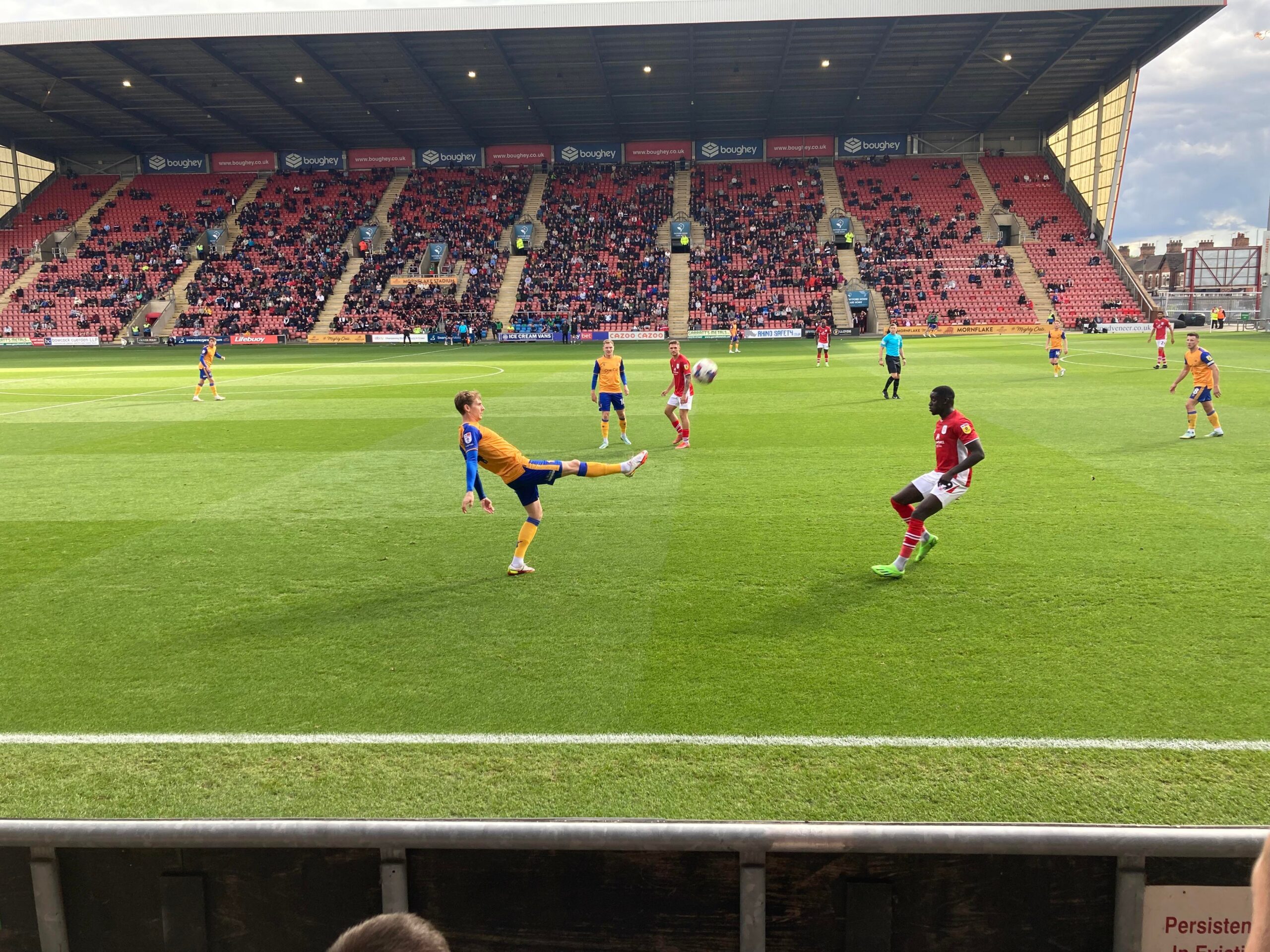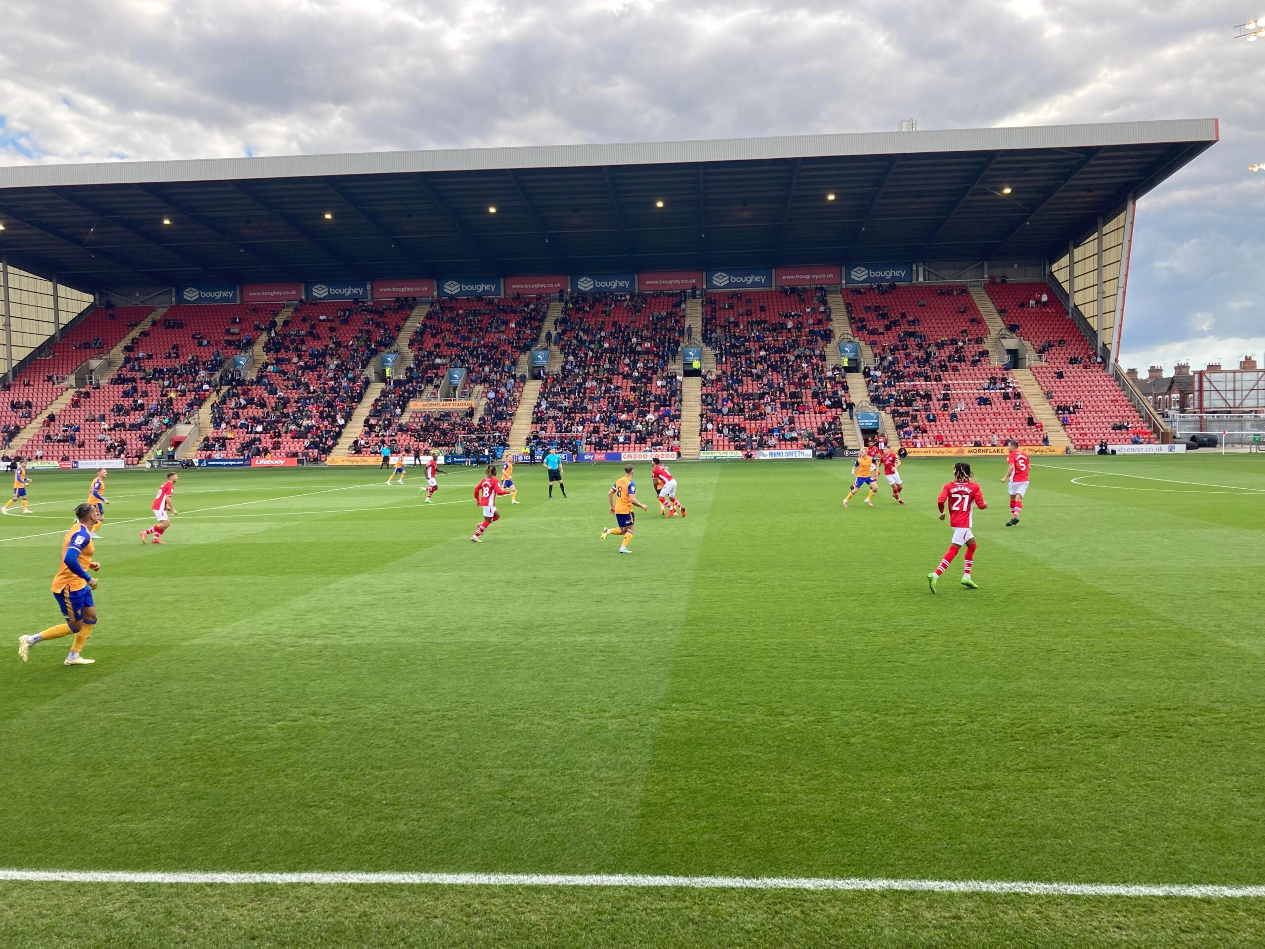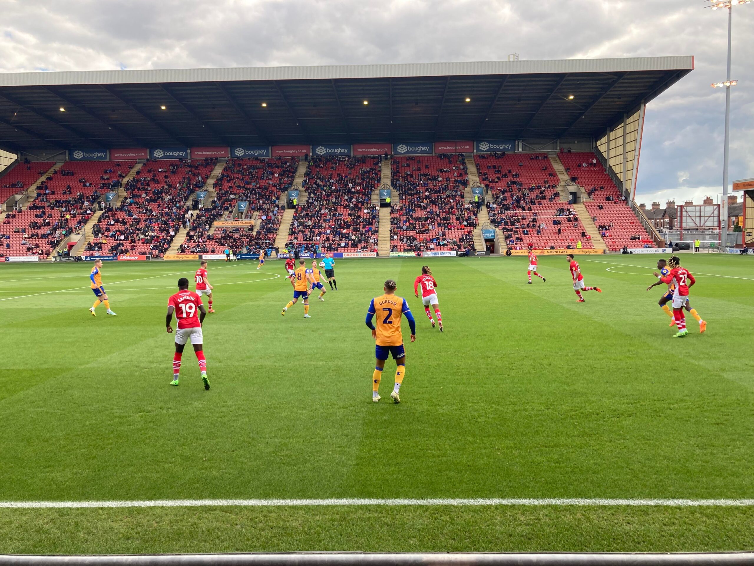 Kick Off! 6 minutes in and Mansfield play down the right with Kellan Gordon, he plays it into the box, it falls for Stephen Quinn who takes a touch and shoots… Deflected… Just wide! Corner, in it comes… It’s headed on and it goes out for a Mansfield throw in on the right hand side, it’s a long throw in… Mansfield concede a free kick.