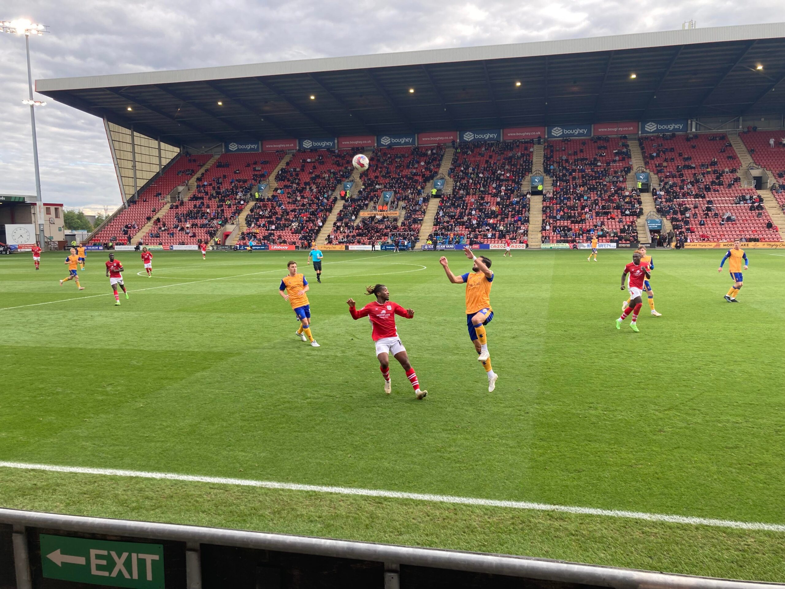 Second half, 49 minutes on the clock, Mansfield play forward down the left, it’s crossed in towards Ollie Clarke… It’s just too high for him and he heads over.