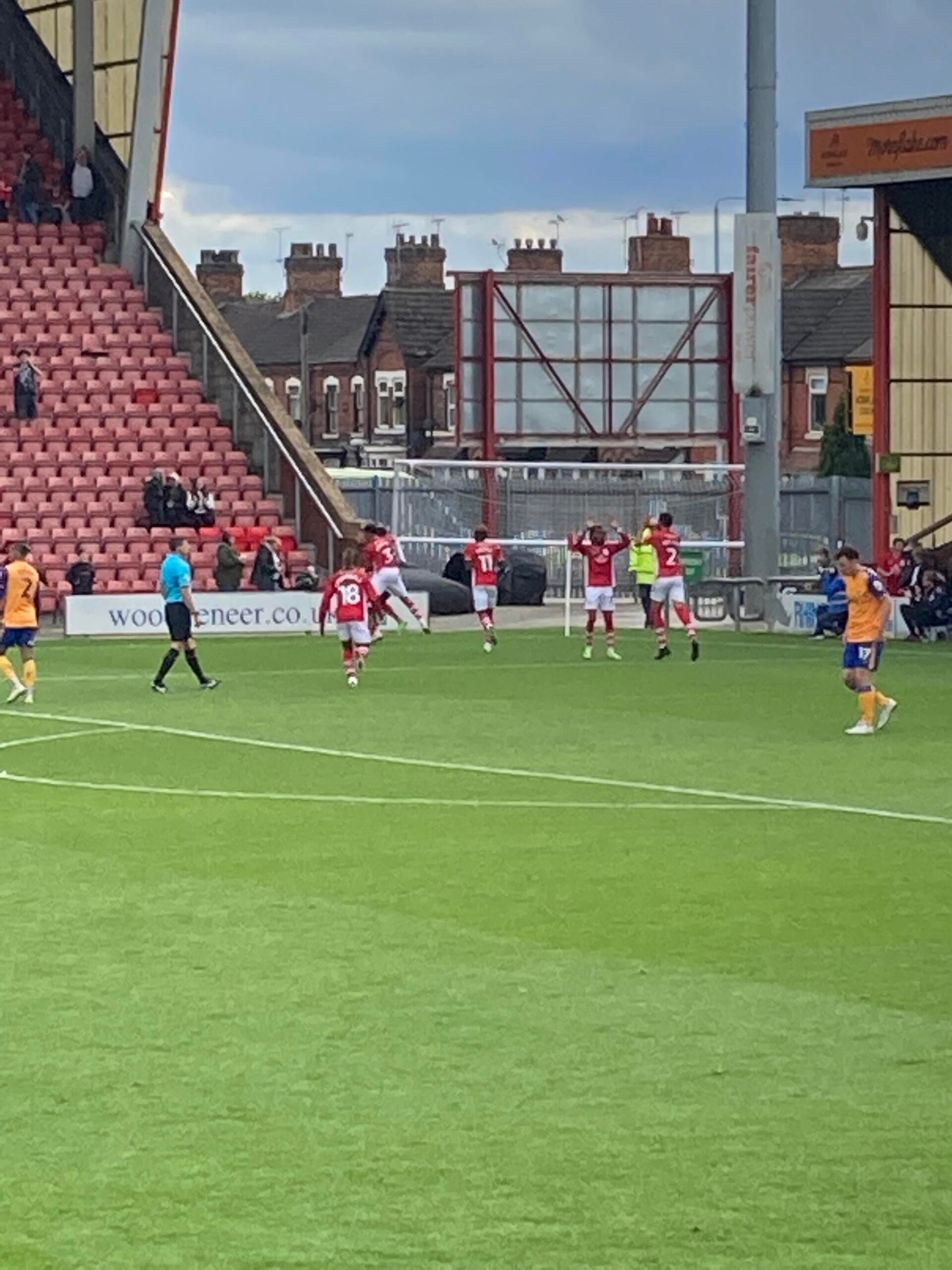 16th minute now and Mansfield have a free kick on the right, in it comes… Ollie Hawkins with the header… Good save! Corner again for Mansfield, in it comes again… Punched away by the keeper, it goes out for a throw in on the right for Mansfield again, it’s played to George Maris who plays it into the middle, it’s headed out for a throw in on the left for Mansfield, it’s played in and Mansfield cross… Crewe clear.
