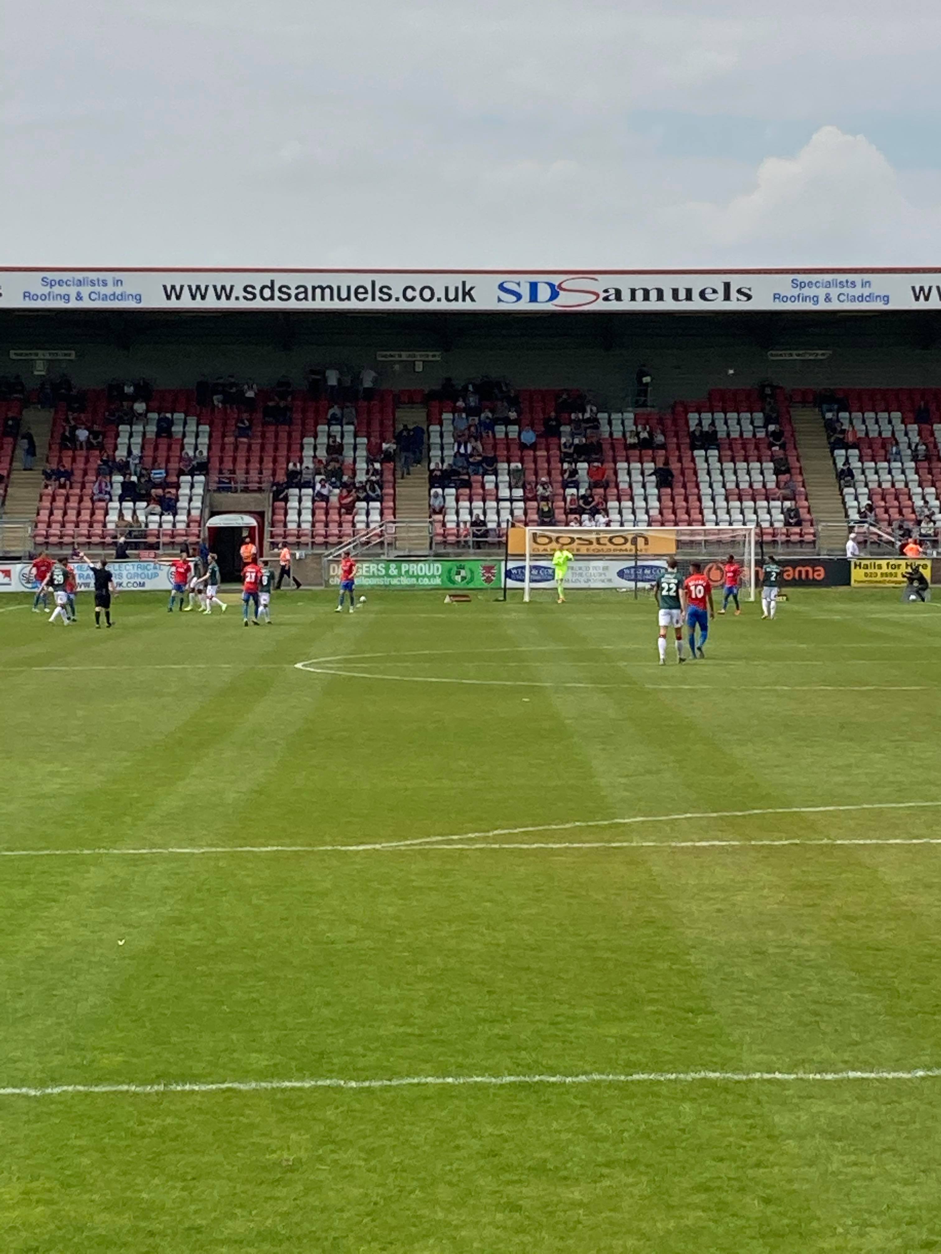 Kick Off! “DIGGER DAGGER DIGGER DAGGER! OI OI OI!” Great to hear real crowd noise again! 2 minutes in and Wrexham have a corner, in it comes, Shaun Pearson with the header… Just over! Early pressure from the visitors! 7 minutes gone now and Wrexham come forward down the right, Reece Hall-Johnson drives down the right and crosses… It goes just wide.