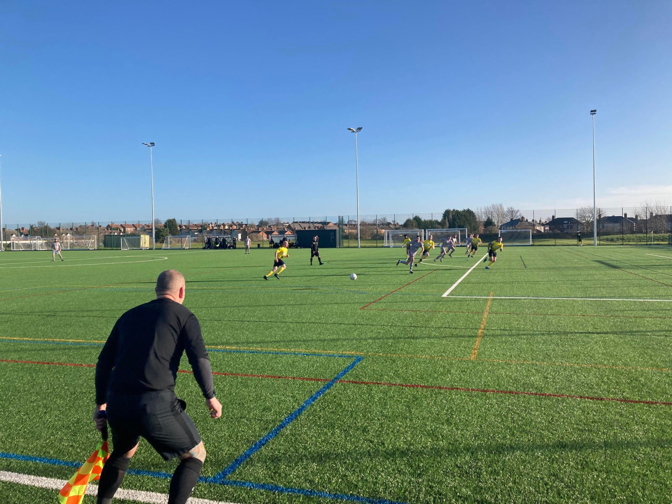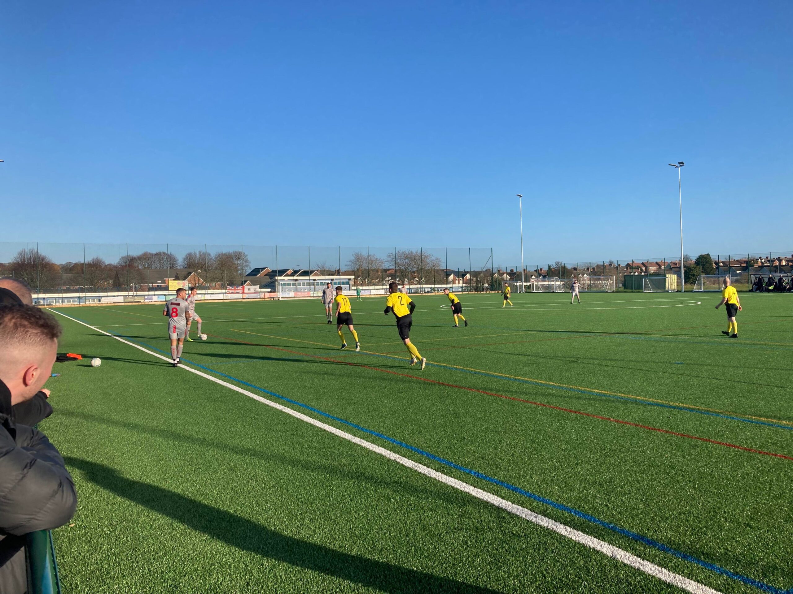 3 minutes later and Dinnington play forward now, it’s played to Brandon Whitfield and he goes for goal from 35 yards… Just wide! What a goal that nearly was! “Come on Deano!” A bit of noise from the Dinnington fans here!!