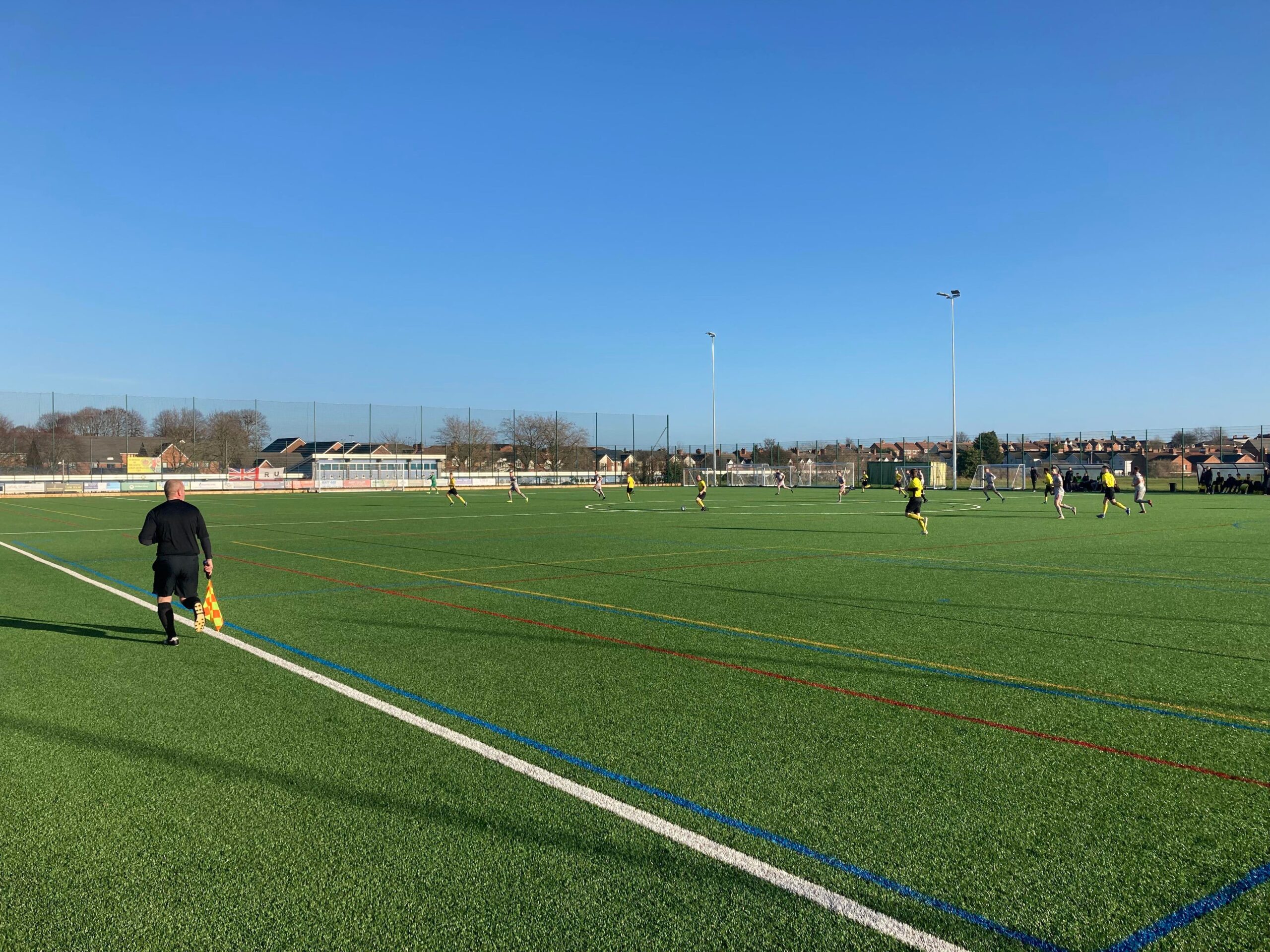 32 minutes now and Dinnington play it forward, it comes for Aaron Moxam in the box on the left, he plays it across and the shot comes in… Save! Dinnington get it back and it’s played to Chris Lewis and he goes for goal from 25 yards out… Saved again! Keeper tips it wide for a corner, in comes the corner… Retford clear.