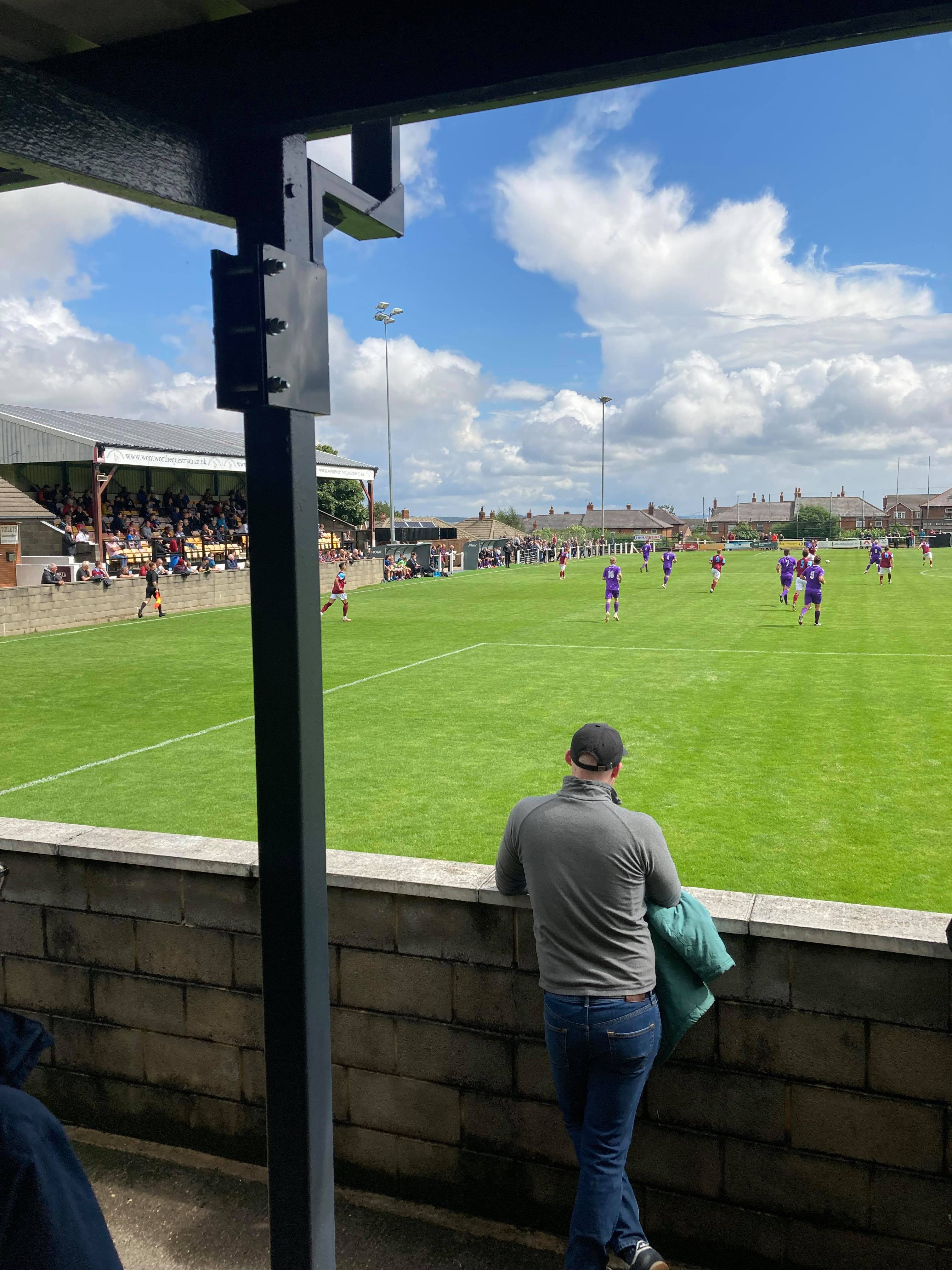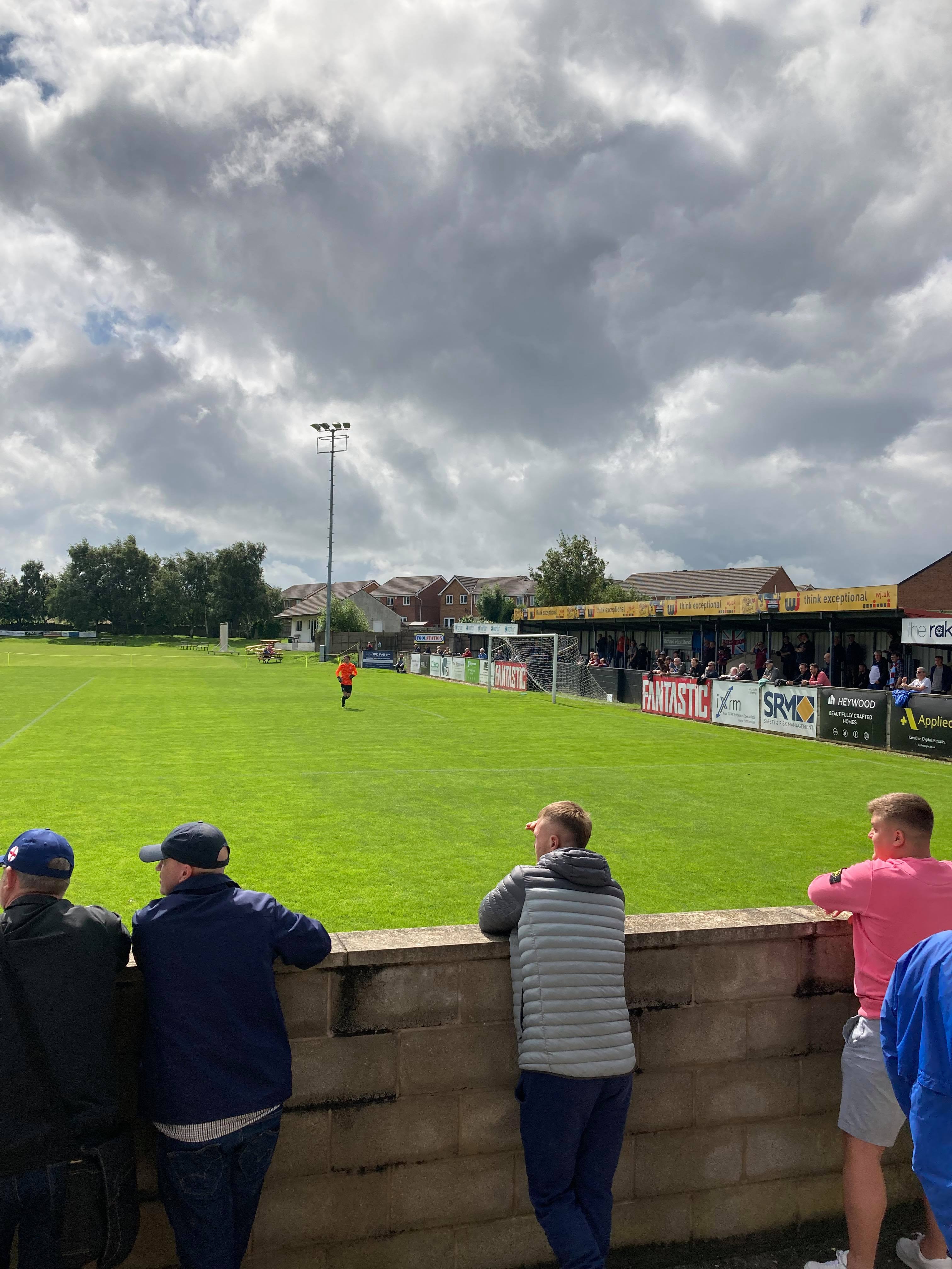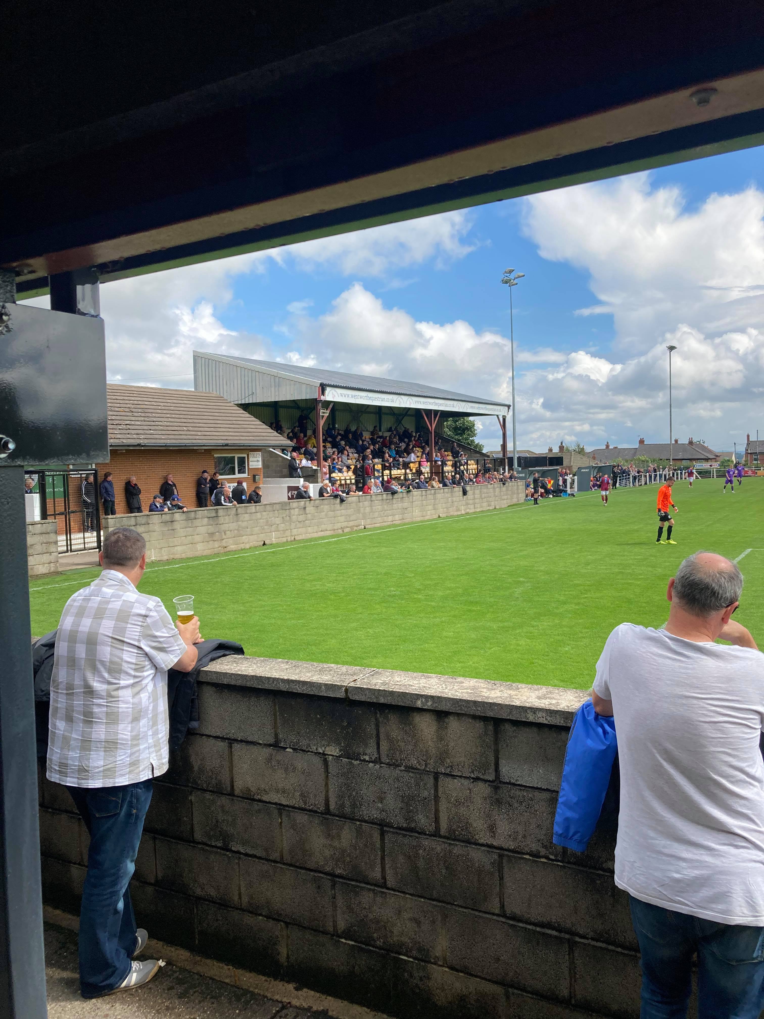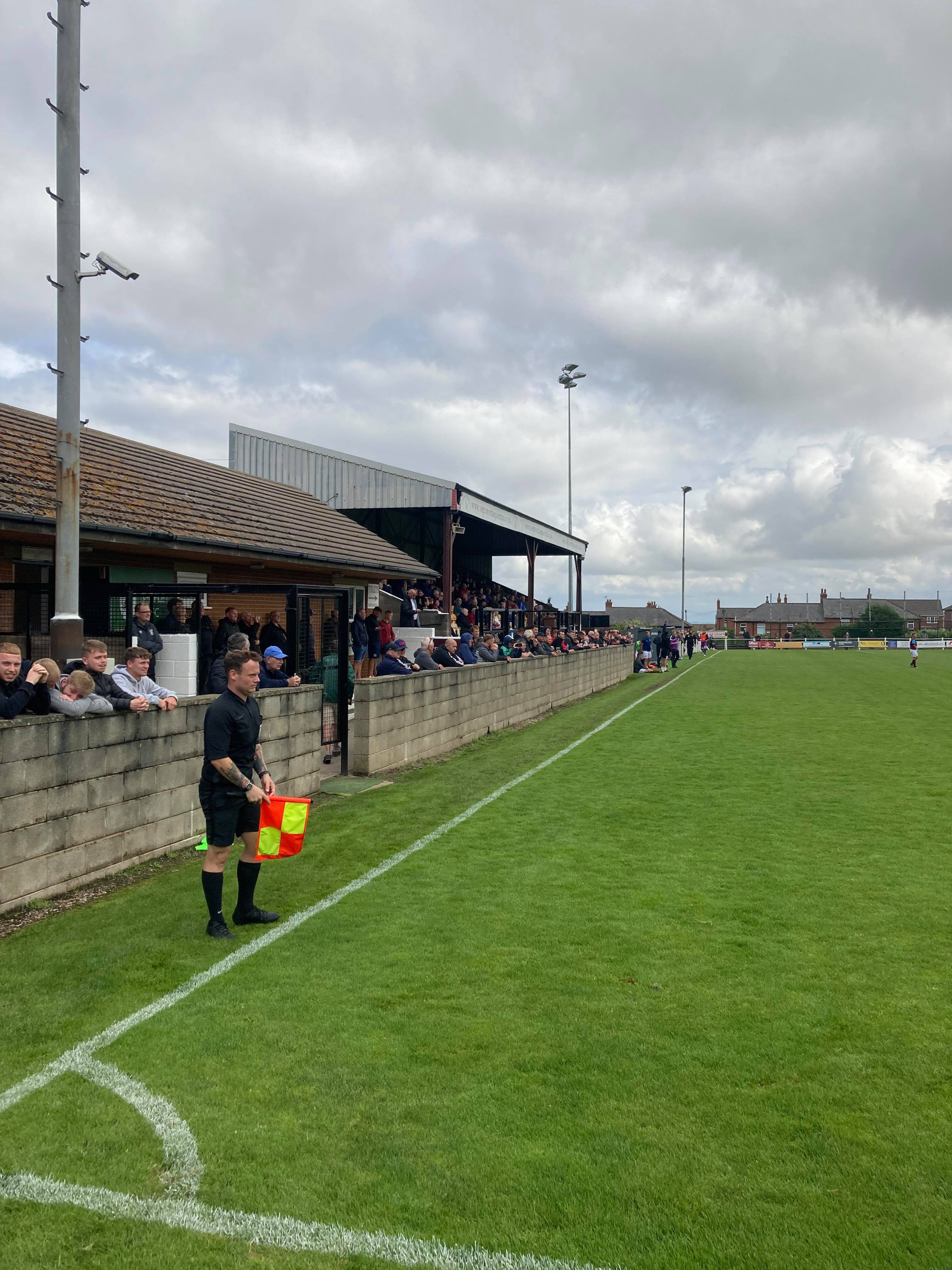 10 minutes in and Congleton play forward, it comes to Jordan Johnson on the edge of the box, he’s tripped and it’s going to be a free kick on the edge of the box for Congleton. Gary Roberts steps up for Congleton, he goes for power… Deflected… OFF THE POST!! Would have been a cracker that!! Great to bump into Ian on the way around the ground! Everyone is here today!!