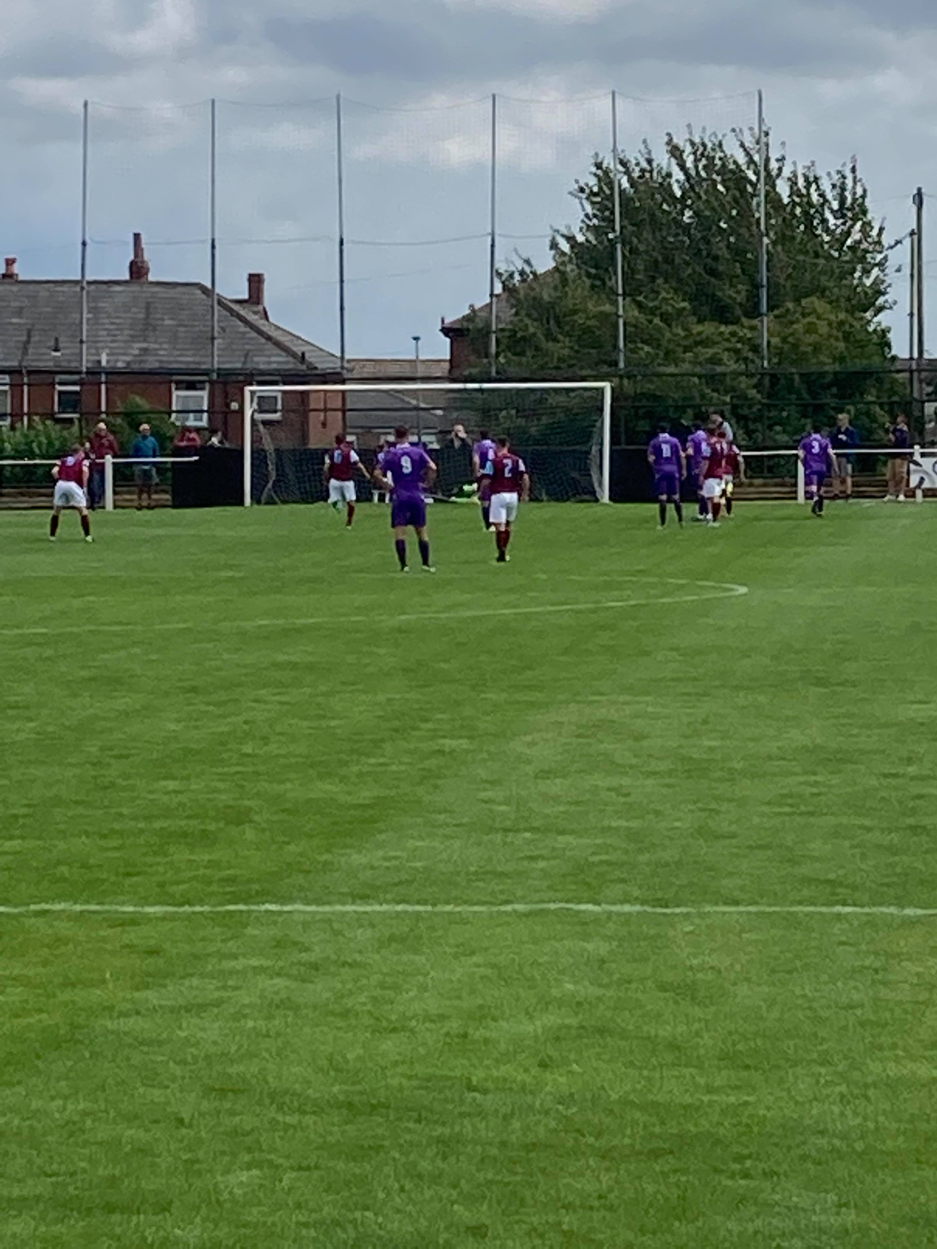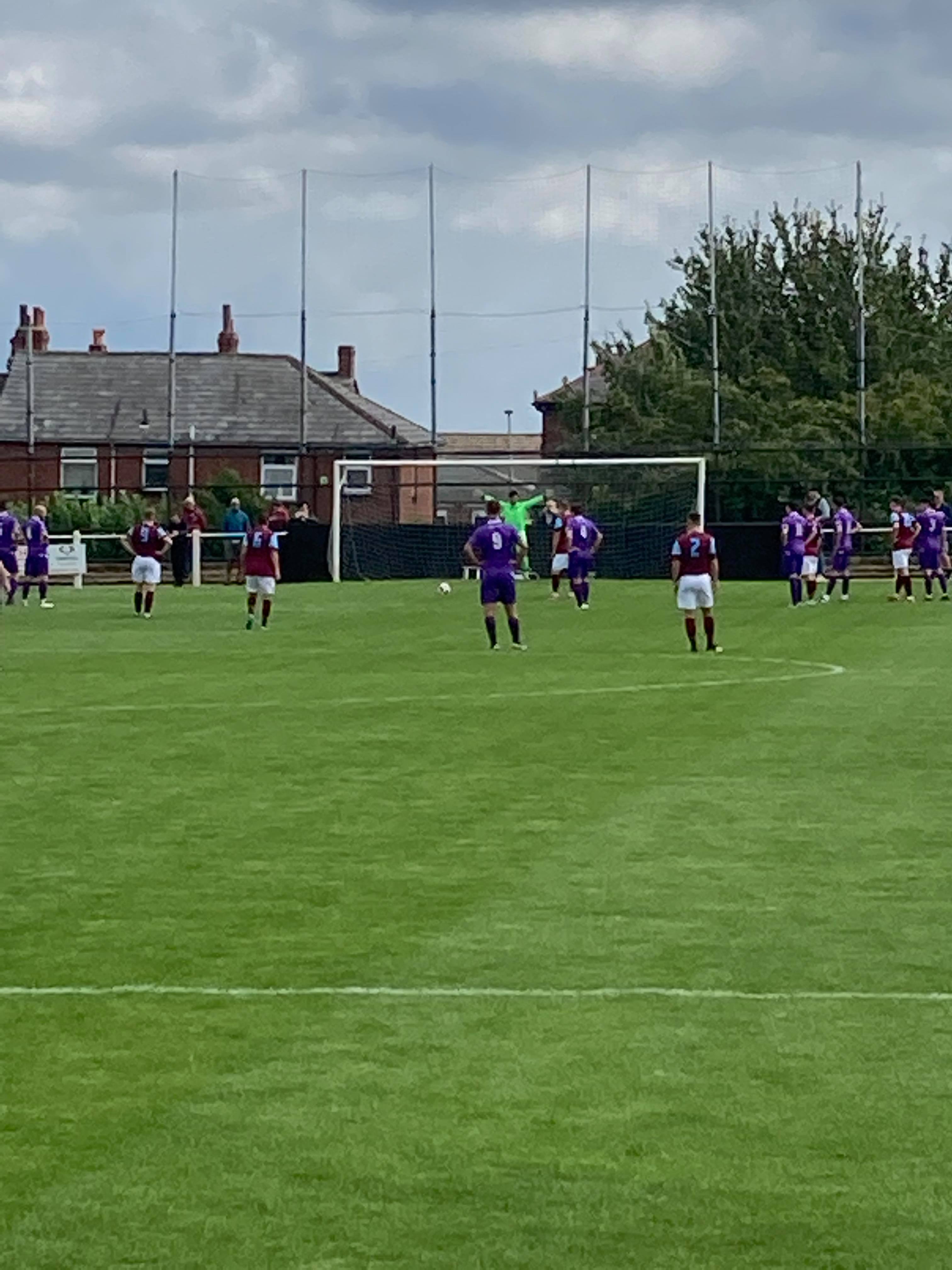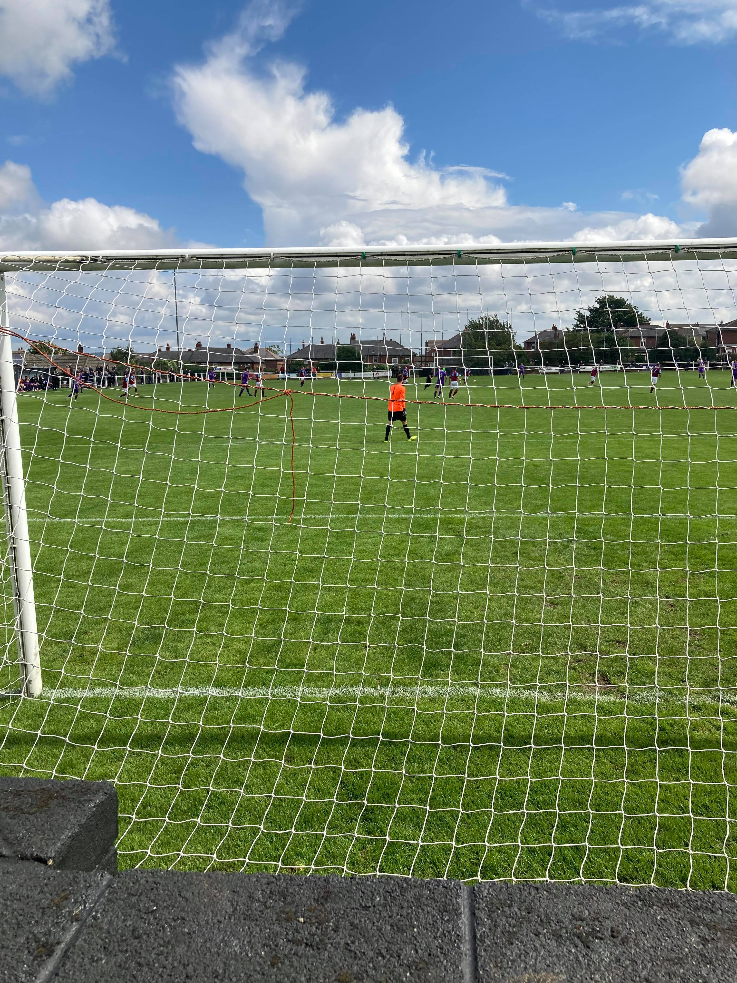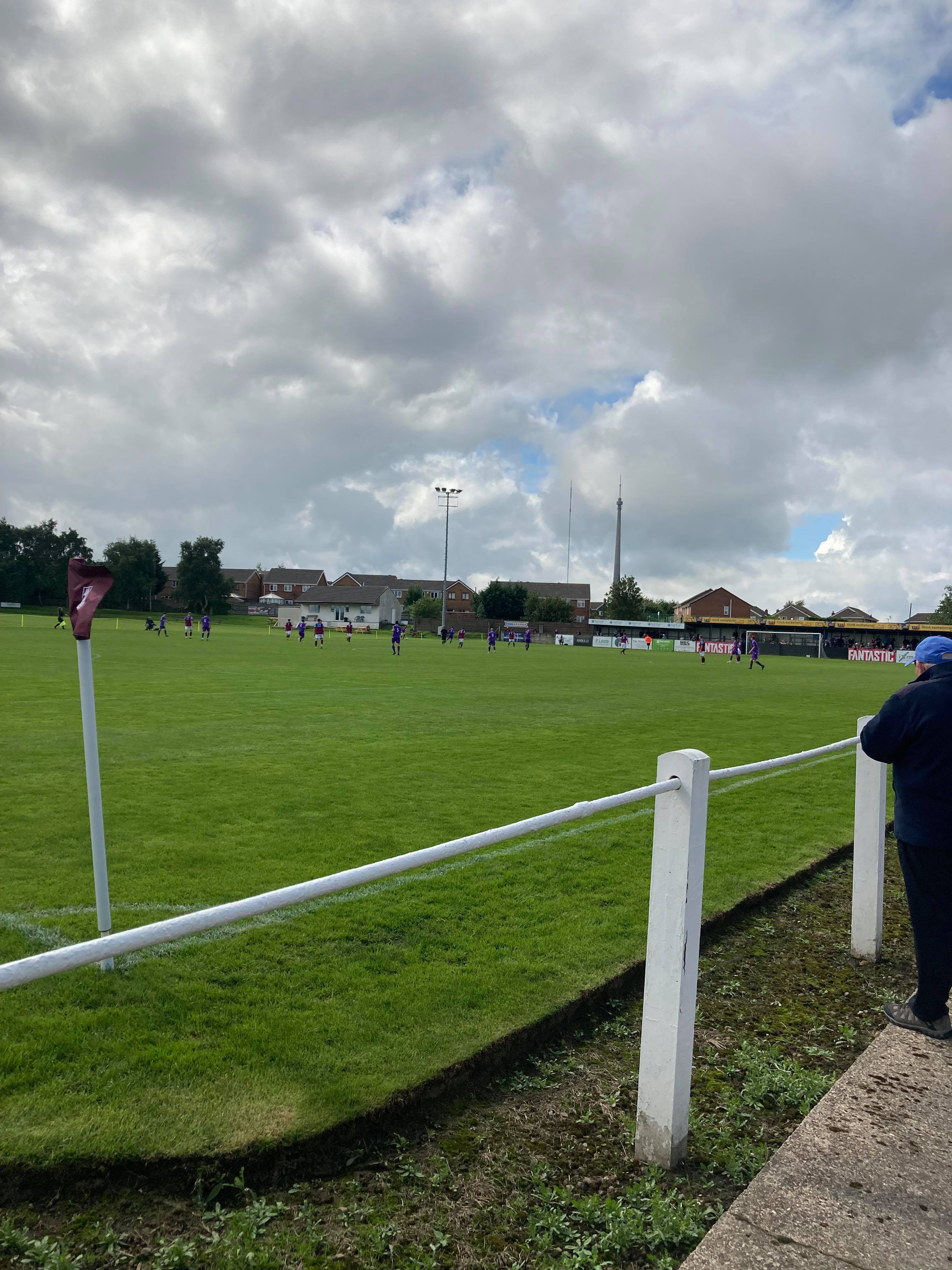 10 minutes in and Congleton play forward, it comes to Jordan Johnson on the edge of the box, he’s tripped and it’s going to be a free kick on the edge of the box for Congleton. Gary Roberts steps up for Congleton, he goes for power… Deflected… OFF THE POST!! Would have been a cracker that!! Great to bump into Ian on the way around the ground! Everyone is here today!!