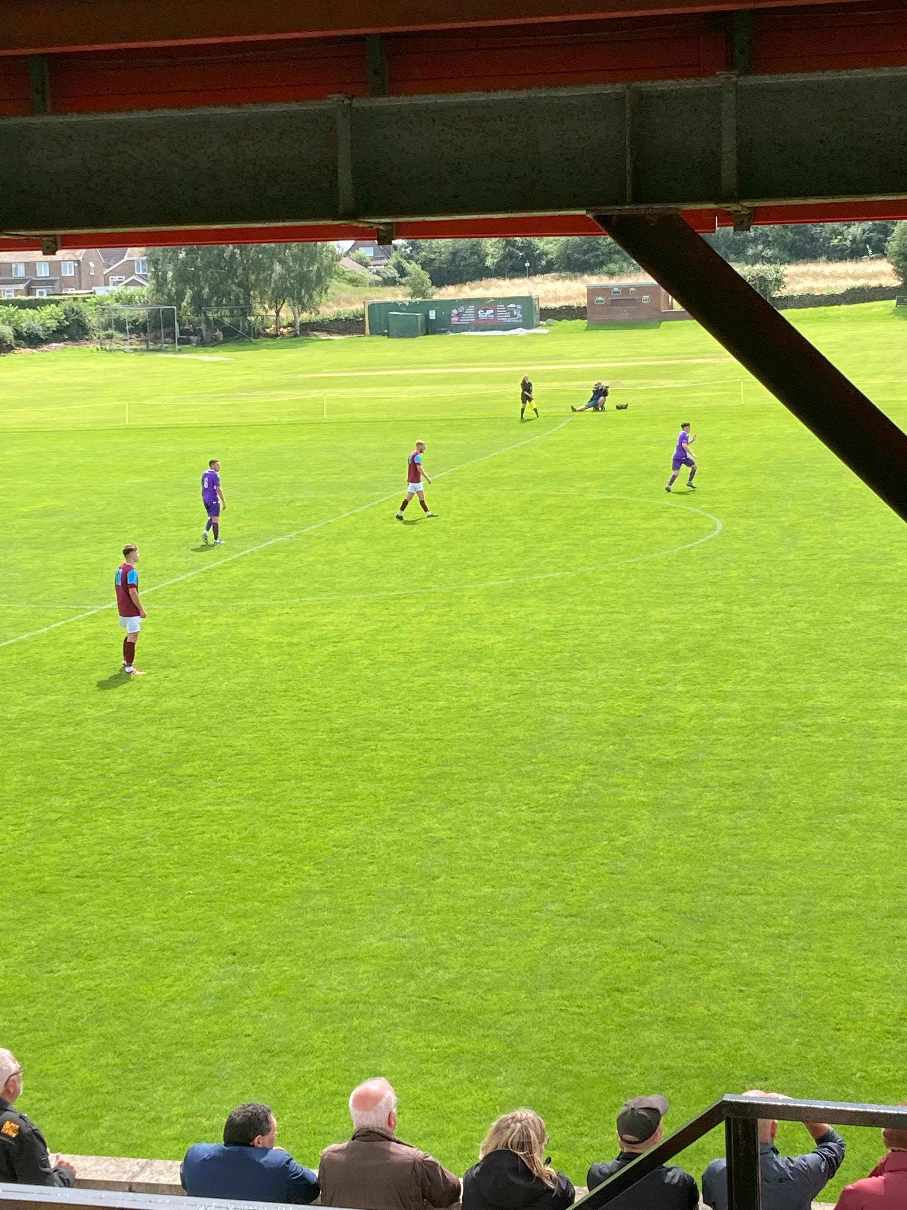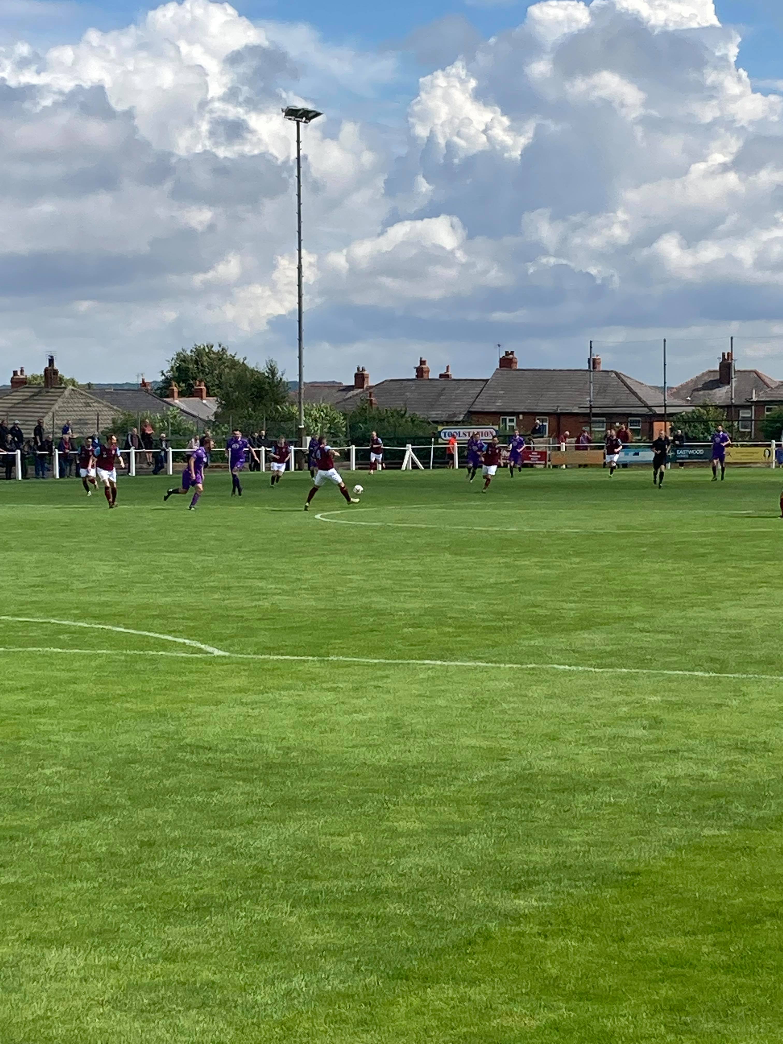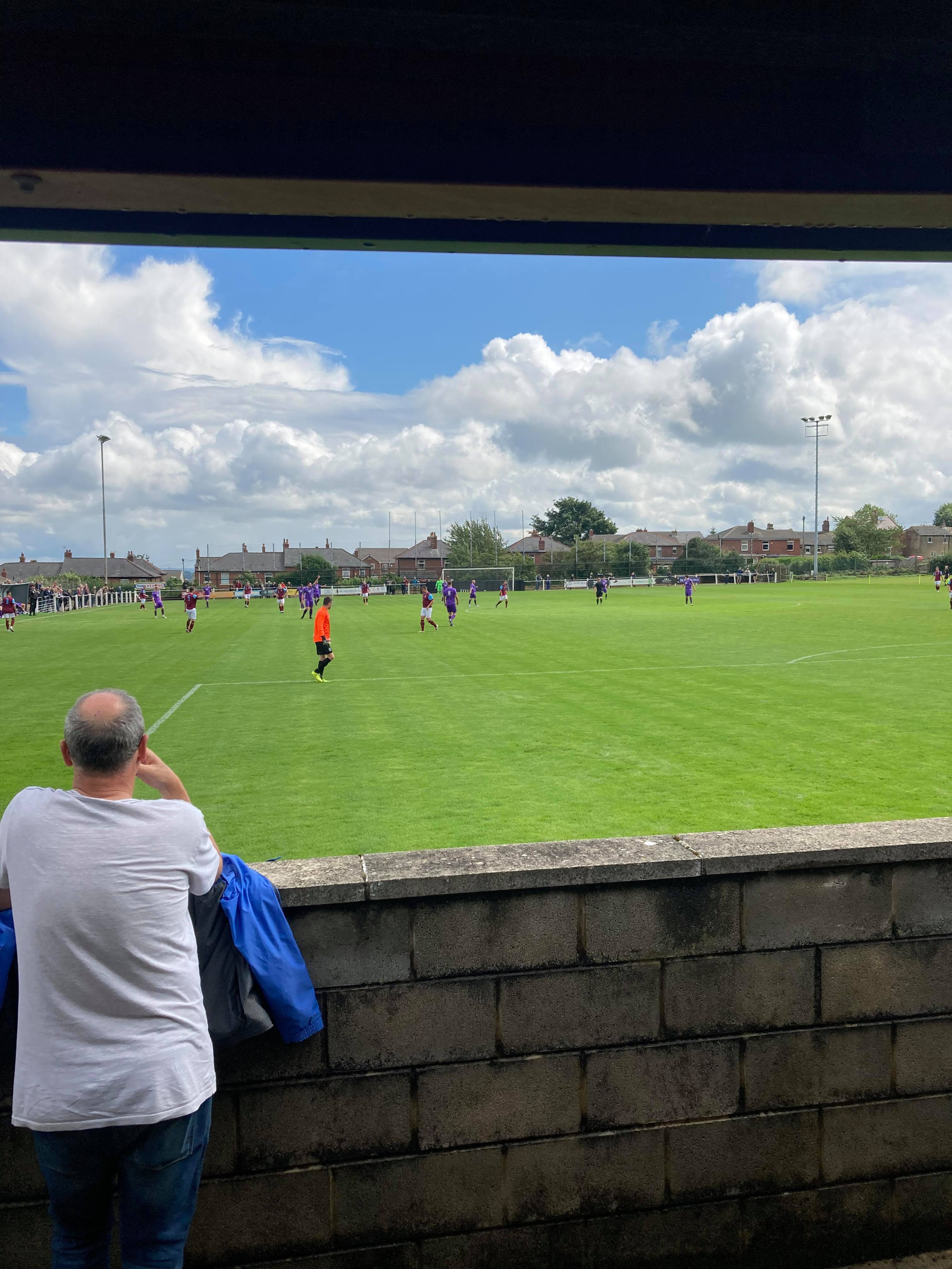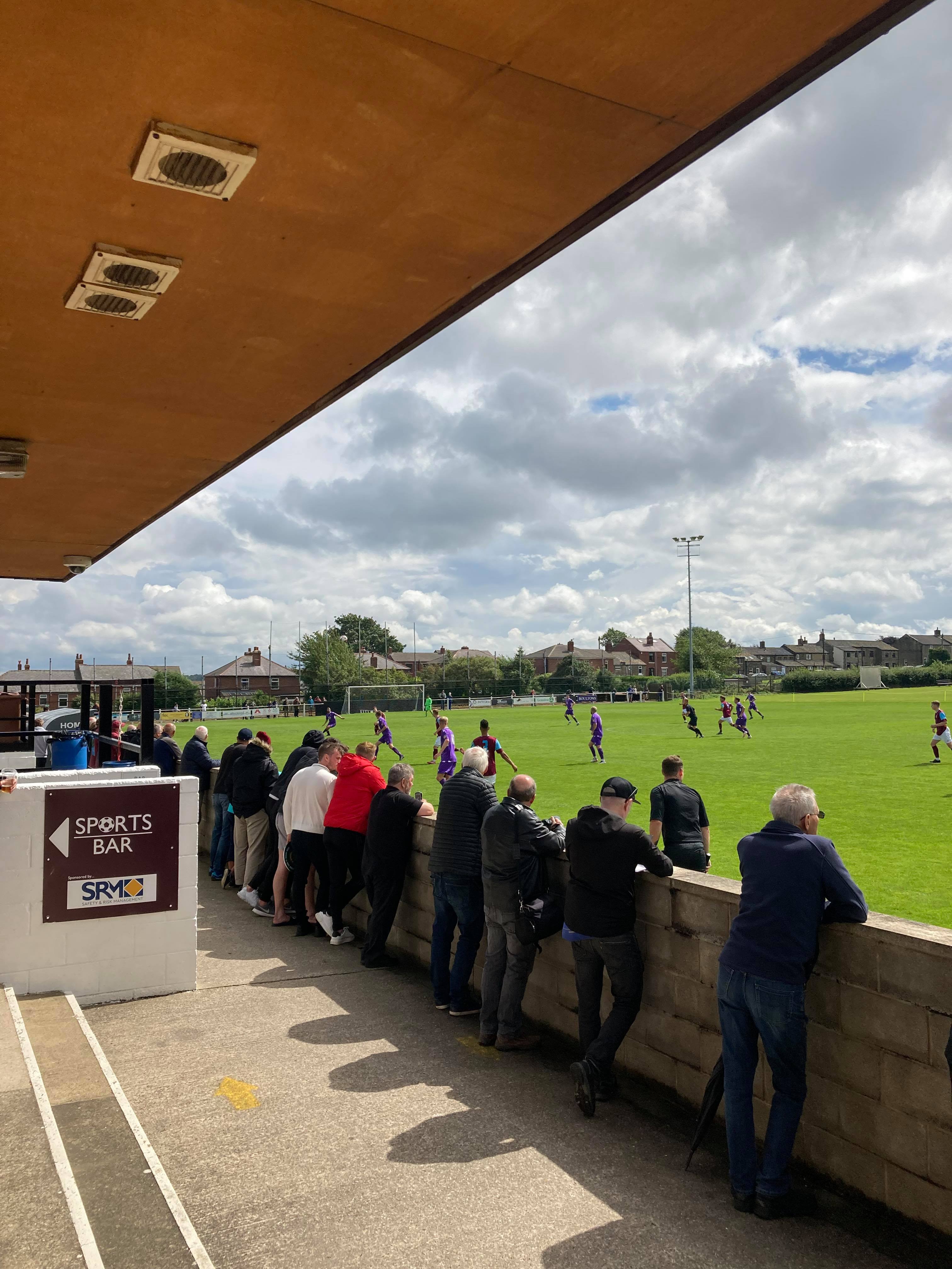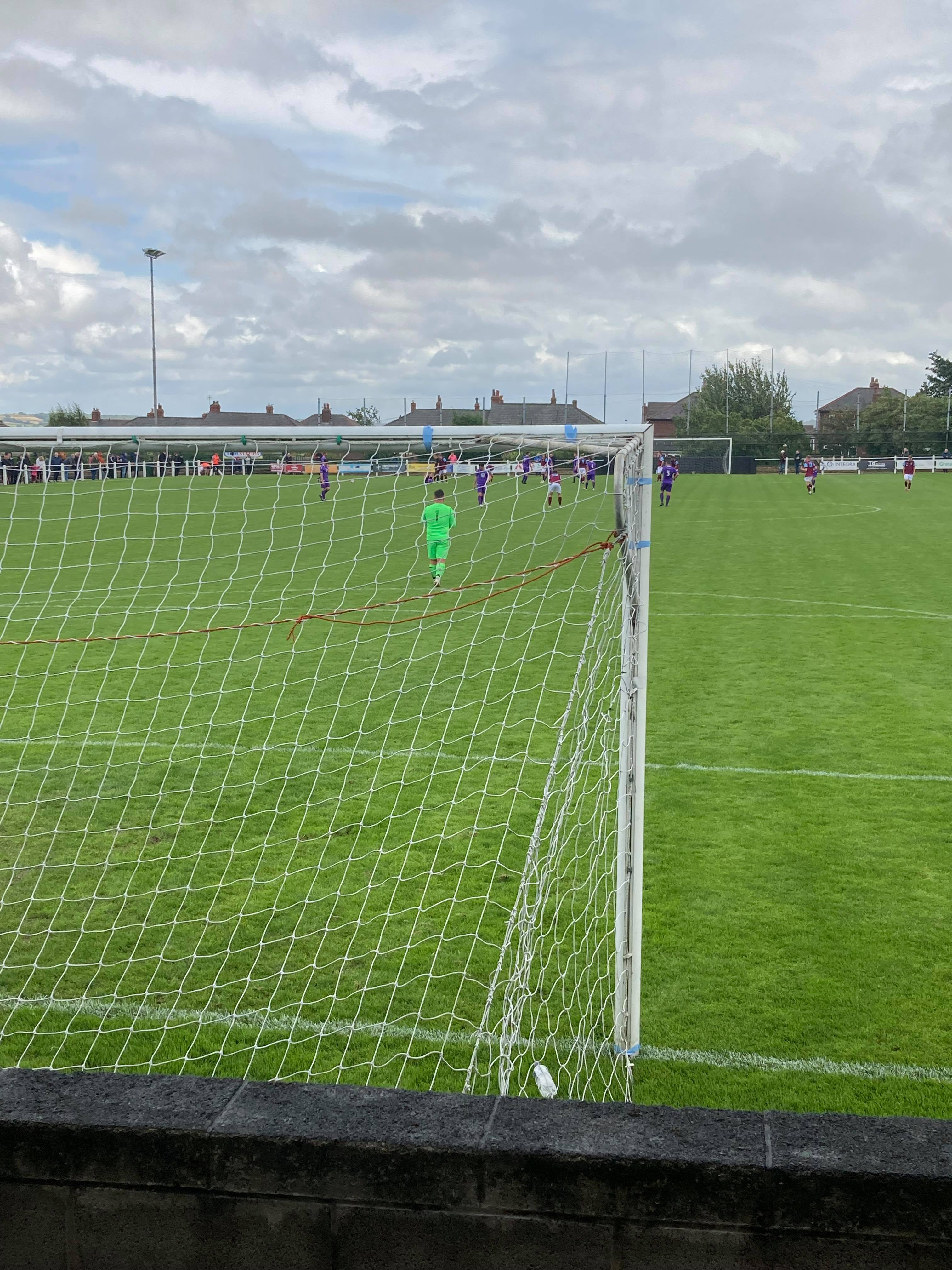 10 minutes in and Congleton play forward, it comes to Jordan Johnson on the edge of the box, he’s tripped and it’s going to be a free kick on the edge of the box for Congleton. Gary Roberts steps up for Congleton, he goes for power… Deflected… OFF THE POST!! Would have been a cracker that!! Great to bump into Ian on the way around the ground! Everyone is here today!!