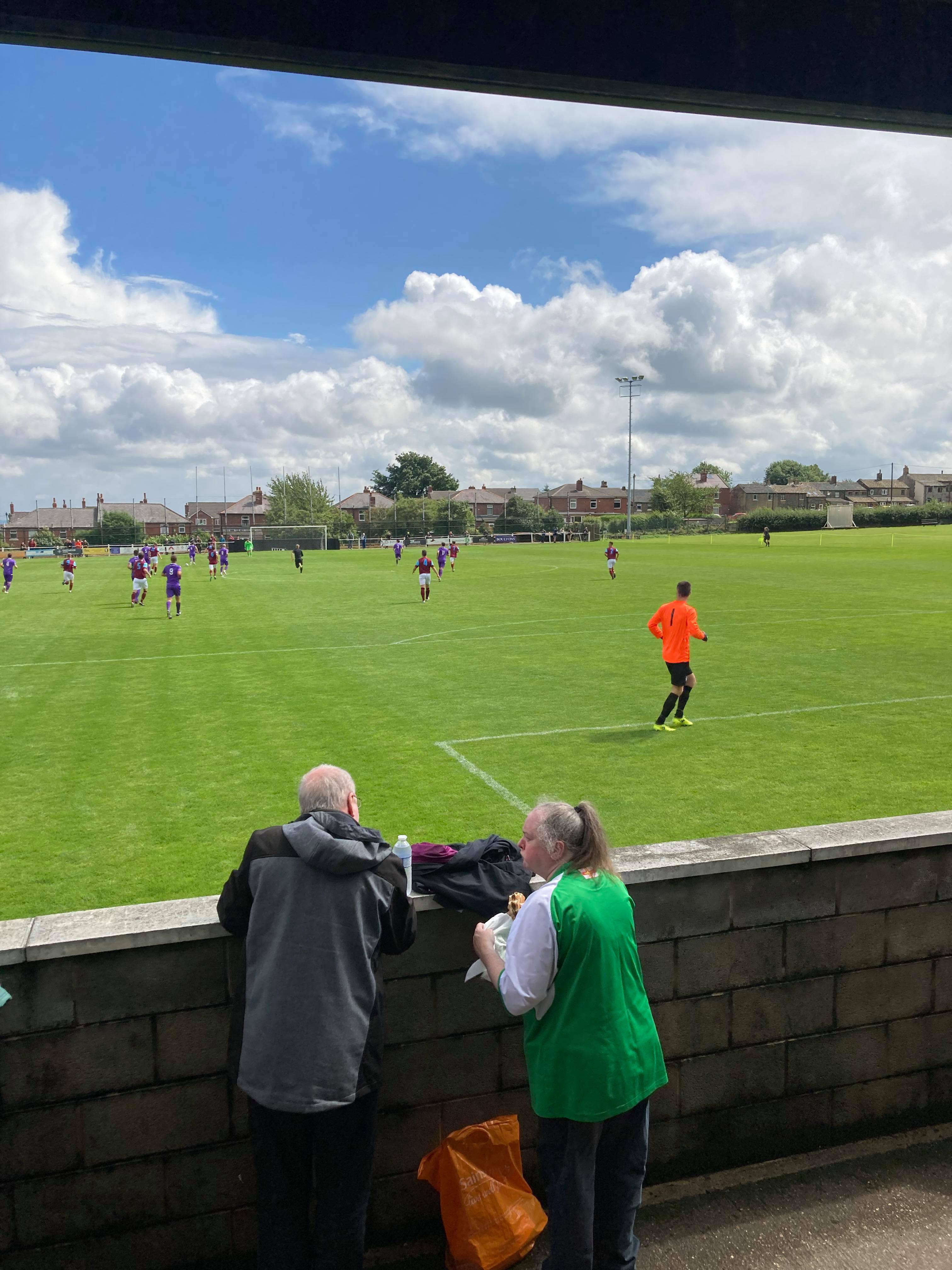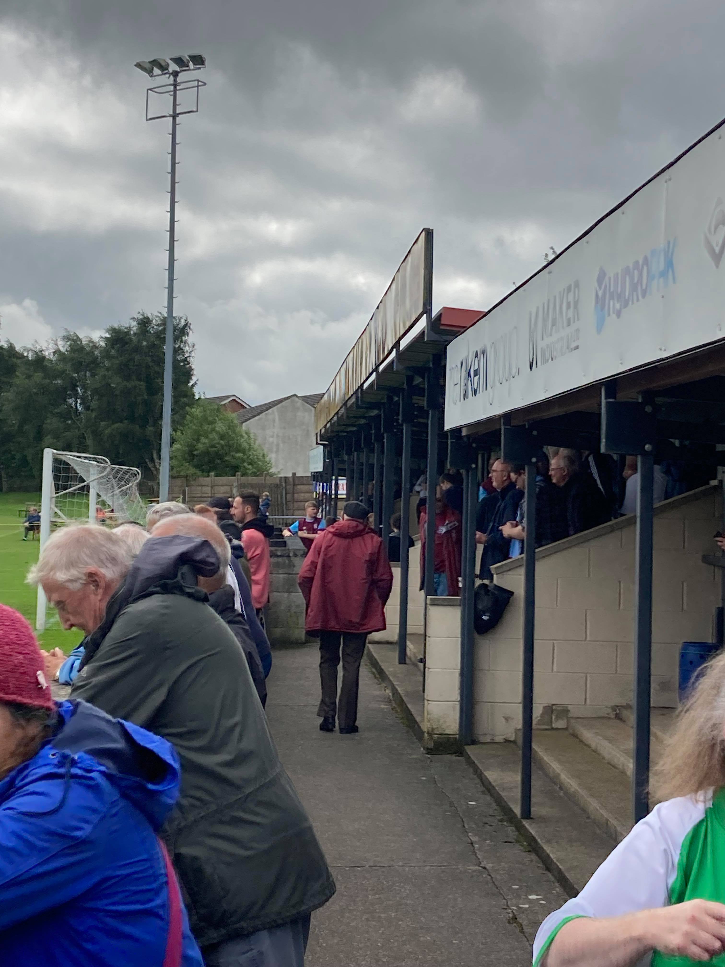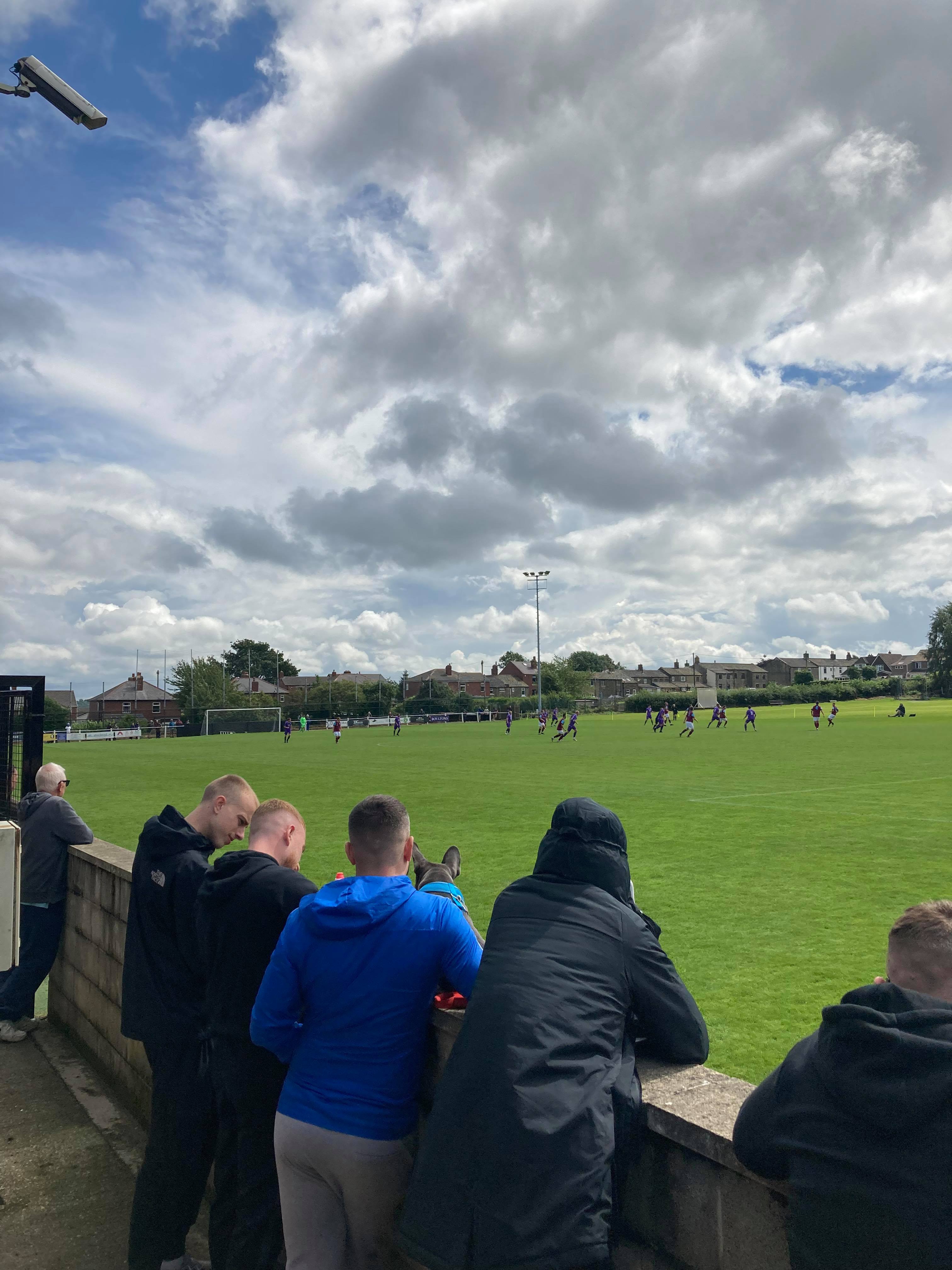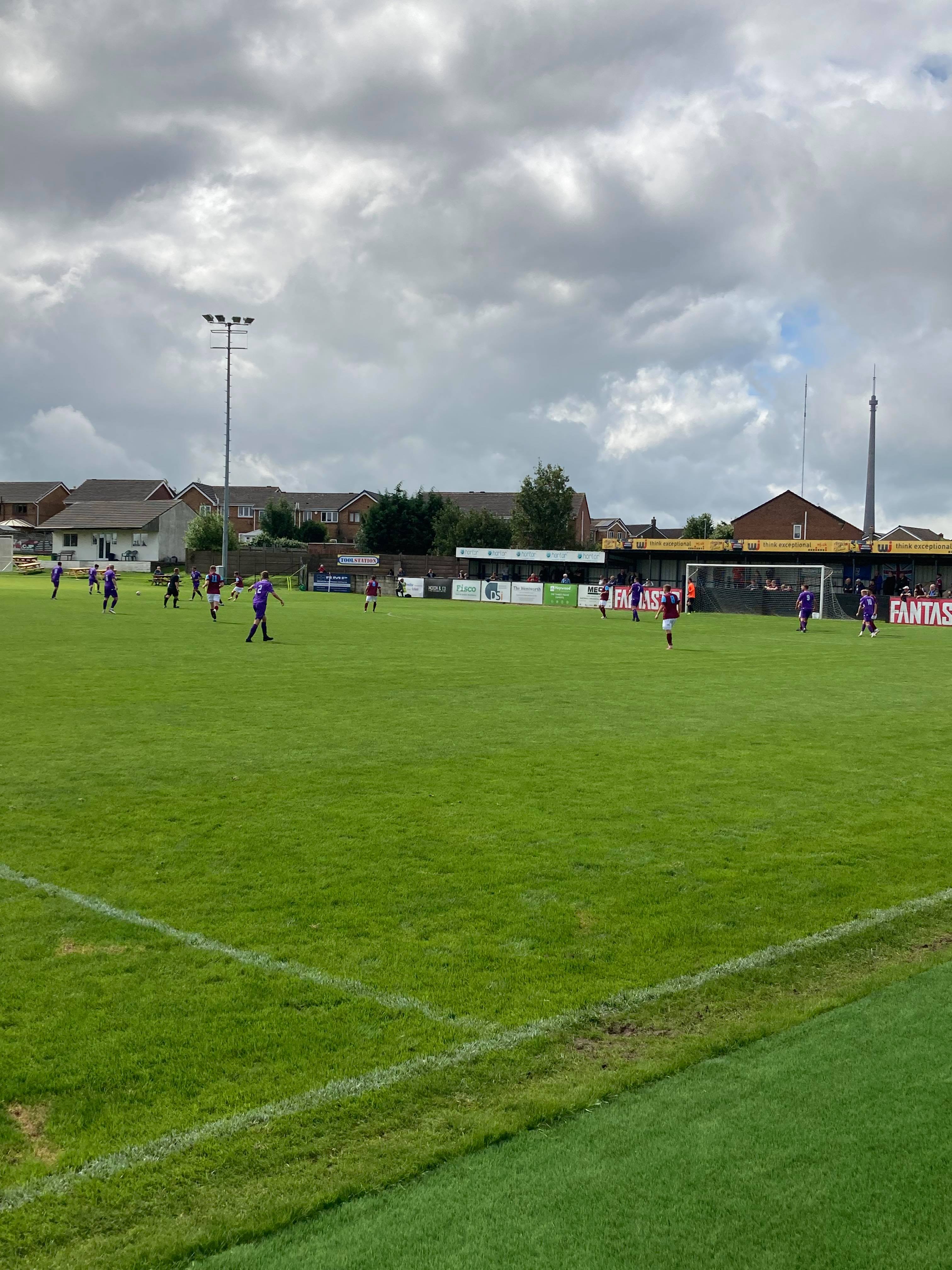 10 minutes in and Congleton play forward, it comes to Jordan Johnson on the edge of the box, he’s tripped and it’s going to be a free kick on the edge of the box for Congleton. Gary Roberts steps up for Congleton, he goes for power… Deflected… OFF THE POST!! Would have been a cracker that!! Great to bump into Ian on the way around the ground! Everyone is here today!!