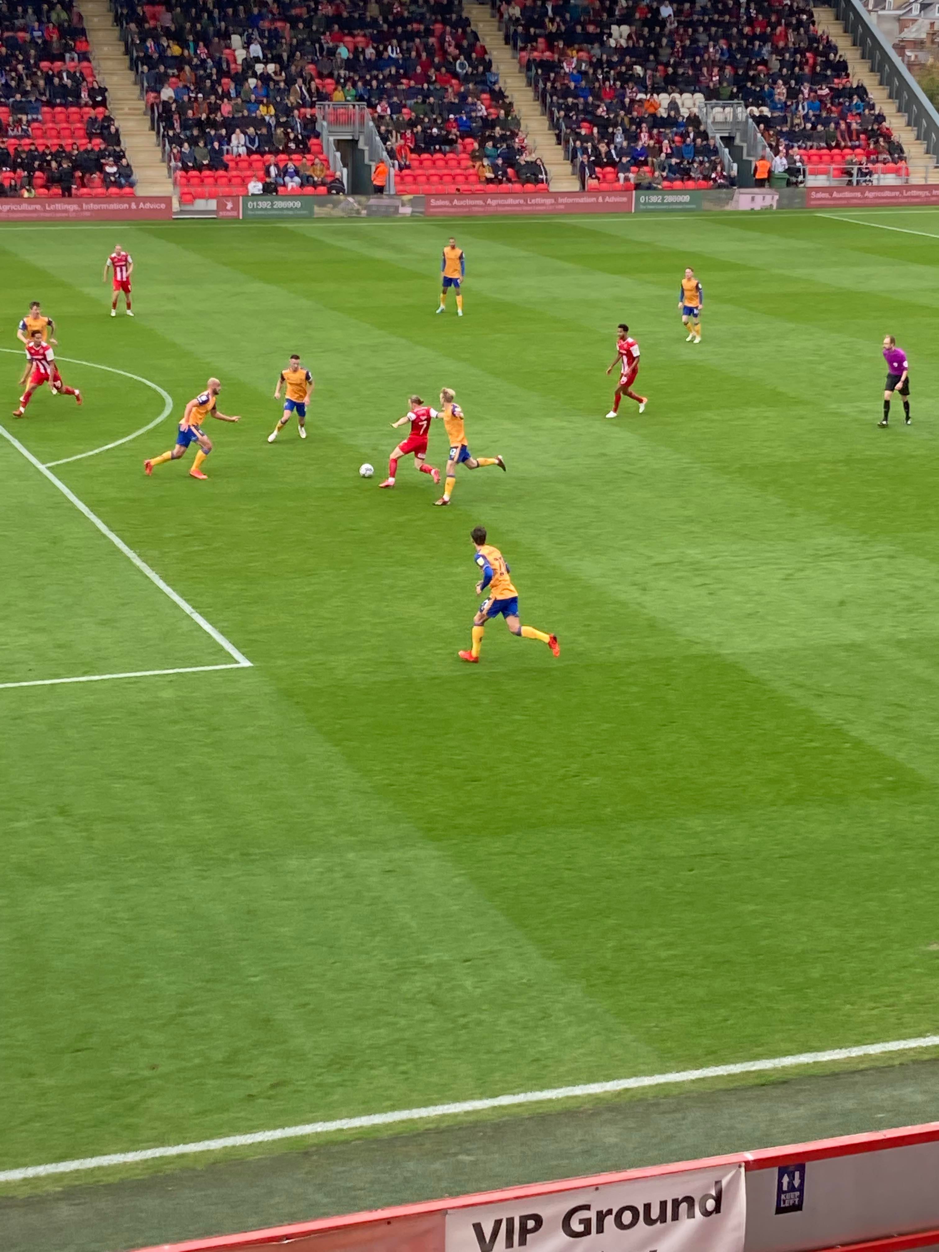 “YELLOWS YELLOWS!” Mansfield fans in good spirits now! 60 minutes now and Mansfield break forward with Rhys Oates, he plays it to Jordan Bowery who gets into the box on the left side… He’s intercepted and Exeter clear… Why didn’t he shoot!?