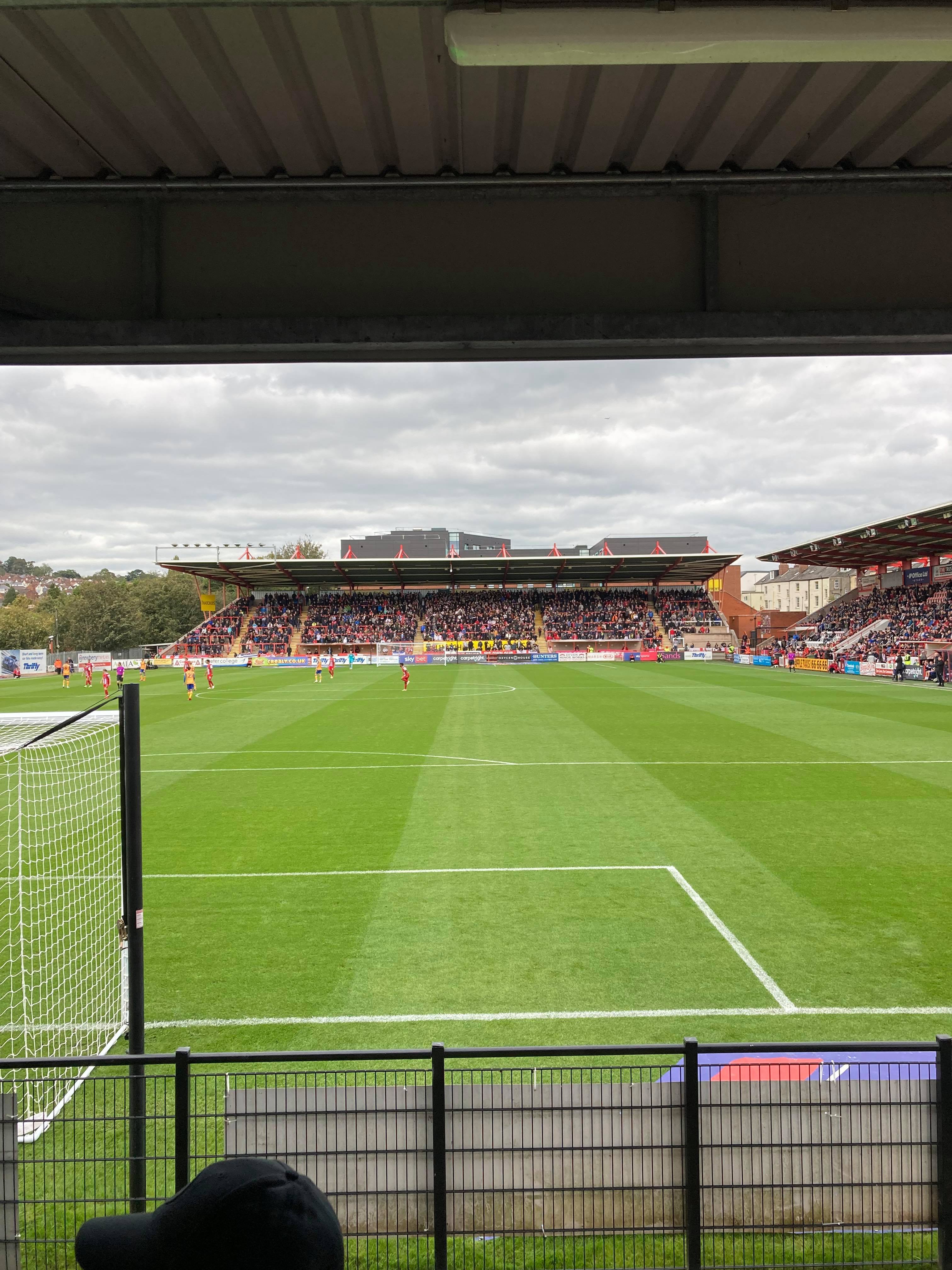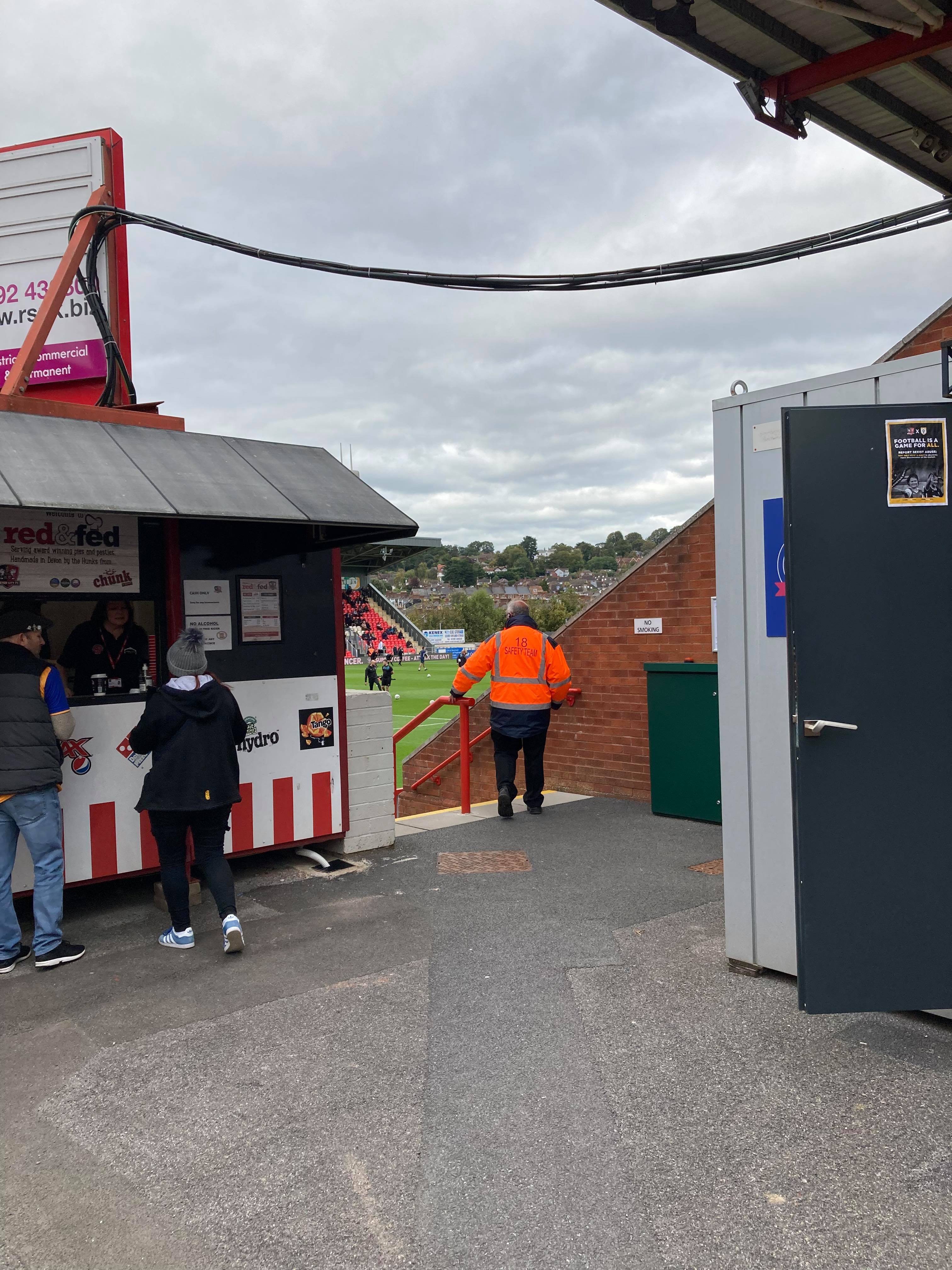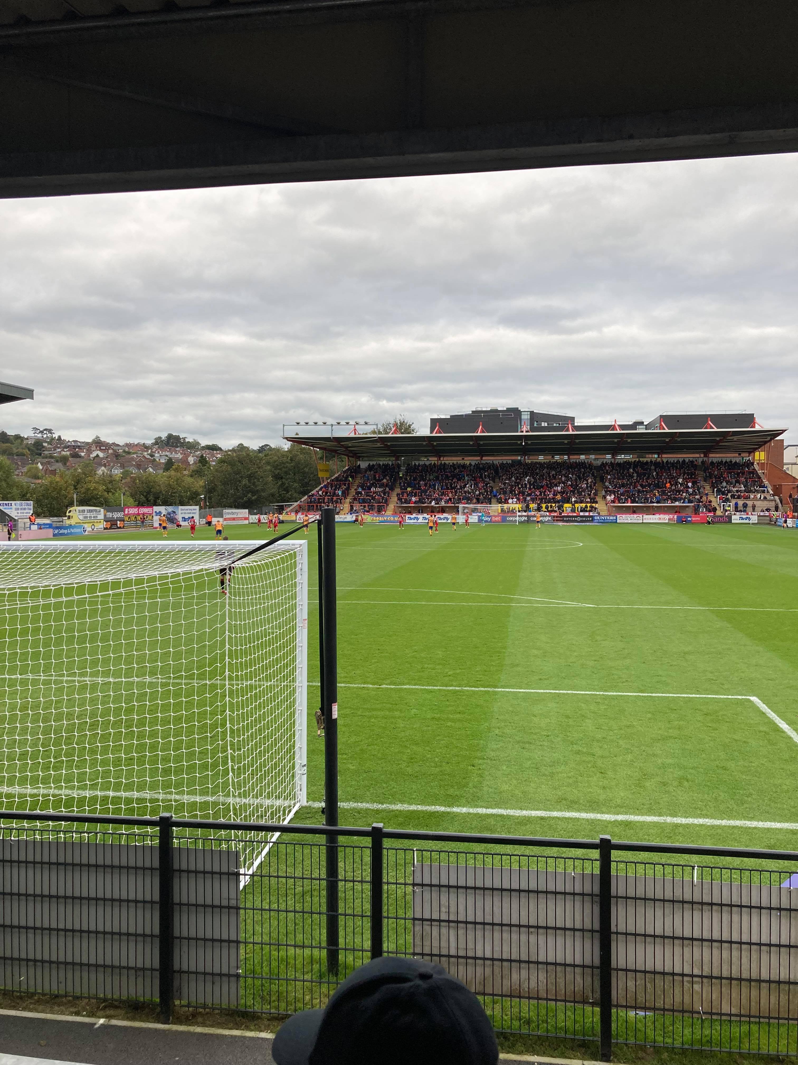 We have finally made it to Devon! Time to check out the town! A nice little Exeter pub crawl to kill time just like Chelsea are killing Norwich and me potting the Black ball too early at Pool is a great way to kill time eh…? Time for the game! £8 to get in here! Bingo! “Allez Allez Allez!” Exeter fans starting brightly, what about us? “Since I was young! I followed them! MTFC! The team for me!”