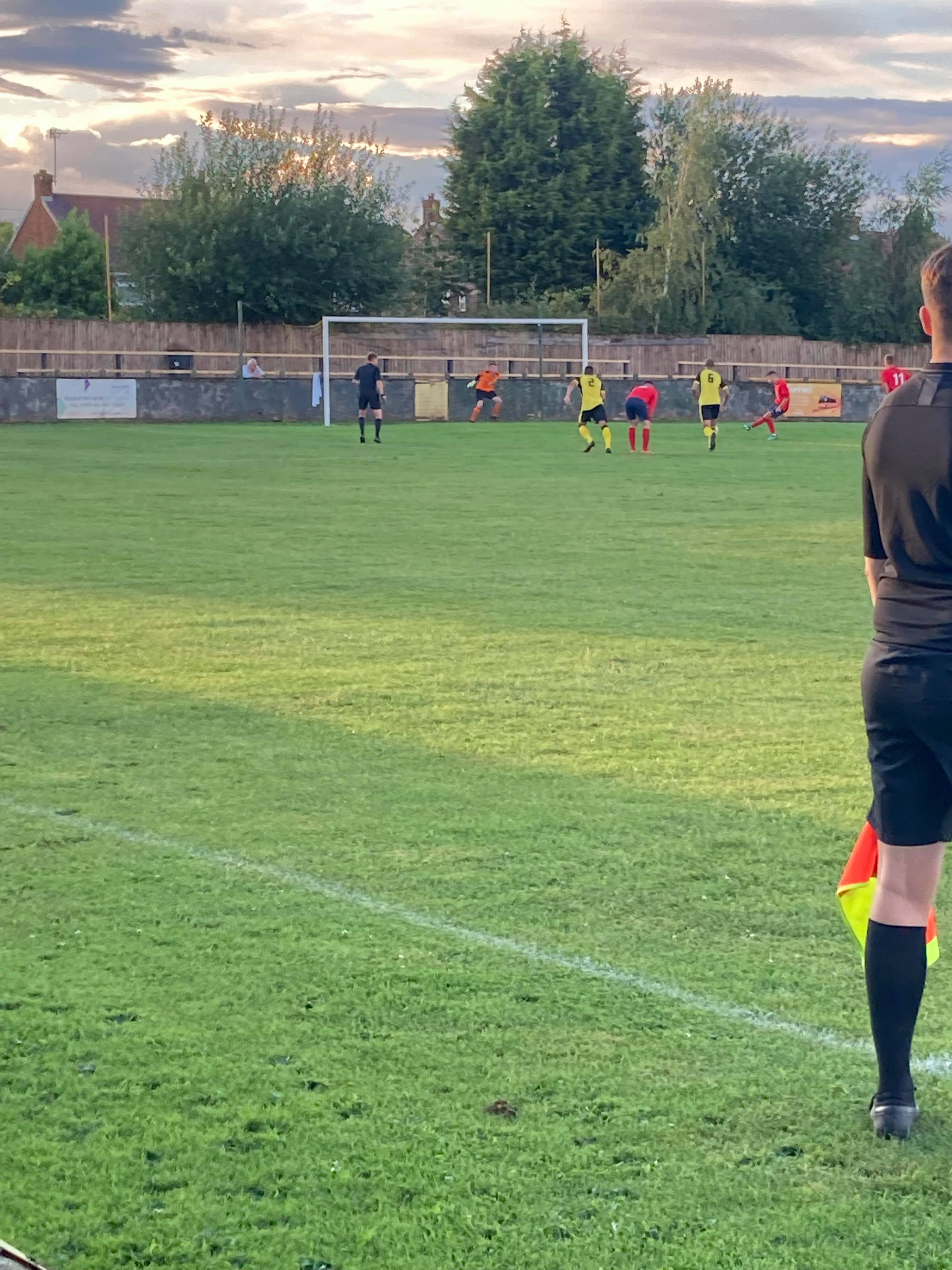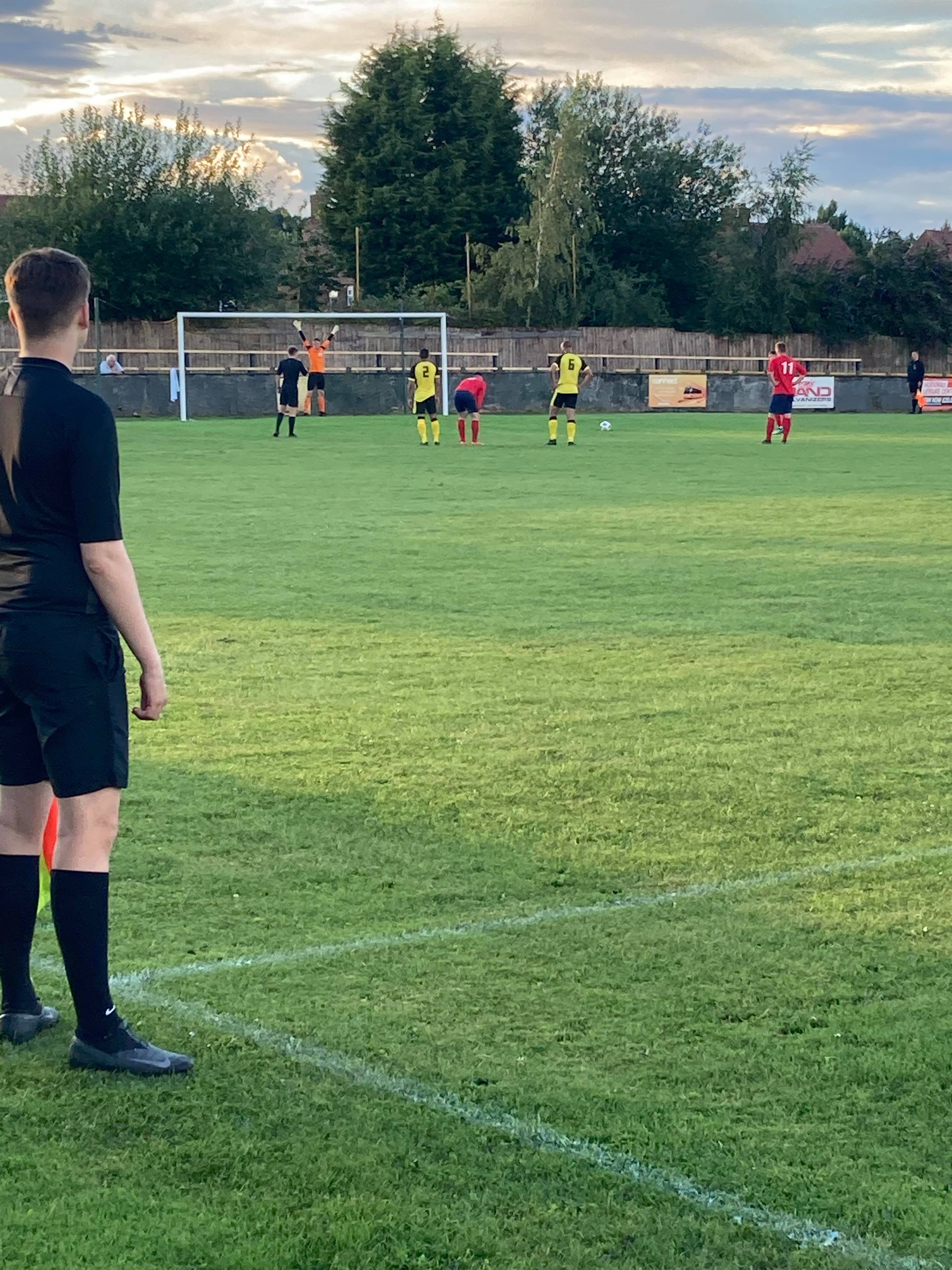 21 minutes on the clock and Hucknall have a corner, in it comes… Number 6 with the header… It’s over. 22nd minute and Sandiacre come forward, a through ball finds number 11 and he’s in… He’s brought down… “Penalty!” Says the Referee! Definitely a foul in my opinion. It’s number 10 to take for Sandiacre and… He scores!!! 3-2!! Game on!!