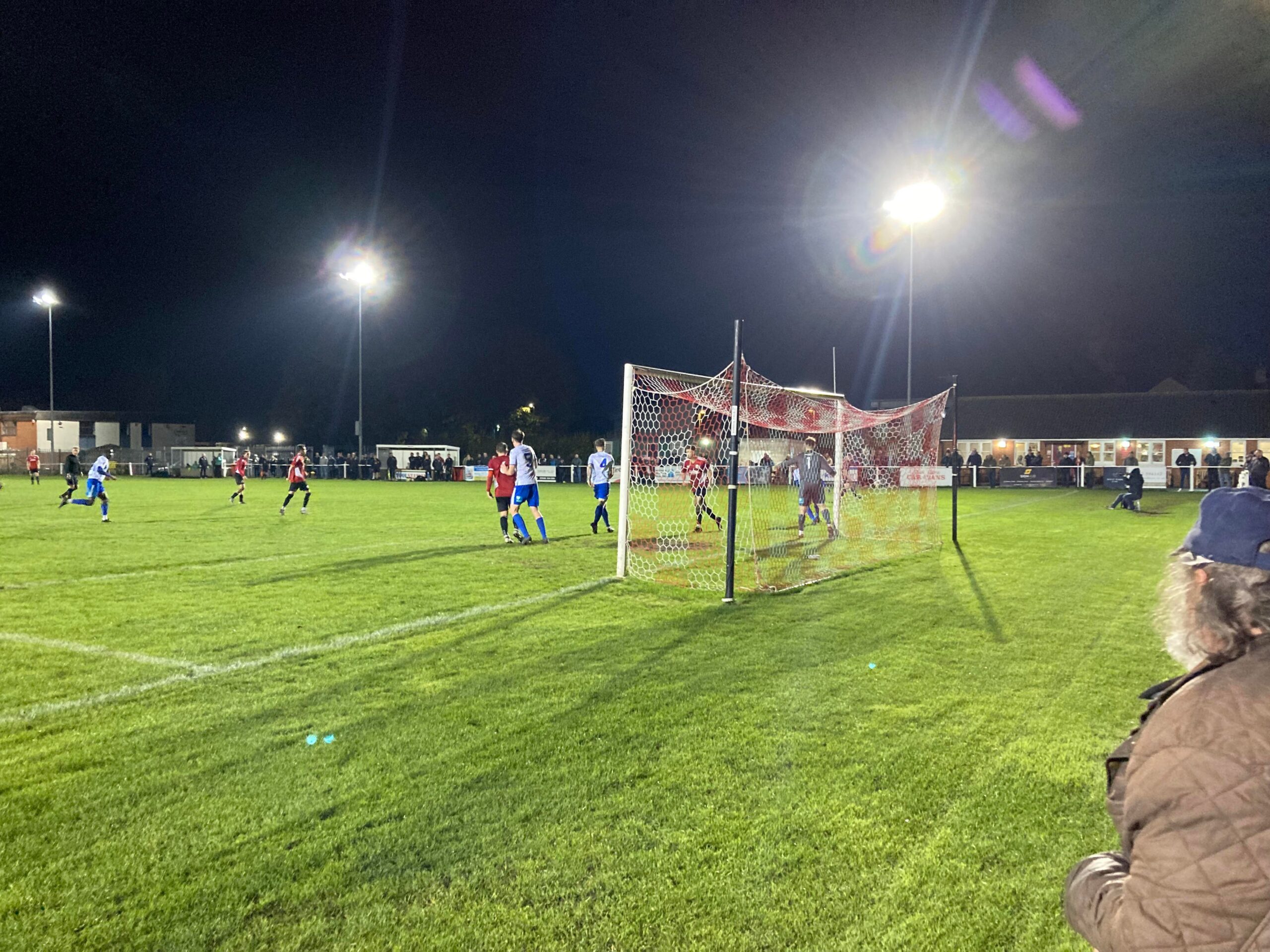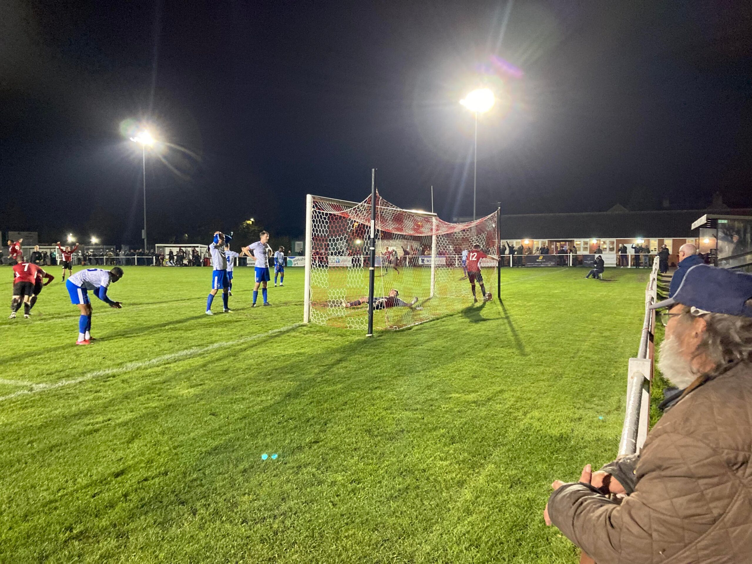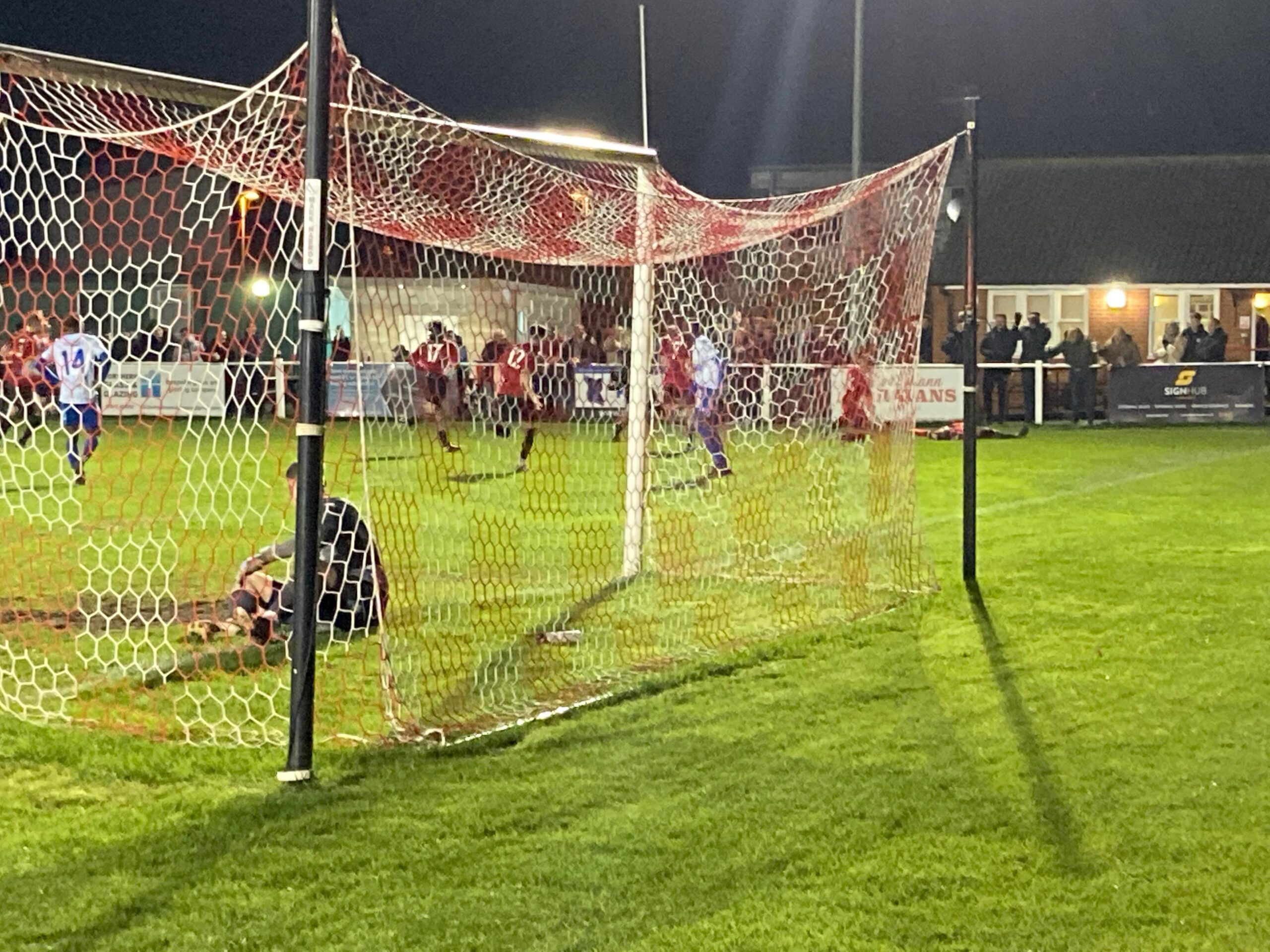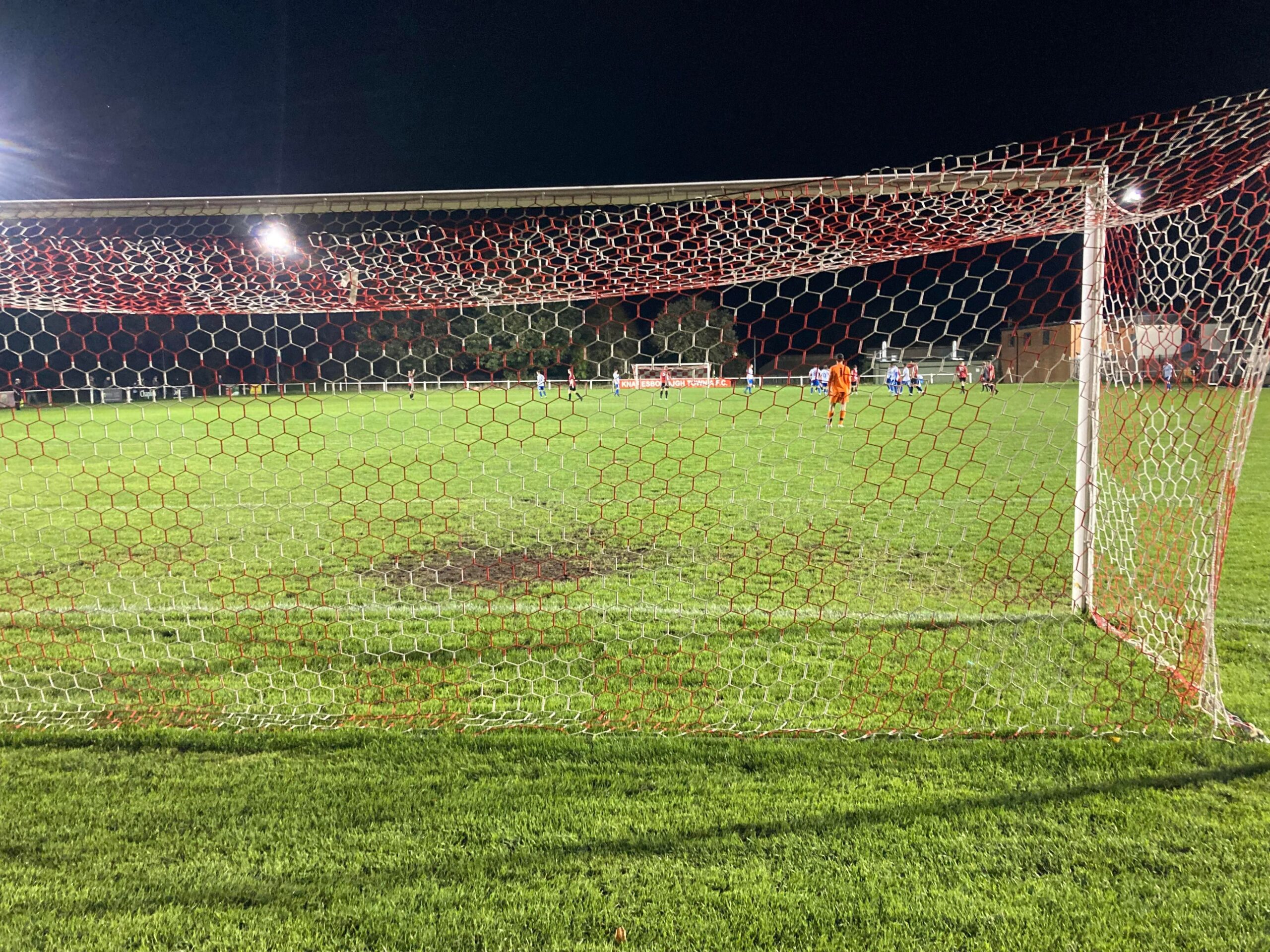 3 minutes later and Knaresborough have a free kick in the Golcar half, it’s lumped into the box, Ben Parkes slides for it and gets there… Yes! Wait no it’s the side netting… It certainly looked in from here!