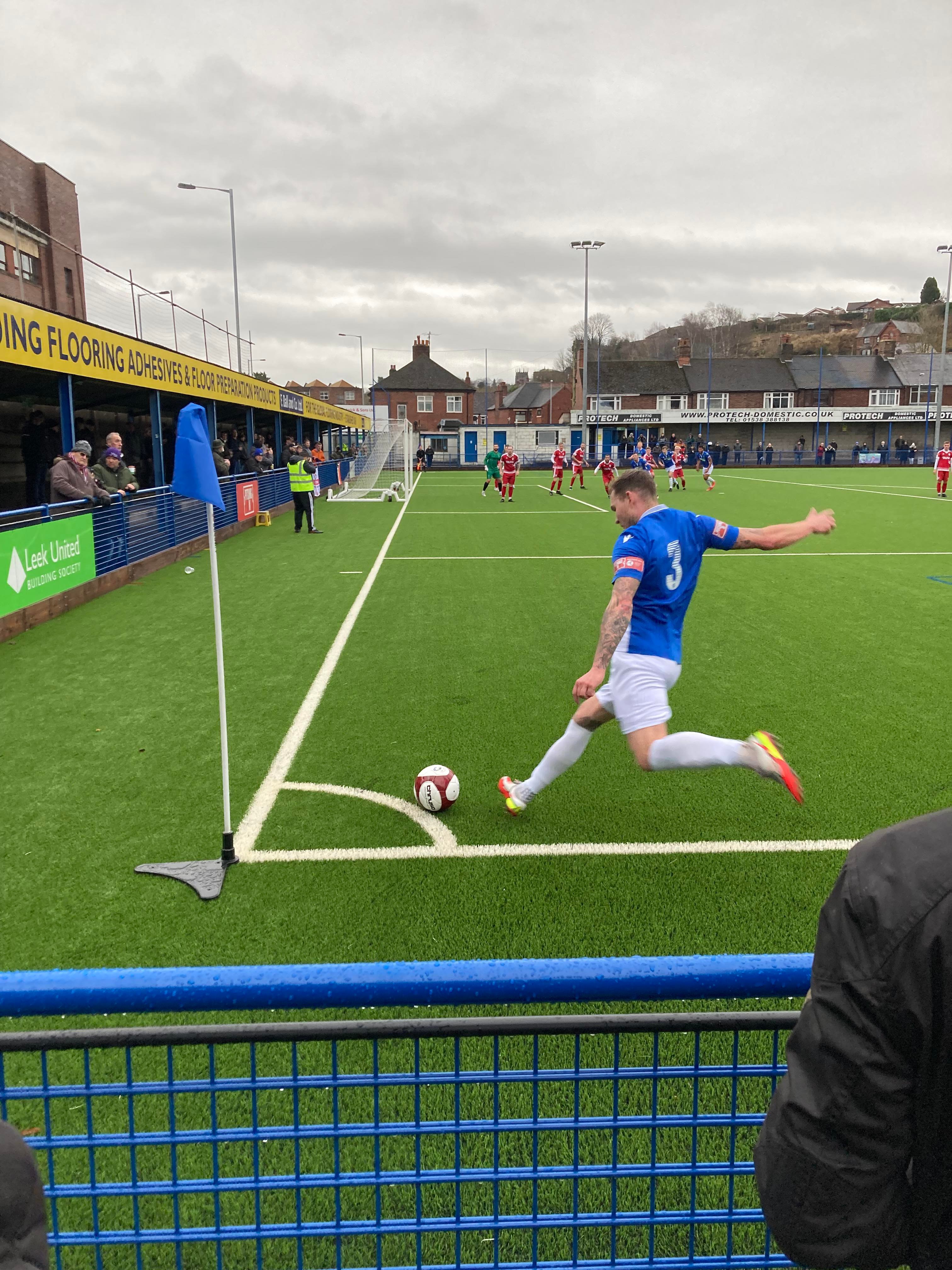 24 minutes on the clock and Leek have a corner, in it comes… Cleared for another, in comes the 2nd corner… It’s headed away and Colne break forward… Leek dispossess them and come forward once again, it’s played to number 9, he plays it to number 7, he beats his man and he goes for the curler from 25 yards… Oh brilliant! OHHHH BRILLIANT!!!! A great strike and Leek lead here!! “We are Leek! We are Leek! We are Leek!!”