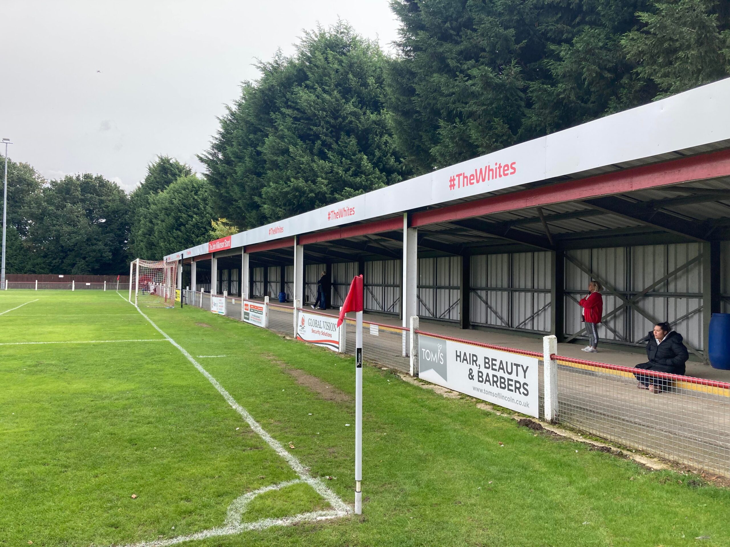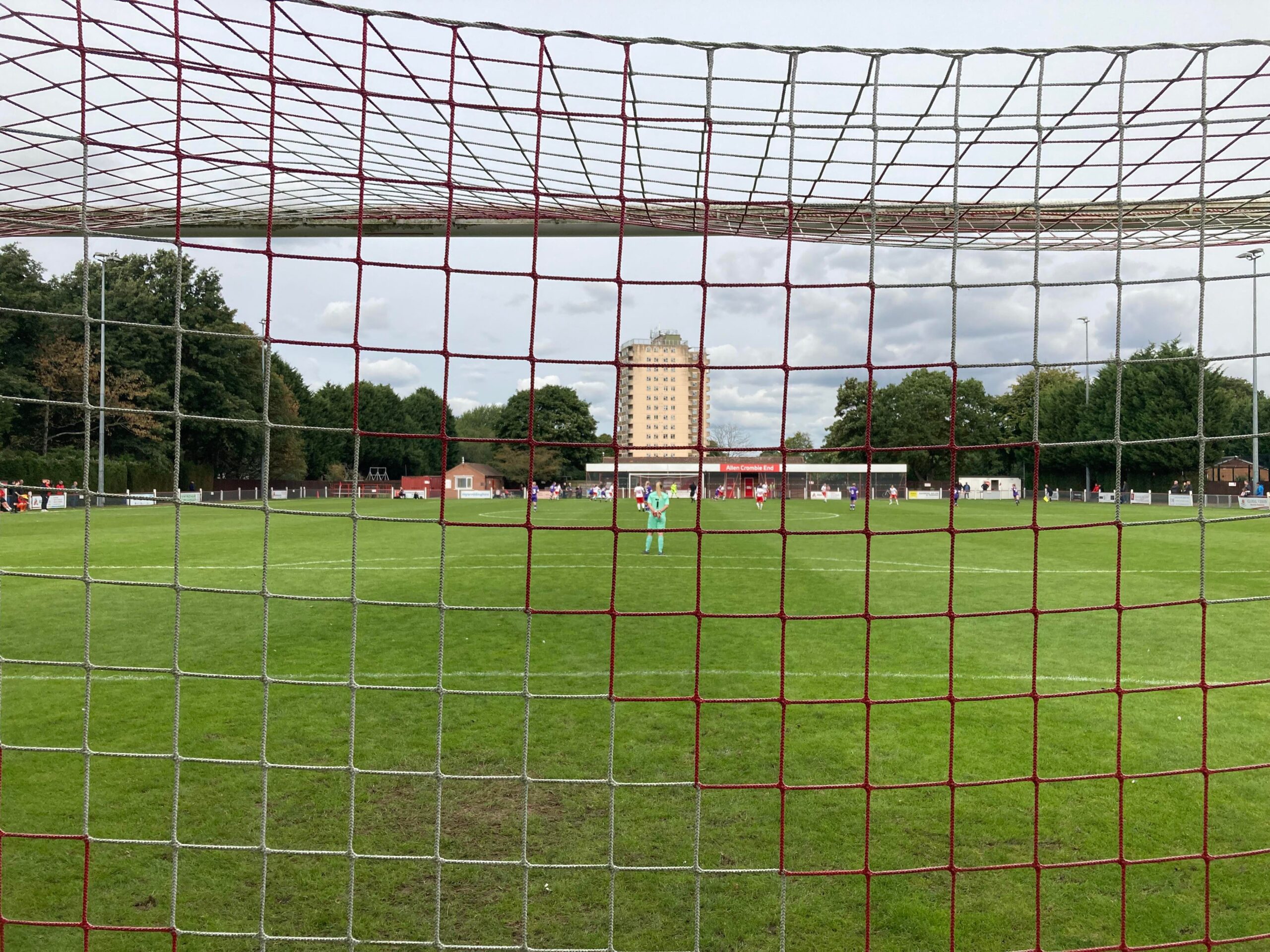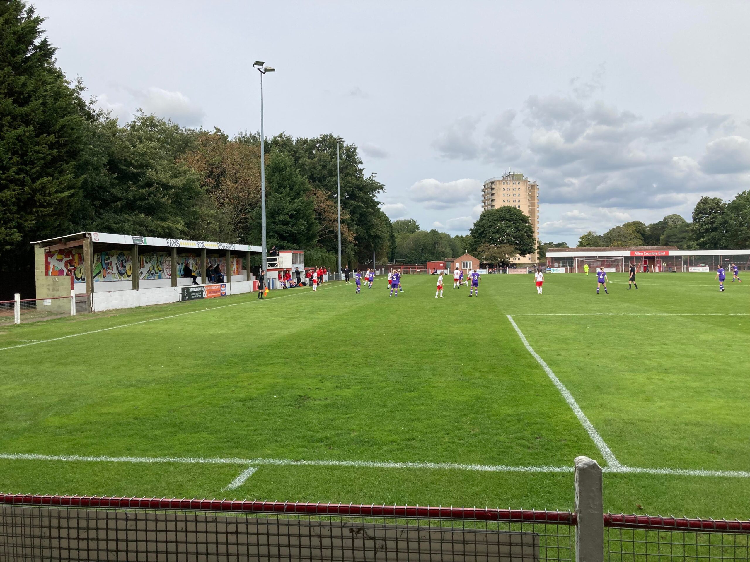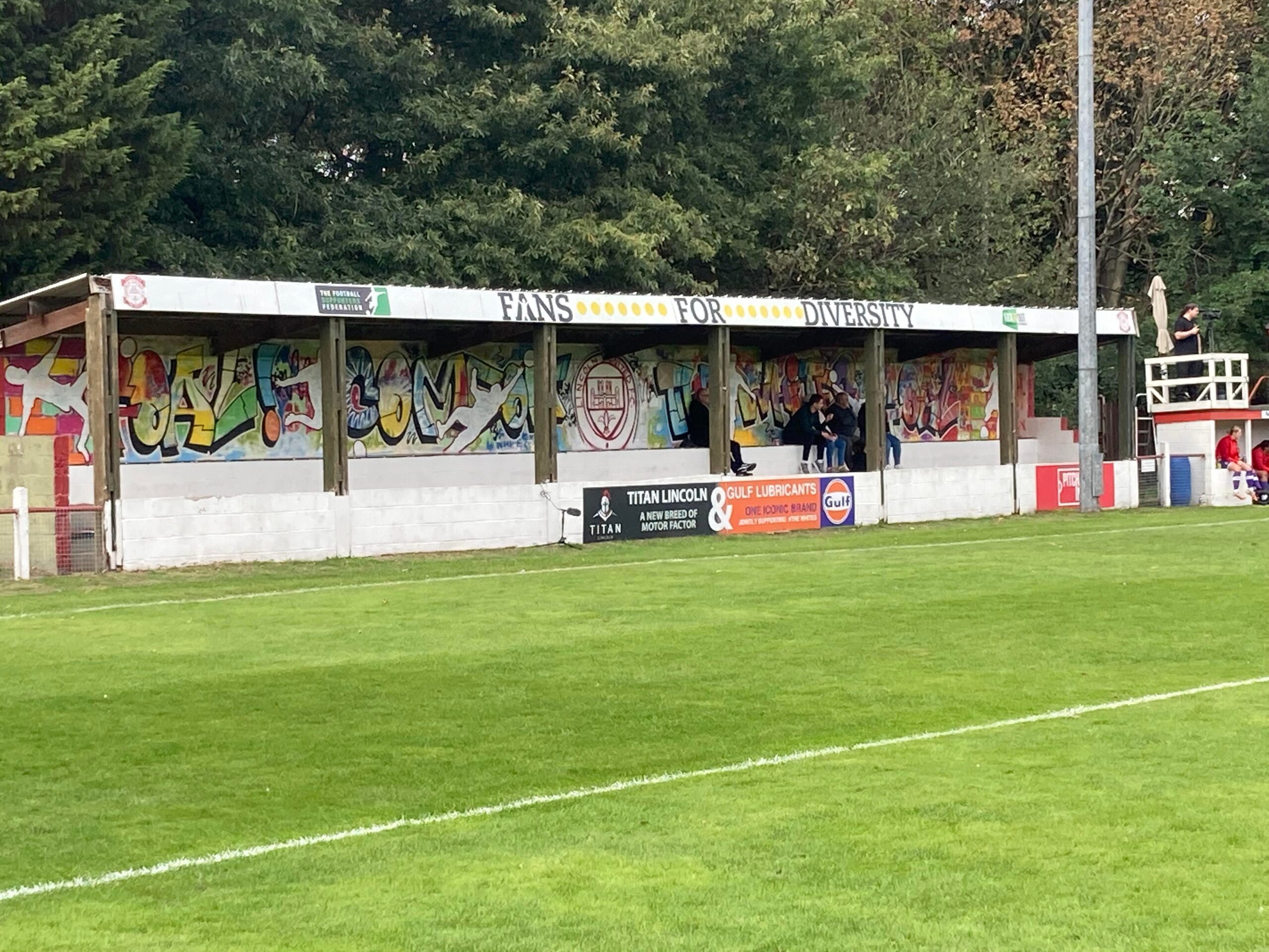 - The Ground: 9/10 – This is a fantastic ground! Stands at all angles with a good view of the block of flats from the far end! Trees along the far side and the artwork in the one stand is sensational!! I think this could be a National League North ground!!