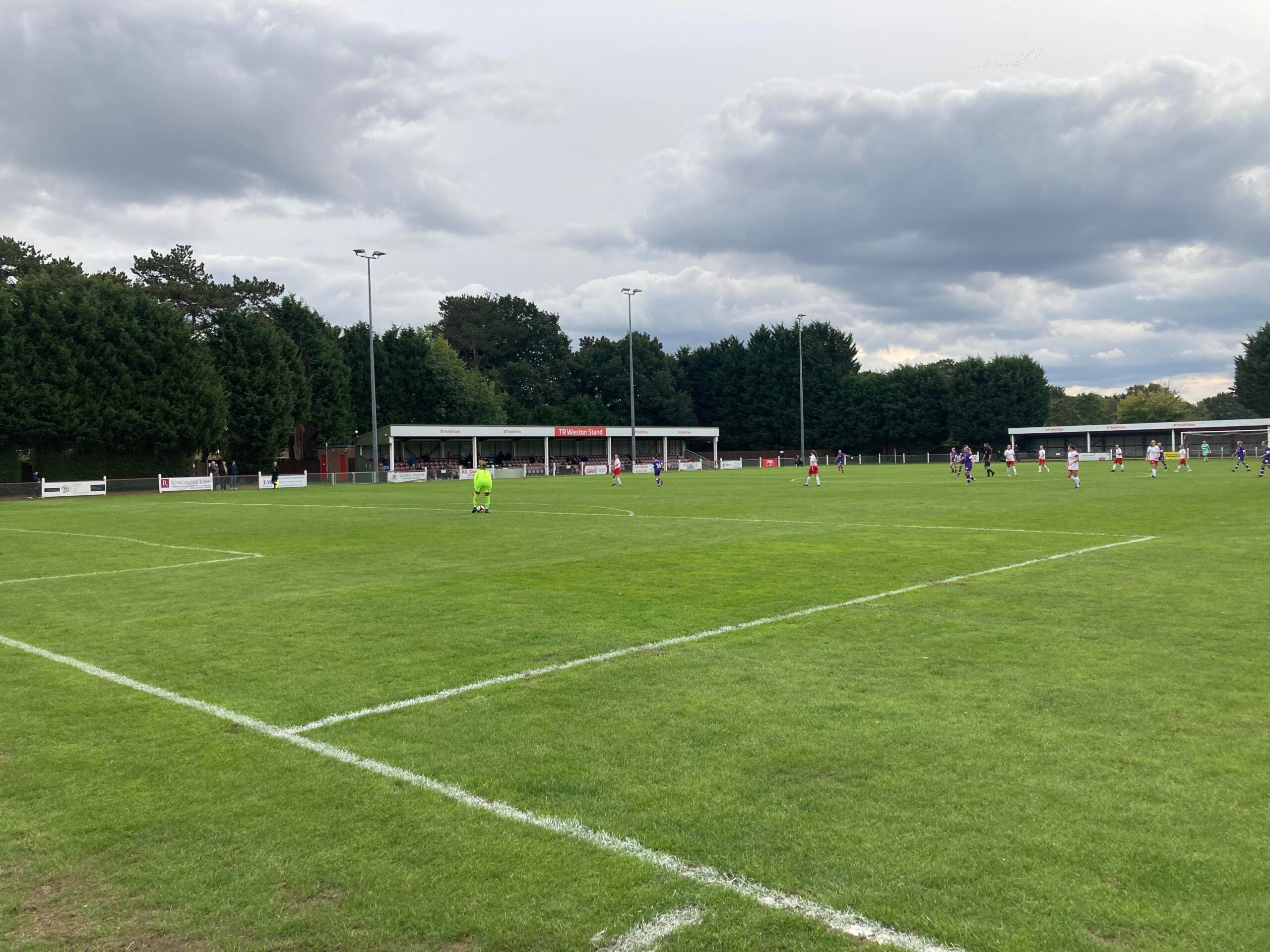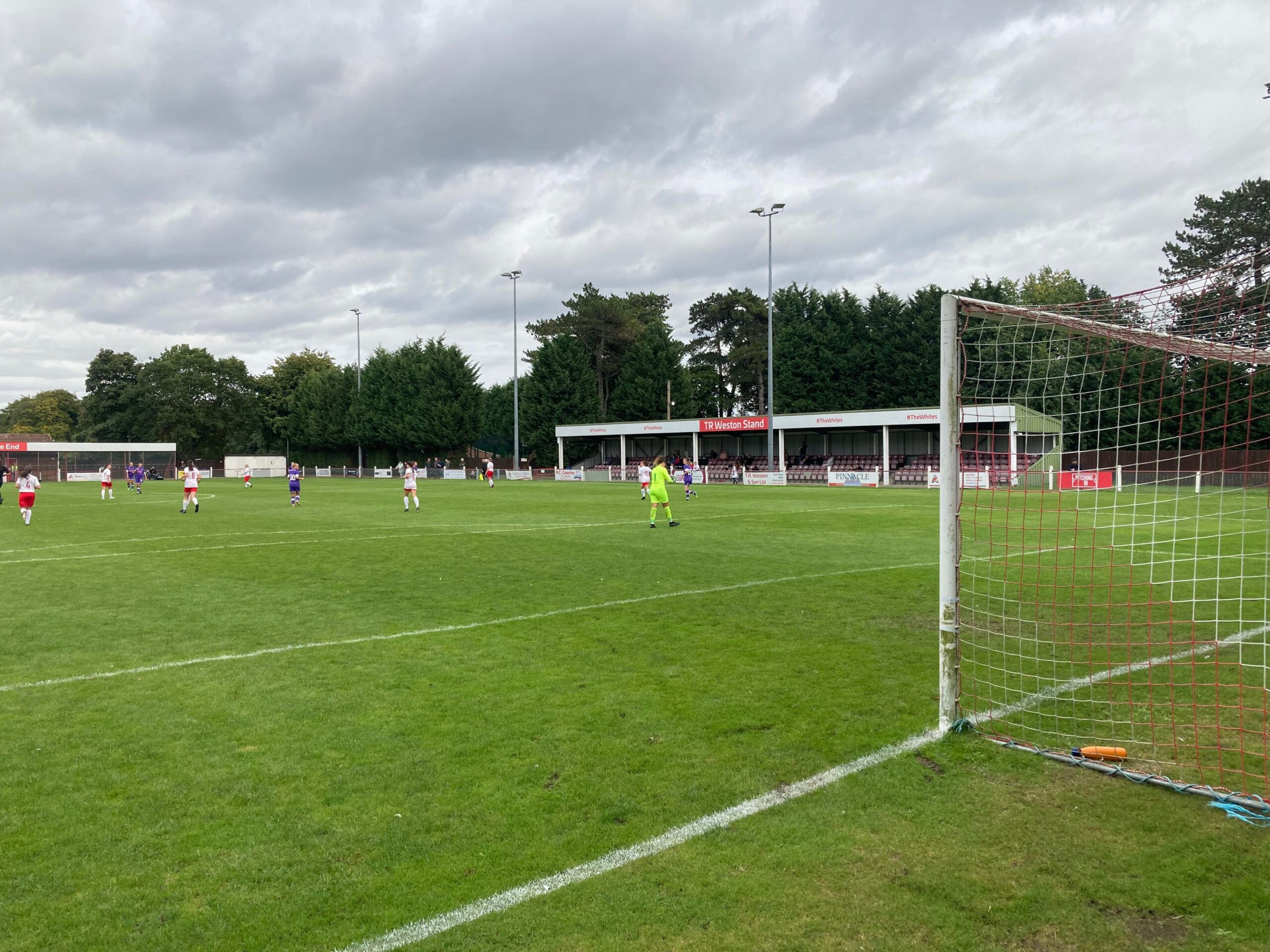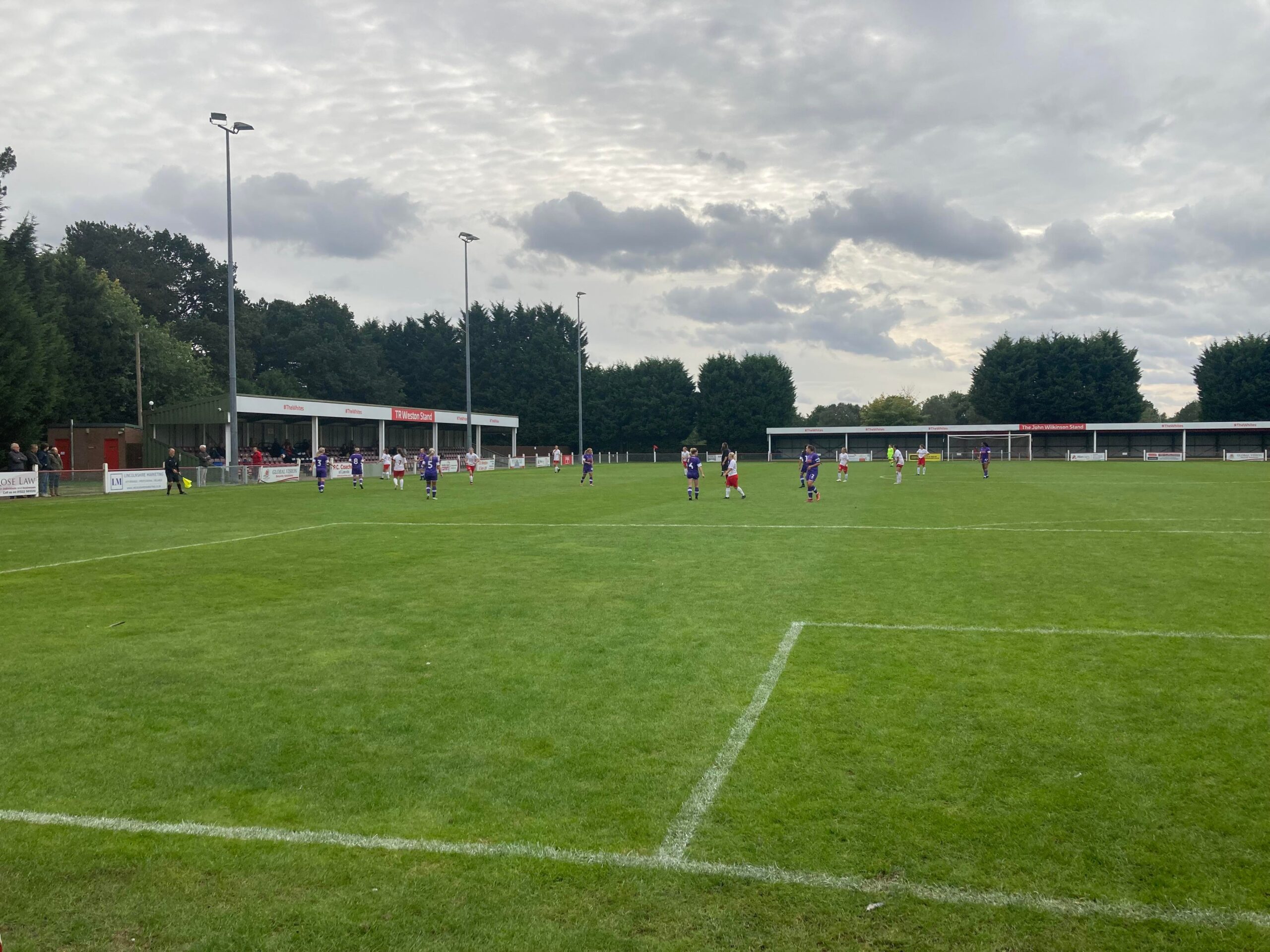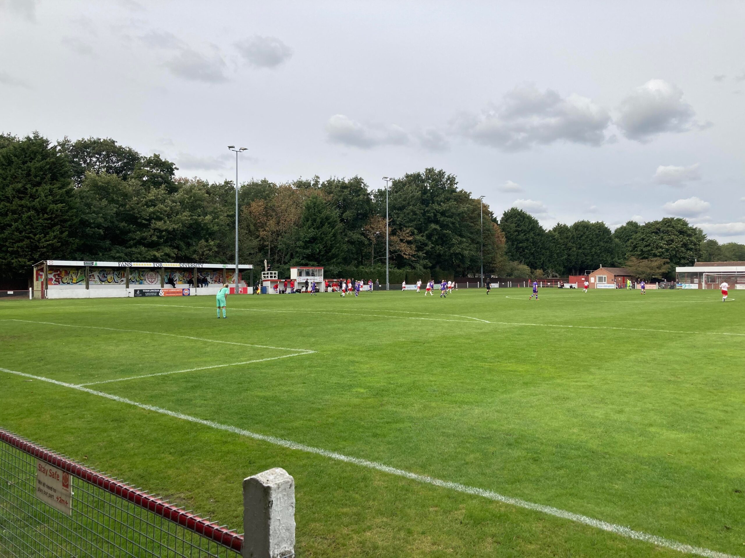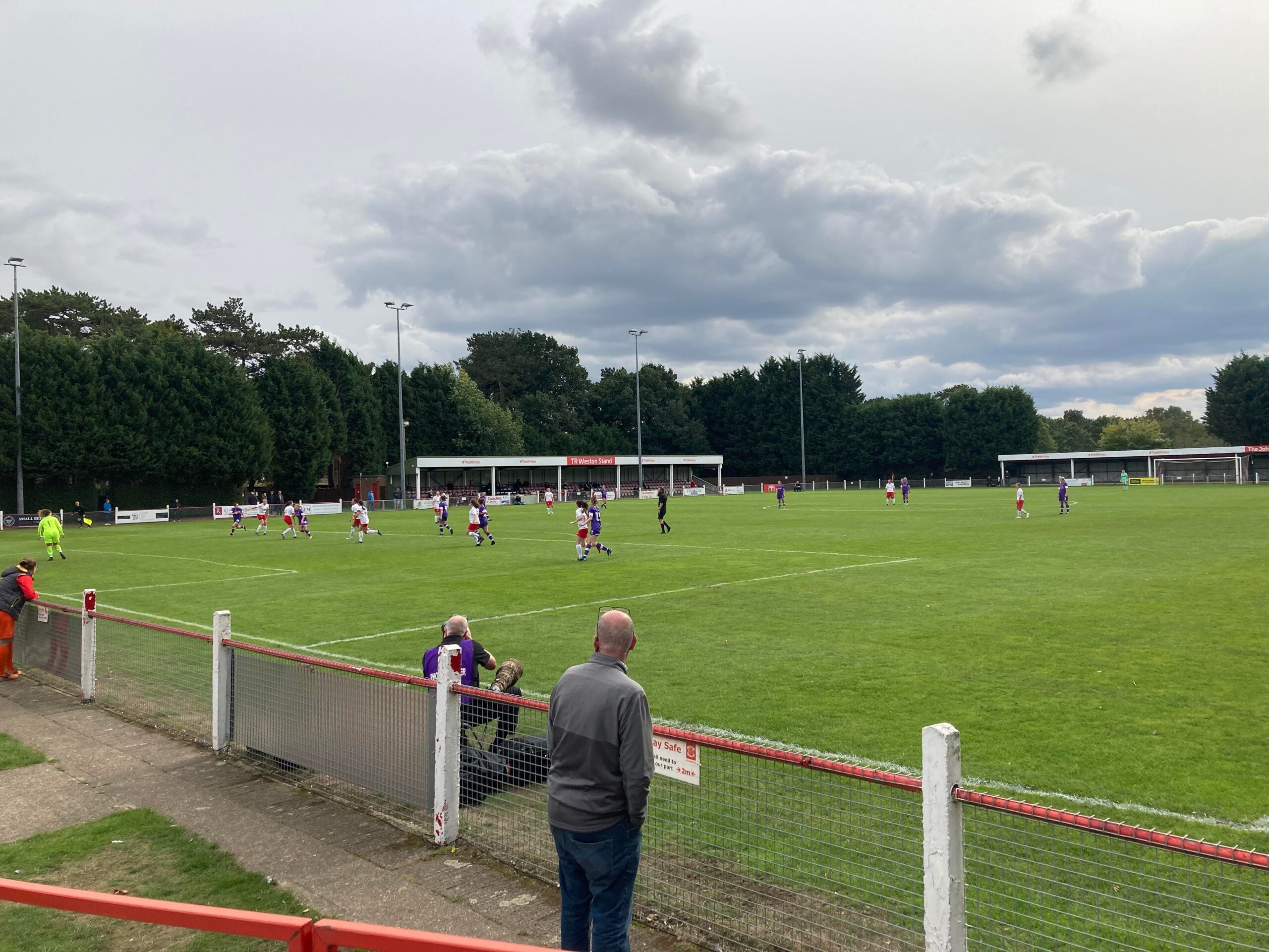 - The Ground: 9/10 – This is a fantastic ground! Stands at all angles with a good view of the block of flats from the far end! Trees along the far side and the artwork in the one stand is sensational!! I think this could be a National League North ground!!