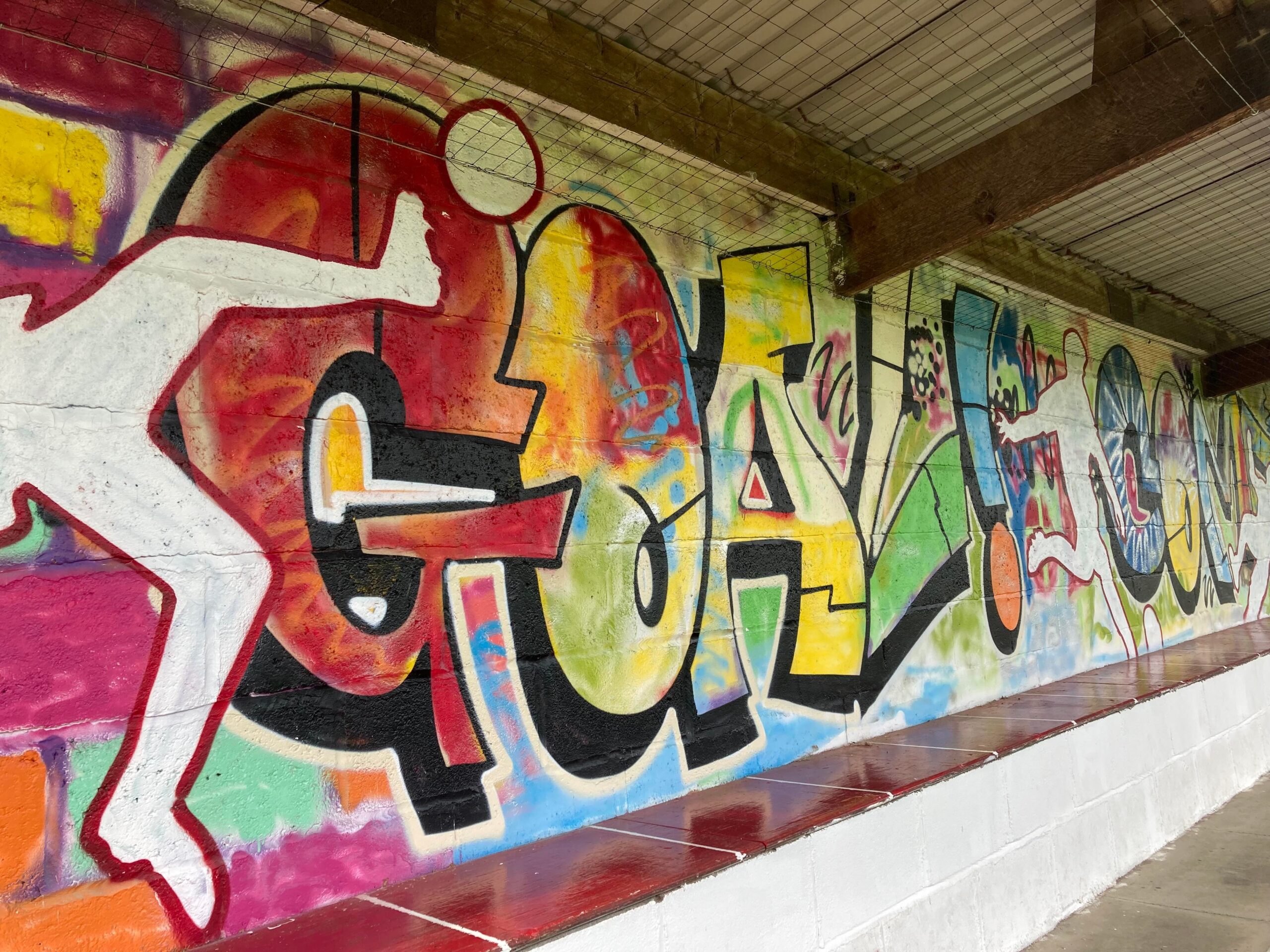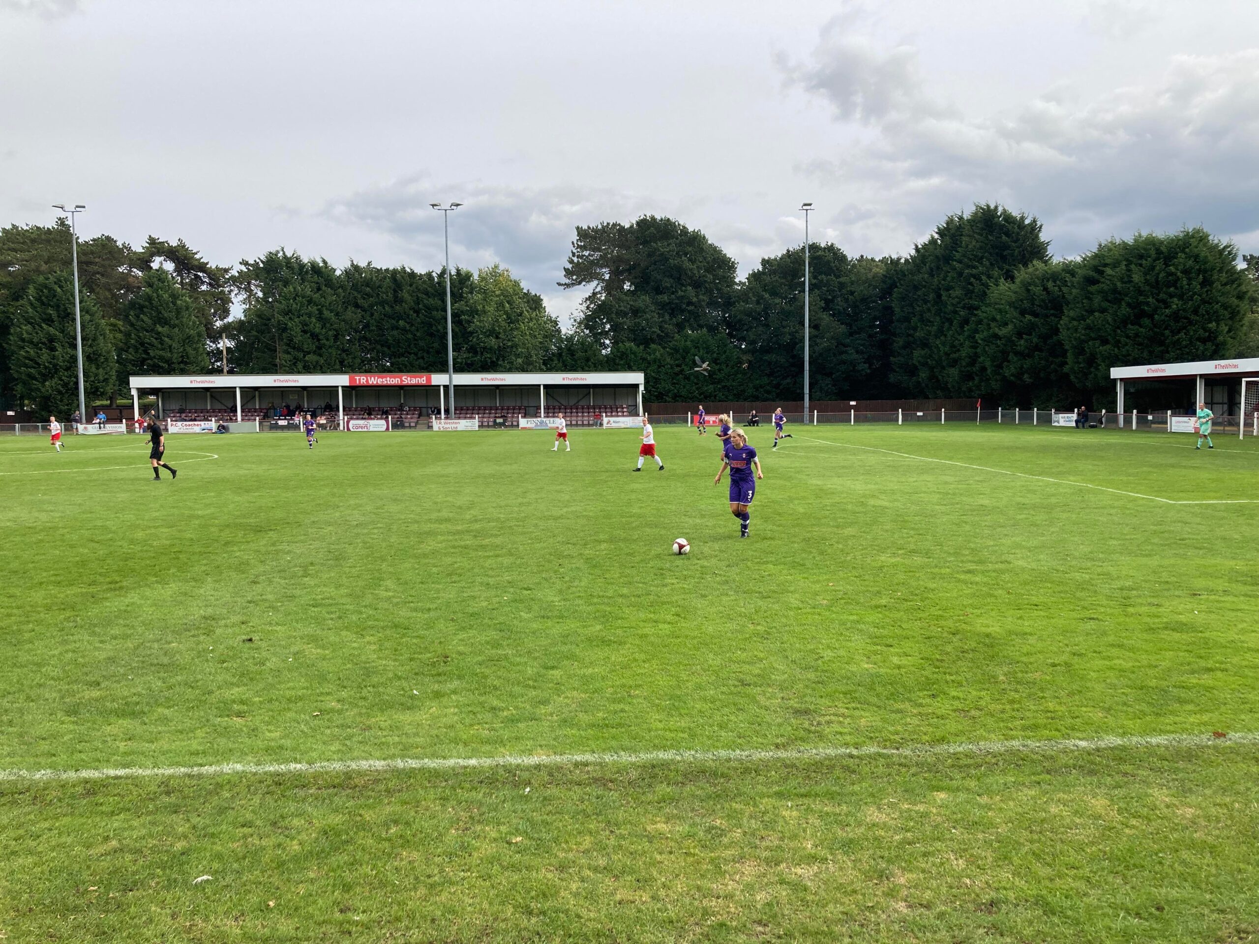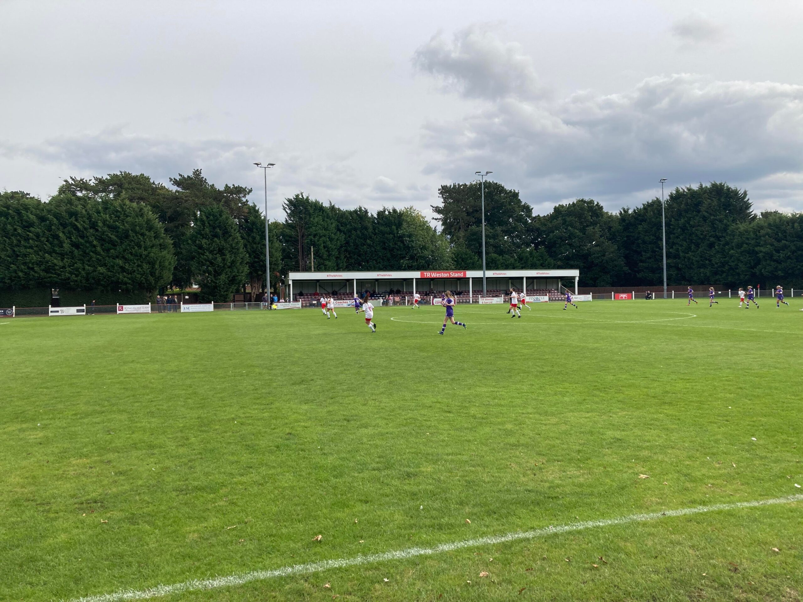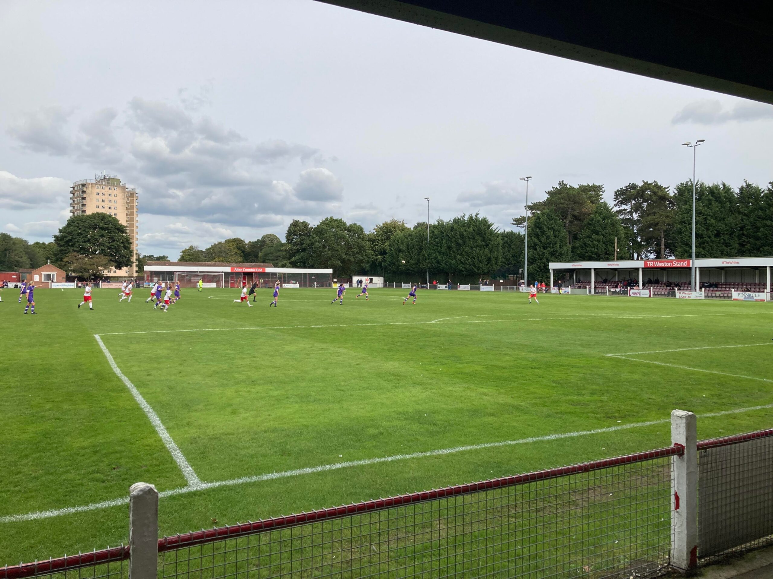 - The Ground: 9/10 – This is a fantastic ground! Stands at all angles with a good view of the block of flats from the far end! Trees along the far side and the artwork in the one stand is sensational!! I think this could be a National League North ground!!