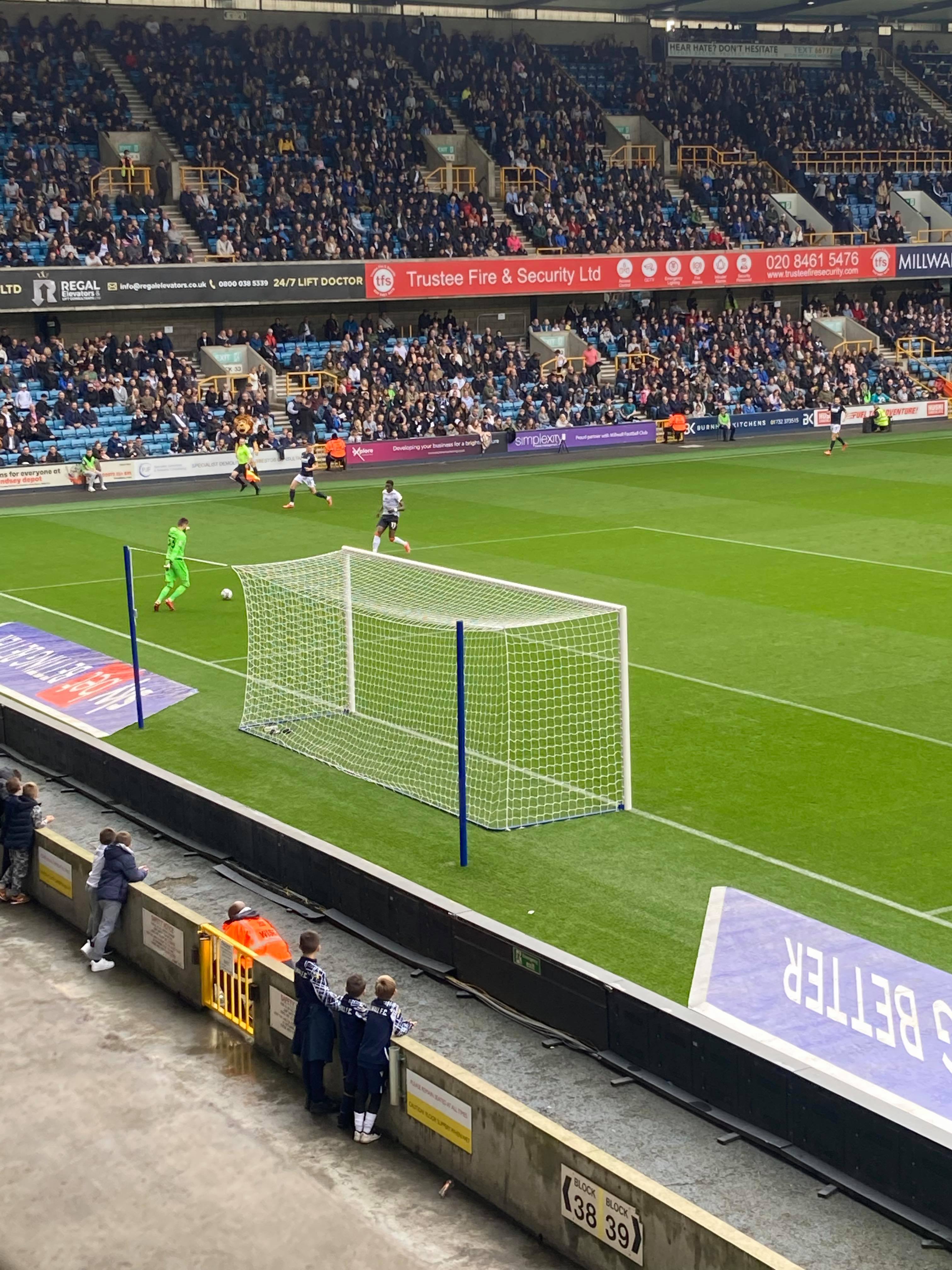 Kick Off! “No one likes us! NO ONE LIKES US! No one likes us! We don’t care! We are Millwall Super Millwall! We are Millwall from the Den!” There it is, that famous chant!! 9 minutes in and Millwall come forward, the ball is played through to Jed Wallace who runs into the box on the left side, he shoots… Keeper saves.