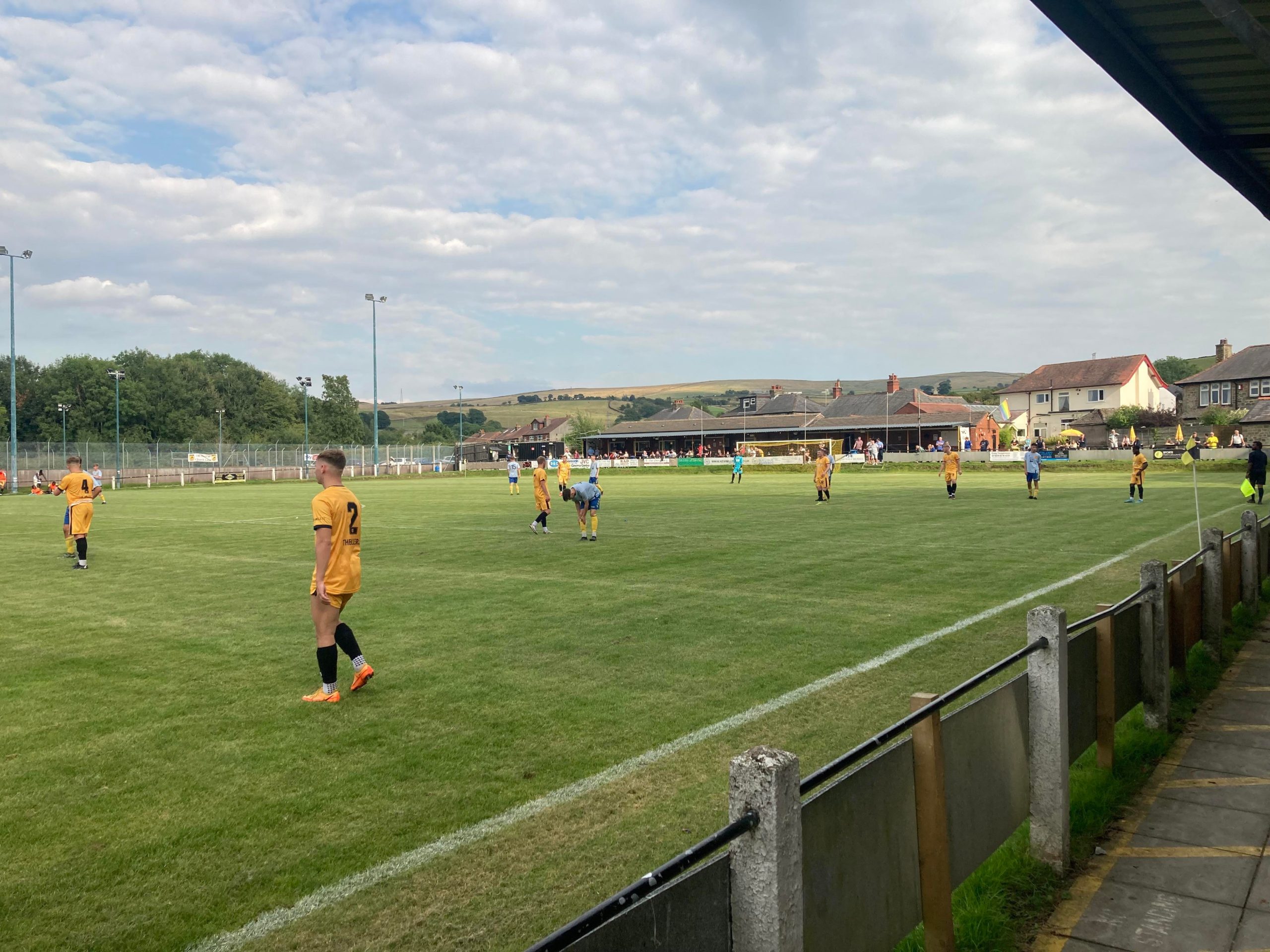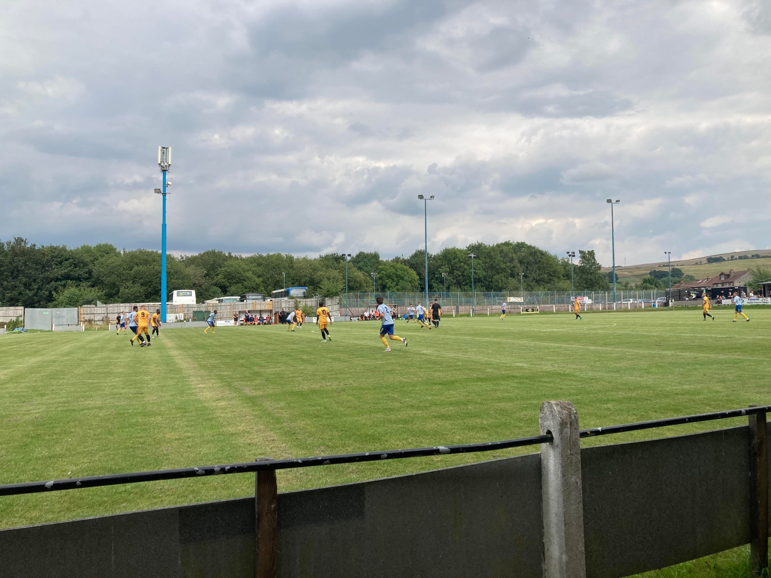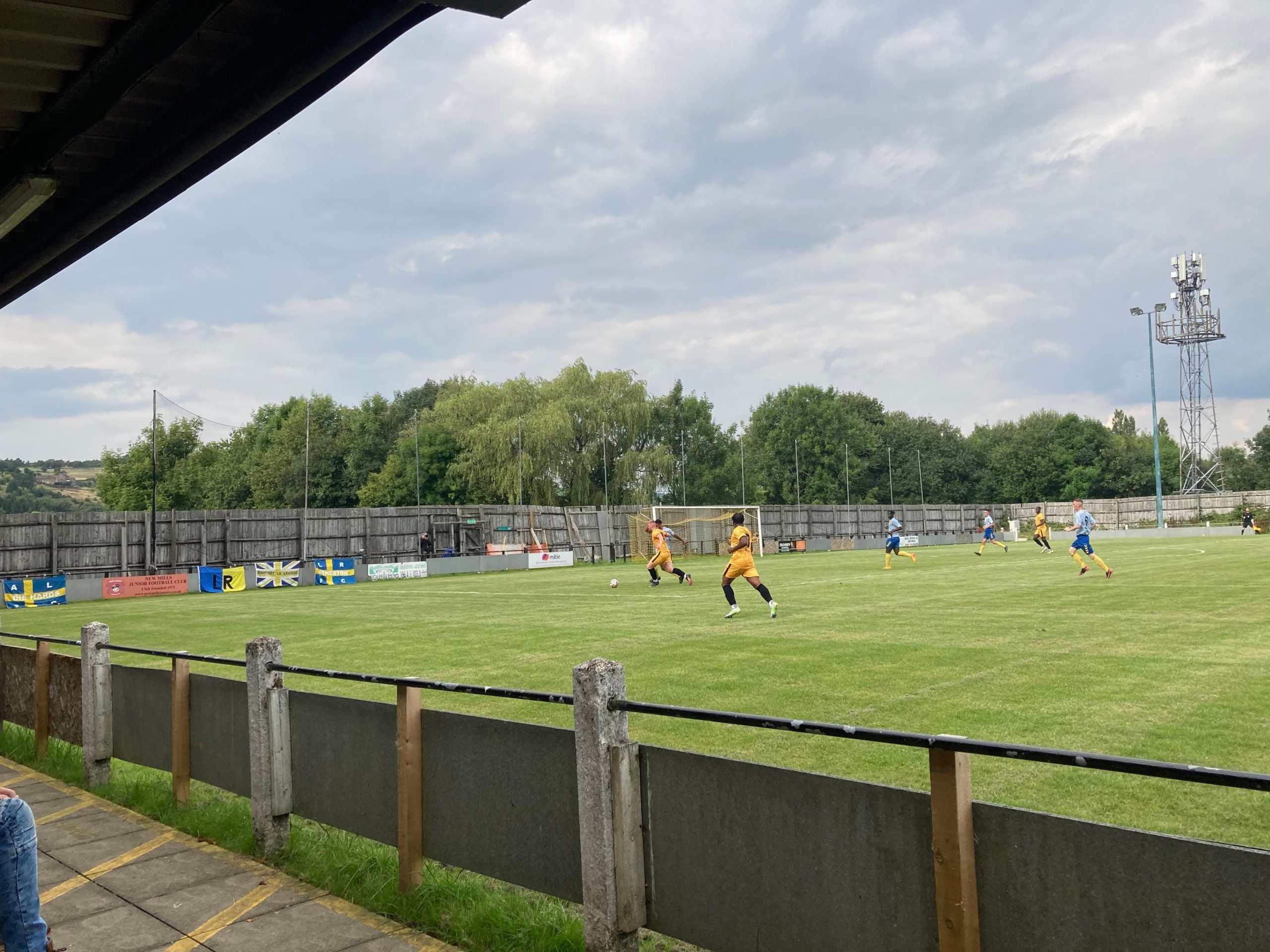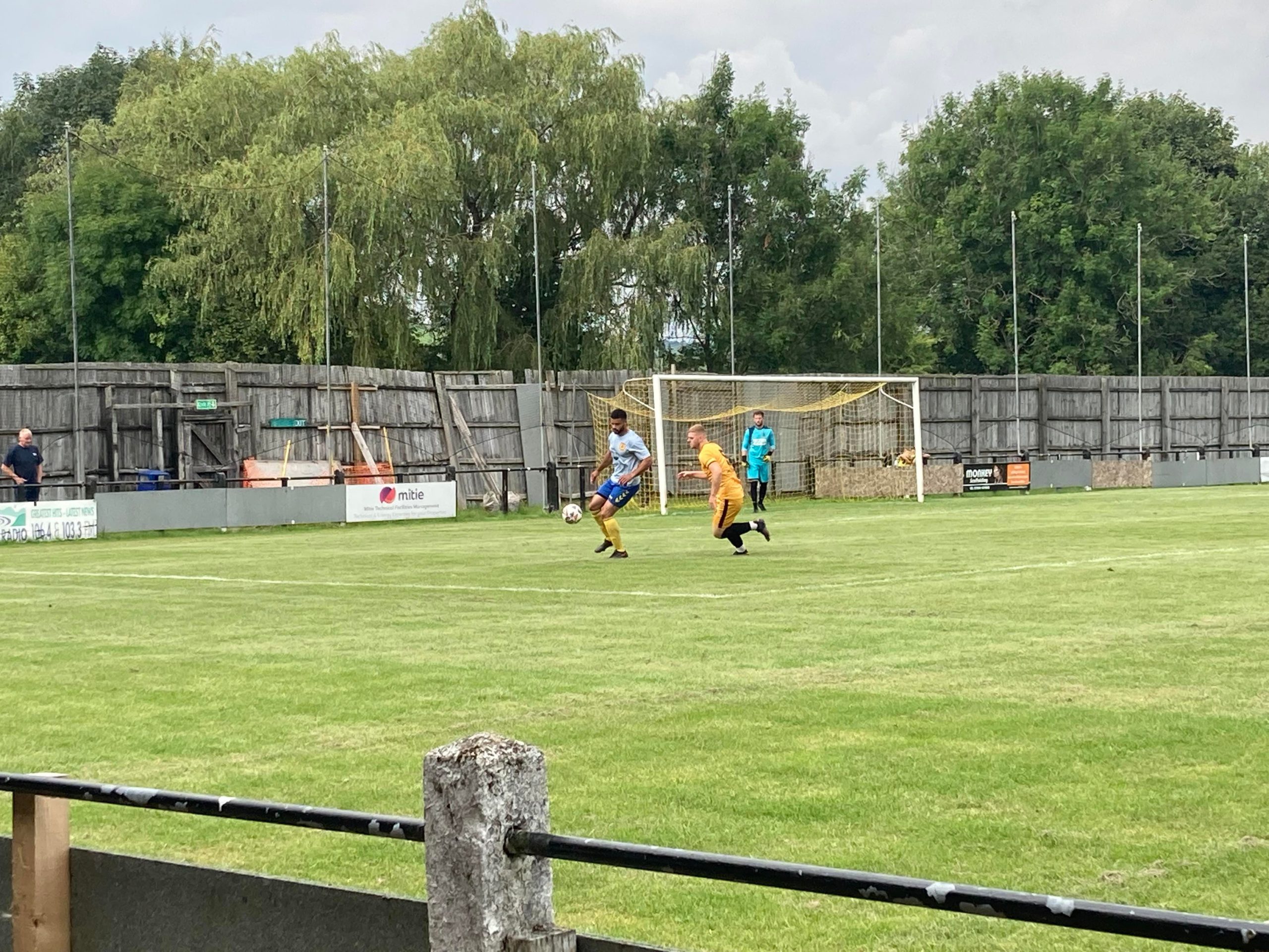 10 minutes in and Atherton come forward, Lewis Rawsthorn is through on goal here with 2 defenders behind him… The New Mills defender gets a touch on the ball and the shot is comfortably saved by the keeper.