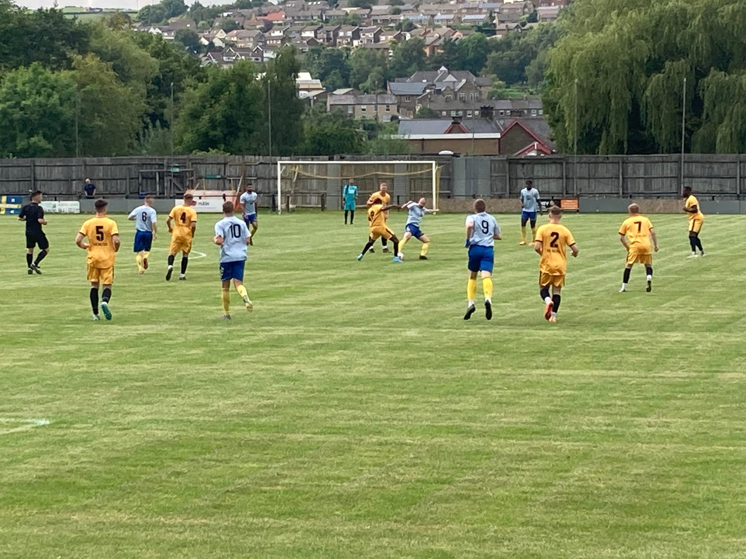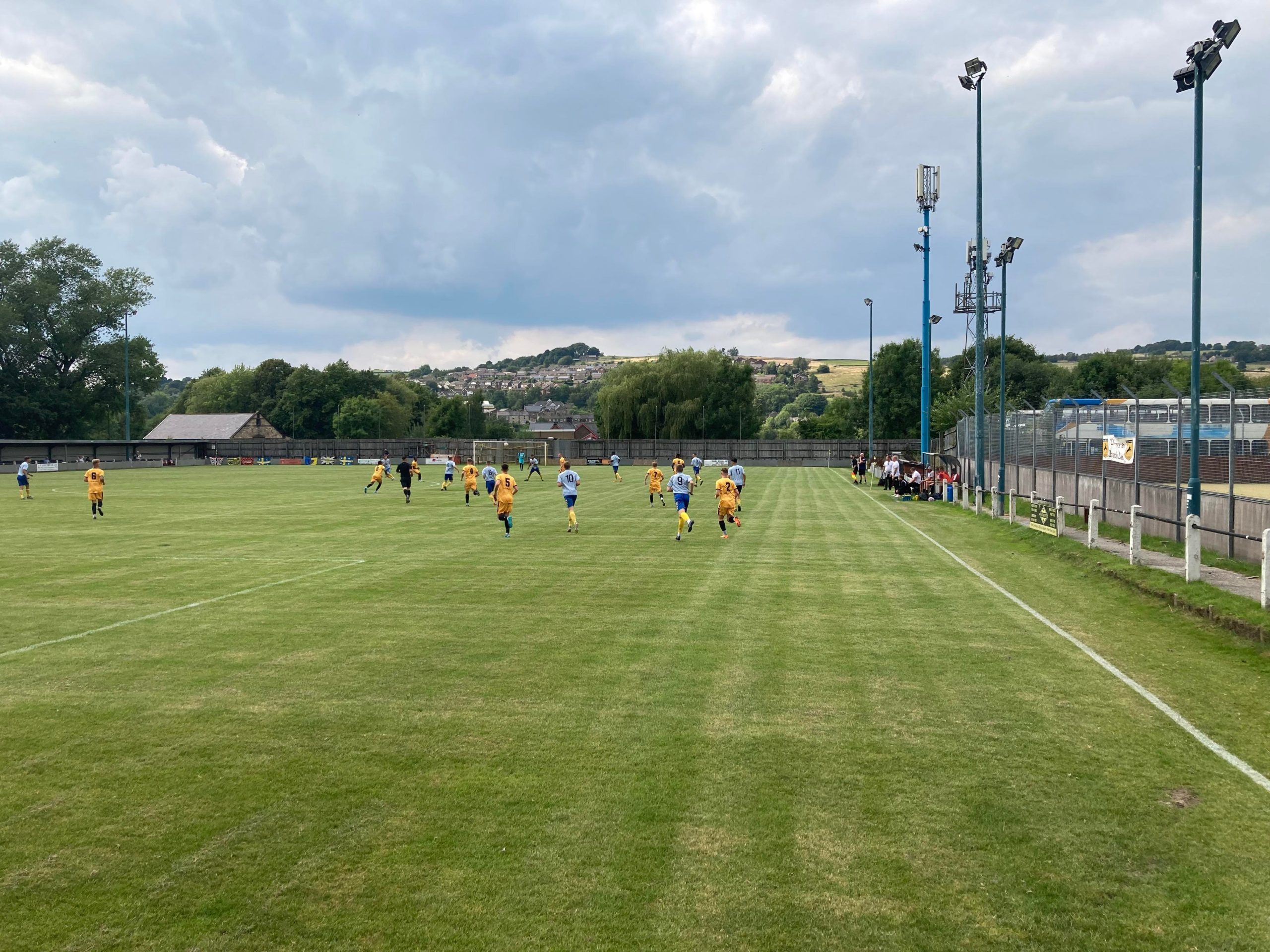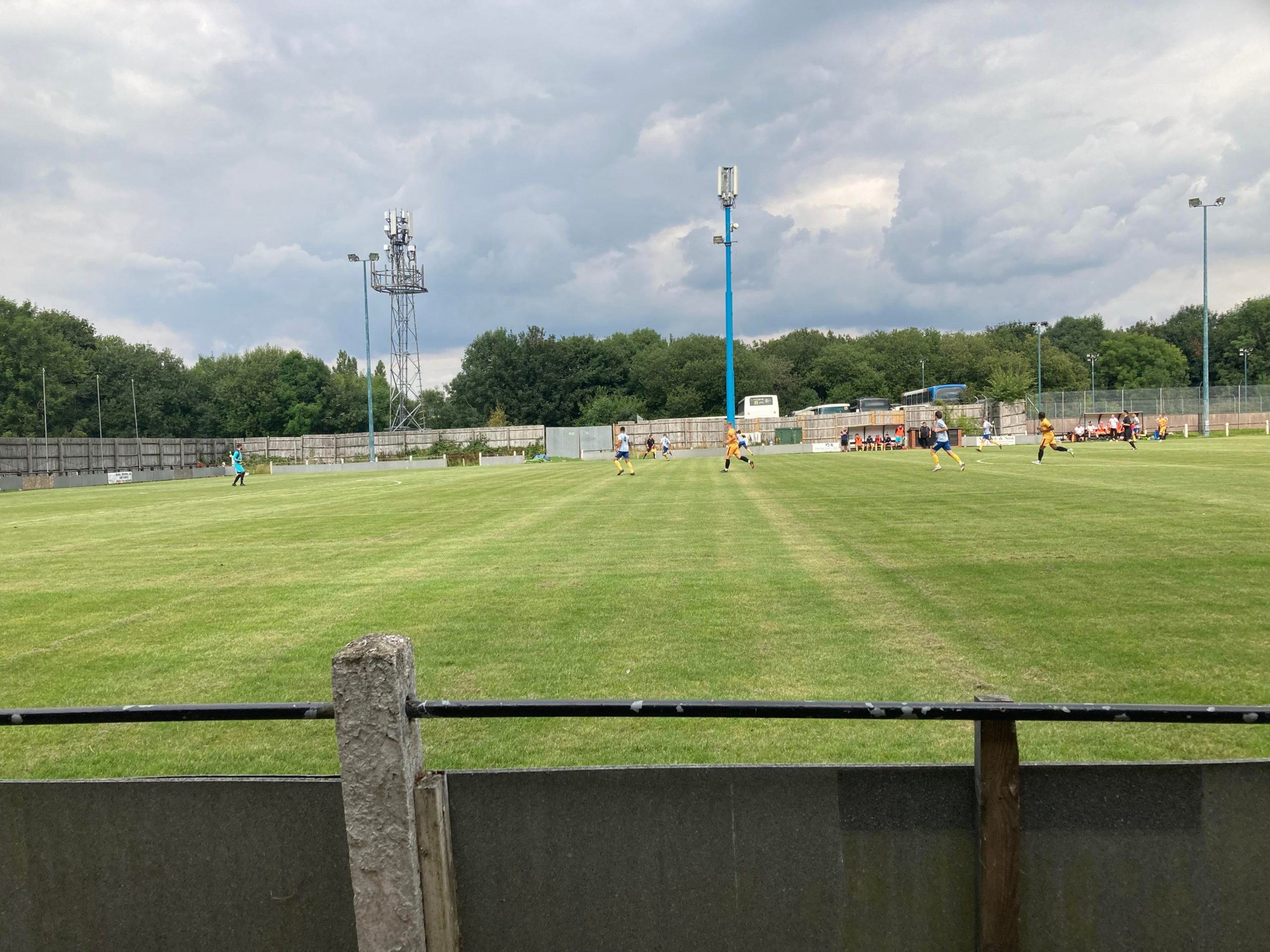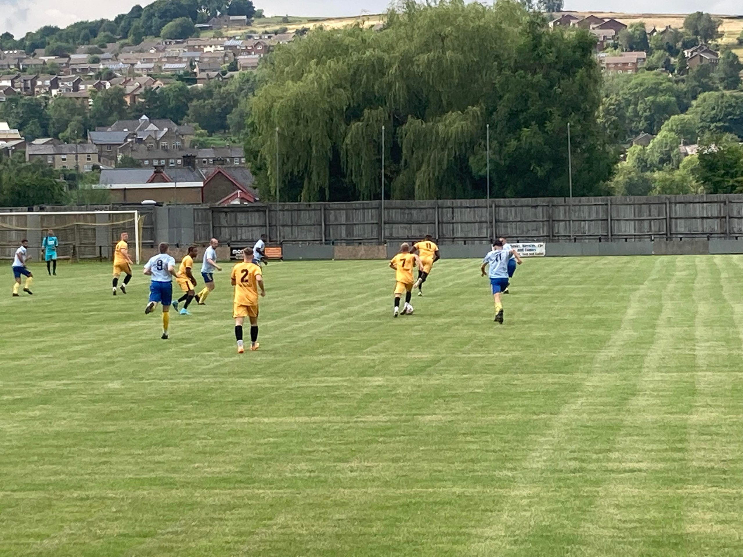 10 minutes in and Atherton come forward, Lewis Rawsthorn is through on goal here with 2 defenders behind him… The New Mills defender gets a touch on the ball and the shot is comfortably saved by the keeper.