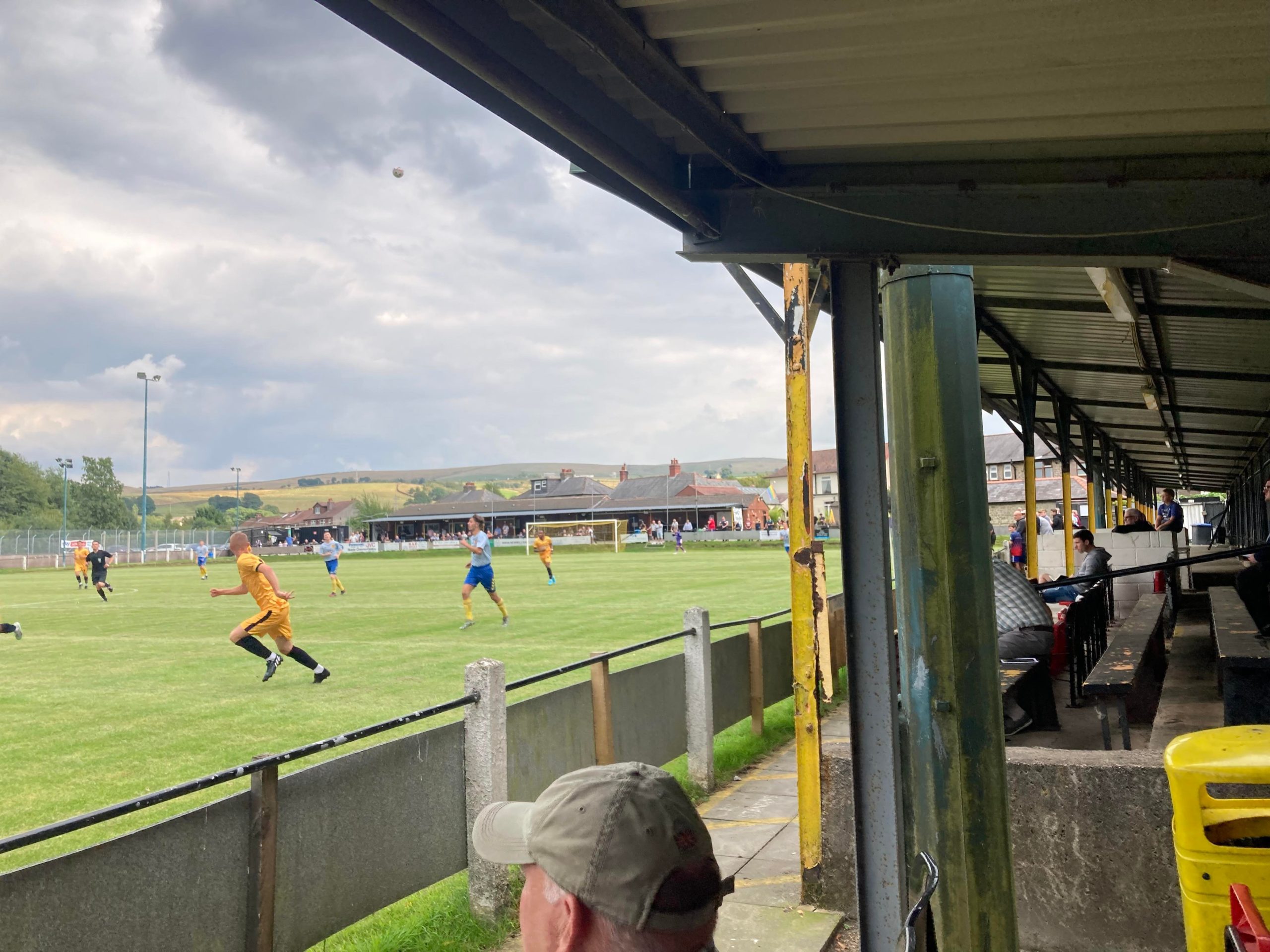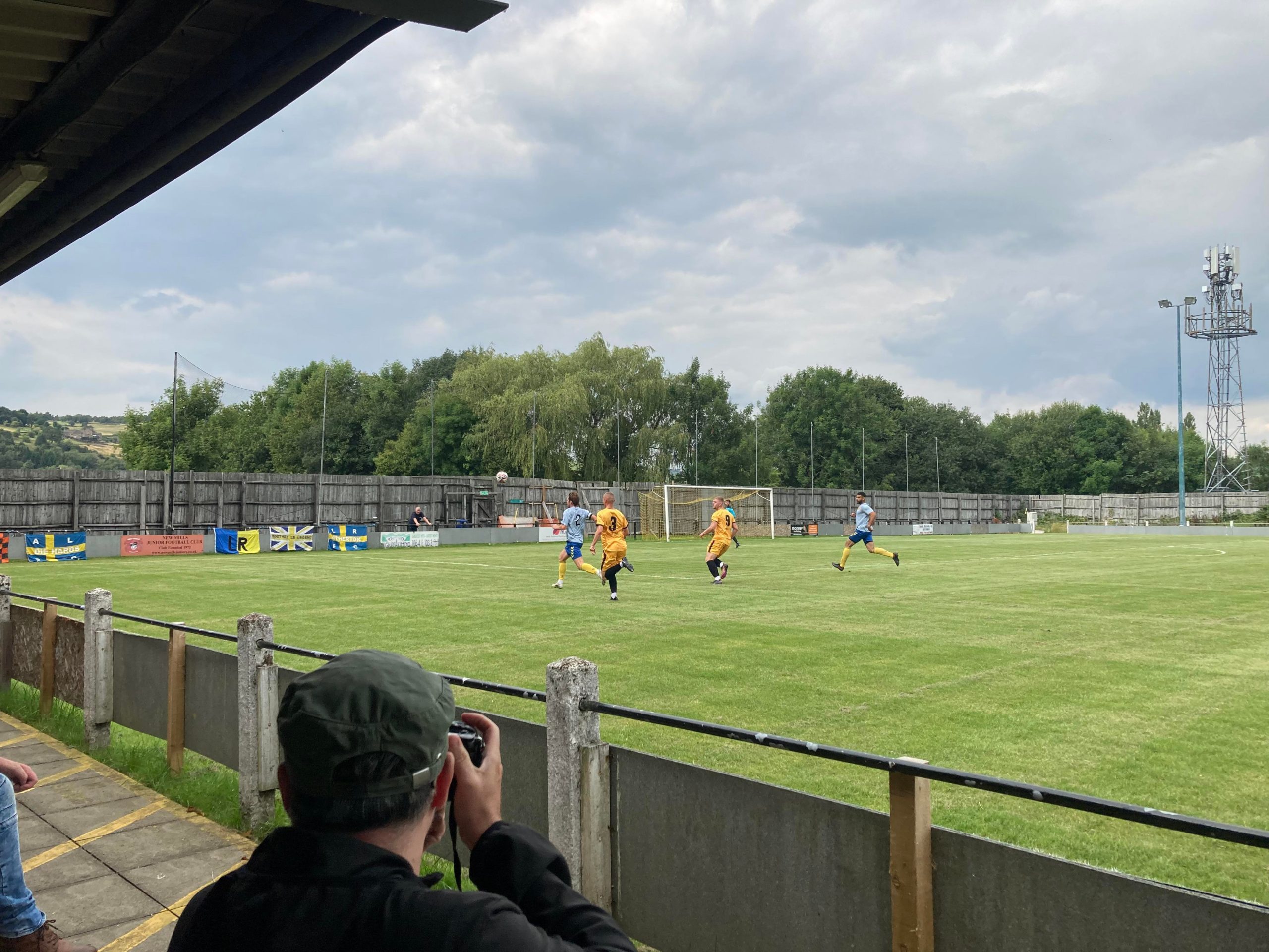 75th minute and New Mills play forward, the ball is played to Kyle Hawley… He’s Offside! Certainly not the first flag he’s had this game and New Mills are frustrated especially the manager! Uh-oh! The Referee is going over to him now, he could be in trouble… It’s a Yellow Card for the New Mills manager!
