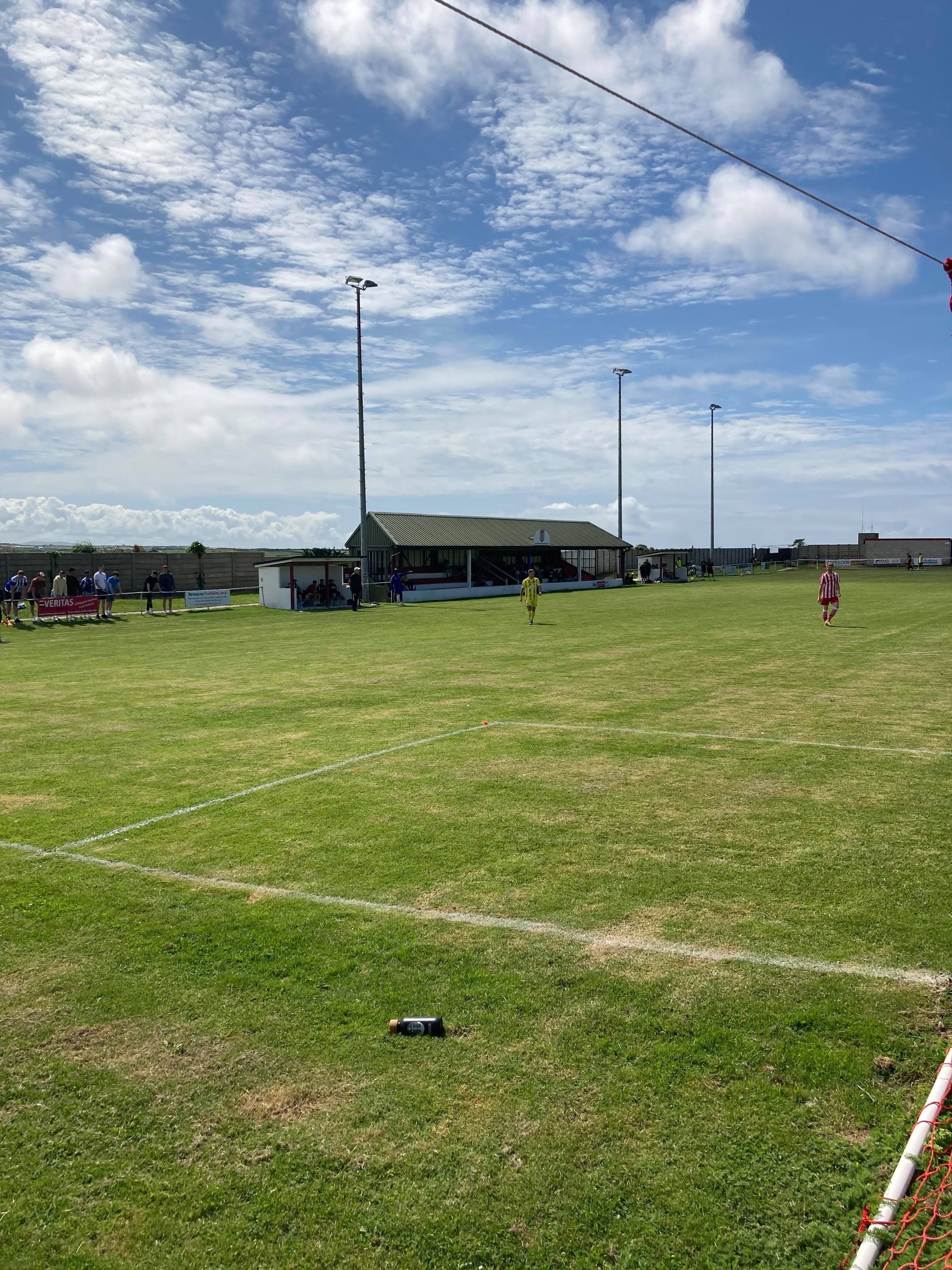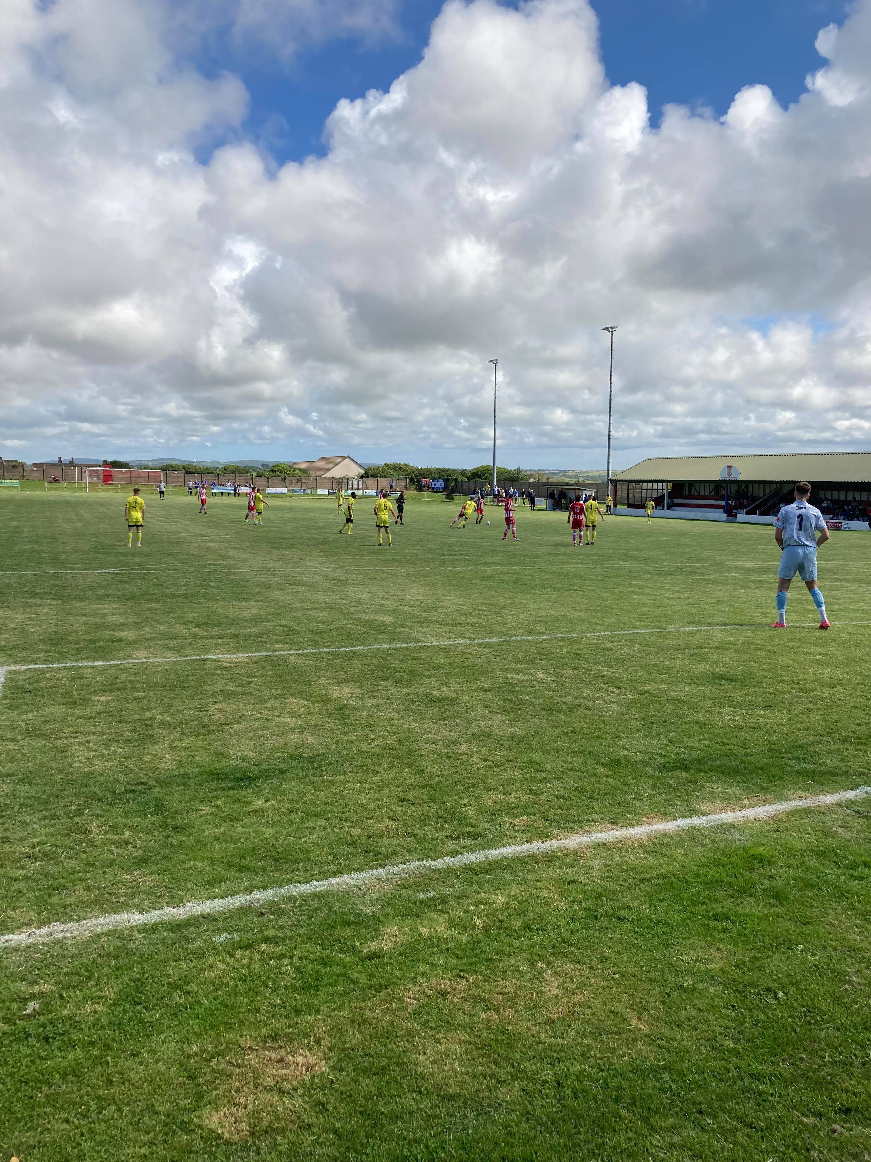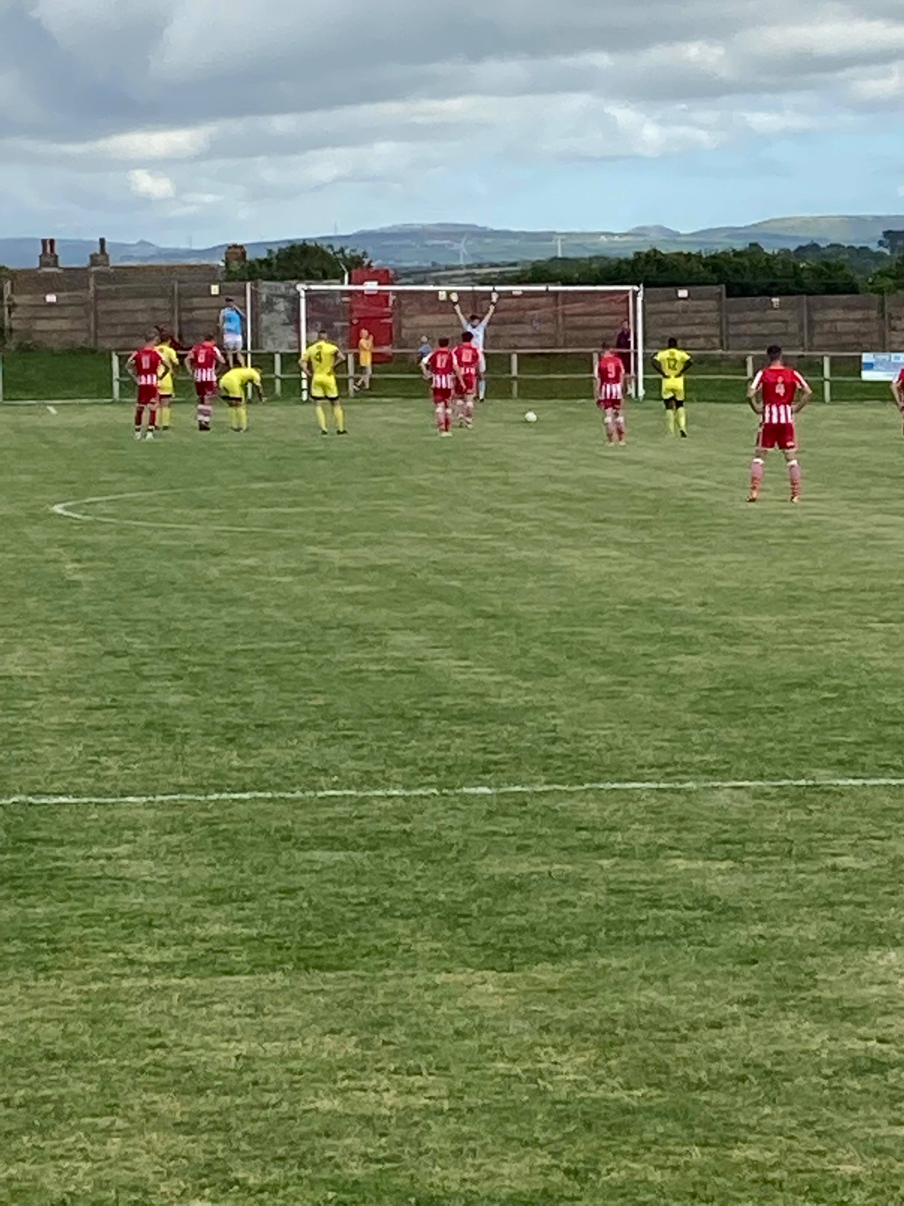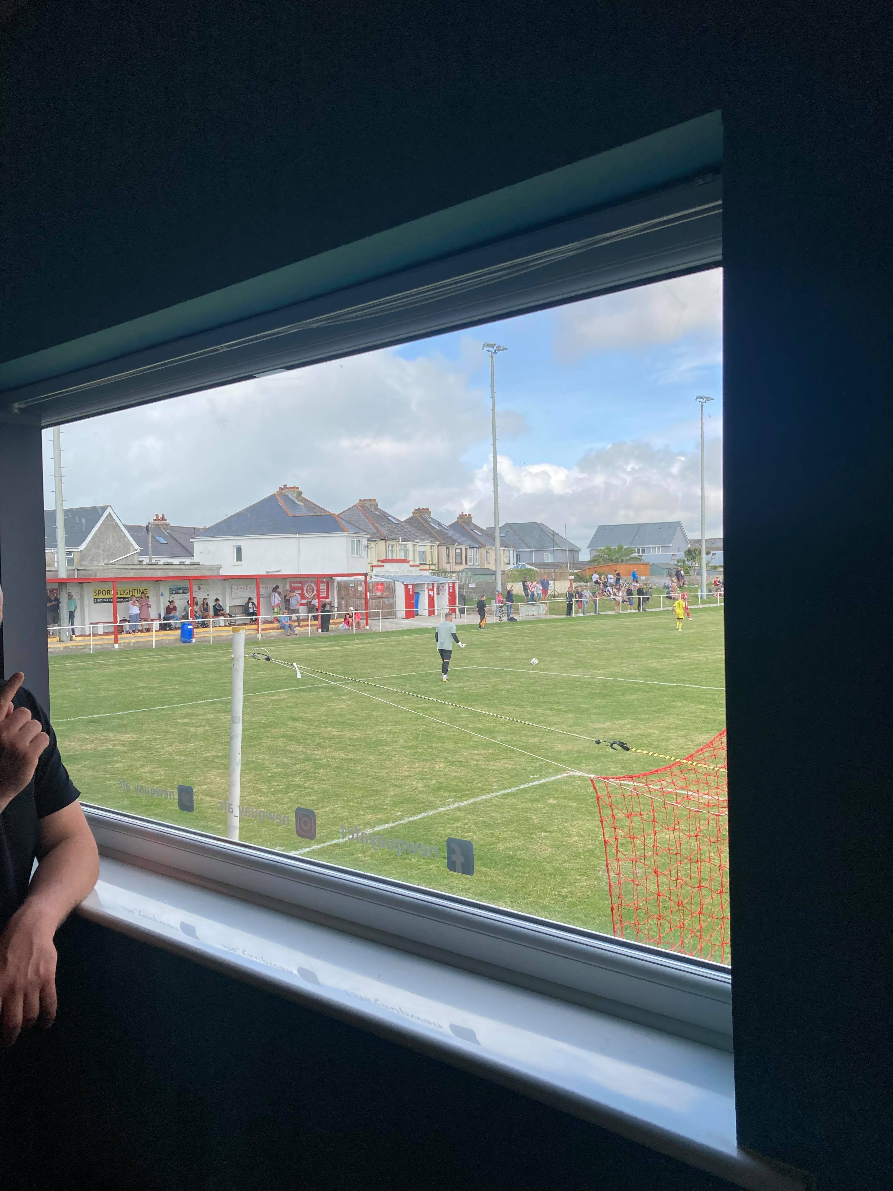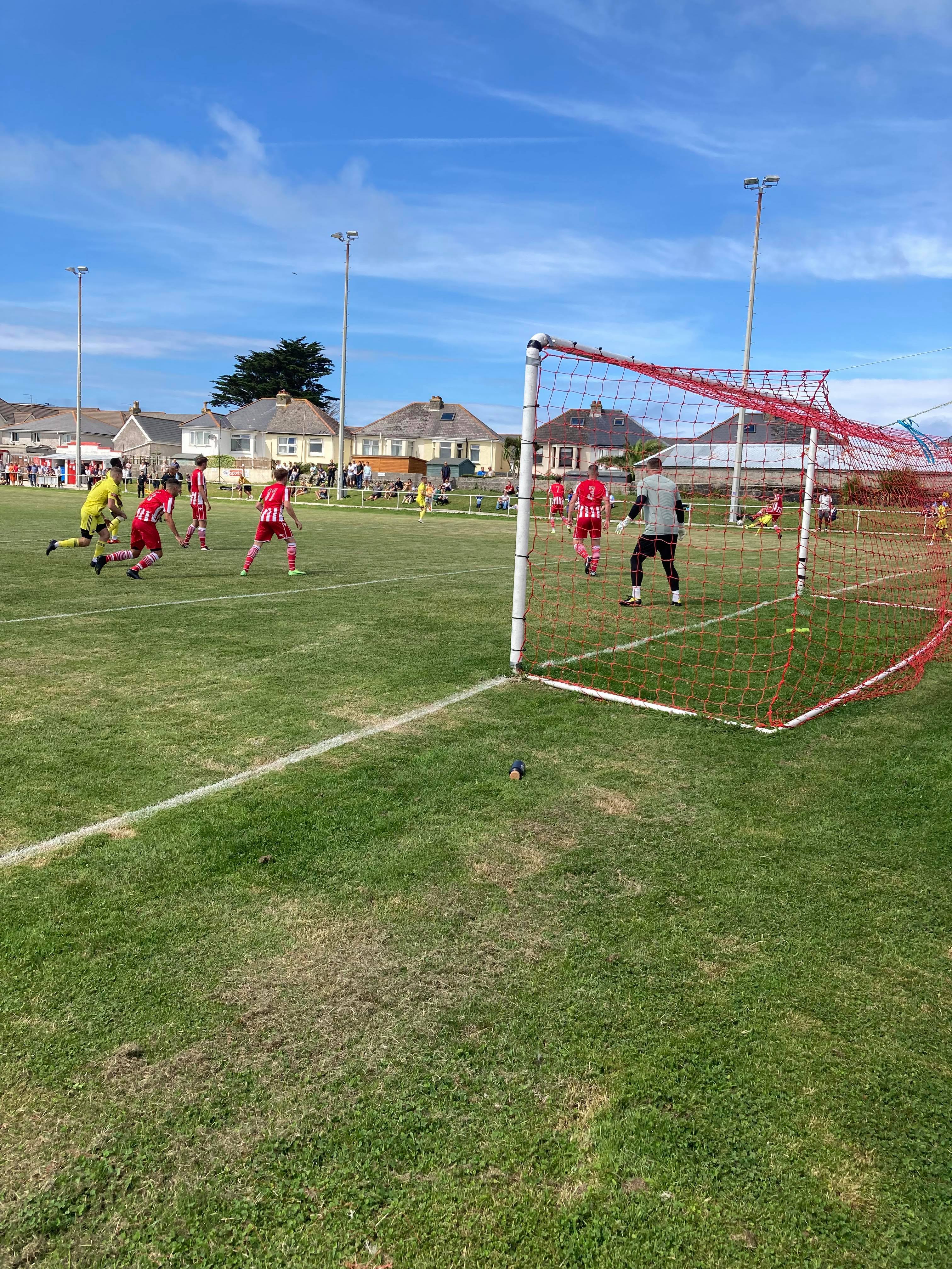 67th minute and Newquay come down the right hand side, the cross comes in, it falls to number 9 on the volley… It’s blocked but was it by a hand? “Yes!” Says the referee! Penalty to Newquay! Number 10 steps up… He scores!! Newquay have got their goal! 1-3!