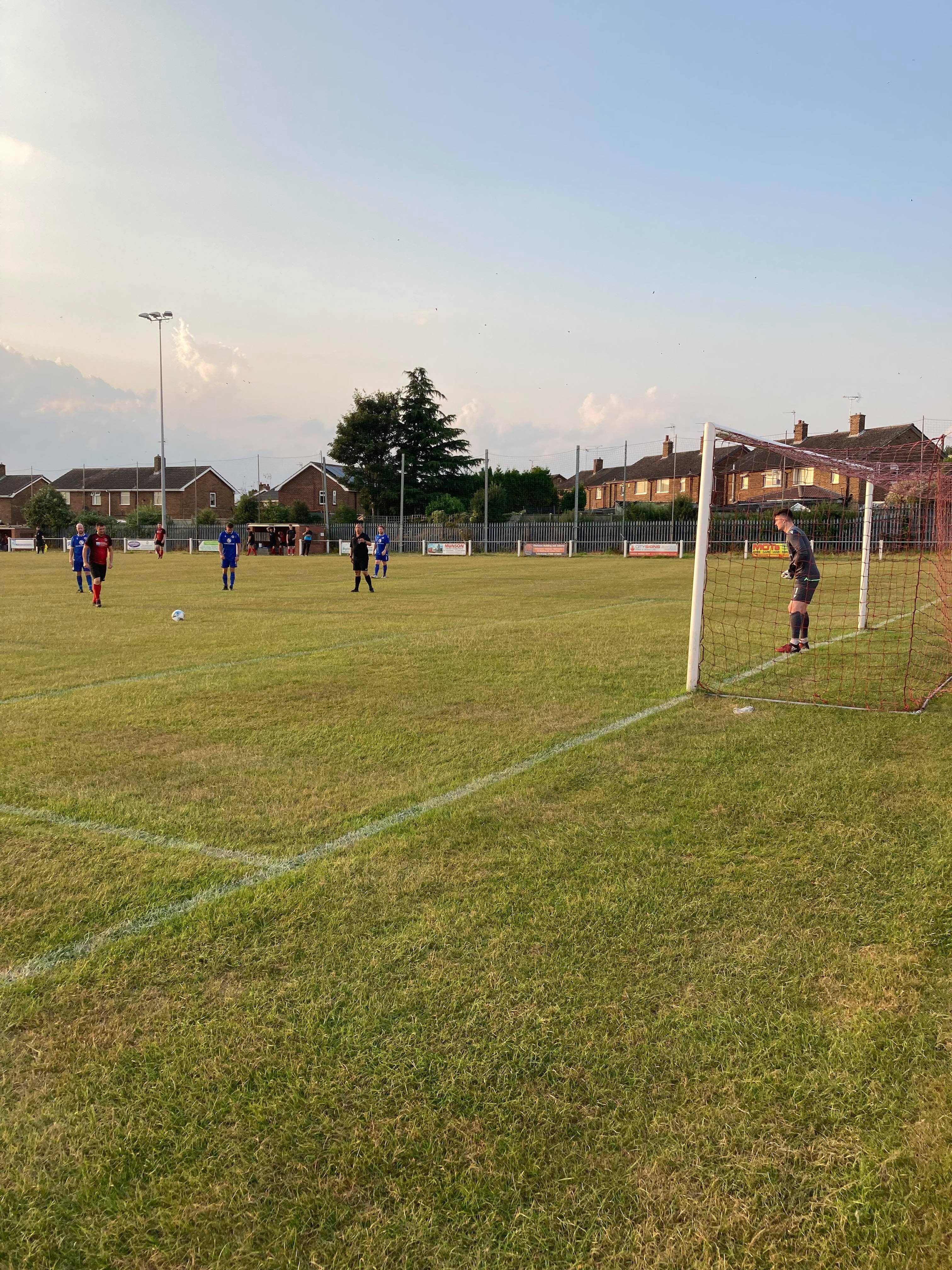 Straight from kick off and Newark lose the ball in the Ollerton half, Newark press the ball and it is played back to Ollerton’s keeper Levi Owen who hits it away first time… It’s hit his own man and… It’s gone into his own net…!!! Oh dear! TAXIIIIIII!! 1-1 just like that!