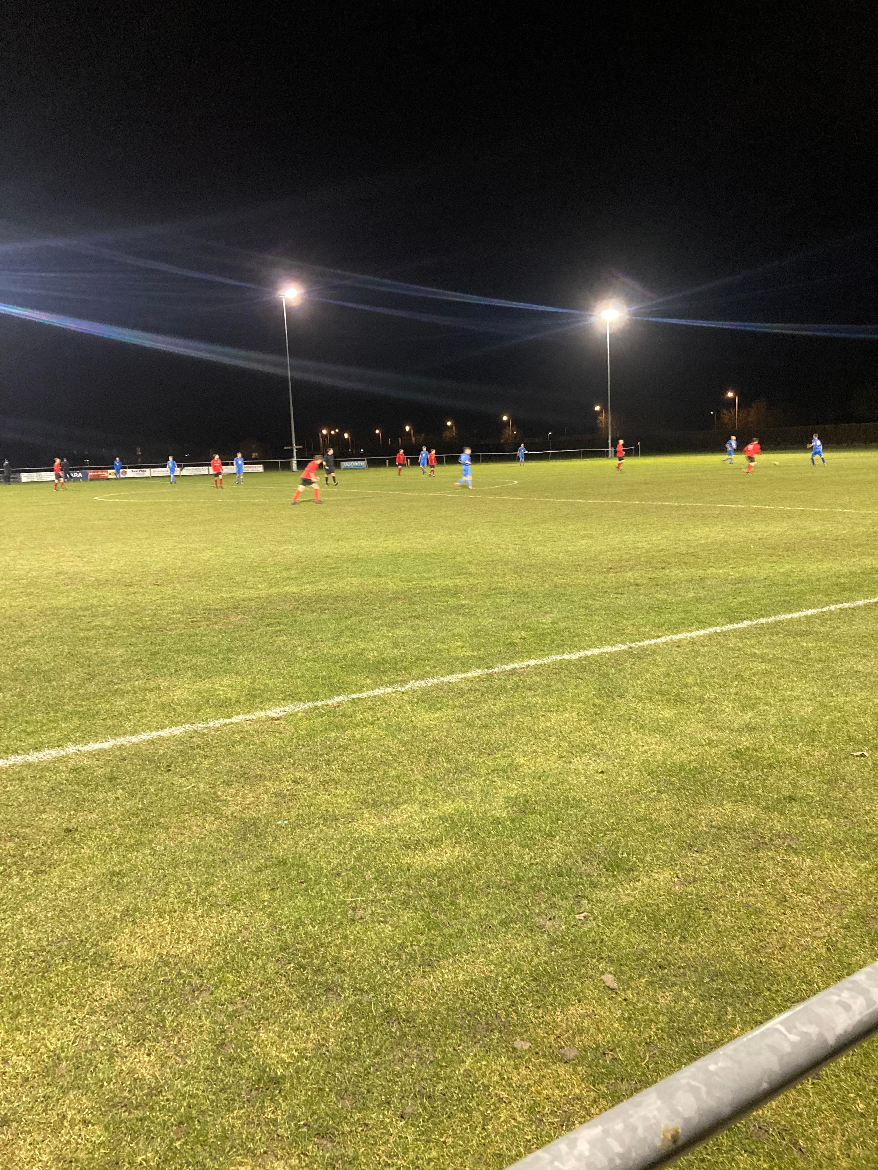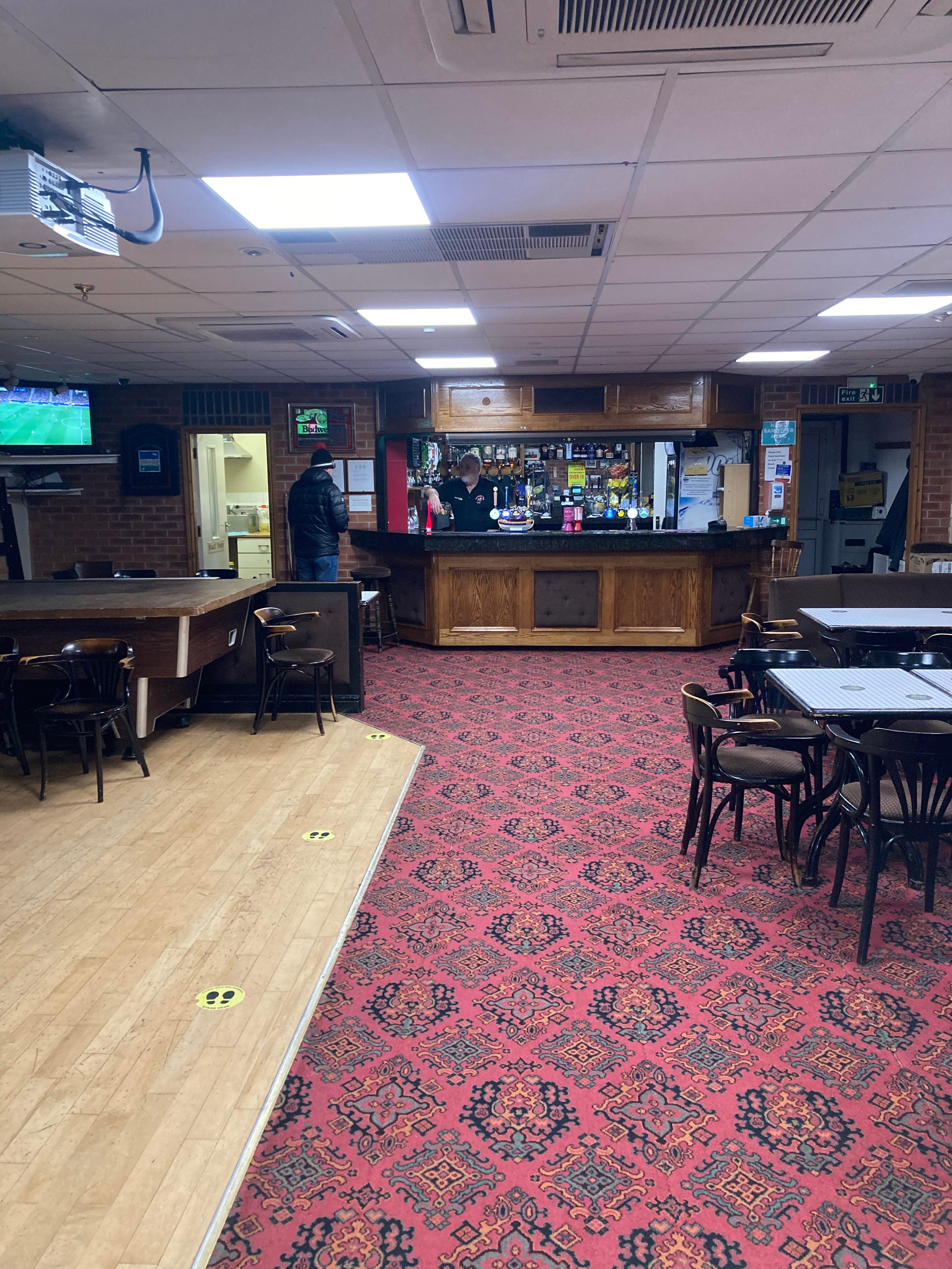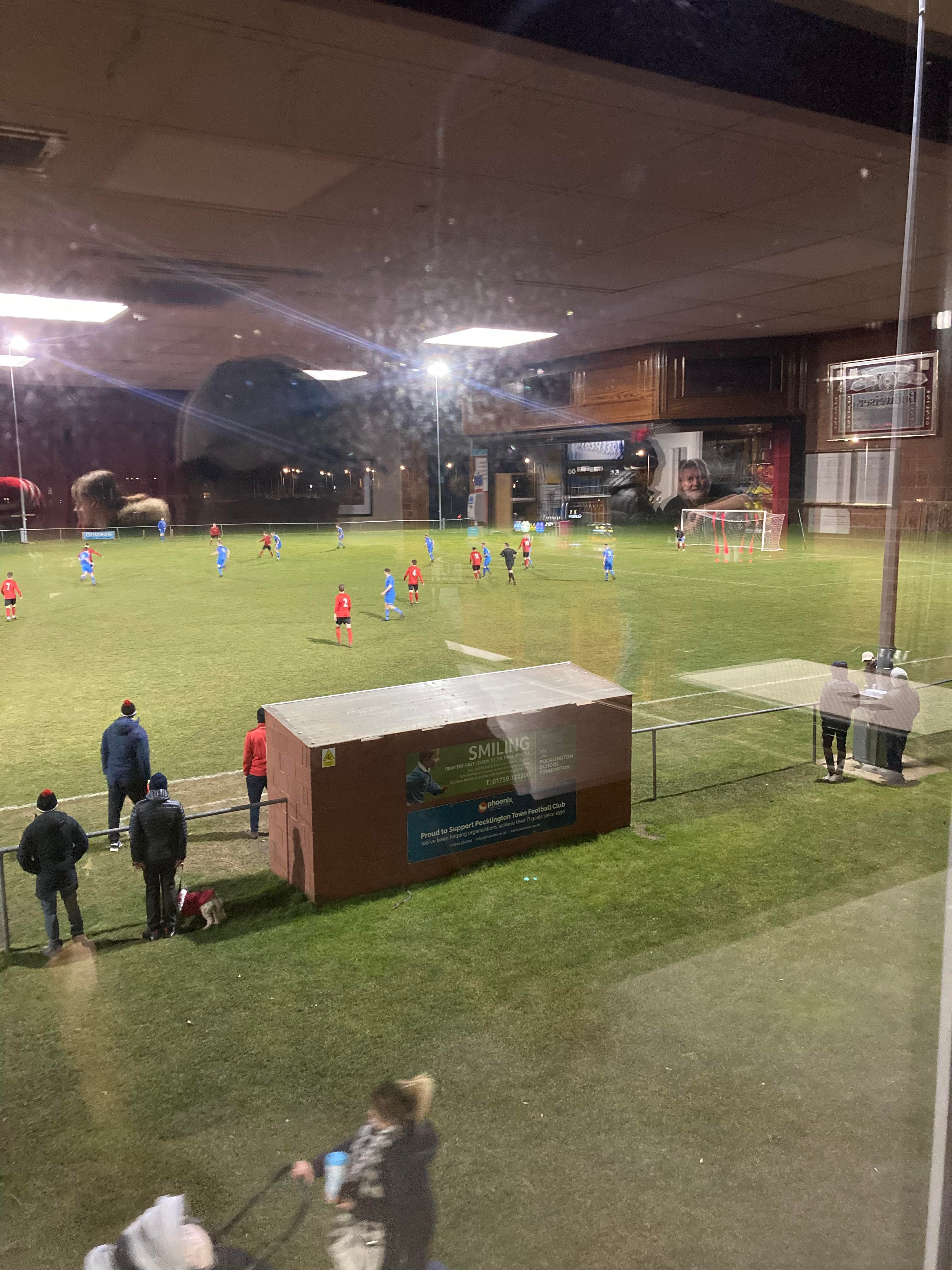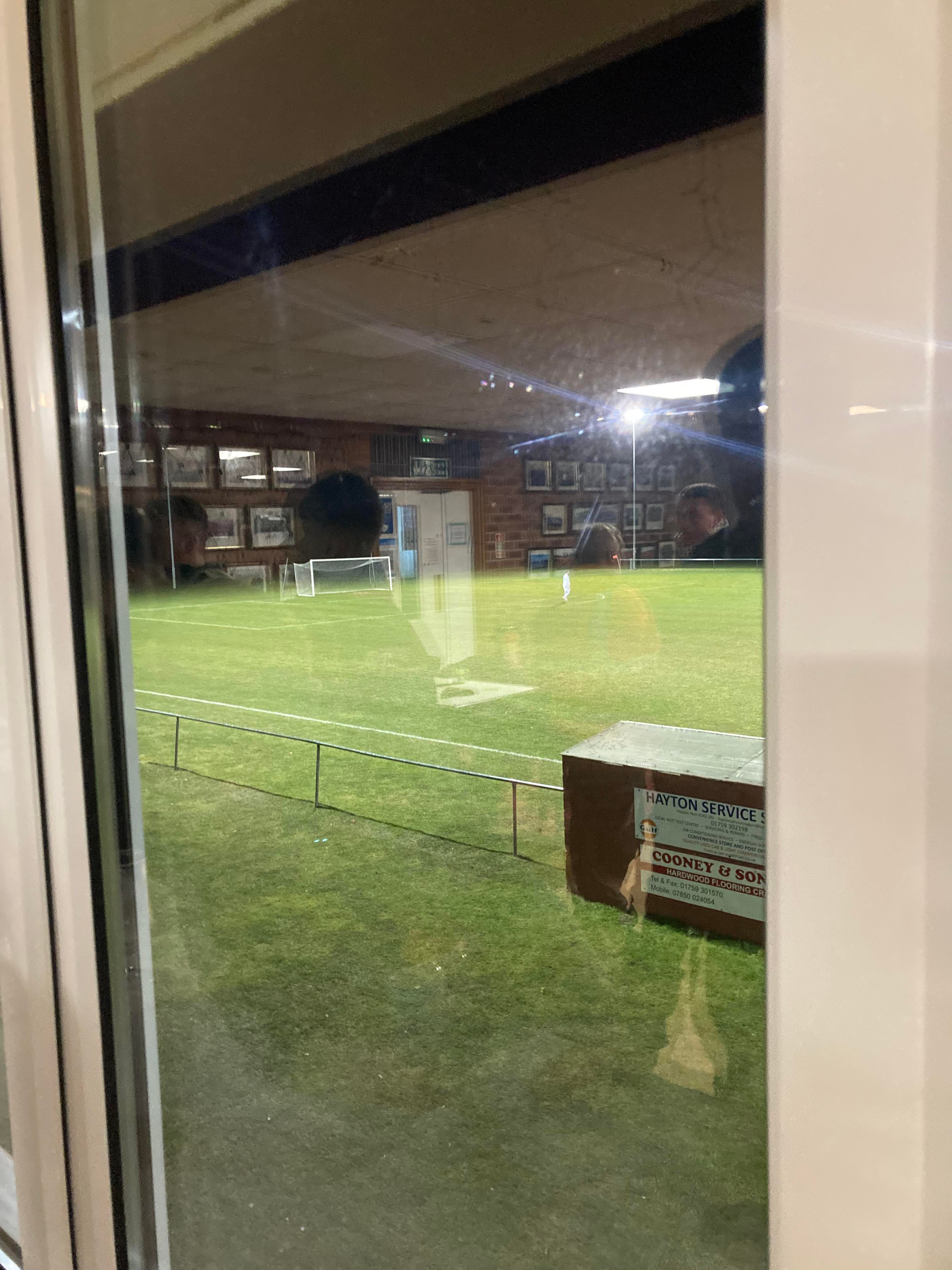 Now to get some warmth in the club bar. A lovely little bar they have here! I have to say it’s better than some of the higher level non league club bars out there! Liverpool have a Penalty against Leeds to make it 3, Mo Salah… Oh yes! Man United are 1-0 down to Atletico Madrid in the first half of their game too. The players are back out for the second half of our game now but hey, we can watch it here no problem! What a great view!