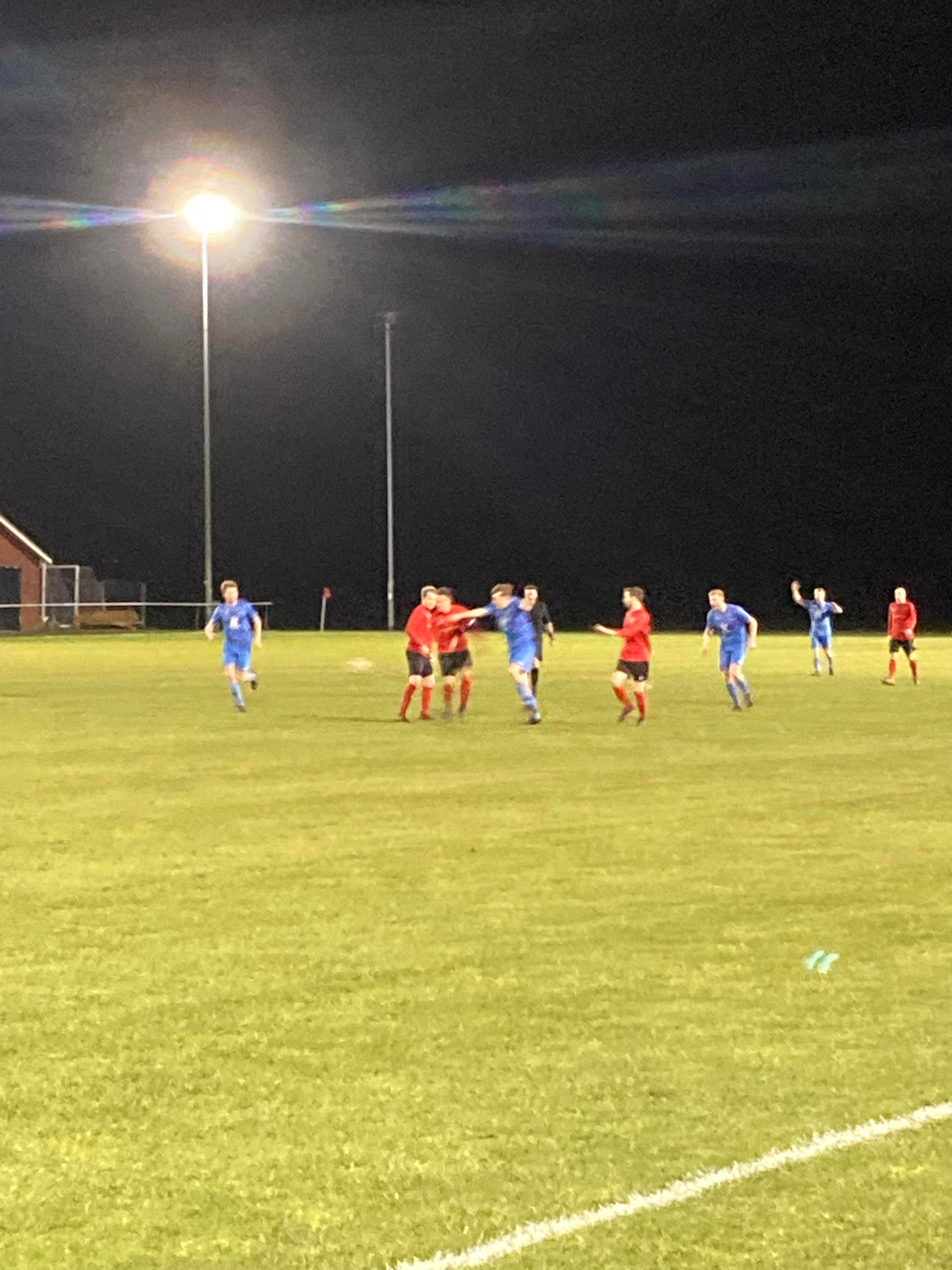 Both teams enjoying spells of possession in the game but only the one clear cut chance so far in the game. 24th minute and Malt Shovel win the ball back in the Pocklington half, number 9 has it and gets into the box… Down he goes… Referee blows his whistle… He’s given a free kick to Pocklington… I thought it was a Penalty and so did Malt Shovel who are surrounding the Referee! The management can’t believe it! Yellow card for number 9 of Malt Shovel too… But what for? Maybe the Referee has a better view.