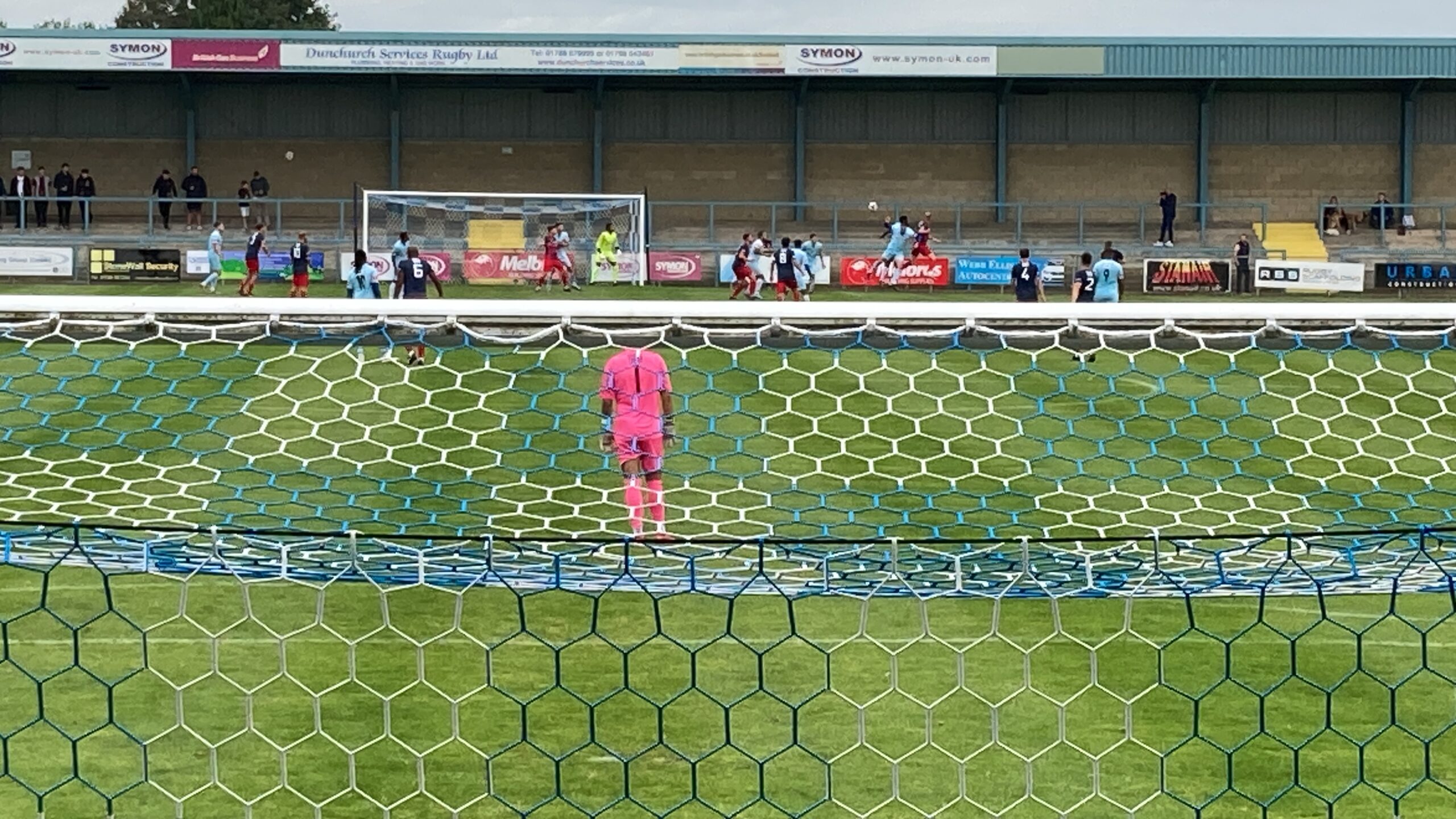 62 minutes now and Sphinx get into the box on the left… The Sphinx man is hacked down there! Penalty! Can’t argue with that one! Callum Woodward steps up… WHAT A PENALTY!!! Right into the top bin… Uh-oh! The keeper has kicked out at a Sphinx man there and tempers are fraying… Red card! The Rugby keeper is off! It’s all happening! 1-1!
